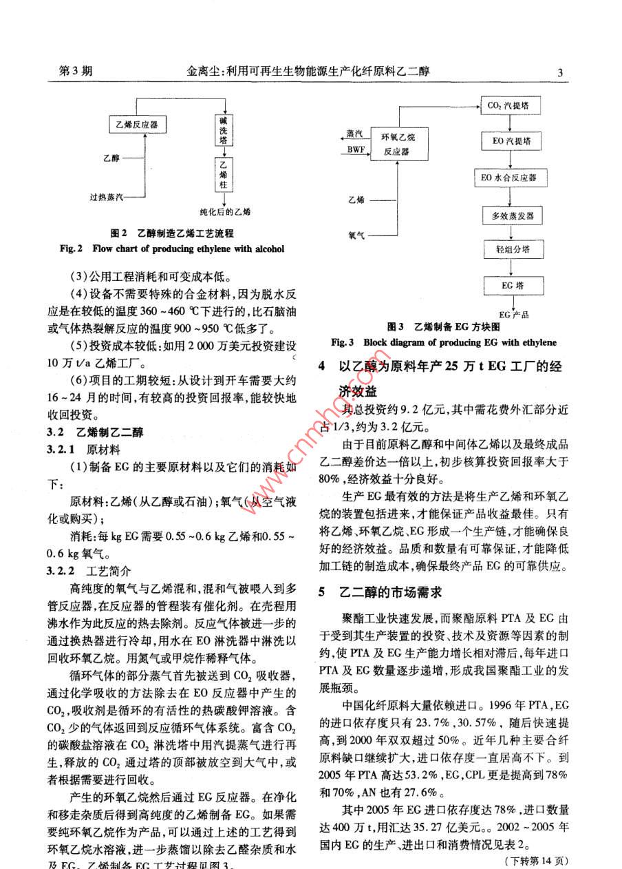 第20卷第3期聚酯工業(yè) Vol. 20 No.3200705 Polyester Industry May 2007利用可再生生物能源生產(chǎn)化纖原料乙二醇金離塵(中國化纖協(xié)會,北京100742)摘要:介紹了利用再生生物資源生產(chǎn)EG的總體工藝流程和提出該建議的主要依據(jù)。對用石油路線和乙醇路線生產(chǎn)EG的總生產(chǎn)成本進(jìn)行了比較。簡述了由酒精制乙烯和由乙烯制E的原材料和工藝。對E的市場需求進(jìn)行了分析。指出利用可再生生物能源生產(chǎn)化纖原料EG既能解決聚酯原料EG短缺又能發(fā)展綠色化工產(chǎn)品。關(guān)鍵: PTA EG可再生生物能源中分類號:TQ245.12:TQ223.162文獻(xiàn)標(biāo)識碼:A文章編號:1008261(2070301-030前言1從可再生生物資源生產(chǎn)EG為貫徹落實(shí)《國民經(jīng)濟(jì)和社會發(fā)展第十一個(gè)五年以含有糖、多糖類生物資源為原料,利用生物酶規(guī)劃綱要》精神,積極推動紡織工業(yè)科技進(jìn)步和自主催化方法發(fā)酵生產(chǎn)乙醇,再通過化學(xué)合成方法制得創(chuàng)新,轉(zhuǎn)變增長方式,促進(jìn)產(chǎn)業(yè)升級和結(jié)構(gòu)調(diào)整實(shí)現(xiàn)EG。其總體工藝過程簡寫如下:紡織工業(yè)的全面、協(xié)調(diào)、可持續(xù)發(fā)展,國家發(fā)改委和有可再生的生物資源(玉米、甘蔗等)→乙醇→乙關(guān)部門、協(xié)會編制了《紡織工業(yè)“十一五”發(fā)展綱要。烯→環(huán)氧乙烷→EG提出了“十一五”發(fā)展的重點(diǎn)任務(wù),其中有關(guān)內(nèi)容如目前我國已有將近100家乙醇生產(chǎn)廠,由于乙下:醇處于供過于求的狀態(tài),開工率僅有50%~60%。(1)加大結(jié)構(gòu)調(diào)整力度推進(jìn)產(chǎn)業(yè)升級。為此,建議暫不上由農(nóng)作物生產(chǎn)乙醇的工廠,而采用“十一五”期間,紡織工業(yè)將加快技術(shù)結(jié)構(gòu)、原料就近采購,可與乙醇廠簽長期供應(yīng)合同,保證原料乙結(jié)構(gòu)組織結(jié)構(gòu)產(chǎn)品結(jié)構(gòu)產(chǎn)業(yè)結(jié)構(gòu)以及區(qū)域結(jié)構(gòu)調(diào)醇的穩(wěn)定供應(yīng)。整步伐,轉(zhuǎn)變經(jīng)濟(jì)增長方式,推進(jìn)產(chǎn)業(yè)可持續(xù)發(fā)展,全面提高產(chǎn)業(yè)科技含量、資源利用效率、環(huán)境品質(zhì)和勞2建議的主要依據(jù)動生產(chǎn)率。2.1我國原油進(jìn)口依存度逐漸增加(2)多渠道解決紡織原料供需矛盾,實(shí)現(xiàn)產(chǎn)業(yè)可20世紀(jì)90年代以來,中國國民經(jīng)濟(jì)年均增長持續(xù)發(fā)展。9.79%,原油消費(fèi)年均增加5.77%,而同期國內(nèi)原①加快發(fā)展市場急需的化纖原料油供給增長速度僅為1.67%。國民經(jīng)濟(jì)發(fā)展遠(yuǎn)遠(yuǎn)加快規(guī)劃內(nèi)合纖原料建設(shè)項(xiàng)目的核準(zhǔn)進(jìn)度,鼓勵超過了石油資源發(fā)展的速度。具有合纖原料生產(chǎn)能力的民營資本進(jìn)入,逐步提高我從1996年起我國成為原油的凈進(jìn)口國,對外依國精對苯二甲酸(PTA)、對二甲苯(PX)和EG等重要存度逐年增加?;w原料的自給率,逐步降低對外依存度。據(jù)商務(wù)部市場運(yùn)行司的監(jiān)測,2006年上半年,②加大紡織纖維資源的開發(fā)力度我國的原油產(chǎn)量達(dá)9166萬t,同比增長2.1%;石油按照循環(huán)經(jīng)濟(jì)和可持續(xù)發(fā)展的思路,組織實(shí)施利凈進(jìn)口8236萬t,同比增長21.3%,其中原油凈進(jìn)用可再生資源生產(chǎn)化纖原料工作加快具有規(guī)模效益口7033萬t,同步增長17.6%,成品油凈進(jìn)口1203的重大項(xiàng)目建設(shè),如利用生物資源生產(chǎn)EG、1,-丙二萬t,同步增長48.3%。上半年石油對外依存度達(dá)醇、1,4丁二醇等,拓展可再生纖維資源。47.3%,比2005年提高了4.4%。在《紡織工業(yè)第十一個(gè)五年規(guī)劃綱要》中多次提未來15年,中國國民經(jīng)濟(jì)將以7%左右的速度出利用生物資源生產(chǎn)EG,既能解決聚酯原料EG的發(fā)展,預(yù)計(jì)原油需求將以4%左右的速度增加,同期短缺,又利用可再生的生物資源發(fā)展綠色化工產(chǎn)品。國內(nèi)石油產(chǎn)量增長速度卻只有2%左右,低于石油收稿日期:2006-11-08作者簡介:金離塵(1939-),,浙江寧波人,高級工程師,原紡織總會國際合作部副主任。2聚酯工業(yè)第20卷需求增長速度,國內(nèi)石油供需缺口逐年加大。表12種生產(chǎn)路線成本比較國際能源署(IEA)在對我國的能源狀況進(jìn)行深 Table Cost comparison of two kinds of production route入研究后預(yù)測,我國2000~2030年石油需求的年均項(xiàng)目石化路線農(nóng)作物路線乙烯用量/t0.650.65增長率為3%,原油進(jìn)口依存度將達(dá)到82%。乙烯價(jià)格/10007702.2石油化工裝置產(chǎn)能不斷增加乙烯消耗/650500公用工程及所有其它成本/90100(1)石油化工產(chǎn)業(yè)為了滿足快速增長的市場需副產(chǎn)品和碳排放交易781083136求,加快了發(fā)展速度,產(chǎn)品產(chǎn)量迅速增長。利息和折舊EG的)693528(2)原油一次加工能力,乙烯、合成樹脂、合成EG的銷售價(jià)格/(t800-1200(副產(chǎn)品DEG/TEG的價(jià)格和EG一樣8008/t,實(shí)際上國內(nèi)EG纖維、合成橡膠的生產(chǎn)能力都已位居世界前列。價(jià)格已達(dá)1000/t)(3)化工用油(尤其石腦油)短缺的矛盾逐步顯現(xiàn)。預(yù)計(jì)未來國內(nèi)化工用油年缺口量將達(dá)800萬t石化路線與乙醇路線生產(chǎn)EG的成本差為以上