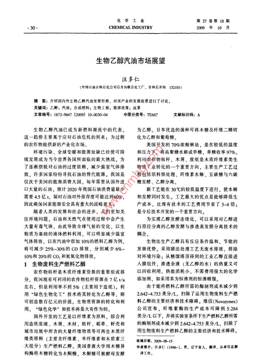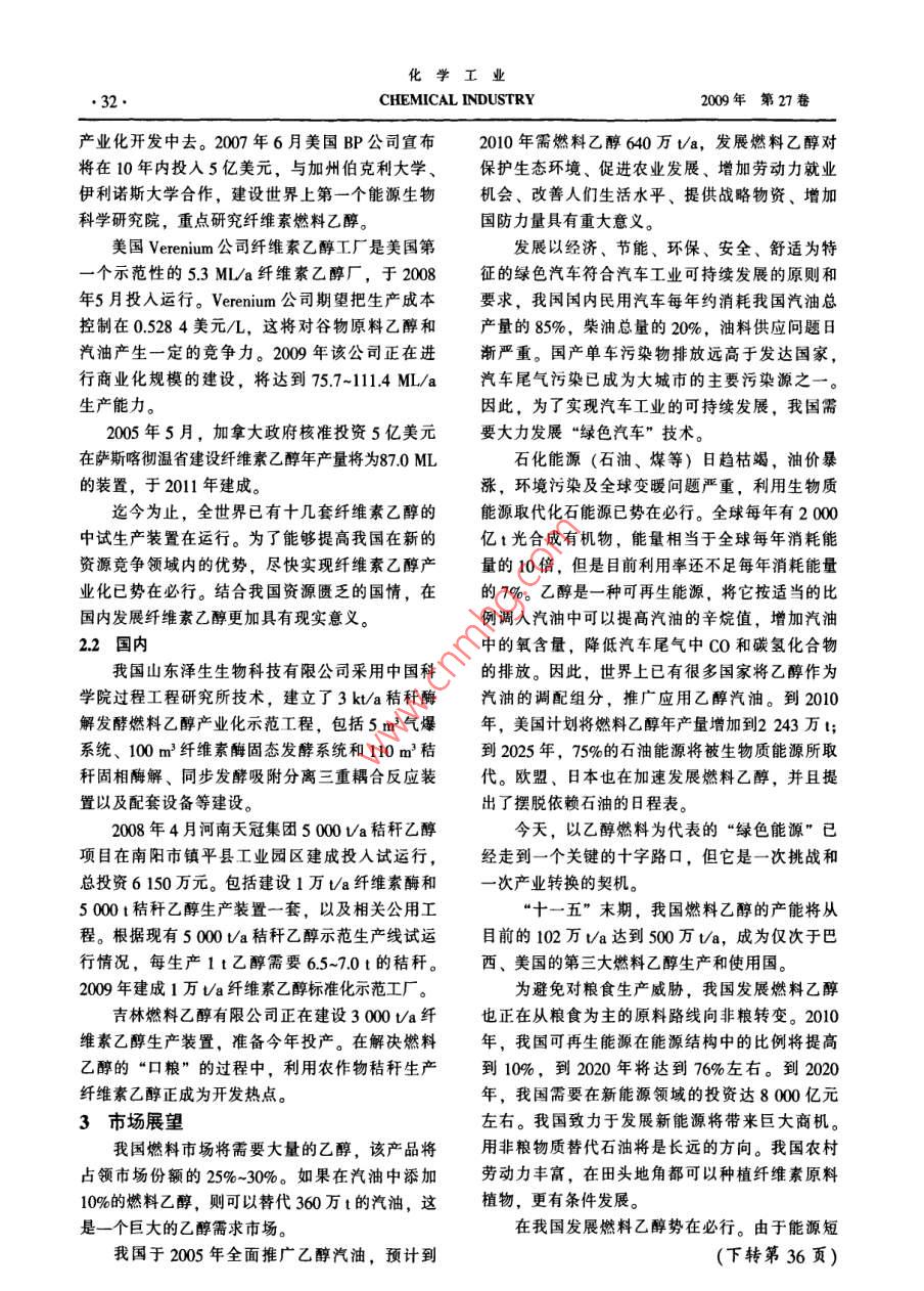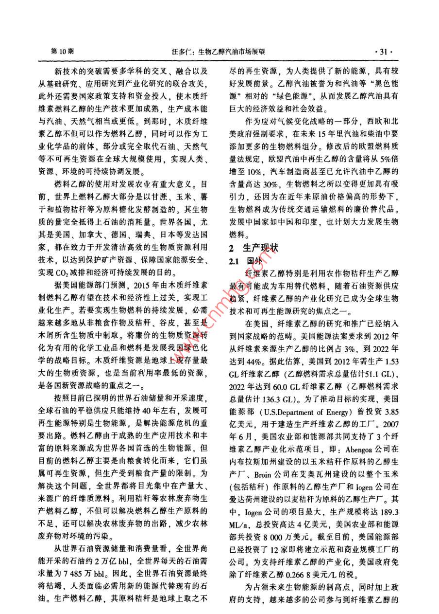 化學(xué)工業(yè)第27卷第10期30CHEMICAL INDUSTRY2009年10月生物乙醇汽油市場展望汪多仁(中國石油吉林石化公司石井溝聯(lián)合化工廠,吉林石井溝132101)摘要:介紹國內(nèi)外生物乙醇汽油發(fā)展形勢,對該產(chǎn)業(yè)的發(fā)展前景進行了討論。關(guān)鍵詞:乙醇;汽油;合成燃料;生物工程;能源政策;遠(yuǎn)景文章編號:1673-9647(2009)100030-04中圖分類號:TE667獻標(biāo)識碼:A生物乙醇汽油已成為新燃料潮流中的代表。為乙醇。日本優(yōu)選的菌種可將木糖及纖維二糖轉(zhuǎn)這一趨勢主要基于應(yīng)對石油危機的到來;為過?;癁橐掖己推咸烟?。的農(nóng)作物提供新的產(chǎn)業(yè)化市場。美國開發(fā)的70%濃酸解法,是在較低的溫度環(huán)境污染、全球變暖和能源短缺已經(jīng)使可持和壓力下,將高聚糖水解成單糖,單糖收率97‰。續(xù)發(fā)展成為當(dāng)今世界各國所面臨的最大挑戰(zhàn)。為利用農(nóng)作物秸稈、木屑、廢紙是木質(zhì)纖維素類生了逐漸擺脫對石油的過度依賴,減少溫室氣體排物質(zhì)T業(yè)轉(zhuǎn)化的一個重要方向,主要生產(chǎn)工藝過放,許多國家紛紛尋找石油的替代能源。我國是程包括原料預(yù)處理、纖維素水解、五碳糖與六碳僅次于美國的能源消費大國,每年需要從國外進糖發(fā)酵、乙醇分離??诖罅康氖汀nA(yù)計2020年我國石油消費量最少新T藝能在30℃的較低溫度下進行,使水解需要45億t,屆時石油對外依存度可能達到60%,和發(fā)酵同時發(fā)生。工藝最大的優(yōu)點是能夠降低生因此確保國家能源安全具有重大的戰(zhàn)略意義產(chǎn)成本,比現(xiàn)有技術(shù)的工藝費用節(jié)省了3~4倍;隨著人類的發(fā)展和社會的進步,人們更加關(guān)是今后技術(shù)開發(fā)的一個重要方向注環(huán)境問題。石油和天然氣在使用過程中會產(chǎn)生為實現(xiàn)乙醇發(fā)酵連續(xù)化,可以采用對乙醇進大量有毒氣體,由此導(dǎo)致全球氣候的變化,以生行原位分離的乙醇發(fā)酵與滲透蒸發(fā)膜分離技術(shù)的物質(zhì)為基礎(chǔ)的液體燃料利用,可以明顯減少溫室耦合。氣體排放,以在汽油中添加10%的燃料乙醇為例,生物法生產(chǎn)乙醇具有反應(yīng)條件溫和,節(jié)能的將可減少25%~30%的CO排放,分別減少6%~發(fā)展優(yōu)勢。采用膜法處理工藝無廢水排放,排除10%和20%的CO2和氮氧化物排放。對環(huán)境污染;從精餾塔頂?shù)玫降墓I(yè)乙醇直接進1生物廢料生產(chǎn)燃料乙醇人膜組件,滲透余液(無乙醇的水)的熱量又可農(nóng)作物秸稈是木質(zhì)纖維素資源的重要組成部以回收利用,熱能消耗小,不需費用很大的化學(xué)分,我國現(xiàn)有可利用的農(nóng)作物秸稈資源在7億ta添加劑,如采用苯為恒沸劑的恒沸精餾。左右,但是利用率不到5%(主要用于造紙)。利由于能將燃料乙醇所需的酶制劑成本減少到用“綠色生物化工”技術(shù)將其轉(zhuǎn)化為乙醇等,則2.642~4753美分/L,掃除了運用生物廢料生產(chǎn)燃可創(chuàng)造數(shù)百億元的價值。生物質(zhì)資源的轉(zhuǎn)化和利料乙醇的主要經(jīng)濟和技術(shù)障礙。維信( novozymes)用,“綠色化學(xué)”和技術(shù)將是大有作為的公司宣布,纖維素酶的生產(chǎn)成本可降到5284國外開發(fā)的工藝是以纖維素為原料,綜合利美分幾以下,并將實驗室條件下生產(chǎn)燃料乙醇所需用造紙廢液、木屑、木材、秸稈、稻草、籽殼和的酶制劑成本減少到26424753美分/,掃除了城市垃圾中所含的大量纖維物質(zhì)等可再生木質(zhì)纖用生物廢料生產(chǎn)燃料乙醇的主要經(jīng)濟和技術(shù)障礙。維類原料(主要含纖維素、半纖維素和木質(zhì)素三收稿日期:2009-08-15大組分)生產(chǎn)燃料乙醇。美國普渡大學(xué)用木糖異作者簡介:汪多仁(1946-),男,遼寧省人,翻譯,從事信息翻構(gòu)酶將木糖轉(zhuǎn)化為木酮糖,木酮糖可被酵母發(fā)酵譯工作。第10期汪多仁:生物乙醇汽油市場展望31新技術(shù)的突破需要多學(xué)科的交叉、融合以及盡的再生資源,為人類提供了新的能源,具有較從基礎(chǔ)研究、應(yīng)用研究到產(chǎn)業(yè)化研究的聯(lián)合攻關(guān),好發(fā)展前景。乙醇汽油被譽為和汽油等“黑色能此外還需要國家政策支持和資金投入,使木質(zhì)纖源”相對的“綠色能源”,從而發(fā)展乙醇汽油具有維素燃料乙醇的生產(chǎn)技術(shù)更加成熟,生產(chǎn)成本能巨大的經(jīng)濟效益和社會效益。與汽油、天然氣相當(dāng)或更低。到那時,木質(zhì)纖維作為應(yīng)對氣候變化戰(zhàn)略的一部分,西歐和北素乙醇不但可以作為燃料乙醇,同時可以作為工美政府強制要求,在未來15年里汽油和柴油中要業(yè)化學(xué)品的前體,部分或完全取代石油、天然氣添加更多的生物燃料組分。修改后的歐盟燃料質(zhì)等不可再生資源在全球大規(guī)模使用,實現(xiàn)人類、量法規(guī)定,歐盟汽油中再生乙醇的含量將從5%倍資源、環(huán)境的可持續(xù)協(xié)調(diào)發(fā)展。增至10%,汽車制造商甚至已允許汽油中乙醇的燃料乙醇的使用對發(fā)展農(nóng)業(yè)有重大意義。目含量高達30%,生物燃料之所以變得更加具有吸前,世界上燃料乙醇大部分是以甘蔗、玉米、薯引力,還因為在近年來原油價格偏高的形勢下,干和植物秸稈等為原料糖化發(fā)酵制造的。其生物生物燃料成為傳統(tǒ