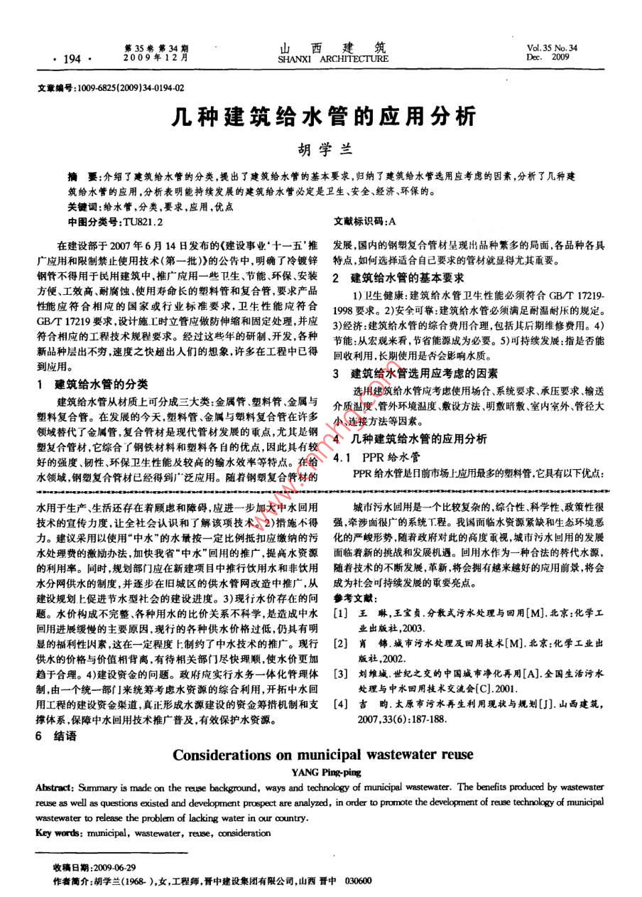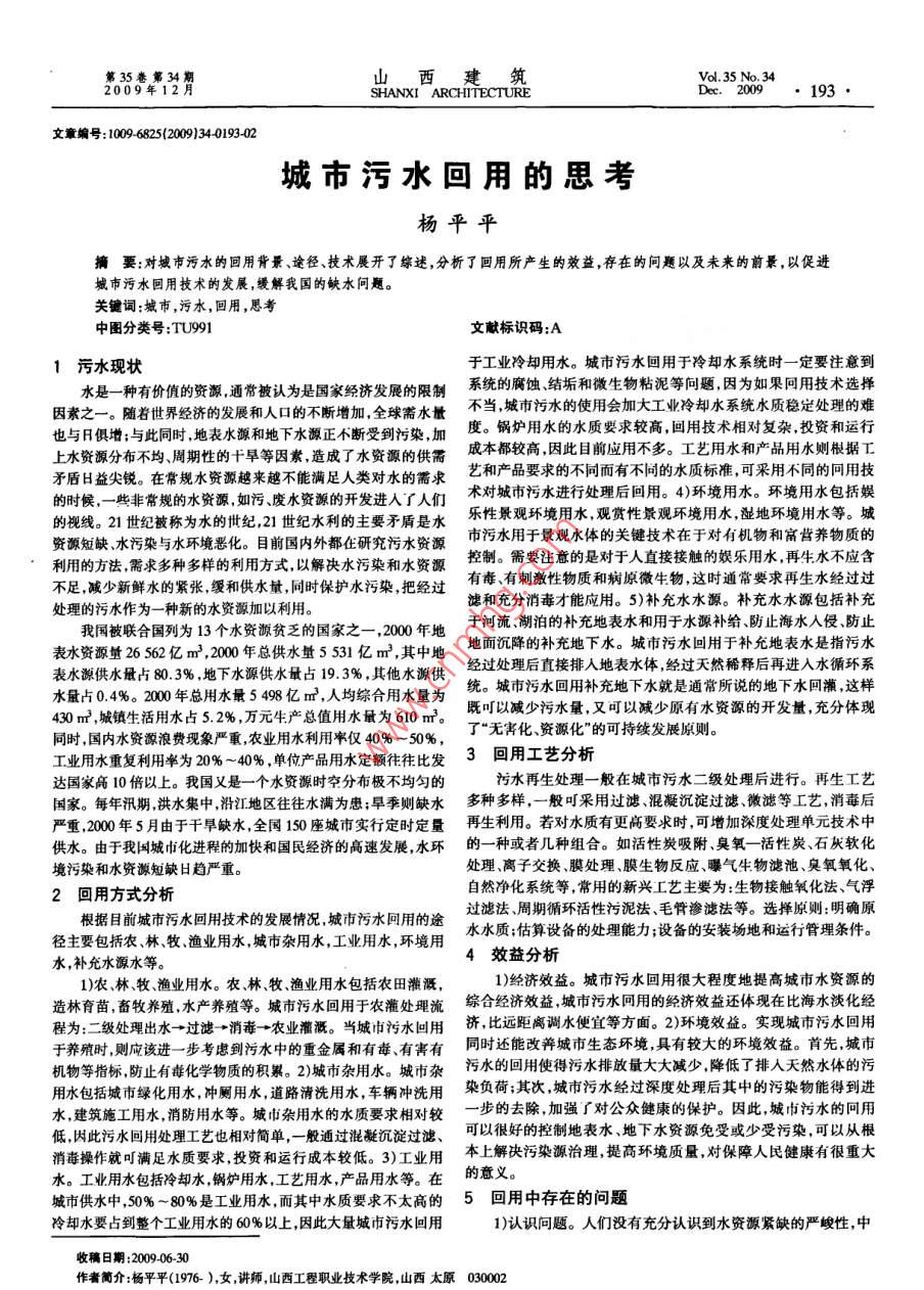 第35卷第34年山西建爭(zhēng)Vol.35 No.34SHANXI ARCHITECTUREDec.2009文章編號(hào): 1009 68252009)340193-02城市污水回用的思考楊平平摘要:對(duì)城市污水的回用背景、途徑 、技術(shù)展開了綜述,分析了回用所產(chǎn)生的效益,存在的問題以及未來的前景,以促進(jìn)城市污水回用技術(shù)的發(fā)展,緩解我國(guó)的缺水問題。關(guān)鍵詞:城市,污水,回用,恩考中團(tuán)分類號(hào):TU991文獻(xiàn)標(biāo)識(shí)碼:A1污水現(xiàn)狀于工業(yè)冷卻用水。城市污水回用于冷卻水系統(tǒng)時(shí)- -定要注意到水是一種有價(jià)值的資源.通常被認(rèn)為是國(guó)家經(jīng)濟(jì)發(fā)展的限制系統(tǒng)的腐蝕、結(jié)垢和微生物粘泥等問題,因?yàn)槿绻赜眉夹g(shù)選擇因素之一。隨著世界經(jīng)濟(jì)的發(fā)展和人口的不斷增加,全球需水量不當(dāng),城市污水的使用會(huì)加大工業(yè)冷卻水系統(tǒng)水質(zhì)穩(wěn)定處理的難也與日俱增;與此同時(shí),地表水源和地下水源正不斷受到污染,加度。鍋爐用水的水質(zhì)要求較高,回用技術(shù)相對(duì)復(fù)雜,投資和運(yùn)行上水資源分布不均、周期性的干早等因素,造成了水資源的供需成本都較高,因此目前應(yīng)用不多。工藝用水和產(chǎn)品用水則根據(jù)工矛盾日益尖銳。在常規(guī)水資源越來越不能滿足人類對(duì)水的需求藝和產(chǎn)品要求的不同而有不同的水質(zhì)標(biāo)準(zhǔn),可采用不同的同用技的時(shí)候,一些非常規(guī)的水資源,如污、廢水資源的開發(fā)進(jìn)入了人們術(shù)對(duì)城市污水進(jìn)行處理后回用。4)環(huán)境用水。環(huán)境用水包括娛的視線。21世紀(jì)被稱為水的世紀(jì),21世紀(jì)水利的主要矛盾是水樂性景觀環(huán)境用水,觀賞性景觀環(huán)境用水,濕地環(huán)境用水等。城資源短缺水污染與水環(huán)境惡化。目前國(guó)內(nèi)外都在研究污水資源市污水用于景觀水體的關(guān)鍵技術(shù)在于對(duì)有機(jī)物和富營(yíng)養(yǎng)物質(zhì)的利用的方法,需求多種多樣的利用方式,以解決水污染和水資源控制。需要注意的是對(duì)于人直接接觸的娛樂用水,再生水不應(yīng)含不足,減少新鮮水的緊張,緩和供水量,同時(shí)保護(hù)水污染,把經(jīng)過有毒、有刺激性物質(zhì)和病原微生物,這時(shí)通常要求再生水經(jīng)過過濾和充分消毒才能應(yīng)用。5)補(bǔ)允水水源。補(bǔ)充水水源包括補(bǔ)充處理的污水作為一種新的水資源加以利用。我國(guó)被聯(lián)合國(guó)列為13個(gè)水資源貧乏的國(guó)家之一,2000年地于河流湖泊的補(bǔ)充地表水和用于水源補(bǔ)給、防止海水入侵、防止表水資源量26 562億m' ,2000年總供水量5531億m2 ,其中地地面沉降的補(bǔ)充地下水。城市污水回用于補(bǔ)允地表水是指污水表水源供水量占80. 3% ,地下水源供水最占19.3% ,其他水源供經(jīng)過處理后直接排人地表水體,經(jīng)過天然稀釋后再進(jìn)人水循環(huán)系水量占0.4%。2000 年總用水最5 498億m2 ,人均綜合用水量為統(tǒng)。城市污水回用補(bǔ)充地下水就是通常所說的地下水回灝,這樣430 m2 ,城鎮(zhèn)生活用水占5.2% ,萬元生產(chǎn)總值用水最為610 m2。既可以減少污水量,又可以減少原有水資源的開發(fā)量,充分體現(xiàn)同時(shí),國(guó)內(nèi)水資源浪費(fèi)現(xiàn)象嚴(yán)重,農(nóng)業(yè)用水利用率僅40% ~ 50%,了“無害化、資源化”的可持續(xù)發(fā)展原則。工業(yè)用水重復(fù)利用率為20% ~ 40% ,單位產(chǎn)品用水定額往往比發(fā)3回用工藝分析達(dá)國(guó)家高10倍以上。我國(guó)又是一-個(gè)水資源時(shí)空分布極不均勻的污水再生處理一般在城市污水二級(jí)處理后進(jìn)行。再生工藝國(guó)家。每年汛期,洪水集中,沿江地區(qū)往往水滿為患;早季則缺水多種多樣 ,-般可采用過 濾、混凝沉淀過濾、微濾等工藝,消毒后嚴(yán)重,2000年5月由于干旱缺水,全國(guó)150座城市實(shí)行定時(shí)定量再生利用。若對(duì)水質(zhì)有更高要求時(shí),可增加深度處理單元技術(shù)中供水。由于我國(guó)城市化進(jìn)程的加快和國(guó)民經(jīng)濟(jì)的高速發(fā)展,水環(huán)的一 種或者幾種組合。 如活性炭吸附、臭氧活性炭、石 厭軟化境污染和水資源短缺日趨嚴(yán)重。處理、離子交換、膜處理、膜生物反應(yīng)、曝氣生物濾池、臭氧氧化、自然凈化系統(tǒng)等,常用的新興L藝主要為:生物接觸氧化法、氣浮2回用方式分析根據(jù)目前城市污水回用技術(shù)的發(fā)展情況,城市污水回用的途過濾法、周期循環(huán)活性污泥法、毛管滲濾法等。選擇原則:明確原徑主要包括農(nóng)、林、牧、漁業(yè)用水城市雜用水,工業(yè)用水,環(huán)境用水水質(zhì);估算設(shè)備的處理能力;設(shè)備的安裝場(chǎng)地和運(yùn)行管理?xiàng)l件。4效益分析水,補(bǔ)允水源水等。1)農(nóng)林牧漁業(yè)用水。農(nóng)、林、牧.漁業(yè)用水包括農(nóng)田濫溉,1)經(jīng)濟(jì)效益。城市污水回用很大程度地提高城市水資源的造林育苗,畜牧養(yǎng)殖,水產(chǎn)養(yǎng)殖等。城市污水回用于農(nóng)灌處理流綜合經(jīng)濟(jì)效益.城市污水回用的經(jīng)濟(jì)效益還體現(xiàn)在比海水淡化經(jīng)程為:二級(jí)處理出水- +過濾→消毒.農(nóng)業(yè)灌溉。