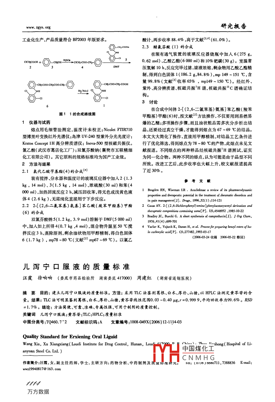 中國藥師2006年第9卷第12期China Pharmacist 2006, Vol.9 No. 12●研究報(bào)告●醋氯芬酸的合成楊靜華甘斌章雁程文香曹振威(湖北省醫(yī)藥工業(yè)研究院武漢 430061)摘夏目的:合成醋氯芬酸。方法:以氯乙酸為原料,和苯甲醇進(jìn)行酯化反應(yīng)合成氯代乙酸芐基酯,再經(jīng)縮合、氫解反應(yīng)制得目標(biāo)化合物。結(jié)果:改進(jìn)了合成工藝,總收率達(dá)到75% ,較文獻(xiàn)收率提高35%。結(jié)論:該方法原料價(jià)麋易得,工藝操作簡便,適合工業(yè)化生產(chǎn)。關(guān)鍵詞醋氟芬酸;非 甾體抗炎藥;合成中圖分類號:R914.5文獻(xiàn)標(biāo)識碼:A文章編號:1008-0492(200612-1113-02Synthesis of AceclofenacYang Jinghua, Gan Bin, Zhang Yan, Cheng Wenxiang, Cao Zhenwei (Hubei Pharmaceutical Industry Institute, Wuhan 430061 ,P. R.China)ABSTRACT Objective: To synthesize aceclofenac. Method: Aceclofenac was synthesized from chloroacetic acid and benzyl alcoholby esterifcation to give benzyl chloroacetale , which subjected to condensation and hydrogenolysis. Result: The synthetic process wasimproved and total yield was 75%,which was 35% higher than that reported in the literature. Conclusion: The raw materials in thisroute is cheap. The improved sythesis has advantages of convenient operation and is suitable for industrial production.KEY WORDS Acelfenac; NSAIDs; Synthesis醋氯芬酸( acelofenac, 1) ,化學(xué)名為2-[(2,6-二氯苯得1,總收率39.6%。本文改用以氯乙酸(2)為起始原料,經(jīng)基)氨基]苯乙酸羧甲酯,是安全性較好的非甾體抗炎新氯代乙酸芐基酯(4)制得1 (見圖1),避免了對眼睛刺激性藥"。1992 年在西班牙首次上市,用于緩解風(fēng)濕性關(guān)節(jié)炎、極強(qiáng)的溴代乙酸芐基酯?;衔?的制備,文獻(xiàn)[2]后處理類風(fēng)濕性關(guān)節(jié)炎和強(qiáng)直性脊椎炎等引起的炎癥和疼痛。時(shí),蒸除溶劑后,加入乙醚,過濾、水洗、無水硫酸鈉干燥、濃1998年列人歐洲藥典和英國藥典,已在英、德法、西班牙等縮、經(jīng)已烷提洗后再結(jié)晶,熔點(diǎn)67 ~69 C,操作比較繁瑣。20多個(gè)國家上市。實(shí)驗(yàn)中還發(fā)現(xiàn)產(chǎn)物呈油狀物,分離結(jié)晶困難。本文在減壓回文獻(xiàn)23]報(bào)道醋氯芬酸的制備是以溴乙酸為起始原料,收溶劑后,直接用甲醇精制,得到熔點(diǎn)為78 ~80 C結(jié)晶。化與苯甲醇(3)進(jìn)行酯化反應(yīng),制備澳代乙酸芐基酯,然后和合物1的精制,文獻(xiàn)[21用甲苯,本文改用乙酸乙酯。2-[ (2,6-二氯苯基)氨基]苯乙酸鈉(5)縮合,生成2-[(2,6-采用改進(jìn)后的新工藝,原料價(jià)廉易得,操作簡便,成本降二氯苯基)氨基]苯乙酸(羧苯甲酯基)甲酯(6) ,再經(jīng)氫解制低,總收率達(dá)75% ,較文獻(xiàn)收率提高了35%。本工藝已投入作者簡介:楊靜華,女,研究員,從事藥物合成研究。Tel : (027 )885287 E-mail : yanginghua502@ 163. com一的質(zhì)量標(biāo)準(zhǔn),我們選擇原研廠家提供的質(zhì)量標(biāo)準(zhǔn)溶出速率比A快。為參照,在同一標(biāo)準(zhǔn)下對3個(gè)不同廠家的制劑進(jìn)行3.4試驗(yàn) 數(shù)據(jù)表明B、C制劑的體外溶出特性與A考察。制劑無統(tǒng)計(jì)學(xué)差異,但與體內(nèi)的生物等效性是否相3.2 從表1可知,3個(gè)藥廠的依巴斯汀片的百分標(biāo)關(guān)還需進(jìn)-一步考察。示含量和含量均勻度均符合規(guī)定" ,其中原研廠家參考文獻(xiàn)A的百分標(biāo)示含量高于國內(nèi)B、C兩廠的制劑含量(A>C> B),含量均勻度的優(yōu)劣順序?yàn)镃>B>A。1進(jìn)口 藥品注冊標(biāo)準(zhǔn)[S]. JX200301513.3從表3.4溶出參數(shù)的統(tǒng)計(jì)學(xué)分析結(jié)果可知,國中國藥典[S].2005 年版.二部.附錄V D中國藥典[S].2005年版.二部.附錄X C內(nèi)廠家(B和C)生產(chǎn)的依巴斯汀片的溶出參數(shù)(Tso、TJ)與原研廠家(A)的參數(shù)無統(tǒng)計(jì)學(xué)差異(P>中國煤化工容出度參數(shù)的運(yùn)算程序0.05);m(斜率)值存在顯著的統(tǒng)計(jì)學(xué)差異(P