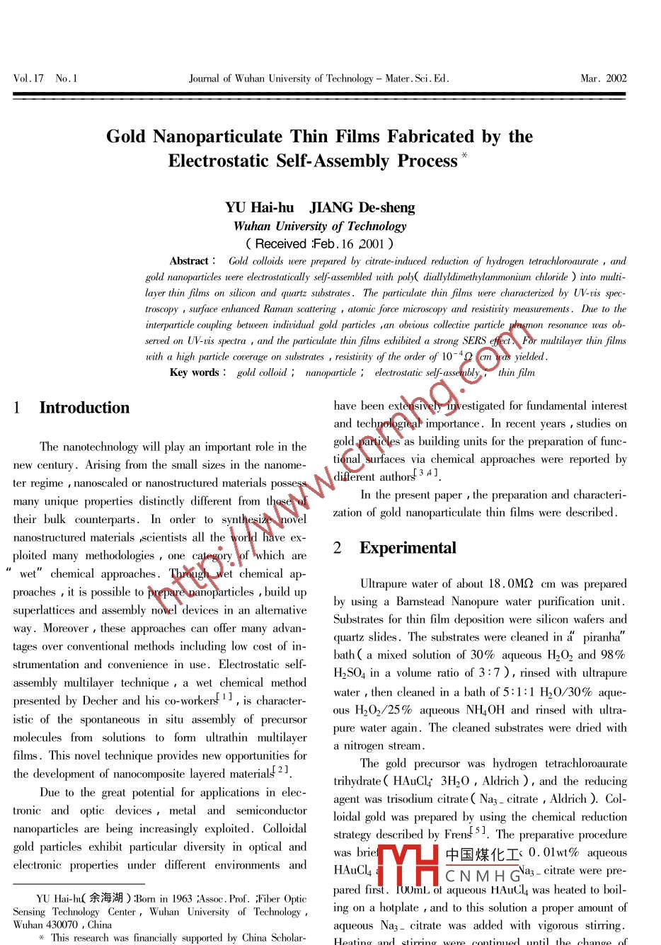 Vol.17 No. 1Journal of Wuhan University of Technology - Mater. Sci. Ed.Mar. 2002Gold Nanoparticulate Thin Films Fabricated by theElectrostatic Self- Assembly ProcessYU Hai-hu JIANG De-shengWuhan University of Technology( Received :Feb.16 2001 )Abstract : Gold olloids uvere prepared by citrate- induced reduction of hydrogen tetrachlorourate , andgold nanoparicles were etrosacally sef-assembled with poly( dillydimehylammonium chloride ) into muli-layer thin films on silicon and quartz substrates. The particulate thin films were characterised by UV-vis spec-troscopy,suface enhanced Raman scattering , atomic force microscopy and resistiity measurements. Due to theinterparticle coupling betueen individual gold particles ,an obvious ollctve particle plasmon resonance rwas ob-sered on UV-vis spectra , and the particulate thin films exhibited a strong SERS efect. For mulilayer thin filmnswith a high particle coverage on substrates , resistivity of the order of 10-4 Q cm 1was yielded.Key words: gold colloid ; nanopartice ; electrostatic self-assembly ; thin film1 Introductionhave been extensively investigated for fundamental interestand technological importance. In recent years , studies onThe nanotechnology will play an important role in thegold particles as building units for the preparation of func-new century. Arising from the small sizes in the nanome-tional surfaces via chemical approaches were reported byter regime , nanoscaled or nanostructured materials possessdifferent authors5 34].In the present paper , the preparation and characteri-many unique properties distinctly different from those oftheir bulk counterparts. In order to synthesize novelzation of gold nanoparticulate thin films were described.nanostructured materials ,scientists all the world have ex-ploited many methodologies ,one category of which are2 Experimentalwet" chemical approaches. Through wet chemical ap-Ultrapure water of about 18. 0MO cm was preparedproaches , it is possible to prepare nanoparticles , build upsuperlattices and assembly novel devices in an altermativeby using a Barnstead Nanopure water purification unit.Substrates for thin film deposition were silicon wafers andway. Moreover , these approaches can offer many advan-quartz slides . The substrates were cleaned in d piranha"tages over conventional methods including low cost of in-bath( a mixed solution of 30% aqueous H2O2 and 98%strumentation and convenience in use. Electrostatic self-H2SO4 in a volume ratio of 3:7 ), rinsed with ultrapureassembly multilayer technique ,a wet chemical methodwater , then cleaned in a bath of 5:1:1 H20/30% aque-presented by Decher and his co- workens 1 , is character-ous H2O2/ 25% aqueous NH4OH and rinsed with ultra-istic of the spontaneous in situ assembly of precursorpure water again. The cleaned substrates were dried withmolecules from solutions to form ultrathin multilayera nitrogen stream .films. This novel technique provides new opportunities fonThe gold precursor was hydrogen tetrachloroauratethe development of nanocomposite layered materials 2 J.trihydrate( HAuCl; 3H2O , Aldrich ) , and the reducingDue to the great potential for applications in elec-agent was trisodium citrate( Na3 _ eitrate , Aldrich ). Col-tronic and optic devices ,metal and semiconductorloidal gold was prepared by using the chemical reductionnanoparticles are being increasingly exploited. Colloidalstrategy described by Frens 5. The preparative proceduregold particles exhibit particular diversity in optical anwas br中國煤化工0. 01wt% aqueouselectronic properties under different environments andHAuCl4YHCNMHGNa3 - citrate were pre-pared first. T0UmL ot aqueous HAuCl4 was heated to boil-YU Hai-hua( 余海湖) :Bom in 1963 ;Assoc. Prof. ;Fiber OpticSensing Technology Center ,Wuhan University of Technology ,ing on a hotplate ,and to this solution a proper amount ofWuhan 430070 , Chinaaqueous Na3- citrate was added with vigorous stirring.* This research was financially supported by China Scholar-Heating and stirring were continued until the change 0ship Councijapt數(shù)據(jù)atural Science Foundation of Hubei Province( Prjet 2000the color of the solution was completed. The obtained col-Vol.17 No. 1YU Hai-hu et al :Gold Nanoparticulate Thin Films Fabricated by...39loids were stored inside a refrigerator until needed .the dispersion. The resulted colloids remained clear andPoly( diallyldimethylammonium chloride )( PDDA ,no obvious precipitation could be observed after they wereAldrich) with average molecular weight of 400 000 -stored in a refrigerator for several days to several weeks .500000 was used without further purification. For thinIn the colloids no special stabilizer was added. On thefilm assemblies ,0. 01mol L- 1 aqueous solution of PDDAgold particles ,weekly coordinating ions such as citratewas prepared by diluting the commercial 20wt % aqueousand chloride ions form " ligand" shells. The electrostaticalPDDA with ultrapure water to the designed concentrationrepulsion between the particles prevents the colloidal par-on base of the monomeric repeating unit.ticles from aggregation.Gold particulate thin films were prepared under thefollowing procedure. The cleaned substrates were im-mersed into the aqueous solution of 0. 01mol L- 1 PDDAfor 10- 20 min and vigorously rinsed with ultrapure wa-ter. Then the PDDA-monolayer -masked substrates wereimmersed into a gold colloid for 10 min to 24 hours andvigorously rinsed with ultrapure water again. Multilayergold particulate thin films were formed by alternately repeating these two immersions. An immersion in aqueousPDDA was always performed before an immersion in a col-loid was done .Transmission electron microscopy ( JEM- 100CXII ,Fig. 1 TEM micrograph of 21nm gold colloidJEOL ) was used to determine the particle sizes of the gold0.16colloids and operated at 80kV accelerating voltage. UVvis spectroscopy( U-2010,Hitachi ) was used to charac-i 0.12terize the gold colloids and the assembled particulat