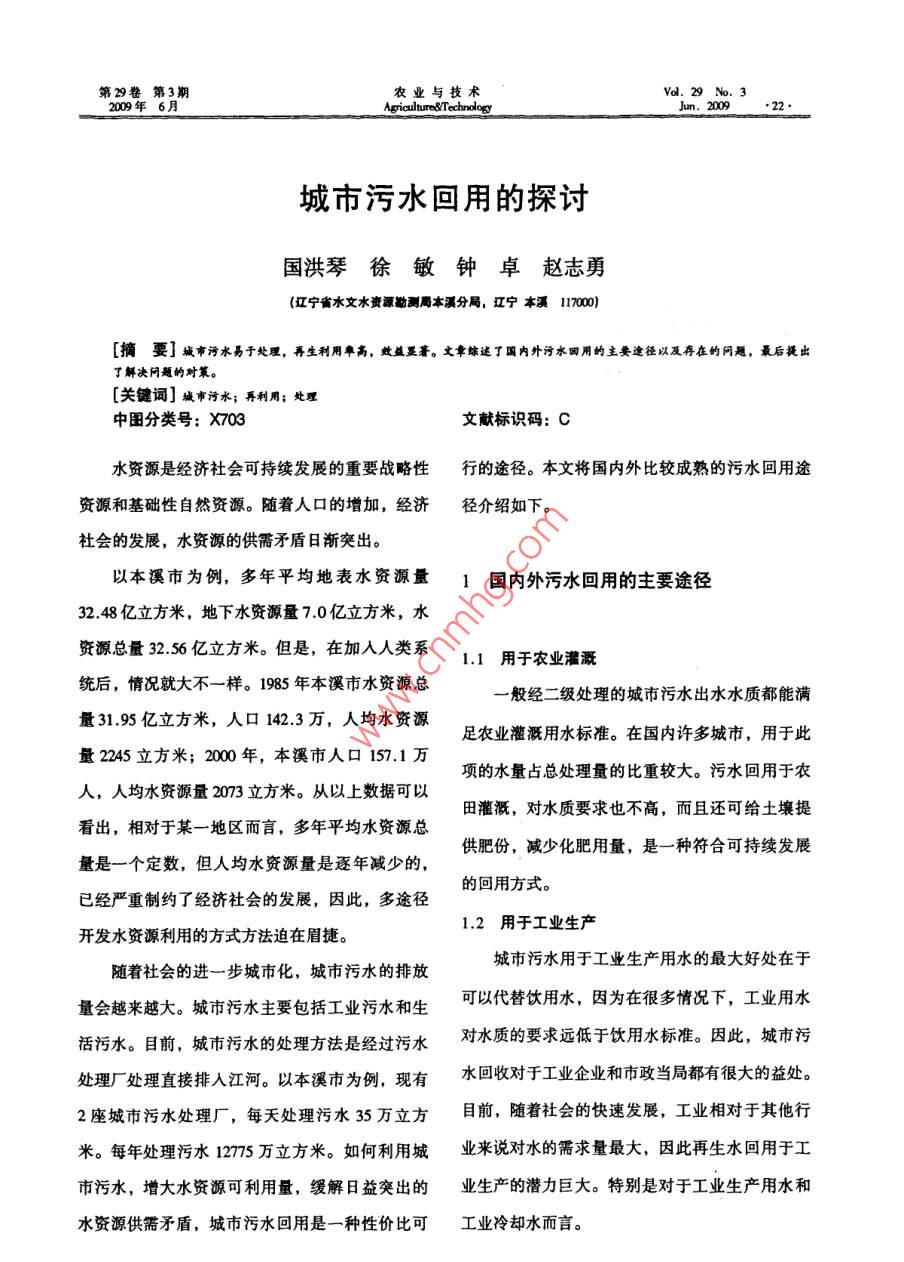 第29卷第3期農(nóng)業(yè)與技術(shù)vd.29N.3200年6月城市污水回用的探討國(guó)洪琴徐敏鐘卓趙志勇遼寧省水文水資源勘測(cè)局本溪分局,遼寧本漢11700[摘要]城市污水易于處理,再生利用阜高,效益墨蕃。文章綜逑了國(guó)內(nèi)外污水四用的主要遼徑以及存在的問(wèn)題,最后提出了解決問(wèn)題的對(duì)策。關(guān)鍵詞]城市污水;再利用;處理中圖分類(lèi)號(hào):X703文獻(xiàn)標(biāo)識(shí)碼:C水資源是經(jīng)濟(jì)社會(huì)可持續(xù)發(fā)展的重要戰(zhàn)略性行的途徑。本文將國(guó)內(nèi)外比較成熟的污水回用途資源和基礎(chǔ)性自然資源。隨著人口的增加,經(jīng)濟(jì)徑介紹如下。社會(huì)的發(fā)展,水資源的供需矛盾日漸突出。以本溪市為例,多年平均地表水資源量1國(guó)內(nèi)外污水回用的主要途徑32.48億立方米,地下水資源量70億立方米,水資源總量3256億立方米。但是,在加入人類(lèi)系1.1用于農(nóng)業(yè)灌溉統(tǒng)后,情況就大不一樣。1985年本溪市水資源總一般經(jīng)二級(jí)處理的城市污水出水水質(zhì)都能滿(mǎn)量31.95億立方米,人口142.3萬(wàn),人均水資源足農(nóng)業(yè)灌溉用水標(biāo)準(zhǔn)。在國(guó)內(nèi)許多城市,用于此量2245立方米;2000年,本溪市人口157.1萬(wàn)項(xiàng)的水量占總處理量的比重較大。污水回用于農(nóng)人,人均水資源量2073立方米。從以上數(shù)據(jù)可以田灌溉,對(duì)水質(zhì)要求也不高,而且還可給土壤提看出,相對(duì)于某一地區(qū)而言,多年平均水資源總供肥份,減少化肥用量,是一種符合可持續(xù)發(fā)展量是一個(gè)定數(shù),但人均水資源量是逐年減少的,已經(jīng)嚴(yán)重制約了經(jīng)濟(jì)社會(huì)的發(fā)展,因此,多途徑的回用方式。開(kāi)發(fā)水資源利用的方式方法迫在眉捷。1.2用于工業(yè)生產(chǎn)隨著社會(huì)的進(jìn)一步城市化,城市污水的排放城市污水用于工業(yè)生產(chǎn)用水的最大好處在于量會(huì)越來(lái)越大。城市污水主要包括工業(yè)污水和生可以代替飲用水,因?yàn)樵诤芏嗲闆r下,工業(yè)用水活污水。目前,城市污水的處理方法是經(jīng)過(guò)污水對(duì)水質(zhì)的要求遠(yuǎn)低于飲用水標(biāo)準(zhǔn)。因此,城市污處理廠(chǎng)處理直接排入江河。以本溪市為例,現(xiàn)有水回收對(duì)于工業(yè)企業(yè)和市政當(dāng)局都有很大的益處。2座城市污水處理廠(chǎng),每天處理污水35萬(wàn)立方目前,隨著社會(huì)的快速發(fā)展,工業(yè)相對(duì)于其他行米。每年處理污水1275萬(wàn)立方米。如何利用城業(yè)來(lái)說(shuō)對(duì)水的需求量最大,因此再生水回用于工市污水,增大水資源可利用量,緩解日益突出的業(yè)生產(chǎn)的潛力巨大。特別是對(duì)于工業(yè)生產(chǎn)用水和水資源供需矛盾,城市污水回用是一種性?xún)r(jià)比可工業(yè)冷卻水而言。23·200年6月農(nóng)業(yè)與技d.a、313用于景觀(guān)用水管網(wǎng)建設(shè)滯后,多數(shù)地區(qū)雨污不分,使污水處理目前,隨著水資源的缺乏和水污染的日益嚴(yán)廠(chǎng)系統(tǒng)的整體效率低下。重,各城市越來(lái)越多地將城市污水凈化回用于娛2.,2法規(guī)和配套政策不完善樂(lè)景觀(guān)用水。目前我國(guó)污水管理的法規(guī)不完善,政策不健1.4用于回灌地下水全。對(duì)欠費(fèi)和拒繳污水處理費(fèi)的用戶(hù)以及經(jīng)營(yíng)困城市污水地下回灌深度處理方法一般為傳統(tǒng)難、無(wú)力交費(fèi)的企業(yè)尚無(wú)有效的制約和懲罰措施。的污水處理方法,廢水處理的程度則取決于回灌城市污水再生利用需要健全的法制保障和全面的的水量與水質(zhì)、地下水盆地和天然地下水稀釋的統(tǒng)一管理,而我國(guó)城市污水再生利用的法規(guī)和政可能性、土壤類(lèi)型、地下水深度、回灌方式、使策還需要完善。在城市污水再生利用工程的可行用前在含水層中的停留時(shí)間等。性研究、立項(xiàng)、設(shè)計(jì)、建成和改造中,要建立相1.5用于城市生活用水應(yīng)的規(guī)范和再生水水質(zhì)標(biāo)準(zhǔn),改革管理體制和服前城市生活用水已占城市用水量的50%左務(wù)體系,在衛(wèi)生安全、生產(chǎn)過(guò)程、產(chǎn)品質(zhì)量等方右,隨著城市的發(fā)展還將進(jìn)一步增加。目前全國(guó)面,保障每一個(gè)再生水使用單位享有免受不良影人均生活用水量為212L/d(其中城市為2L/d)。響的基本權(quán)益在城市用水中,只有2/3的水直接或間接用于飲23融資困難用,其他1/3的用途都可以由再生水代替。經(jīng)二在我國(guó)列入計(jì)劃的建設(shè)項(xiàng)目,其資金來(lái)源由級(jí)處理的城市污水,再經(jīng)過(guò)深度處理,即可回用。中央政府補(bǔ)助資金、地方政府自籌資金和國(guó)內(nèi)外1.6用于市政雜用銀行貸款幾方面構(gòu)成。雖然中央政府逐年擴(kuò)大污城市污水經(jīng)二級(jí)處理后,可以用于道路沖刷、水處理的建設(shè)計(jì)劃,也不斷增加了中央補(bǔ)助資金澆灑綠地、沖洗車(chē)輛、建筑施工降塵用水等的投入,但是,即使在經(jīng)濟(jì)較發(fā)達(dá)的地區(qū),地方政府自籌資金和申請(qǐng)銀行貸款也有相當(dāng)?shù)睦щy。2污水再利用存在的問(wèn)題總的來(lái)說(shuō),如何有效融資現(xiàn)在基本還處在摸索階