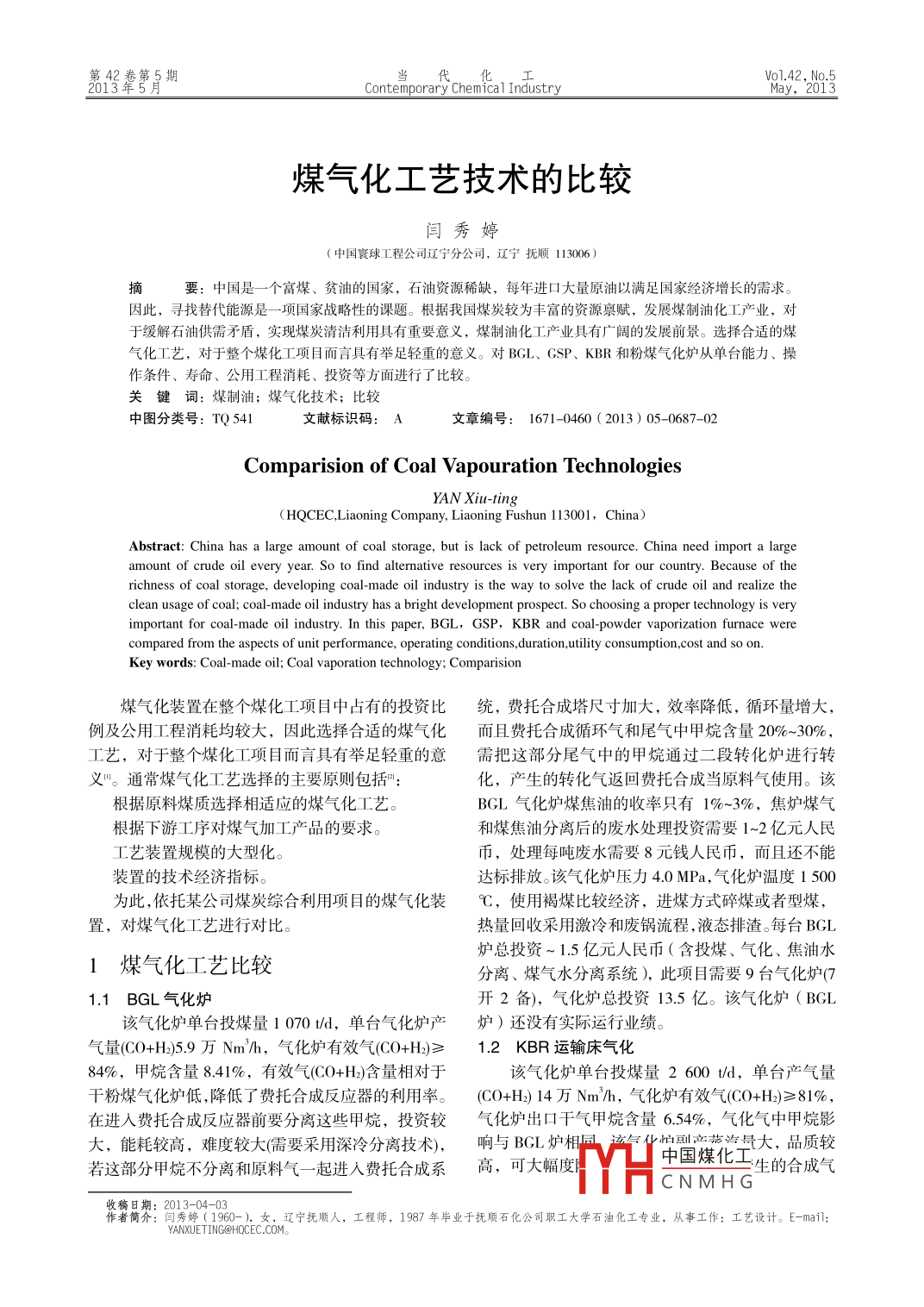 第42卷第5期Vo1.42013年5月Contemporary Chemical IndustryMay煤氣化工藝技術(shù)的比較閆秀婷(中國(guó)寰球工程公司遼寧分公司,遼寧撫順113006)摘要:中國(guó)是一個(gè)富煤、貧油的國(guó)家,石油資源稀缺,每年進(jìn)口大量原油以滿足國(guó)家經(jīng)濟(jì)增長(zhǎng)的需求因此,尋找替代能源是一項(xiàng)國(guó)家戰(zhàn)略性的課題。根據(jù)我國(guó)煤炭較為豐富的資源稟賦,發(fā)展煤制油化工產(chǎn)業(yè),對(duì)于緩解石油供需矛盾,實(shí)現(xiàn)煤炭清潔利用具有重要意義,煤制油化工產(chǎn)業(yè)具有廣闊的發(fā)展前景。選擇合適的煤氣化工藝,對(duì)于整個(gè)煤化工項(xiàng)目而言具有舉足輕重的意義。對(duì)BGL、GSP、KBR和粉煤氣化爐從單臺(tái)能力、操作條件、壽命、公用工程消耗、投資等方面進(jìn)行了比較關(guān)鍵詞:煤制油;煤氣化技術(shù);比較中圖分類號(hào):TQ541文獻(xiàn)標(biāo)識(shí)碼:A文章編號(hào):1671-0460(2013)05-0687-02Comparision of Coal vapouration TechnologiesYAN Xiu-ting(HQCEC, Liaoning Company, Liaoning Fushun 113001, China)Abstract: China has a large amount of coal storage, but is lack of petroleum resource. China need import a largeamount of crude oil every year. So to find alternative resources is very important for our country. Because of therichness of coal storage, developing coal-made oil industry is the way to solve the lack of crude oil and realize theclean usage of coal; coal-made oil industry has a bright development prospect. So choosing a proper technology is veryimportant for coal-made oil industry. In this paper, BGL, GSP, KBR and coal-powder vaporization furnace werecompared from the aspects of unit performance, operating conditions, duration, utility consumption, cost and so onKey words: Coal-made oil; Coal vaporation technology; Comparision煤氣化裝置在整個(gè)煤化工項(xiàng)目中占有的投資比統(tǒng),費(fèi)托合成塔尺寸加大,效率降低,循環(huán)量增大,例及公用工程消耗均較大,因此選擇合適的煤氣化而且費(fèi)托合成循環(huán)氣和尾氣中甲烷含量20%~30%,工藝,對(duì)于整個(gè)煤化工項(xiàng)目而言具有舉足輕重的意需把這部分尾氣中的甲烷通過(guò)二段轉(zhuǎn)化爐進(jìn)行轉(zhuǎn)義。通常煤氣化工藝選擇的主要原則包括化,產(chǎn)生的轉(zhuǎn)化氣返回費(fèi)托合成當(dāng)原料氣使用。該根據(jù)原料煤質(zhì)選擇相適應(yīng)的煤氣化工藝。BGL氣化爐煤焦油的收率只有1%-~3%,焦?fàn)t煤氣根據(jù)下游工序?qū)γ簹饧庸ぎa(chǎn)品的要求和煤焦油分離后的廢水處理投資需要1~2億元人民工藝裝置規(guī)模的大型化。幣,處理每噸廢水需要8元錢人民幣,而且還不能裝置的技術(shù)經(jīng)濟(jì)指標(biāo)。達(dá)標(biāo)排放。該氣化爐壓力40MPa,氣化爐溫度1500為此,依托某公司煤炭綜合利用項(xiàng)目的煤氣化裝℃,使用褐煤比較經(jīng)濟(jì),進(jìn)煤方式碎煤或者型煤置,對(duì)煤氣化工藝進(jìn)行對(duì)比。熱量回收采用激冷和廢鍋流程,液態(tài)排渣。每臺(tái)BCL爐總投資~1.5億元人民幣(含投煤、氣化、焦油水煤氣化工藝比較分離、煤氣水分離系統(tǒng)),此項(xiàng)目需要9臺(tái)氣化爐(71.1BGL氣化爐開(kāi)2備),氣化爐總投資13.5億。該氣化爐(BCI該氣化爐單臺(tái)投煤量1070td,單臺(tái)氣化爐產(chǎn)爐)還沒(méi)有實(shí)際運(yùn)行業(yè)績(jī)氣量(CO+H1)5.9萬(wàn)Nmh,氣化爐有效氣CO+H)≥12KBR運(yùn)輸床氣化84%,甲烷含量8.41%,有效氣(CO+H)含量相對(duì)于該氣化爐單臺(tái)投煤量2600td,單臺(tái)產(chǎn)氣量干粉煤氣化爐低,降低了費(fèi)托合成反應(yīng)器的利用率。(CO+H2)14萬(wàn)Nm/h,氣化爐有效氣CO+H)≥81%在進(jìn)入費(fèi)托合成反應(yīng)器前要分離這些甲烷,投資較氣化爐出口干氣甲烷含量654%,氣化氣中甲烷影大,能耗較高,難度較大需要采用深冷分離技術(shù)),響與BCL爐柙忙副立量大,品質(zhì)較若這部分甲烷不分離和原料氣一起進(jìn)入費(fèi)托合成系高,可大幅度中國(guó)煤化工生的合成氣CNMHG收稿日期:2013-04-03者簡(jiǎn)介:閆秀婷(1960-),女,遼寧撫順人,工程師,1987年畢業(yè)于撫順石化公司職工大學(xué)石油化工專業(yè),從事工作:工藝設(shè)計(jì)。E-mailYANXUETINGOHOCEC. COM2013年5月表1氣化爐參數(shù)比較Table 1 Vapouration furnace data comparisionHCO較高,可減小下游變換裝置的能力。由于該GSP爐(航天爐)KBR爐氣化爐屬于循環(huán)流化床氣化爐,固態(tài)排渣,沒(méi)有廢氣化爐壓力MPa水,但灰渣容易堵塞廢熱鍋爐管子,灰渣和氣化氣氣化爐溫度/℃1400-16001300-1800900-1000單臺(tái)氣化爐投煤量分離難度較大,而且氣化爐物料循環(huán)的動(dòng)力為三分GSP爐20001070航天爐2600之一的氣化氣作為循環(huán)氣使用,能量消耗大,而且單臺(tái)氣化爐產(chǎn)氣量GSP爐59000135000進(jìn)入氣化爐的管子多達(dá)100個(gè)左右,儀表控制系統(tǒng)航天爐110000比較復(fù)雜。該氣化爐壓力40MPa,氣化爐溫度100040008000單臺(tái)氣化爐運(yùn)行h(3個(gè)月(6個(gè)月℃,使用褐煤比較經(jīng)濟(jì)(廣東東莞和內(nèi)蒙博源設(shè)計(jì)氣化爐臺(tái)數(shù)GSP4(無(wú)備爐)7開(kāi)2備)航天爐6無(wú)備爐)3(無(wú)備爐煤種均為褐煤),進(jìn)煤方式煤粉用氣化氣輸送,熱量回收采用廢鍋流程,固態(tài)排渣,該氣化爐細(xì)灰中含氣化爐型式冷壁爐冷壁爐熱壁爐單噴嘴多噴管碳量65%(送入鍋爐進(jìn)行燃燒),粗灰中含碳量5%。