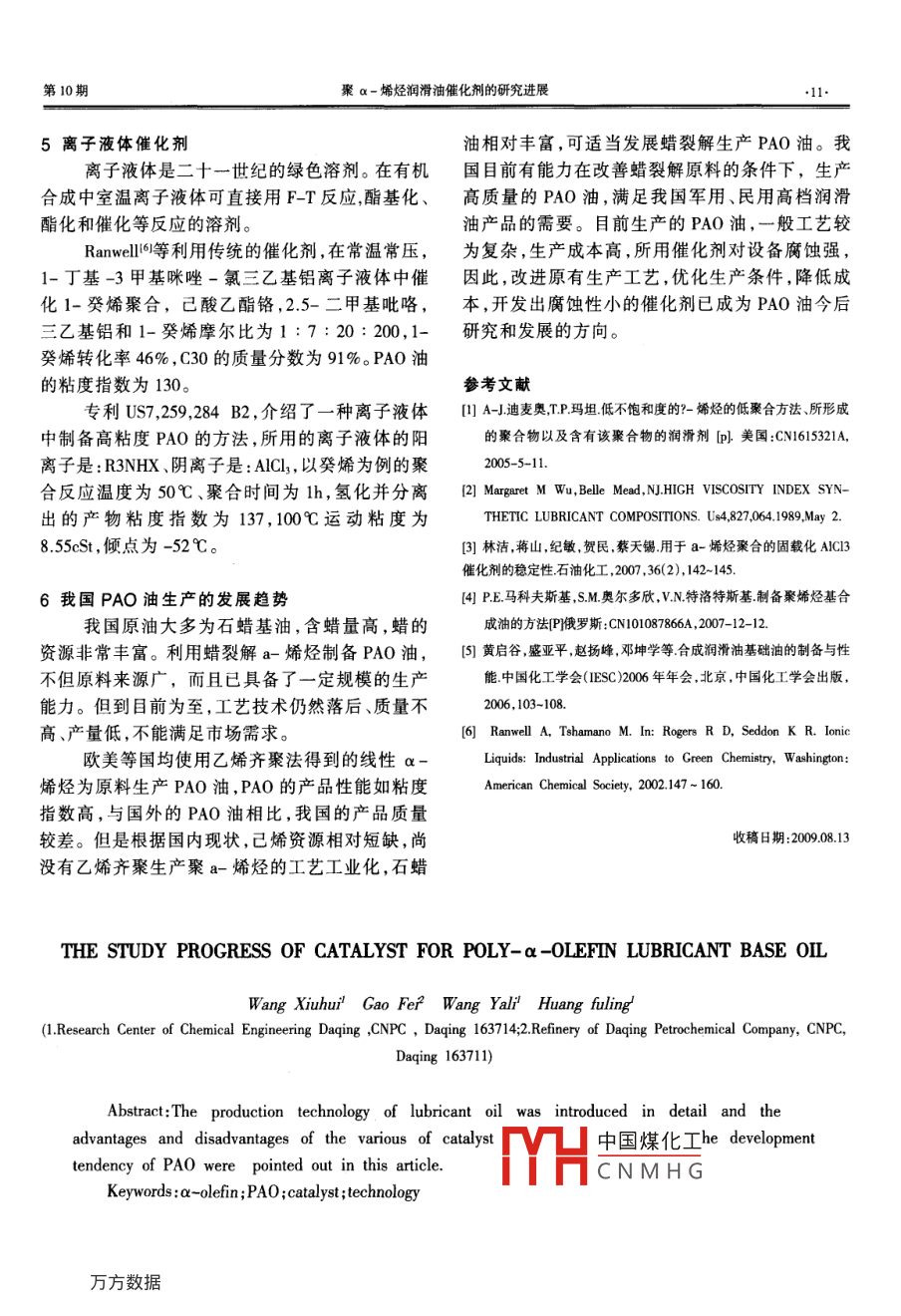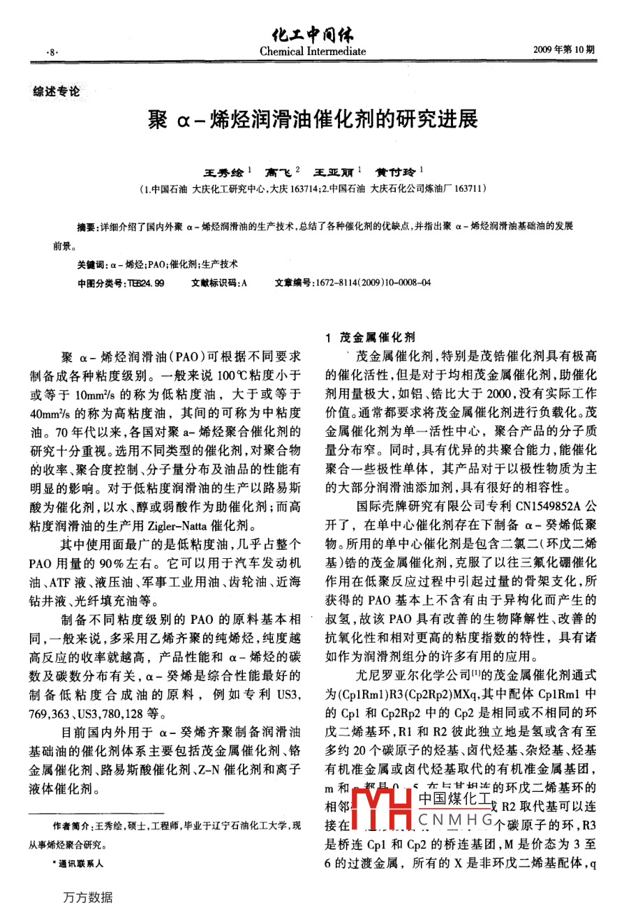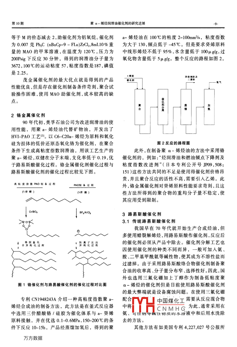 化工中間體Chemical Intermediate2009年第10期綜述專論聚∝-烯烴潤滑油催化劑的研究進(jìn)展王秀繪1高飛2王亞丌1黃付玲(1中國石油大慶化工研究中心,大慶163714;2中國石油大慶石化公司煉油廠163711)摘要:詳細(xì)介紹了國內(nèi)外聚a-烯烴潤滑油的生產(chǎn)技術(shù),總結(jié)了各種催化劑的優(yōu)缺點(diǎn),并指出聚α-烯烴潤滑油基礎(chǔ)油的發(fā)展前景。關(guān)鍵詞:a-烯烴;PAO;催化劑;生產(chǎn)技術(shù)中圖分類號:T24.99獻(xiàn)標(biāo)識碼:A文章編號:1672-8114(200)10008-041茂金屬催化劑聚a-烯烴潤滑油(PAO)可根據(jù)不同要求茂金屬催化劑,特別是茂鋯催化劑具有極高制備成各種粘度級別。一般來說100℃粘度小于的催化活性,但是對于均相茂金屬催化劑,助催化或等于10mms的稱為低粘度油,大于或等于劑用量極大,如鋁、鋯比大于200,.沒有實(shí)際工作40mm/s的稱為高粘度油,其間的可稱為中粘度價(jià)值。通常都要求將茂金屬催化劑進(jìn)行負(fù)載化。茂油。70年代以來,各國對聚a-烯烴聚合催化劑的金屬催化劑為單一活性中心,聚合產(chǎn)品的分子質(zhì)研究十分重視。選用不同類型的催化劑,對聚合物量分布窄。同時(shí),具有優(yōu)異的共聚合能力能催化的收率、聚合度控制、分子量分布及油品的性能有聚合一些極性單體,其產(chǎn)品對于以極性物質(zhì)為主明顯的影響。對于低粘度潤滑油的生產(chǎn)以路易斯的大部分潤滑油添加劑,具有很好的相容性。酸為催化劑,以水、醇或弱酸作為助催化劑;而高國際殼牌研究有限公司專利CN1549852A公粘度潤滑油的生產(chǎn)用zger-Nata催化劑。開了,在單中心催化劑存在下制備α-癸烯低聚其中使用面最廣的是低粘度油,幾乎占整個(gè)物。所用的單中心催化劑是包含二氯二(環(huán)戊二烯PAO用量的90%左右。它可以用于汽車發(fā)動機(jī)基)鋯的茂金屬催化劑,克服了以往三氟化硼催化油、ATF液、液壓油、軍事工業(yè)用油、齒輪油、近海作用在低聚反應(yīng)過程中引起過量的骨架支化,所鉆井液、光纖填充油等。獲得的PAO基本上不含有由于異構(gòu)化而產(chǎn)生的制備不同粘度級別的PAO的原料基本相叔氫,故該P(yáng)AO具有改善的生物降解性、改善的同,一般來說,多釆用乙烯齊聚的純烯烴,純度越抗氧化性和相對更高的粘度指數(shù)的特性,具有諸高反應(yīng)的收率就越高,產(chǎn)品性能和α-烯烴的碳如作為潤滑劑組分的許多有用的應(yīng)用數(shù)及碳數(shù)分布有關(guān),a-癸烯是綜合性能最好的尤尼羅亞爾化學(xué)公司叩的茂金屬催化劑通式制備低粘度合成油的原料,例如專利US3,為 CprM1)R3Cp2Rp2)MXq,其中配體 CprM1中769,363、US3,780,128等。的Cpl和Cp2Rp2中的Cp2是相同或不相同的環(huán)目前國內(nèi)外用于α-癸烯齊聚制備潤滑油戊二烯基環(huán),R1和R2彼此獨(dú)立地是氫或含有至基礎(chǔ)油的催化劑體系主要包括茂金屬催化劑、鉻多約20個(gè)碳原子的烴基、鹵代烴基、雜烴基烴基金屬催化劑、路易斯酸催化劑、Z-N催化劑和離子有機(jī)準(zhǔn)金屬或鹵代烴基取代的有機(jī)準(zhǔn)金屬基團(tuán),液體催化劑。和廣書≤在與甘婦連的環(huán)戊二烯基環(huán)的相鄰中國煤化工R2取代基可以連作者簡介:王秀繪碩士,工程師畢業(yè)于遼寧石油化工大學(xué)現(xiàn)接在CNMHG個(gè)碳原子的環(huán),R3從事烯烴聚合研究是橋連Cpl和Cp2的橋連基團(tuán),M是價(jià)態(tài)為3至通訊聯(lián)系人6的過渡金屬,所有的X是非環(huán)戊二烯基配體,q第10期聚a-烯烴潤滑油催化劑的研究進(jìn)展等于M的價(jià)態(tài)減去2,助催化劑為鋁氧烷。催化劑a-烯烴油在100℃的粘度2-100mm3s,粘度指數(shù)為0007克Ph2C( nBu Cp-9-FIu)ZrCl28mL10%重為大于130,傾點(diǎn)低于-45℃。但是要求癸烯原料量的MAO的甲苯溶液,在溫度為120℃,壓力為中線形烯烴不低于95%,水含量低于100μg,過200Psig下反應(yīng)30分鐘,得到的潤滑油分子量為氧化物含量低于5μgg。整個(gè)反應(yīng)的路程如圖2。672,100℃的運(yùn)動粘度57,粘度指數(shù)是187,碘值網(wǎng)收烯烴及茂金屬催化劑的最大優(yōu)點(diǎn)就是得到的產(chǎn)品性能優(yōu)良,但是存在催化劑制備條件苛刻,聚合試驗(yàn)操作困難,使用MAO助催化劑,成本較高的缺點(diǎn)2鉻金屬催化劑90年代初,美乎石油公司為改進(jìn)潤滑油的使用性能,用聚a-烯烴油代替礦物油,開發(fā)出了HVI-PAO工藝2。以C6-C20a-烯烴為原料和氧化硅為擔(dān)體的低價(jià)還原態(tài)氧化鉻為催化劑,在聚合圖2反應(yīng)的路程圖條件下生成高粘度指數(shù)潤滑油,用該工藝生產(chǎn)的此外,在制備聚a-烯烴油的方法中采用鉻聚a-烯烴,雙健在分子末端,支化率低于0.19,優(yōu)催化劑的,例如:“烴潤滑油和燃油傾點(diǎn)下降劑及于路易斯酸催化過程。鉻金屬催化劑催化過程與粘度指數(shù)改進(jìn)劑”(日本專利公開號JP09,508;路易斯酸催化劑的催化過程比較見下圖。151)這些方法共同的不足是使用得催化劑價(jià)格昂貴,并且聚合反應(yīng)的活性不高,需要引入乙烯。此高粘度指數(shù)PAO制備過程PAo制備過程外,鉻金屬催化劑對癸烯原料性能要求苛刻,且這(1殷)1酸)些方法所得到的聚合物的重均分子量不穩(wěn)定,使其應(yīng)用受到限制。Cr/sOT3路易斯酸催化劑3.1傳統(tǒng)路易斯酸催化劑我國早在70年代就開始生產(chǎn)合成烴油,但多使用蠟裂解烯烴,