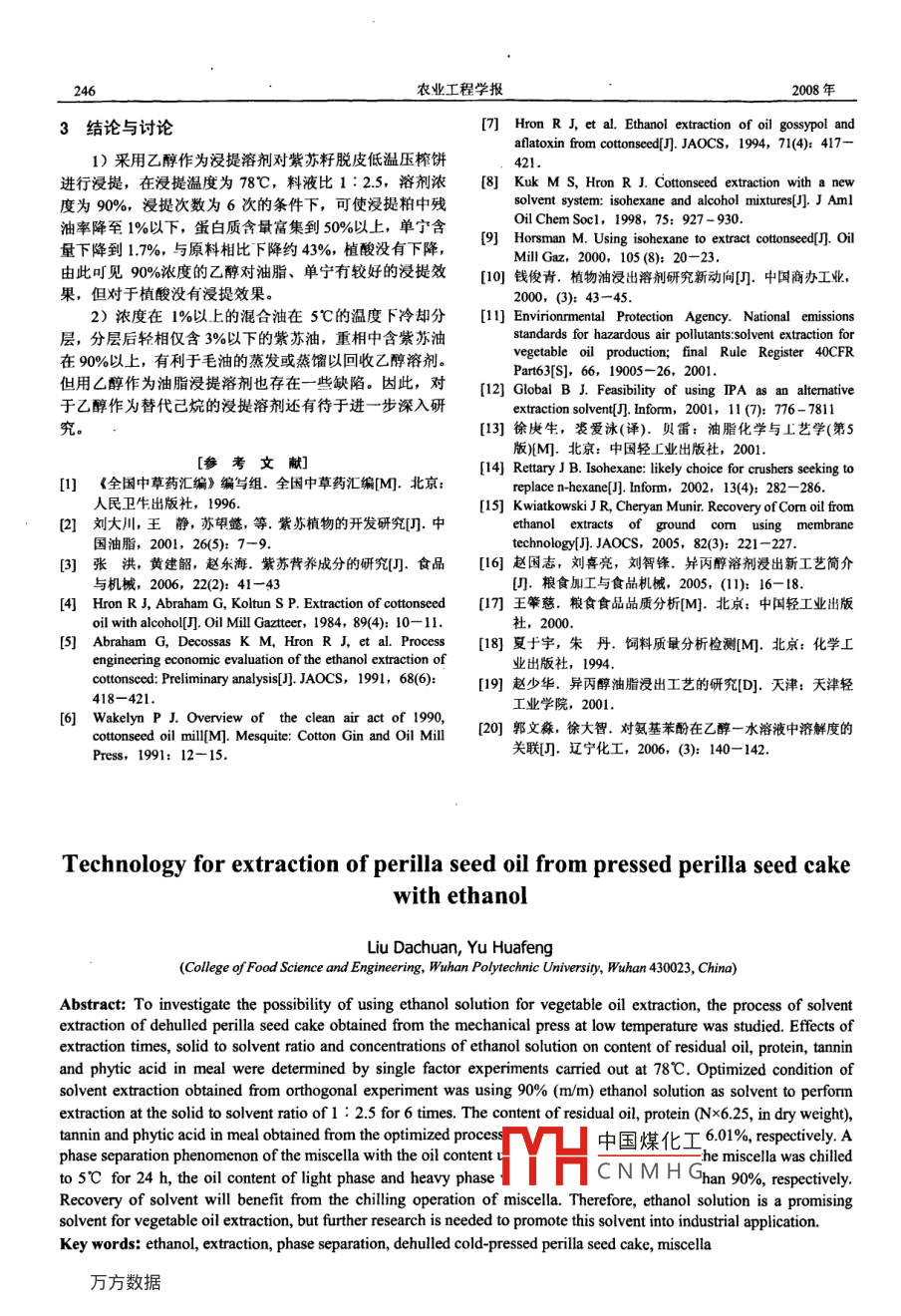 第24卷第l1期農(nóng)業(yè)工程學(xué)報(bào)Vol 24 No 112422008年11月Transactions of the CSAENov.2008乙醇浸提紫蘇籽壓榨餅中油脂的工藝劉大川,余華峰(武漢工業(yè)學(xué)院食品科學(xué)與工程學(xué)院,武漢430023)摘要:為探討乙醇作為植物油浸提溶劑的可行性,對乙醇溶液浸提紫蘇籽低溫壓榨餅的工藝進(jìn)行了研究。在浸提溫度78℃下,采用單因素試驗(yàn)考察了浸提次數(shù)、料液比、乙醇濃度等因素對浸提粕中的殘油率、蛋白質(zhì)、單寧及植酸含量的影響。通過正交試驗(yàn)獲得優(yōu)化的工藝條件為:沒提次數(shù)為6次,料液比1:2.5,乙醇濃度90%。在該工藝條件下,所獲得的紫蘇浸提粕中殘油率為046%,蛋白質(zhì)含量為505%(N×6,25,干基),單寧含量為17%,植酸含量為601%當(dāng)浸提所獲混合油中油含量超過1%時(shí),將混合油冷卻至5℃下24h可觀察到分相現(xiàn)象,其中輕相含油量在3%以下,重相含油量在90%以上,有利于溶劑回叫收。因此,將∠醇溶液作為植物油脂浸提溶劑有很大的潛力,但還需開展進(jìn)一步的研究以推進(jìn)該溶劑的工業(yè)應(yīng)用。關(guān)鍵詞:乙醇,浸提,相分離,脫皮低溫冷榨紫蘇籽餅,混合油中圖分類號:TS2244文獻(xiàn)標(biāo)識碼:A文章編號;1002-6819(2008)-11-0242-05劉大川,余華峰.乙醇浸提紫蘇籽壓榨餅中油脂的工藝[].農(nóng)業(yè)工程學(xué)報(bào),2008,24(11):242-246.Liu Dachuan, Yu Huafeng. Technology for extraction of perilla seed oil from pressed perilla seed cake with ethanol[J]Transactions of the CSAE, 2008, 24(11): 242-246 (in Chinese with English abstract)題4。但對乙醇作為一種新型的植物油浸提溶劑的探索0引言性研究仍然是很有意義的。紫蘇[ Perilla frutescens ( L)Bi,系唇形科一年生草本試驗(yàn)采用不同濃度乙醇在78℃的溫度下對紫蘇籽本植物,作為多用途的經(jīng)濟(jì)植物在中國已有2000多年的脫皮低溫壓榨餅進(jìn)行浸提,主要探索一定濃度的乙醇對栽培歷史,它是中國傳統(tǒng)的藥食兩用植物,亦是國家衛(wèi)紫蘇籽脫皮低溫壓榨餅中油脂的浸提能力,檢測并分析牛部首批頒布的既是食品又是藥品的60種中藥之一,其浸提后粕中蛋白質(zhì)、單寧、植酸含量的變化,期望同時(shí)資源遍布全國20個(gè)省份。紫蘇籽富含油脂,含油率為得到蛋白質(zhì)含量較高、單寧等抗?fàn)I養(yǎng)因子較低的紫蘇籽40%~45%,紫蘇油中富含α-亞麻酸,含量高達(dá)55%粕。測定每次浸提混合油的濃度,并將每次浸提混合油65%,是優(yōu)良的保健食用油。a亞麻酸是人體中必需脂肪在5℃的條件下冷卻分離24h,分析分層后重相和輕相中酸之一,紫蘇油具有降低血漿膽固醇(TC)和血清甘三含油量的情況,探討較好的混合油冷卻分層工藝條件。酯(TG)水平,顯著提高血清高密度脂膽固醇(HDLC)用乙醇做溶劑浸提紫蘇籽壓榨餅中油脂并同時(shí)脫除粕中含量的作用,并具有一定的減肥作用23。紫蘇資源的綜單寧等抗?fàn)I養(yǎng)因子的工藝研究尚未見報(bào)道。合高效利用已成為人們關(guān)注的問題。由于已烷作為植物油浸提溶劑存在著極易燃燒和不1材料和方法可再生等缺點(diǎn),特別1990年美國清潔空氣法案又將正1.1材料與設(shè)備己烷列為18項(xiàng)空氣污染有害物質(zhì)之一,引起了人們的質(zhì)1.1.1材料疑。過去20年間國內(nèi)外研究單位都在尋找用于植物油浸紫蘇杍脫皮低溫壓榨餅,由湖北李時(shí)珍保健油責(zé)任提的能夠替代正己烷的新型溶劑,在通過對多種有機(jī)溶有限公司提供。其基本成分如下:含水率62%,原料含劑研究篩選后,短碳鏈醇和除己烷以外的短鏈烴成為目油率87%,粗蛋白42.1%,單寧30%,植酸5%前研究的重點(diǎn)。乙醇是一種利用農(nóng)副產(chǎn)物經(jīng)發(fā)酵生產(chǎn)可乙醇,無水乙醚,濃硫酸,硫酸鉀,硫酸銅,單寧再生的溶劑,其安全性比正己烷好生產(chǎn)技術(shù)完善供給酸,鎢酸鈉,磷鉬酸,氫氧化鈉等試劑,均為分析純。有保障。更為引人注目的是乙醇在浸提植物油的同時(shí)也1.1.2試驗(yàn)儀器與設(shè)備能浸提油料中其它抗?fàn)I養(yǎng)因子如單寧、棉酚、硫甙,這滲濾式玻璃浸提裝置(自制);HH-S恒溫水浴鍋(江是己烷所不具有的。雖然乙醇作為浸提溶劑也存在對油蘇金壇市大地自動化儀器廠); OHAUS-AR2140型萬分之的溶解度有限,汽化潛熱大,回收能耗高;對油料粕吸電子天平(奧斯豪因際貿(mào)易公司);RE52CS旋轉(zhuǎn)蒸發(fā)附性強(qiáng),不易分離;含水乙醇可從原料中浸提較多的糖器(江蘇恒豐儀器廠);SHzⅢ-循壞水真空泵(江蘇恒類和膠質(zhì)等缺點(diǎn),要實(shí)現(xiàn)工業(yè)化生產(chǎn)還必須解決很多問豐儀儀收稿日期:2007-1105修訂日期:20080920動化H中國煤化工風(fēng)干爍箱(江蘇恒豐CNMH(江蘇金壇市大地自分碎機(jī)(奧斯豪國際貿(mào)作者簡介:劉大川(1943-),男,湖南會同縣人,教授,主要從事油脂及植物蛋白方面的教學(xué)與研究。武漢武漢工業(yè)學(xué)院,430023易公司);JB90D型強(qiáng)力電動攪拌機(jī)(江蘇恒豐儀器廠);501型超級恒溫水浴鍋(江蘇金壇市大地自動化儀器廠)第11期刂大川等:乙醇浸提紫蘇耔壓榨餅中油脂的工藝243中混合油放入底瓶,再將混合油由底瓶抽至上面進(jìn)行循1.2檢測方法環(huán)2~3次,以保證浸提效果,通過改變浸提次數(shù),料液1.2.1浸提粕中成分測定比,溶劑濃度3個(gè)因素用乙醇對紫蘇籽脫皮低溫壓榨餅水分測定方法:GB31019917;粗脂