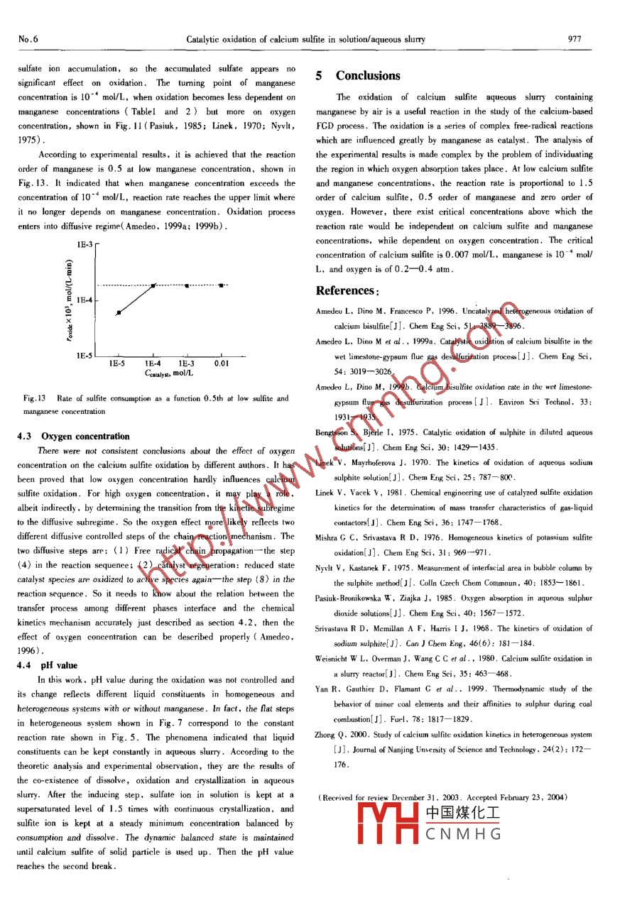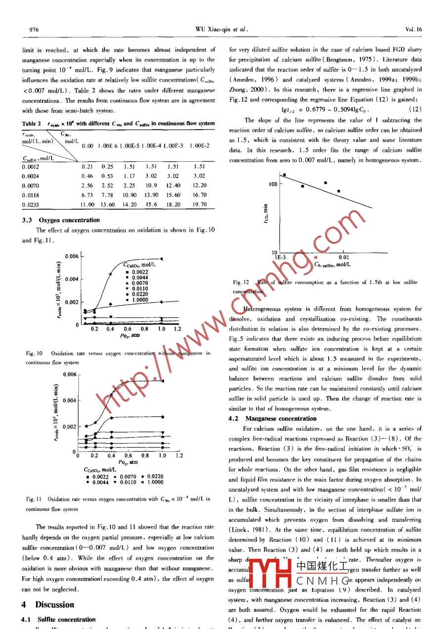 Journal of Entionmenal Sciences Val. I6.No.6.pp .973- -977 ,2004CNI1-236291Y___Article D: 101.074242004)06-0973-050CLC number: X131.1 Document code: ACatalytic oxidation of calcium sulfite in solution/ aqueous slurryWU Xiao-qin, WU Zhong- biao" , w ANG Da-hui.hui( Deparment of Enironmental Engineering, Zhejiang University , Hangzhou 310027, China. E mail: wuzb@ mail . hz . zj. cn: zbwu@ zju. edu. cn)Abstract: Forced oxidation of calcium sulite aqueous slurry is a key step for the calcium-based flue gas desulfurization( FGD) residue.Experiments were conducted in a semi-batch system and a continuous flow system on lab scales. The main reactor in semi-batch systemisa 1000 ml volume flask. It has five necks for continuous feeding of gas and a batch of calcium sulite solution/aqueous slury. Incontinuous flow system, the main part is a jacketed Pyrex glass reactor in which gas and solution/aqueous slury are fed continuously.Calclum sulite oxidatin is a series of complex free radical reactions. According to experimental results and literature data. the reactionsare infuenced signiticantly by manganese as catalyst. At low concentration of manganese and calcium sulite, the reaction rate isdependent on 1.5 order of sulfite concentration, 0.5 order of manganese concentration, and zero order of oxygen concentration in whichthe oxidation is contolled by chemical kinetics. With concentrations of calcium sulfite and manganese increasing, the reactions areindependent gradually on the constituents in solution but are impacted by oxygen concentration. Manganese can accelerate the free-radicalreactions. and then enhances the mass transter of oxygen from gas to liquid. The critical concentration of calcium sulfite is 0.007 mol/L,manganese is 10 mol/L, and oxygen is of 0.2-0.4 atm.Keywords: calcium- based FGD; calcium sulite; manganese; catalyzed oxidationHSO; + 1/202→S0:- + H',(1)Introductionso; + 1/202→s0:(2)Caleium-based FGD process is the most common commercialIn fact, they are a sequence of very complex free radical reactionsmethod for removal of SO2 emission from combustion of fossil fuel.involving a number of highly reactive intermediate species:Scnubbing suries forned in the process consist of calcium sulfte andS0;- + Me"→. S0; + Me*=-',(k)sulfate . The sluries presenly deposited in environment will bring serious.S0; + O2→.SO;, (k2)(4)waste problem. So practice use of the slurries becomes a topic of greal●SO;+So;-→so;-+.s0;,(k;)(5)interest in the study of caleium-based FCD process. Moreover, caleiumS0;+ s0;→250:-,(h)(6)sulfate is a neutral product, and is ully uilized in the building.SO; +.sO; →2S0; + O, (k,)(7)industry as Bypsum. Therefore, the sluries are preferred to calciumsulfate as an end product, and the simplest method for the surries2Me'-11 + 2H2O+ O2→2Me"+changed into calcium sulfate is forced oxidation by air.20H° + H,02. (K)(8)Catalyzed sulfite oxidation has been used to measure gas dispersersOf the radical reactions, it is assumed that the Reaction (4) isand other mas-transfer equipments for about one hundred years.rapid which would not constraint the total reaction rate. the reactions areAccording to the results achieved before. sulite concentration rangedterminated by radical species combination in Reaction (7). and Reactionfrom 0.2 to 0.8 mol/L and the kinetics of catalyzed sulite oxidation is(8) keeps thermodynamic equilibrium during oxidation. So it can beextremely complex which has many features in common of soluion phasedenived that the oxidaion rate expression by using the steady- siatefree radical reactions. From half of 1970s, sulfte oxidation was paidapproximation:more atention 10 for its use in waste product oxidation of FCD process(9)within the air pllution. In the case of caleiun- based serubbing thesulite ion concentrations will be low because of precipitation of calciumseo.(臺) .sulfite. 。Therefore only investigations on very diluted sulfte solutions areMoreover, the concentration of sulfite in aqueous slury containingrelevant for the oxidation in calcium- based scrubbing slurries undercalcium is governed by the ollowing equilibrium only as long as thetypical FGD conditions. Some of the investigations will be discussedconcentration of calcium sulfate( final product) is below its precipitationbelow. Homogeneous syslem with sulfte concentration formn zero to 0.007level:mol/L was studied as well as heterogeneous system. Of the systems, onlygas-liquid mass transfer and sulite oxidation exist in homogencousWith the concentration of ealcium increasing due to the formation ofsystem,while the process of dissolve. oxidation and esysallizationmore soluble calcium sulfate. the concentration of So; diminishes tocoexists in heterogeneous system, which is the main difference betweenachieve the minimum value fixed by the additional equilibrium:homogeneous system and heterogencous system.CaSO..→Ca”+ s0;(11)1 Mechanism中國煤化工iation. and srlzationIn aqueous slurry, calcium sulfte fored oxidation mainly appearsappear t:MHC NMH G'eous slumry .in liquid phase. The oxidation reactions are generally described as2 Experimental apparatus and procedurefollows( Srivastava.1968; Mishra, 1976; Linek, 1981):The experiments were carried out in homogeneous system and inFoundation item: The National Hi-Tech R&D Program( 863) of China(No. 2001AA642030 - 1); * Corresponding author974WU Xiao-qin et al.Vol.16heterogeneous system. The former was done to determine the rate3expression for calcium sulfte in solution. The lab scale experimentalapparalus were thermostatic stiming tanks for semi-batch process ancontinuous Alow process(Fig.1 and Fig.2). The seni-batch process也consists of a mechanically agitated thermostatic reactor, which is a 1000ml volume fask. The flask has five necks for a continuous feedinge of gas飛10and a batch of solution/aqueous slurry. In the continuous flow process.the main reactor is mnade of Pyrex glass, which is a jacketed, and 0.1312m ID eylinder w