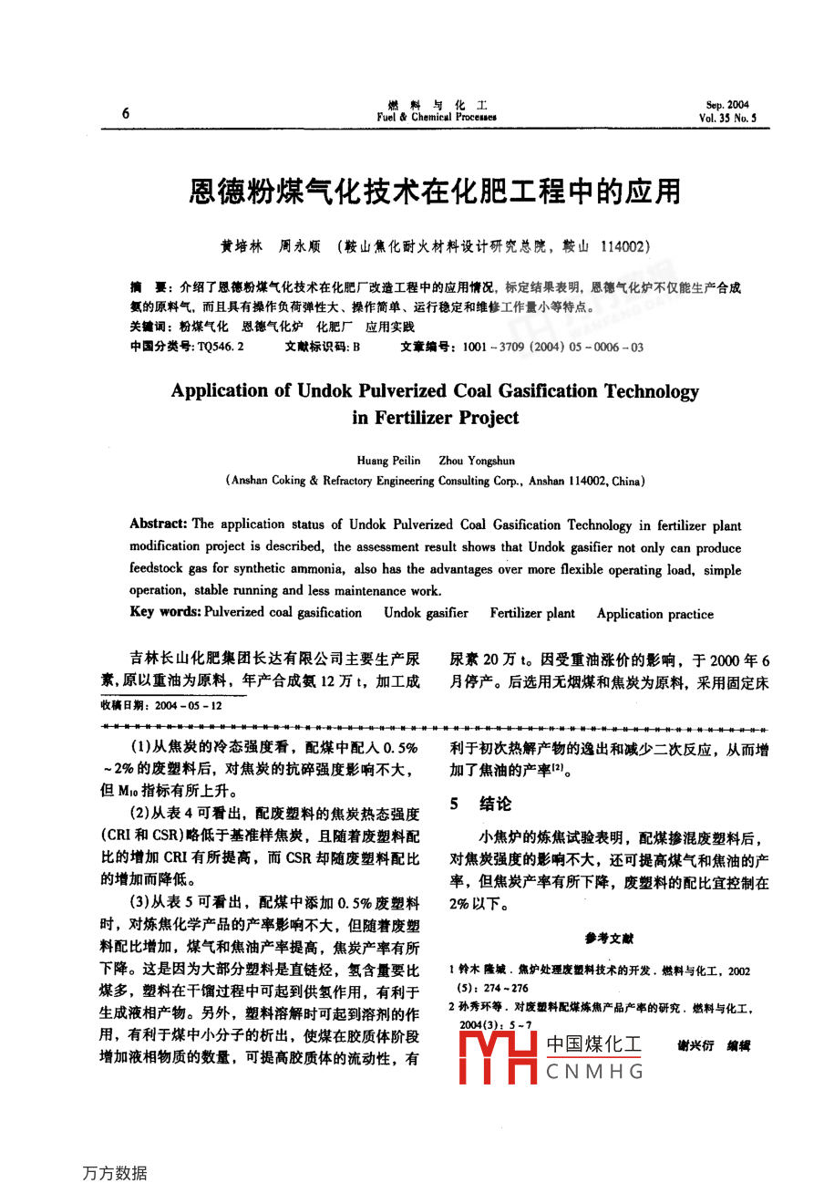 然料與化工5ep. 2004Fuel晶Chemicsul ProcesesVol.' 35 No.5恩德粉煤氣化技術(shù)在化肥工程中的應(yīng)用黃培林周永順(鞍山焦化酎火材料設(shè)計(jì)研究總院,鞍山114002)摘要: 介紹了恩德粉煤氣化技術(shù)在化肥廠改造工程中的應(yīng)用情況,標(biāo)定結(jié)果表明,恩德氣化爐不僅能生產(chǎn)合成氨的原料氣,而且具有操作負(fù)荷彈性大、操作簡(jiǎn)單、運(yùn)行穩(wěn)定和維修工作量小等特點(diǎn)。關(guān)鍵詞:粉煤氣化恩德氣化爐化肥廠應(yīng)用實(shí)踐中國(guó)分類號(hào): TQ546.2文獻(xiàn)標(biāo)識(shí)碼: B文章編號(hào): 1001 - 3709 (2004) 05 -0006 -03Application of Undok Pulverized Coal Gasification Technologyin Ferilizer ProjectHuang Peilin Zhou Yonghun(Anshan Coking & Refractory Engincering Consuling Corp, Anshan 114002, China)Abstract: The application status of Undok Pulverized Coal Gasification Technology in fertilizer plantmodification project is described, the assessment result shows that Undok gasifier not only can producefeedstock gas for synthetic ammonia, also has the advantages over more flexible operating load, simpleoperation, stable running and less maintenance work.Key words: Pulerized coal gasification Undok gasifer Fertilizer plant Application practice吉林長(zhǎng)山化肥集團(tuán)長(zhǎng)達(dá)有限公司主要生產(chǎn)尿尿素20萬(wàn)t。因受重油漲價(jià)的影響,于2000年6素,原以重油為原料,年產(chǎn)合成氨12萬(wàn)t,加工成月停產(chǎn)。后選用無(wú)煙煤和焦炭為原料,采用固定床收稿日期: 2004 -05-12(1)從焦炭的冷態(tài)強(qiáng)度看,配煤中配人0. 5% .利于初次熱解產(chǎn)物的逸出和減少二次反應(yīng),從而增~ 2%的廢塑料后,對(duì)焦炭的抗碎強(qiáng)度影響不大,加了焦油的產(chǎn)率1。但Mo指標(biāo)有所上升。(2)從表4可看出,配廢塑料的焦炭熱態(tài)強(qiáng)度5結(jié)論(CRI和CSR)略低于基準(zhǔn)樣焦炭,且隨著廢塑料配小焦?fàn)t的煉焦試驗(yàn)表明,配煤摻混廢塑料后,比的增加CRI有所提高,而CSR卻隨廢塑料配比對(duì)焦炭強(qiáng)度的影響不大,還可提高煤氣和焦油的產(chǎn)的增加而降低。率,但焦炭產(chǎn)率有所下降,廢塑料的配比宜控制在(3)從表5可看出,配煤中添加0.5%廢塑料2%以下。時(shí),對(duì)煉焦化學(xué)產(chǎn)品的產(chǎn)率影響不大,但隨著廢塑參考文獻(xiàn)料配比增加,煤氣和焦油產(chǎn)率提高,焦炭產(chǎn)率有所下降。這是因?yàn)榇蟛糠炙芰鲜侵辨湡N,氫含量要比1鈴木隆城.焦?fàn)t處理廢塑料技術(shù)的開發(fā).燃料與化工, 2002煤多,塑料在干餾過(guò)程中可起到供氫作用,有利于(5): 274-276生成液相產(chǎn)物。另外,塑料溶解時(shí)可起到溶劑的作2孫秀環(huán)等.對(duì)廢塑料配煤煉焦產(chǎn)品產(chǎn)事的研究.燃料與化工,2004(3): 5-用,有利于煤中小分子的析出,使煤在膠質(zhì)體階段中國(guó)煤化工謝興衍編輯增加液相物質(zhì)的數(shù)量,可提高膠質(zhì)體的流動(dòng)性,有YHCNMHG2004年9月燃料與化工第35糧第5期Fuel & Chemical Proceses7式富氧連續(xù)氣化技術(shù),于2002年3月重新投產(chǎn)。改造工程于2003年3月28日破土動(dòng)工,廠房但受原料價(jià)格、運(yùn)輸和資源等條件制約,2003年及基礎(chǔ)均按4萬(wàn)m'/h恩德粉煤氣化裝I t設(shè)計(jì)和施初僅能維持半負(fù)荷生產(chǎn),企業(yè)處于虧損局面。為了工,當(dāng)年12月22日生產(chǎn)出了合格的煤氣,一期工降低生產(chǎn)成本,公司決定用恩德粉煤氣化技術(shù)改造程實(shí)現(xiàn)了當(dāng)年設(shè)計(jì),當(dāng)年投產(chǎn),總投資6 000萬(wàn)元,原氣化工藝。改造工程于2003年投產(chǎn),現(xiàn)已達(dá)到但不包括煤干燥及污水處理設(shè)施。了年產(chǎn)合成氨18萬(wàn)t,加工尿素30萬(wàn)l的生產(chǎn)能4生產(chǎn)標(biāo)定力。2004年2月26~29日,煤炭科學(xué)研究總院北1設(shè)計(jì)規(guī)模 .京煤化工研究分院對(duì)1號(hào)爐進(jìn)行了標(biāo)定,標(biāo)定結(jié)果設(shè)計(jì)規(guī)模為8萬(wàn)m'/h半水煤氣,分兩期建設(shè),見(jiàn)表1~5。-期工程規(guī)模為4萬(wàn)m'/h, 選用2臺(tái)恩德粉煤氣化爐,待二期建成后再將原富氧連續(xù)氣化爐停產(chǎn)。表2恩德?tīng)t的灰 和飛灰組成由于本項(xiàng)目為技改工程,除制氣系統(tǒng)新建外,盡可碳/%全碗/%灰渣能地利用了原有設(shè)施。即在現(xiàn)有煤場(chǎng)內(nèi)新增了原料10.10.09人廢熱鍋爐碳/%全碗/% 氫/% 氮/%煤干燥和儲(chǔ)存設(shè)備,對(duì)循環(huán)水系統(tǒng)的沉淀池進(jìn)行了煤氣中的飛灰上26.130.200.040.14擴(kuò)容,恩德?tīng)t所需的富氧空氣鼓風(fēng)機(jī)設(shè)在鼓風(fēng)機(jī)室內(nèi),自控操作室仍利用現(xiàn)有煤氣站的自控操作室,表3煤氣洗濠水化驗(yàn)結(jié)果凈化系統(tǒng)接點(diǎn)在原煤氣站的常壓脫硫塔前。工程所懸浮物/pompH油/ngL總磷/ng-L-酚/ng:需的軟水、蒸汽、電、氧氣、氮?dú)?、壓縮空氣和工127.4000.1業(yè)水等公用設(shè)施原則上不再新增設(shè)施。員4 恩德氣化爐的操作數(shù)據(jù)2工藝流程一次富氧空氣二次富氧空氣鼓風(fēng)量I 流量/mh-壓力APE流t/m2’:h-|壓力/Pa原料煤經(jīng)干燥、破碎和篩分后用皮帶機(jī)送至加11 224.0628.60 2317.99 20.74壓密封倉(cāng),粉煤經(jīng)螺旋加煤機(jī)送人恩德氣化爐底部高氧空氣濃度/%70.92的錐體段。蒸汽與富氧空氣混合后,再與過(guò)熱蒸汽蒸汽耗