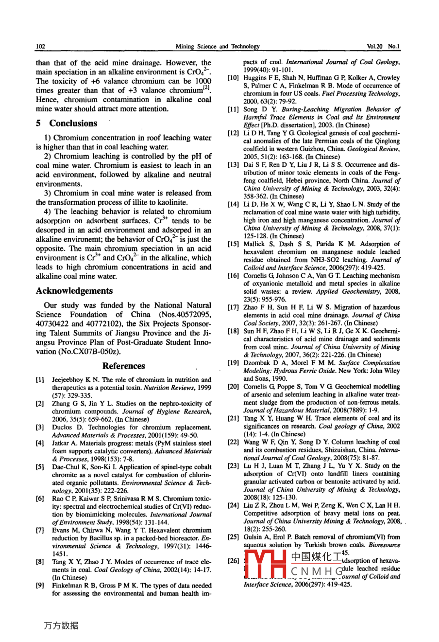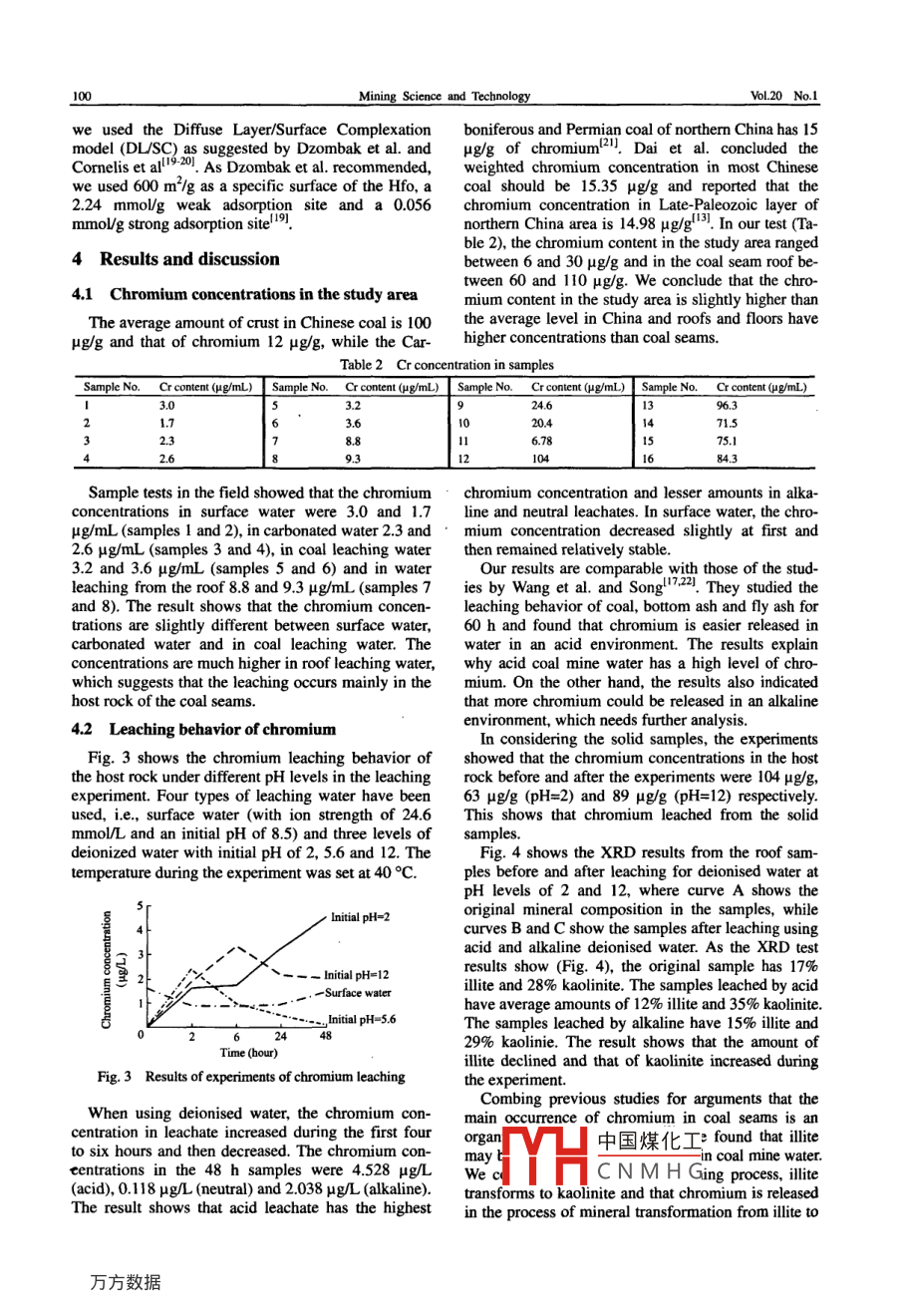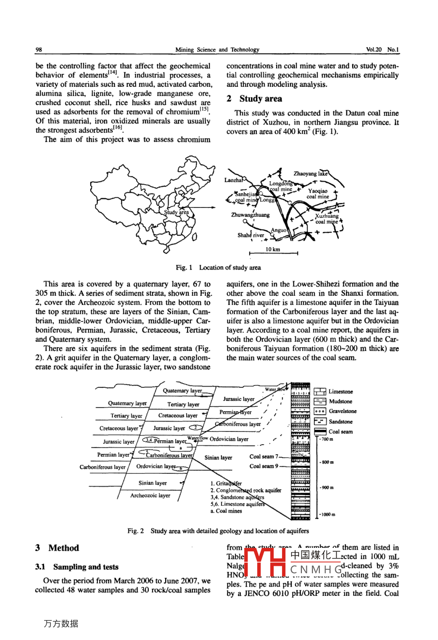 藏等9lineatwww.sclencedirect.comMININGScience DirectSCIENCE ANDTECHNOLOGYELSEVIERMining Science and Technology 20(2010)0097-0102www.elsevier.com/locate/jcumtChromium leaching mechanism of coal mine watera modeling study based on Xuzhou-Datun coal mine districtSHAN Yao, QIN Yong, WANG WenferSchool of Resource and Earth Science, China University of Mining Technology Xuzhou 221116, ChinaAbstract: In order to investigate chromium contamination of coal mine water, to analyze chromium leaching mechanism and toevaluate environment pollution potential of coal mine water, we perform site investigations, physical and computer modeling in theXuzhou- Datun coal mine district. The result of our test samples shows that chromium concentration was 9 ug/L in roof leachate and3 ug/L in coal leachate. The host rock has a higher pollution potential than that of coal seams. Leaching experiments and XRD testresults indicate that chromium is released from the process of transforming illite to kaolinite. The pH, pe and temperature of coalmine water affect the chromium leaching behavior. Modeling results suggest that the adsorption of adsorbents controls chromiumoncentration in coal mine water. The chromium adsorption ratio is quite low in both an acid and in an alkaline environmentTherefore, coal mine water has a high pollution potential. Under other conditions, chromium adsorption is stronger in a neutralwater environment, so that chromium concentrations may be very lowKeywords: chromium; coal mine water; leaching1 Introductioning and found that 40% of its chromium wasleached. That led to the discovery of the associationChromium is an essential element in the human of chromium and clay. Huggins et al. studied chro-body and can be used in treating resistance to insu- mium in American coal and found two major in-lin.An appropriate supply of chromium is therefore stances of its occurrence, i. e, in clay and in associa-helpful to treat diabetes. On the other hand, an exces- tion with organic matter!. The chromium, largelysive intake of chromium may hurt human organs. associated with clay minerals, is found in illite,ac-Kidneys may be damaged when people are in contact counting for between 10% and 50% of all chromium.with or overdose on chromium compounds, leading The percentage of chromium found in organic asso-to a change in renal functions, in enzymes and protein ciation in coal ranges from about 50% to 90% of allconcentration. Kidney necrosis can occur in cases of chromium amounts, difficult to leach. Song in a studyheavy overdoses". In a wide range of industrial op- of coal geochemistry in the north of Shanxi Province,erations, such as electroplating, stainless steel pro- argued that chromium is found mainly in illite!l .Liduction and catalytic processes, large amounts of et al. and Dai et al. thought the main chromium oc-toxic chromium compounds are generated and then currence in coal was in association with clay and finedischarged into the environment 5-ol. Although chro- particle minerals2-131. Both teams used sequentialmium is less toxic than lead and mercury, the extraction and statistical analyseshexavalent form of chromium has been shown to beIn coal mine water, minerals may be transformedcarcinogenic.So, understanding the chromiumand release chromium under suitable conditions oftransformation behavior and mechanism is of real pH, pe and temperature. Mineral-water interaction isimportance in environmental protection.an important process that releases toxic metals intoThe occurrence of chromium in coal seams has the environment and endangers human health andreceived worldwide attention for its environment im- environmental health alike. This interaction processpact. The chromium in coal seams may occur in or- includes a series of equilibrium and kinetic reactionsganic substances, clay minerals and some detrital between water-rock and water-coal, i. e, in oxidation-minerals. Finkelman et al. investigated coal leach- reduction, dissolution-precipitation, adsorption-desorpchamao the dinsolution-precipitaeceived 23 June 2009: 12 September 2009中國煤化工important roles inCorresponding author. Tel: 8651683590091the bCNMHGAE-mail address: yaoshan@ gmaiL.cordoi:10.10l6S16745264(09)60168Xas clay, iron and manganese oxidized minerals mayScience and TechnologyVol 20 No. 1be the controlling factor that affect the geochemical concentrations in coal mine water and to study poten-behavior of elements4!. In industrial processes, a tial controlling geochemical mechanisms empiricallyvariety of materials such as red mud, activated carbon, and through modeling analysisalumina silica, lignite, low-grade manganese ore,crushed coconut shell, rice husks and sawdust2 Study areaused as adsorbents for the removal of chromium'This study was conducted in the Datun coal mineOf this material, iron oxidized minerals are usually district of Xuzhou, in northern Jiangsu province. Itthe strongest adsorbents 6covers an area of 400 km"( Fig. 1)The aim of this project was to assess chromiumnFig. 1 Location of study areaThis area is covered by a quaternary layer, 67 to aquifers, one in the Lower-Shihezi formation and the305 m thick. A series of sediment strata, shown in Fig. other above the coal seam in the Shanxi formation2, cover the Archeozoic system. From the bottom to The fifth aquifer is a limestone aquifer in the Taiyuanthe top stratum, these are layers of the Sinian, Cam- formation of the Carboniferous layer and the last aqbrian, middle-lower Ordovician, middle-upper Car- uifer is also a limestone aquifer but in the Ordovicianboniferous, Permian, Jurassic, Cretaceous, Tertiary layer. According to a coal mine report, the aquifers inand Quaternary system.both the Ordovician layer(600 m thick) and the Car-There are six aquifers in the sediment strata(Fig. boniferous Taiyuan formation(180-200 m thick)2). a grit aquifer in the quaternary layer, a conglom- the main water sources of the coal seam.erate rock aquifer in the Jurassic laye