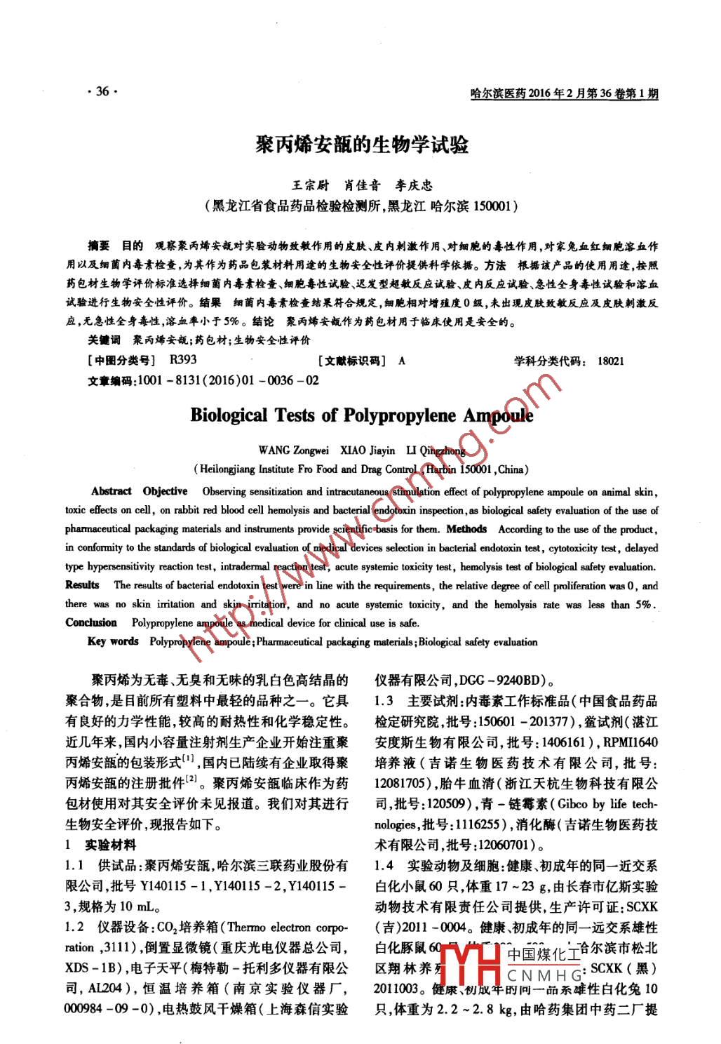 哈爾濱醫(yī)藥2016年2月第36卷第1期聚丙烯安瓿的生物學(xué)試驗王宗尉肖佳音李慶忠(黑龍江省食品藥品檢驗檢測所,黑龍江哈爾濱150001)摘要目的觀察聚丙烯安瓿對實驗動物致敏作用的皮膚、皮內(nèi)刺激作用、對細(xì)胞的毒性作用,對家兔血紅細(xì)胞溶血作用以及細(xì)菌內(nèi)毒肅檢查,為其作為藥品包裝材料用途的生物安全性評價提供科學(xué)依據(jù)。方法根攝該產(chǎn)品的使用用遼,按照藥包材生物學(xué)評價標(biāo)準(zhǔn)選擇細(xì)菌內(nèi)毒纛檢查、細(xì)胞毒性試驗、遲發(fā)型超敏反應(yīng)試驗、皮內(nèi)反應(yīng)試驗、急性全身毒性誠驗和溶血試驗進行生物安全性評價。續(xù)果細(xì)菌內(nèi)毒意檢查結(jié)果符合規(guī)定,細(xì)胞相對增殖度0級,未出現(xiàn)皮膚致敏反應(yīng)及皮膚刺激反應(yīng),無急性全身毒性,溶血率小于5%。結(jié)論聚丙烯安瓿作為藥包材用于臨床使用是安全的。關(guān)鍵詞聚丙烯安瓿;藥包材;生物安全性評價[中圖分類號]R393[文獻(xiàn)標(biāo)識碼]A學(xué)科分類代碼:18021文章編碼:1001-8131(2016)01-0036-02Biological Tests of Polypropylene AmpouleWANG Zongwei XIAo Jiayin LI QingzhongHeilongjiang Institute Fro Food and Drag Control, Harbin 150001, China)Abstract Objective Observing sensitization and intracutaneous stimulation effect of polypropylene ampoule on animal skintoxic effects on cell, on rabbit red blood cell hemolysis and bacterial endotoxin inspection, as biological safety evaluation of the use ofpharmaceutical packaging materials and instruments provide scientific basis for them. Methods According to the use of the productin conformity to the standards of biological evaluation of medical devices selection in bacterial endotoxin test, cytotoxicity test, delayedtype hypersensitivity reaction test, intradermal reaction test, acute systemic toxicity test, hemolysis test of biological safety evaluation.Results The results of bacterial endotoxin test were in line with the requirements, the relative degree of cell proliferation was0, andthere was no skin irritation and skin irritation, and no acute systemic toxicity, and the hemolysis rate was less than 5%Conclusion Polypropylene ampoule as medical device for clinical use is safeKey words Polypropylene ampoule; Pharmaceutical packaging materials; Biological safety evaluation聚丙烯為無毒、無臭和無味的乳白色高結(jié)晶的儀器有限公司,DCG-9240BD聚合物,是目前所有塑料中最輕的品種之一。它具1.3主要試劑內(nèi)毒素工作標(biāo)準(zhǔn)品(中國食品藥品有良好的力學(xué)性能,較高的耐熱性和化學(xué)穩(wěn)定性。檢定研究院批號:150601-201377),鱟試劑(湛江近幾年來,國內(nèi)小容量注射劑生產(chǎn)企業(yè)開始注重聚安度斯生物有限公司,批號:1406161),RPMI640丙烯安瓿的包裝形式,國內(nèi)已陸續(xù)有企業(yè)取得聚培養(yǎng)液(吉諾生物醫(yī)藥技術(shù)有限公司,批號:丙烯安瓿的注冊批件2。聚丙烯安瓿臨床作為藥12081705),胎牛血清(浙江天杭生物科技有限公包材使用對其安全評價未見報道。我們對其進行司,批號:120509),青-鏈霉素( Gibco by life tech生物安全評價,現(xiàn)報告如下。nologies,批號:116255),消化酶(吉諾生物醫(yī)藥技實驗材料術(shù)有限公司,批號:12060701)。1.1供試品:聚丙烯安瓿,哈爾濱三聯(lián)藥業(yè)股份有1.4實驗動物及細(xì)胞:健康、初成年的同一近交系限公司,批號Y140115-1,Y140115-2,Y140115-白化小鼠60只,體重17-23g,由長春市億斯實驗規(guī)格為10mL。動物技術(shù)有限責(zé)任公司提供,生產(chǎn)許可證:SCXK1.2儀器設(shè)備:CO2培養(yǎng)箱( Thermo electron corpo(吉)2011-0004。健康初成年的同一遠(yuǎn)交系雄性ration,311)倒置顯微鏡(重慶光電儀器總公司,白化豚鼠60T中國煤化子合爾濱市松北XDS-1B),電子天平(梅特勒-托利多儀器有限公區(qū)翔林養(yǎng)CNMHSCXK(黑)司,AL204),恒溫培養(yǎng)箱(南京實驗儀器廠,2011003。健、仞成牛的問一品殺雄性白化兔10000984-09-0),電熱鼓風(fēng)干燥箱(上海森信實驗只體重為22~2.8kg,由哈藥集團中藥二廠提哈爾濱醫(yī)藥2016年2月第36卷第1期37供,生產(chǎn)許可證:SCXK(黑)2012-002。ATCC24皮內(nèi)反應(yīng)試驗將120cm樣品剪成小條加氯化cCL[ NCTC clone929(小鼠成纖維細(xì)胞)]由中科鈉注射液20m,121℃浸提60mn。家兔背部左側(cè)10院提供。個點每點皮內(nèi)注射02mL供試品浸提液;右側(cè)的5個2方法與結(jié)果點每點皮內(nèi)注射0.2mL氯化鈉注射液。按國家食品藥品監(jiān)督管理局藥包材檢驗方法注射后24h48h、72h,動物紅斑原發(fā)性刺激標(biāo)準(zhǔn)進行試驗計分(供試品紅斑均分-空白對照紅斑均分)為0,21細(xì)菌內(nèi)毒素檢查:取本品60cm2剪成小條,加水腫原發(fā)性刺激計分(供試品水腫均分-空白對照內(nèi)毒素檢查用水10mL,121℃滅菌60min,作為試水腫均分)均為0,PⅡ值(每只動物紅斑、水腫原發(fā)驗液。同批內(nèi)毒素檢查用水作為陰性對照液。4A性刺激計分總和動物總數(shù))均為0,無刺激性。內(nèi)毒素工作標(biāo)準(zhǔn)品稀釋液與試驗液混合作為陽性25急性全身毒性試驗取60cm2樣品剪成小條,加對照液。同批相同處理的內(nèi)毒素檢查用水作為空氯化鈉注射液20mL,37℃恒溫24h。按0mLkg進行白對照液。4入濃度內(nèi)毒素工作標(biāo)準(zhǔn)品稀釋液與空尾靜脈注射。白對照液混合作為空白陽性對照液。試管恒溫儀注射完畢后4h,24h,48h和72h觀察期內(nèi)37℃保溫60min后,試驗樣品組陰性對照組和