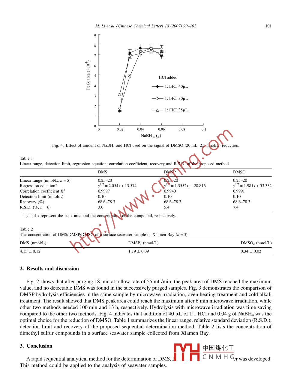 Available online at www.sciencedirect.comCHINESEScienceDirectC HEMICALL .ETTERSELSEVIERChinese Chemical Letters 18 (2007) 99-102www.elsevier.com/locate/ccletSequential analysis of dimethyl sulfur compounds in seawaterMeng Li, Dong Xing Yuan *, Quan Long Li, Xiao Ying JinState Key Lab of Marine Environmental Science, Xiamen University,Environmental Science Research Centre of Xiamen University, Xiamen 361005, ChinaReceived 15 February 2006Abstractpropionate (DMSP) and dimethylsulfoxide (DMSO), in seawater samples has been developed. Detection limit of 2.5 pmol of DMS in25 mL sample, corresponding to 0.10 nmol/L, was achieved. Recoveries for dimethyl sulfur compounds were in the range of 68.6-78.3%. The relative standard deviations (R.S.D.s) for DMS, DMSP and DMSO determination were 3.0, 5.4 and 7.4%, respectively.C 2006 Dong Xing Yuan. Published by Elsevier B.V. on behalf of Chinese Chemical Society. All rights reserved.Keywords: Dimethylsulfide (DMS); Dimethylsulfoniopropionate (DMSP); Dimethylsulfoxide (DMSO); Purge and trap; Microwave iradiation;Sequential analysisLiquid extraction [1], cryogen-trap [2], isotopic dilution [3,4] and solid phase microextraction [5] had been used todetermine dimethylsulfide (DMS) in seawater. However, those methods are laborious, high detection limit or costly. Inorder to measure dimethylsulfoniopropionate (DMSP), the most popular but time consuming method is throughconverting DMSP into DMS by cold alkali treatment [6]. It had been found that microwave irradiation could acceleratethe process of DMSP hydrolysis, and thus provide a good approach to determine DMSP [7]. For measurement ofdimethylsulfoxide (DMSO) in seawater, it is needed to reduce DMSO into DMS. Titanium trichloride [8], stannouschloride [9] and enzyme [10] had been used as reducing reagents, however, these methods required complexexperimental procedures and remained analytical interferences. With HCl [1] or iron chloride [12], sodiumborohydride reduction of DMSO could proceed smoothly and efficiently. Sim6 et al. [13,14] reported a sequentialprocedure to measure DMS/DMSP/DMSO in seawater, but the method needed several hours for sample pretreatmentbefore the determination.The objective of this study was to establish a rapid and reliable method for the sequential determination of dimethylsulfur compounds in seawater.1. ExperimentalAn ENCON purge-and-trap system (EST Co., OH, USA) was coupled to a CP3800 gas chromatograph (Varian Co.,CA, USA) equipped with pulsed fame photometric detector (PFPD) in sulfur mode. The temperatures of the injectionCorresponding author.E-mail address: yuandx @ xmu.edu.cn (D.X. Yuan).中國煤化工1001-8417/$ - see front matter◎2006 Dong Xing Yuan. Published by EIsevier B.V. onCHCNMHGAll rights reserved.doi: 10.1016/.cclet.2006.1 1.005100M. Li et al./Chinese Chemical Letters 18 (2007) 99 -10225mL seawater samples↓DMS, DMSP and DMSO55 mL /min N2 purged 18min,trapped by VOCARB 3000 (10cmx 4 mm,Carbopack B/Carboxen M 1000& 1001) at 30°C.→determined DMSDMSP and DMSOAdded 0.1g NaOH, microwave iradiated6min under 200W, cooled and neutralized,converted DMSP to DMS.determined DMSAdded 2 mL 2% NaBH4,DMSOconverted DMSO to DMS.一→determined DMSFig. 1. Scheme of sequential determination of DMS, DMSP and DMSO in seawaters.2118、I5Purge flow rate區(qū)1一r - 40mL/min-?- 45mL/min士50mL/min- 55mL/min10152025303:;4(4:;50Purge time (min)Fig. 2. Effects of purge time and purge flow rate on DMS (25 mL, 3.5 nmol/L) signal.port and the detector were set at 100 and 220 °C, respectively. The flow rate of the carrier gas N2 was 5 mL/min.Splitless injection model was selected and a DB-624 column (70 m X 0.53 mm, de= 3 μm, J&W Scientific, CA,USA) was adopted. The column temperature was kept at 100 °C. The microwave system was National NN-8552WFoven. All the reagents were above analytical grade.Sample was filtered through a GF/F membrane. DMS, dissolved DMSP (DMSPd) and dissolved DMSO (DMSOa)in the filtered seawater were analysed following the procedure ilustrated in Fig. 1.0「25 [無王玉汪王文18十20 F爹18 t12首126↓(a(tc)244(80中國煤化工1 24→30Microwave time (min)Oven heating Time (:MYHCNMHGrime(hou)Fig. 3. Comparison of three methods for DMSP hydrolysis. (a) Microwave iradiation, (b) oven heating and (C) cold alkali treatment.M. Li et al./Chinese Chemical Letters 18 (2007) 99 -102101//HCl added◆1:1HCl 40μL .- <- 1:1HCl 30uL- 0- 1:1HCl 35uL0.02.040.06 .NaBH 4(g)Fig. 4. Effect of amount of NaBH4 and HCl used on the signal of DMSO (20 mL, 2.5 nmol/L) reduction.Table 1Linear range, detection limit, regression equation, correlation cofficient, recovery and R.S.D. of the proposed methodDMSDMSP .DMSOLinear range (nmol/L, n=5)0.25- -20Regression equation"yIn= 2.054x+ 13.574y2= 1.3552x - 28.816yl"2= 1.981x + 53.332Correlation cofficient R20.99400.9991Detection limit (nmol/L)0.10.10Recovery (%)68.6-78.368.6-78.3 .R.S.D. (%, n=6)3.0.4“y and x represent the peak area and the concentration of the compound, respectively.Table 2The concentration of DMS/DMSP/DMSO of a surface seawater sample of Xiamen Bay (n= 3)DMS (nmol/L)DMSPa (nmol/L)DMSO, (nmol/L)4.15土0.121.79土0.090.34土0.022. Results and discussionFig.2 shows that after purging 18 min at a flow rate of 55 mL/min, the peak area of DMS reached the maximumvalue, and no detectable DMS was found in the successively purged samples. Fig. 3 demonstrates the comparison ofDMSP hydrolysis efficiencies in the same sample by microwave iradiation, oven heating treatment and cold alkalitreatment. The result showed that DMS peak area could reach the maximum after 6 min microwave irradiation, whileother two methods needed 100 min and 13 h, respectively. Hydrolysis with microwave irradiation was time savingcompared to the other two methods. Fig. 4 indicates that addition of 40 μL of 1:1 HCI and 0.04 g of NaBH4 was theoptimal choice for the reduction of DMSO. Table 1 summarizes the linear range, relative standard deviation (R.