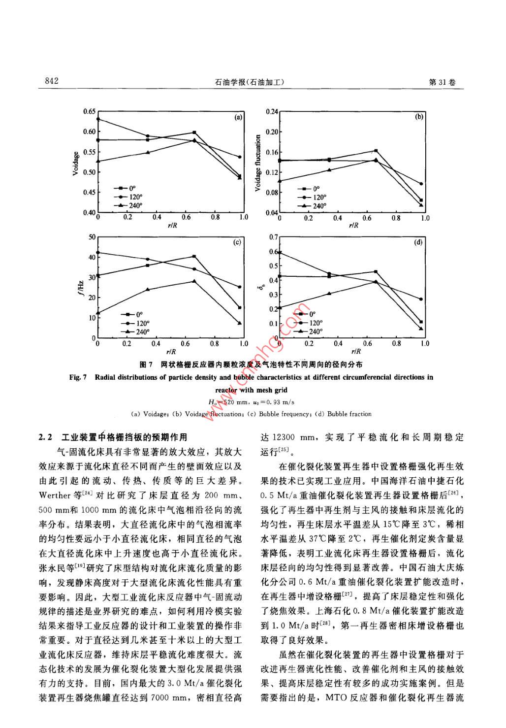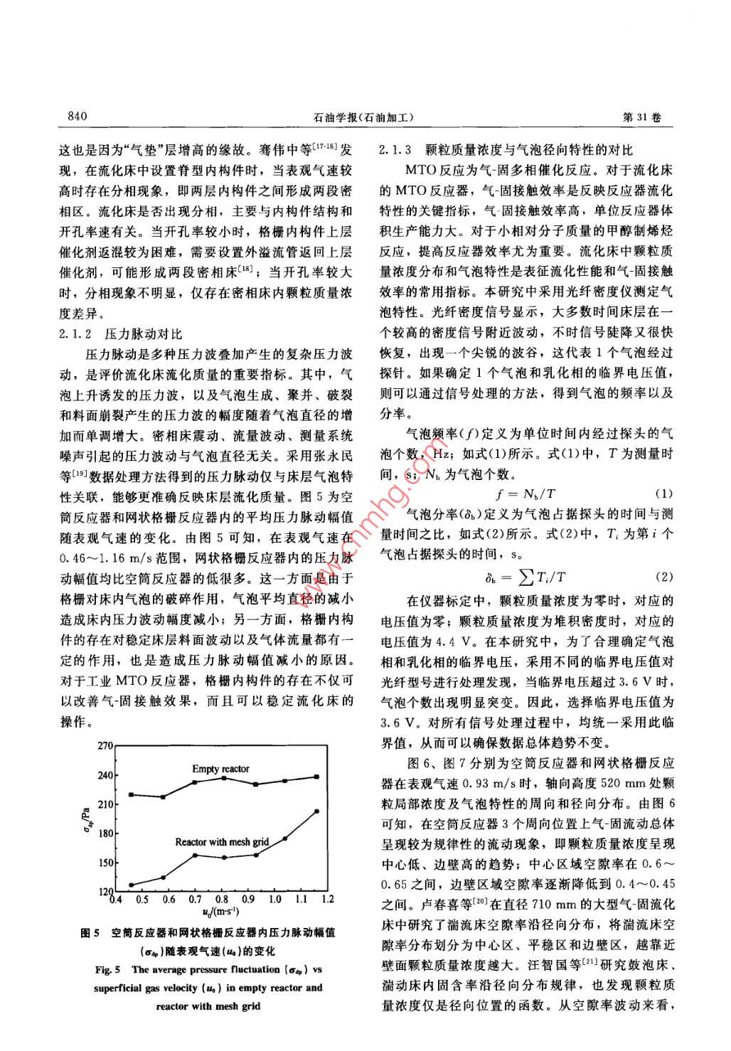 石油學(xué)報(bào)(石油加工)2015年8月ACTA PETROLEI SINICA (PETROLEUM PROCESSING SECTION)第31卷第4期文章編號(hào): 1001-8719(2015)04-0836-09甲醇制烯烴SHMTO工藝反應(yīng)器的大型冷模實(shí)驗(yàn)研究文堯順'2,吳秀章',張永民”,關(guān)豐忠',高文剛',盧衛(wèi)民',盧春喜2(1.中國神華煤制油化工有限公司,北京10011; 2. 中國石油大學(xué)重質(zhì)油國家重點(diǎn)實(shí)驗(yàn)室,北京102249)摘要:采用p376 mmX 3000 mm的大型流化床冷模實(shí)驗(yàn)裝置,對(duì)比了甲醇制烯烴SHMTO工藝反應(yīng)器中設(shè)置格柵內(nèi)構(gòu)件前后流動(dòng)規(guī)律的差異。結(jié)果表明,反應(yīng)器內(nèi)設(shè)置格柵內(nèi)構(gòu)件后,床層平均顆粒質(zhì)量濃度降低,壓力脈動(dòng)顯著降低,表明格柵可以有效地破碎氣泡、改善氣-固接觸傳質(zhì)和提高床層操作的穩(wěn)定性。增設(shè)格柵后反應(yīng)器內(nèi)氣固流動(dòng)更趨均勻,還可以強(qiáng)烈抑制固體顆粒以及氣體的軸向返混。借鑒已有流化床放大效應(yīng)的研究可以推測,工業(yè)SHMTO反應(yīng)器設(shè)置格柵后有利于穩(wěn)定床層操作、改善氣固接觸效果和防止氣體返混,有利于改善反應(yīng)產(chǎn)物的分布和產(chǎn)品選擇性。但現(xiàn)有的格柵結(jié)構(gòu)仍需進(jìn)一步優(yōu)化,以滿足工藝和工程設(shè)計(jì)的需要。關(guān)鍵詞:SHMTO工藝;冷模試驗(yàn);流化性能;反應(yīng)器;低碳烯烴中圖分類號(hào): TQ021. 4; TQ536文獻(xiàn)標(biāo)識(shí)碼: A doi: 10. 3969/j. issn. 1001-8719. 2015. 04. 002Cold-Model Experimental Study on the Hydrodynamics of SHMTO ReactorWEN Yaoshun!2, WU Xiuzhang',ZHANG Yongmin2,GUAN Fengzhong',GAO Wengang',LU Weimin',LU Chunxi?(1. China Shenhua Coal to Liquid and Chemical Co.. Lid. ,Beijing 10011. China;2. State Key Laboratory of Heavy Oil Processing , China University of Petroleum, Beijing 102249, China)Abstract: The hydrodynamics of the SHMTO' s turbulent fluidized reactor were studiedexperimentally in a large cold model apparatus of φ376 mmX 3000 mm with and without two-layer ofmesh grids. The experimental results showed that there was a noticeable decrease on average beddensity after inserting the mesh grids. The bed pressure fluctuations also decreased significantly,indicating stronger bubble splitting, better gas- solids contact and reactor operating stability. Thelateral distribution of voidage and other bubbe-related properties were observed to be more uniformin the reactor with mesh grids. Moreover, it was also found that the axial backmixing of both gasand solid phases was suppressed. Based on existing studies on fluidized bed scale-up, enhanced gas-solids contact, better reactor operating stability and more desired gas residence time distribution canbe expected in the SHMTO reactor if horizontal baffles are inserted, which will favor tenhancement of product yields and product selectivity. However, the current employed baffle in theexperiment still needs to be optimized to better satisfy the requirements of process and engineering.Key words: SHMTO process; cold model; hydrodynamics; reactor; light olefin中國經(jīng)濟(jì)的高速發(fā)展對(duì)乙烯、丙烯等低碳烯烴生產(chǎn)工藝路線對(duì)于緩解石油資源短缺,實(shí)現(xiàn)部分替需求持續(xù)增長。傳統(tǒng)的石油基原料生產(chǎn)乙烯、丙烯代和提高煤化工產(chǎn)業(yè)經(jīng)濟(jì)效益具有重要意義以。目等低碳烯烴要消耗寶貴的石油資源,發(fā)展煤基烯烴前,代表性的甲醇制烯烴(Methanoltoolefin,簡稱收稿日期: 2014-03-26基金項(xiàng)目:神華集團(tuán)科技創(chuàng)新項(xiàng)目(SHJT-13-24)資助通訊聯(lián)系人:文堯順,男,工程師,博士,從事甲醇制烯烴領(lǐng)域研究; Tel; 010-57339077; E mail. wenyaoshun@ 163. com.第4期甲醇制烯烴SHMTO工藝反應(yīng)器的大型冷模實(shí)驗(yàn)研究837MTO)技術(shù)有DMTO工藝2、SMTO工藝[8]、示的大型冷態(tài)模擬實(shí)驗(yàn)裝置。該反應(yīng)器采用湍流床UOP/Hydro MTO工藝印、Exxonmobil 的MTO和輸送床耦合的新結(jié)構(gòu),床層底部為湍動(dòng)域操作的工藝[5]等,其中前3種工藝已經(jīng)實(shí)現(xiàn)工業(yè)化應(yīng)用。密相流化床。其中流化床下部為φ376 mm X2010年,世界首套MTO國家示范工程在內(nèi)蒙古包3000 mm的透明有機(jī)玻璃筒體,上部為φ150 mmX頭建成[6],當(dāng)年一次性投料試車成功,標(biāo)志著中國4500mm的稀相輸送管。流化床底部設(shè)置樹枝狀氣處于世界煤制烯烴行業(yè)領(lǐng)先地位。為了進(jìn)一步提高體分布器,開孔率為2%。密相床層夾帶至稀相輸甲醇制烯烴工藝的競爭力,神華集團(tuán)有限責(zé)任公司送管的顆粒在高速氣流的作用下,先后進(jìn)入串聯(lián)的在首套MTO裝置優(yōu)化運(yùn)行的基礎(chǔ)上,開發(fā)了自主兩級(jí)PV型旋風(fēng)分離器。旋風(fēng)分離器的設(shè)計(jì)總效率知識(shí)產(chǎn)權(quán)的甲醇制烯烴工藝技術(shù)[7-8] ( Shenhua大于99. 99%,其分離的固體顆粒通過料腿返回密MTO,簡稱SHMTO)。SHMTO工藝采用同軸式相床層。布置,利用重力將再生催化劑輸送到反應(yīng)器中,減如圖1所示,空氣經(jīng)過羅茨鼓風(fēng)機(jī)1壓縮后少了催化劑磨損,同時(shí)強(qiáng)化了催化劑與反應(yīng)原料的進(jìn)人緩沖罐2和氣體分配器3,經(jīng)轉(zhuǎn)子流量計(jì)4接觸,改善了催化劑和反應(yīng)產(chǎn)物在反應(yīng)器中的停留計(jì)量后進(jìn)入冷模實(shí)驗(yàn)裝置,通人流化床底部,作時(shí)間分布,提高了MTO反應