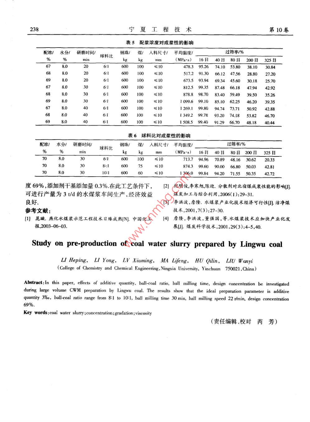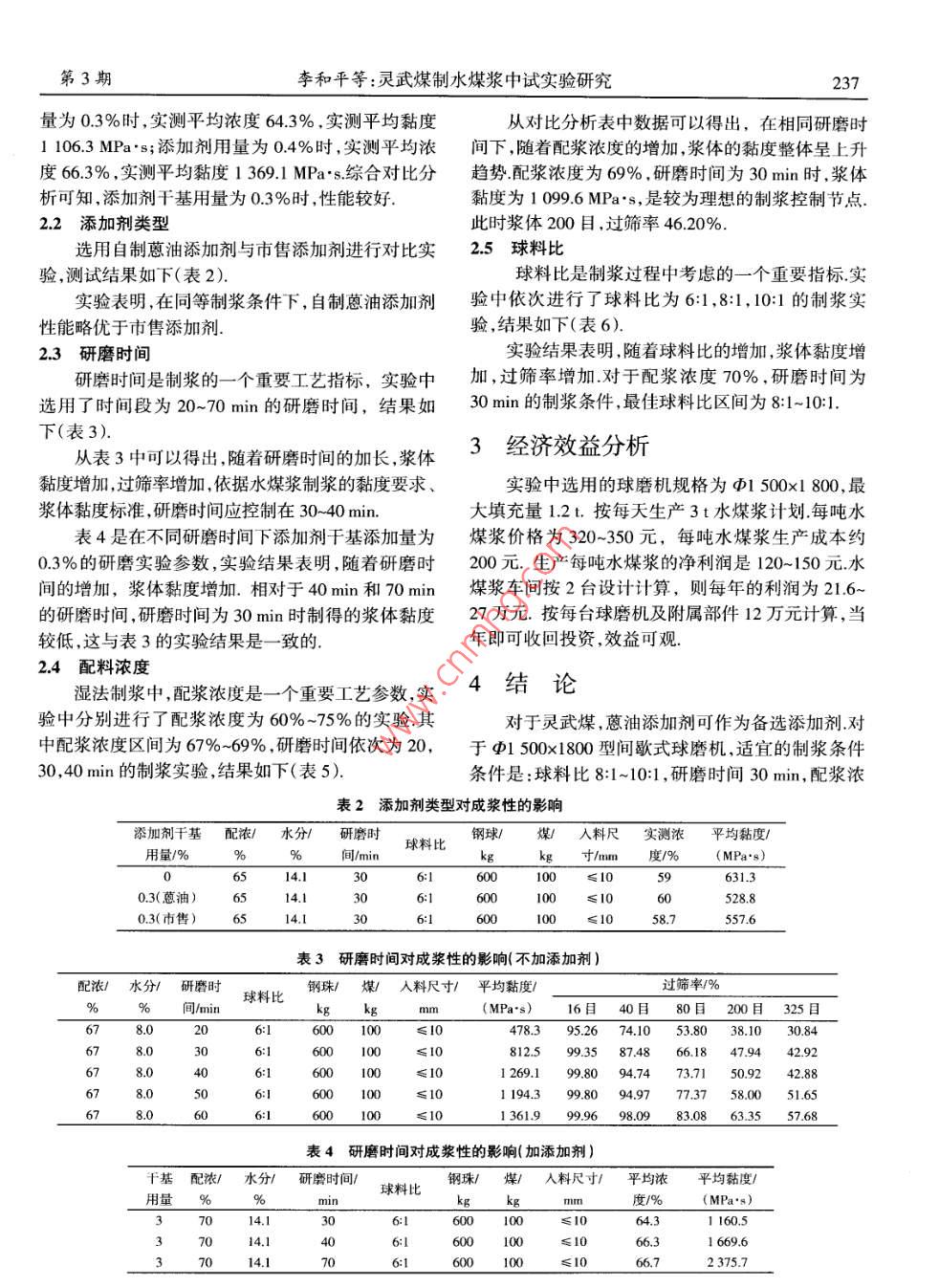 第10卷第3期寧夏工程技術(shù)Vol 10 No. 32011年9月Ningxia Engineering TechnologySep.2011文章編號(hào):1671-72442011)03-023603靈武煤制水煤漿中試實(shí)驗(yàn)硏究李和平,李勇,呂秀明,馬立峰,胡奇林',劉萬(wàn)毅(寧夏大學(xué)化學(xué)化工學(xué)院,寧夏銀川750021)摘要:本實(shí)驗(yàn)探討了在大劑量條件下,添加劑加入量、種類(lèi)、球料比、研磨時(shí)間、配置濃度對(duì)靈武煤制水煤漿成漿性的影響.結(jié)釆表明,理想的制漿工藝條件是添加劑干基添加量0.3%,球料比8:1-10-:1,研磨時(shí)間30min,研磨轉(zhuǎn)速22r/min,配漿濃度69%關(guān)鍵詞:水煤漿;濃度;級(jí)配;黏度中圖分類(lèi)號(hào):TQ53文獻(xiàn)標(biāo)志碼:A水煤漿是20世紀(jì)70年代石油危機(jī)中發(fā)展起的1.2實(shí)驗(yàn)設(shè)備種新型燃料.一般由63%-68%不同粒度分布Φ1500×1800臥式球磨機(jī);10mm方格篩;機(jī)械的煤、31%-36%的水和約1%的添加劑制成,具有攪拌器;潛水泵;干燥箱;黏度計(jì);電子天平;顎式破油一樣的流動(dòng)性和穩(wěn)定性,被稱(chēng)為液態(tài)、環(huán)保型代碎機(jī);16,40,80,200,325目標(biāo)準(zhǔn)分樣篩等.油產(chǎn)品吲.它具有燃燒效率高、污染物排放量低等特13實(shí)驗(yàn)過(guò)程點(diǎn),可用于電站鍋爐、工業(yè)鍋爐和工業(yè)窯爐代油、代第一步:篩分與破碎將實(shí)驗(yàn)煤樣過(guò)10mm方格煤燃燒,亦可作為氣化原料,用于生產(chǎn)合成氨、合成篩,取樣測(cè)試水分,若水分含量過(guò)高,則攤開(kāi)烘干,再甲醇等產(chǎn)品和電力寧東煤由于變質(zhì)程度淺,具有次測(cè)定水分含量,按實(shí)驗(yàn)配方設(shè)計(jì)將煤樣加入球磨內(nèi)水含量高、OC比高、揮發(fā)份及灰份含量偏高的特機(jī)塊煤經(jīng)顎式破碎機(jī)破碎后使用點(diǎn),屬難成漿煤種,因而提高寧東煤制取水煤漿的濃第二步:添加劑的配制按照設(shè)計(jì)的配方將計(jì)算度,提高其穩(wěn)定性和降低黏度,不僅能解決寧東地區(qū)好的添加劑與工藝水加入球磨機(jī);生產(chǎn)的瓶頸問(wèn)題,而且為以后的化工項(xiàng)目氣化路線(xiàn)第三步:研磨在22rmin轉(zhuǎn)速下進(jìn)行濕法研磨;的選擇和寧東礦區(qū)煤拓寬市場(chǎng)提升價(jià)值具有重大的第四步:取樣分析按照國(guó)標(biāo)要求測(cè)試濃度、黏意義.本實(shí)驗(yàn)在前期小試實(shí)驗(yàn)研究的基礎(chǔ)之上,考察度、過(guò)篩率了添加劑種類(lèi)、添加劑用量、配漿濃度、球料比等對(duì)成漿性的影響,為小批量靈武煤生產(chǎn)水煤漿的車(chē)間2實(shí)驗(yàn)結(jié)果與分析討論生產(chǎn)提供了工藝指導(dǎo)21添加劑用量實(shí)驗(yàn)過(guò)程實(shí)驗(yàn)中選用添加劑干基用量為0.2%,0.30.4%,進(jìn)行對(duì)比實(shí)驗(yàn)實(shí)驗(yàn)結(jié)果如下(表1)1.1實(shí)驗(yàn)原料實(shí)驗(yàn)發(fā)現(xiàn)添加劑用量為02%時(shí),實(shí)測(cè)平均濃添加劑,自制;煤樣,靈武羊腸灣煤礦原煤度63.3%,實(shí)測(cè)平均黏度11905MPa·s;添加劑用表1添加劑用量對(duì)成漿性的影響添加劑干配置濃水分/研磨時(shí)鋼珠/煤入料尺寸/實(shí)測(cè)平均平均黏度球料比基用量/%度/%kg kgmm濃度/%(MPa·s)7060010060010≤101369.1收稿日期:2011-04-26基金項(xiàng)目:寧夏自然科學(xué)基金“復(fù)配煤制水煤漿級(jí)配模型計(jì)算與成漿性能研究”(NZ1021)作者簡(jiǎn)介:李和平(1975—),男,講師,主要從事水煤漿研究*通信作者:胡奇林(1952—),男,碩士生導(dǎo)師,副教授,主要從事煤基材料的研究與開(kāi)發(fā).E-mail!hualin@nxu.edu.cn.第3期李和平等:靈武煤制水煤漿中試實(shí)驗(yàn)研究237量為0.3%時(shí),實(shí)測(cè)平均濃度643%,實(shí)測(cè)平均黏度從對(duì)比分析表中數(shù)據(jù)可以得出,在相同研磨時(shí)1106.3MPa·s;添加劑用量為04%時(shí),實(shí)測(cè)平均濃間下,隨著配漿濃度的增加,漿體的黏度整體呈上升度66.3%,實(shí)測(cè)平均黏度1369.1MPa·s綜合對(duì)比分趨勢(shì)配漿濃度為69%,研磨時(shí)間為30min時(shí),漿體析可知添加劑干基用量為0.3%時(shí),性能較好黏度為10996MPa·s,是較為理想的制漿控制節(jié)點(diǎn)22添加劑類(lèi)型此時(shí)漿體200目,過(guò)篩率46.20%選用自制蒽油添加劑與市售添加劑進(jìn)行對(duì)比實(shí)2.5球料比驗(yàn),測(cè)試結(jié)果如下(表2)球料比是制漿過(guò)程中考慮的一個(gè)重要指標(biāo)實(shí)實(shí)驗(yàn)表明,在同等制漿條件下,自制蒽油添加劑驗(yàn)中依次進(jìn)行了球料比為6:1,8:1,10:1的制漿實(shí)性能略?xún)?yōu)于市售添加劑驗(yàn),結(jié)果如下(表6)23研磨時(shí)間實(shí)驗(yàn)結(jié)果表明,隨著球料比的增加,漿體黏度增研磨時(shí)間是制漿的一個(gè)重要工藝指標(biāo),實(shí)驗(yàn)中加,過(guò)篩率增加對(duì)于配漿濃度70%,研磨時(shí)間為選用了時(shí)間段為20-70min的研磨時(shí)間,結(jié)果如30min的制漿條件,最佳球料比區(qū)間為8:1-10:1下(表3)從表3中可以得出隨著研磨時(shí)間的加長(zhǎng),漿體3經(jīng)濟(jì)效益分析黏度增加,過(guò)篩率增加,依據(jù)水煤漿制漿的黏度要求實(shí)驗(yàn)中選用的球磨機(jī)規(guī)格為Φ1500×1800,最漿體黏度標(biāo)準(zhǔn),研磨時(shí)間應(yīng)控制在30-40min大填充量1.2t.按每天生產(chǎn)3t水煤漿計(jì)劃每噸水表4是在不同研磨時(shí)間下添加劑于基添加量為