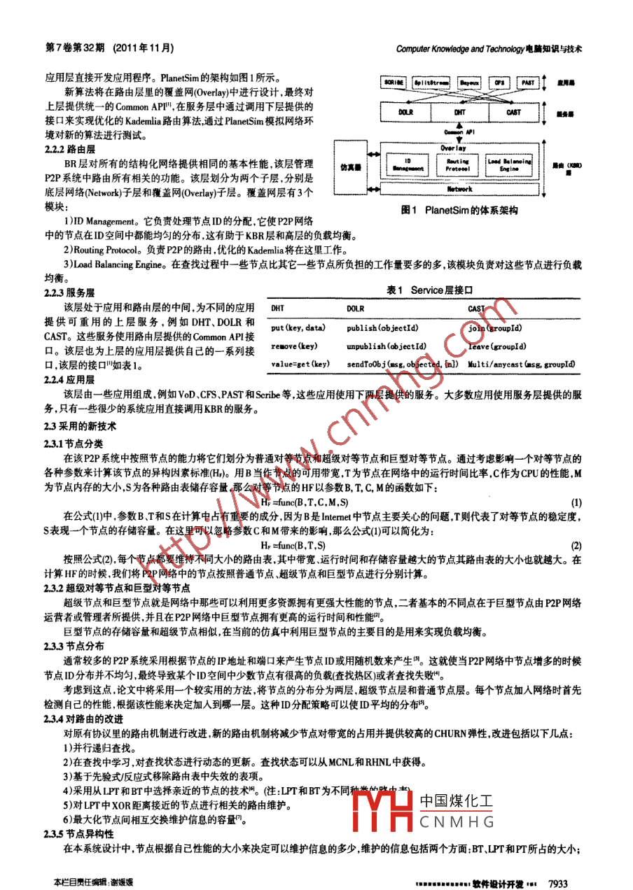 ISSN 1009 3044E-mail: xic@cce.net.cnComputer Knowledge and Technology電腦知識(shí)與技術(shù)htp://ww.nzs.net.nVol.7, No.32, November 2011.Tel:+86- -551- 56909635690964優(yōu)化型Kademlia的設(shè)計(jì)研究王震(遼東學(xué)院信息技術(shù)學(xué)院,遼寧丹東1800)0摘要:通過(guò)對(duì)DHT路由算法中的Kademlia技術(shù)的系統(tǒng)分析,提出了一種基于P2P覆蓋網(wǎng)絡(luò)的優(yōu)化Kademlia路由算法的架構(gòu)。針對(duì)于DHT的構(gòu)造和路由方法的改進(jìn),從整體角度出發(fā),提出了優(yōu)化型Kademlia的路由算法,它的實(shí)現(xiàn)是建立在Kademlia核心路由的基礎(chǔ)上。在設(shè)計(jì)中,分別在Planetim、路由層服務(wù)層、應(yīng)用層等不同的網(wǎng)絡(luò)環(huán)境中利用節(jié)點(diǎn)的異構(gòu)性進(jìn)行設(shè)計(jì),采用新的技術(shù)對(duì)路由進(jìn)行改進(jìn),以更好的實(shí)現(xiàn)路由層的負(fù)載均衢以及在很高的網(wǎng)絡(luò)波動(dòng)條件下提高DTH性能。關(guān)鍵詞:DHT;Kademlia;路由算法;節(jié)點(diǎn);P2P中圖分類(lèi)號(hào):TP311文獻(xiàn)標(biāo)識(shí)碼:A 文章編號(hào):1009 3042011)32-7932-03The Design of Optimized KademliaWANG Zhen(The Information Technology Insticute, Liaodong Universiy, Dandong 118003, China)Abstract: By the Kademlia DHT routing algorithm technology systems analyis, This paper proposes an routing algorithm opimizationfnamework based on Kadenlia P2P overlay network .For improvement in the DHT structure and routing methods , fom the overll per-spective, This paper proposes opimized Kademlia rouing alorithm, is implemcnation is based on the Kademlia routing baced on the core.In the design, respectively, in PlanetSim, routing layer, servicc layer, pplication layer, using dfferent network nodes in heterogeneous envi-ronment of the design, the use of new technologies to improve the rouing. the routing layer to achieve better load balancing and fluctua-tions in conditions of high network performance to improve DTH.Key words: DHT; Kademli; rouing algorithm; node; P2PDHT(分布式哈希表)是- -種分布式存儲(chǔ)方法,在不需要服務(wù)器的情況下.每個(gè)客戶(hù)端負(fù)責(zé)-個(gè)小范圍的路由,并負(fù)責(zé)存儲(chǔ)- -小部分?jǐn)?shù)據(jù),從而實(shí)現(xiàn)整個(gè)DHT網(wǎng)絡(luò)的尋址和存儲(chǔ)。Kademlia 是DHT中的主流技術(shù)之- - ,在結(jié)構(gòu)化P2P系統(tǒng)有著廣泛的應(yīng)用。DHT實(shí)際上是- -個(gè)由廣域范圍.大量節(jié)點(diǎn)共同維護(hù)的巨大散列表。散列表被分割成不連續(xù)的塊,每個(gè)節(jié)點(diǎn)被分配給一個(gè)屬于自己的散列塊,并成為這個(gè)散列塊的管理者。DHT的節(jié)點(diǎn)既是動(dòng)態(tài)的,節(jié)點(diǎn)數(shù)量也是巨大的,因此非中心化和自組織成為兩個(gè)設(shè)計(jì)的重要目標(biāo)。由于重疊網(wǎng)絡(luò)采用了確定性拓?fù)浣Y(jié)構(gòu),DHT可以提供精確的發(fā)現(xiàn)。只要目標(biāo)節(jié)點(diǎn)存在于網(wǎng)絡(luò)中,DHT總能發(fā)現(xiàn)它,而且發(fā)現(xiàn)的準(zhǔn)確性得到了保證。DHT的的主流系統(tǒng)有Kademlie Pasty Tapesty、Chord.CAN等。1 DHT算法與Kademlia技術(shù)的分析DHT類(lèi)結(jié)構(gòu)最大的問(wèn)題是DHT的維護(hù)機(jī)制較為復(fù)雜.尤其是節(jié)點(diǎn)頰繁加人.退出造成的CHURN會(huì)極大增加DHT的維護(hù)代價(jià)以及不能吻合節(jié)點(diǎn)的異質(zhì)性要求。DHT的主流技術(shù)在路由查找效率、負(fù)載均衡和CHURN這3個(gè)方面也都有不同表現(xiàn)。任何分布式路由算法的目的都是為了能夠得到更快的路由以及在相同時(shí)間內(nèi)更有效的對(duì)未知的P2P網(wǎng)絡(luò)進(jìn)行管理。目前一些較流行的DHT例如Chord.CAN .Pasty .Tapesty和Kademlia以及-些其它的DHT或多或少存在以下一些缺點(diǎn):1)它們都假定P2P網(wǎng)絡(luò)中的所有節(jié)點(diǎn)擁有相同的帶寬和其它的資源,沒(méi)有考慮到P2P網(wǎng)絡(luò)中節(jié)點(diǎn)的高度異構(gòu)性這個(gè)性質(zhì)。2)- -些協(xié)議由于在設(shè)計(jì)的時(shí)候就沒(méi)有考慮到P2P網(wǎng)絡(luò)中CHURN較差的情況,結(jié)果就是它們不能很好的處理CHURN問(wèn)題。3)負(fù)載均衡在路由層并沒(méi)有被很好的實(shí)現(xiàn),在改進(jìn)的算法中將通過(guò)多種有效的方法解決節(jié)點(diǎn)超載的問(wèn)題,這些有效的手段包括考慮節(jié)點(diǎn)的異質(zhì)性對(duì)節(jié)點(diǎn)進(jìn)行分類(lèi),對(duì)類(lèi)型不同的節(jié)點(diǎn)分別進(jìn)行節(jié)點(diǎn)ID的均勻分布以及虛擬服務(wù)器技術(shù)。本論文的工作重點(diǎn)就是通過(guò)分析上述DHT的構(gòu)造和路由方法以及上述提出的問(wèn)題來(lái)構(gòu)造一-個(gè)新的 DHT路由算法。2優(yōu)化型Kademlia的設(shè)計(jì)為了解決CHURN向題,需要設(shè)計(jì)-個(gè)可以應(yīng)用于任何KBR層路由協(xié)議上的-一個(gè)通用DHT框架解決方案,這就要對(duì)Kadenlia進(jìn)行優(yōu)化設(shè)計(jì),進(jìn)而達(dá)到在CHURN為90%左右的時(shí)候查找成功率將大于95%,查找偏差小于5%。2.2體系架構(gòu)2.2.1 PlanetSim整個(gè)P2P系統(tǒng)的體系架構(gòu)來(lái)源于PlanetSim,在PlaneSim中,開(kāi)發(fā)者可以工作在覆蓋層中進(jìn)行創(chuàng)造和測(cè)試邏輯算法或者創(chuàng)建和測(cè)試新的服務(wù)。PlaneSim 的架構(gòu)為三層的層次結(jié)構(gòu),應(yīng