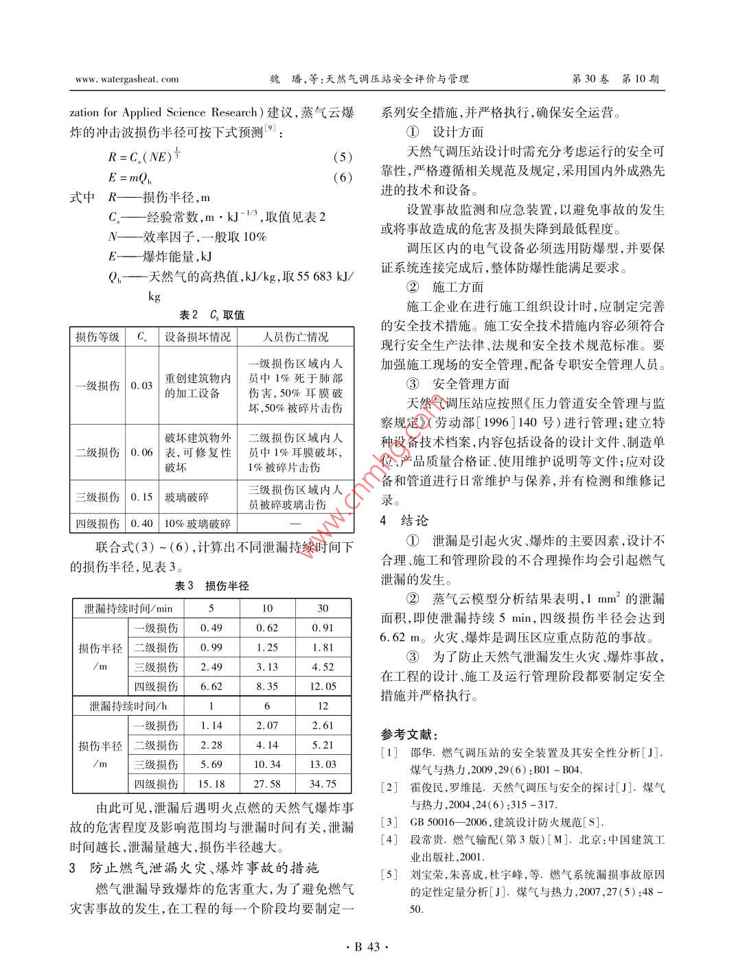 第30卷第10期煤氣與熱力Vol. 30 No. 102010年10月GAS & HEATOet. 2010天然氣調(diào)壓站安全評(píng)價(jià)與管理魏璠',渠穎2(1.天津城市建設(shè)學(xué)院能源與機(jī)械工程系,天津300384; 2. 中國(guó)市政工程華北設(shè)計(jì)研究總院,天津300074)摘要:分析了導(dǎo)致天然氣調(diào)壓站泄漏造成火災(zāi)、爆炸的危險(xiǎn)因素,遵循安全評(píng)價(jià)中事故最大化原則,以蒸氣云爆炸為模型,對(duì)天然氣泄漏火災(zāi)、爆炸的災(zāi)害后果進(jìn)行了定量分析。在泄漏面積為1 mm2的情況下,即使泄漏持續(xù)5 min,四級(jí)損傷半徑會(huì)達(dá)到6.62 m。在工程的設(shè)計(jì)、施工及運(yùn)行管理階段要制定有針對(duì)性的安全措施并嚴(yán)格執(zhí)行。關(guān)鍵詞:調(diào)壓站; 泄漏;火災(zāi);爆炸;安全評(píng)價(jià)中圖分類(lèi)號(hào): TU996文獻(xiàn)標(biāo)識(shí)碼: B文章編號(hào): 1000 - 4416(2010)10 - 0B41 -04Safety Evaluation and Management of Natural Gas Regulator StationWEI Fan,QU YingAbstract:The risk factors causing leakage at natural gas regulator station, resulting in fire and ex-plosion, are analyzed. The consequences of fire and explosion from leakage of natural gas are quantita-tively analyzed by vapor cloud explosion model according to the accident maximization principle in safetyevaluation. Under the condition of leakage area of 1 mm2,the four-stage damage radius will reach 6.62m even if the leakage lasts for 5 min. The safety measures must be established and strictly implemented inthe project design, construction and operation management.Key words: regulator station; leakage; fire; explosion; safety measure調(diào)壓站是天然氣輸配系統(tǒng)的重要組成部分,其1.2工藝過(guò)程危險(xiǎn)性安全運(yùn)營(yíng)是天然氣穩(wěn)定供應(yīng)的重要保證。由于調(diào)壓調(diào)壓器是調(diào)壓站的主要設(shè)備,其功能是根據(jù)燃站內(nèi)設(shè)備繁雜,且天然氣運(yùn)行壓力較高,一旦燃?xì)獍l(fā)氣的需要情況將燃?xì)庹{(diào)至不同壓力,實(shí)現(xiàn)穩(wěn)定輸生泄漏,易造成火災(zāi)、爆炸或中毒等事故[121。本文送“4。由于設(shè)備及管道材質(zhì)的問(wèn)題、施工不當(dāng)、運(yùn)對(duì)天然氣調(diào)壓站存在的安全問(wèn)題進(jìn)行分析,提出有行管理不到位等原因,均會(huì)造成燃?xì)庑孤鸹鹦У姆婪洞胧?消除安全隱患,從而確保城市燃?xì)獍矠?zāi).爆炸等安全事故5-71。全、平穩(wěn)供應(yīng)。①設(shè)備及管道材質(zhì)問(wèn)題1主要危險(xiǎn)因素分析調(diào)壓器的工作壓力較高,要求設(shè)備和管道的材1.1介質(zhì)本身的危險(xiǎn)性質(zhì)滿(mǎn)足強(qiáng)度要求。在設(shè)計(jì)及選型過(guò)程中,如果對(duì)設(shè)天然氣是易燃易爆的物質(zhì),屬于甲類(lèi)火災(zāi)危險(xiǎn)備和管道規(guī)格、材質(zhì)要求不合理,必將對(duì)后繼過(guò)程產(chǎn)性物質(zhì)甲。天然氣泄漏后,極易擴(kuò)散到空氣中,形生嚴(yán)重影響,造成安全隱患。成蒸氣云,遇火源或高溫?zé)嵩礃O易發(fā)生爆炸。此外,②施工質(zhì)量問(wèn)題天然氣為烴類(lèi)混合物,雖然毒性較低,但長(zhǎng)期接觸也施工質(zhì)量不僅與系統(tǒng)的使用壽命、經(jīng)濟(jì)效益緊可出現(xiàn)神經(jīng)衰弱綜合癥,危害人體健康。密相關(guān),而且關(guān)系到系統(tǒng)的運(yùn)行安全。施工質(zhì)量的●B41●第30卷第10期煤氣與熱力www. watergasheat. com影響因素主要有施工現(xiàn)場(chǎng)管道焊接質(zhì)量不合格、設(shè)到發(fā)生爆炸的時(shí)間分別為5 min.10 min、30 min、1備安裝存在缺陷。h.6 h、12 h。③運(yùn)行管理問(wèn)題①天然 氣泄漏時(shí)流動(dòng)狀態(tài)判斷a.設(shè)備超壓滿(mǎn)足式(1)時(shí),流動(dòng)屬于音速流。為保證調(diào)壓器穩(wěn)定運(yùn)行,必須時(shí)刻監(jiān)測(cè)調(diào)壓設(shè)_2_)=(1)備進(jìn)出口燃?xì)鈮毫?一旦出現(xiàn)超壓情況,不僅會(huì)損害p \k+1/調(diào)壓器,甚至?xí)<罢緟^(qū)和管網(wǎng)的運(yùn)行安全。調(diào)壓式中-大氣絕對(duì)壓力,Pa設(shè)備超壓受以下幾個(gè)方面影響:上游來(lái)氣壓力升高,p- - 管道內(nèi)天然氣絕對(duì)壓力,Pa進(jìn)口壓力表出現(xiàn)故障而未能及時(shí)顯示;調(diào)壓器運(yùn)行天然氣等熵指數(shù),取1.316過(guò)程中安全閥失效,致使超壓燃?xì)鉄o(wú)法放散;運(yùn)行過(guò)滿(mǎn)足式(2)時(shí),流動(dòng)屬于亞音速流。程中人員操作失誤等。超壓爆炸雖然屬于物理爆P>1_2 )產(chǎn)p>(k+1)(2)炸,但爆炸后引起的燃?xì)庑孤O易引發(fā)后繼的火災(zāi)、爆炸。經(jīng)計(jì)算得:b.天然氣泄漏與爆炸Po=0.059 6設(shè)備、管道被腐蝕,密封件失效,儀器、儀表故障,人為誤操作,外界干擾等均是造成燃?xì)庑孤┑囊?0.544素。泄漏燃?xì)庥龅秸緟^(qū)內(nèi)火源如施工動(dòng)火、雷電、靜根據(jù)式(1),氣體泄漏屬于音速流。電火花等,易被引燃,發(fā)生爆炸。②天然氣泄漏量計(jì)算2天然氣泄漏爆炸事故災(zāi)害后果分析通過(guò)對(duì)危險(xiǎn)有害源辨識(shí)可知,由天然氣泄漏導(dǎo)音速流的泄漏量可采用下式計(jì)算'8:致的火災(zāi)、爆炸事故是影響面最廣、發(fā)展最迅速、后qm =CgAp、/xM|_ 2岢(3)果最嚴(yán)重的燃?xì)馐鹿手? -。RT\K+1)天然氣爆炸事故大多是由天然氣泄漏后遇到點(diǎn)式中9.- 天然氣泄漏 質(zhì)量流量,kg/s火源
