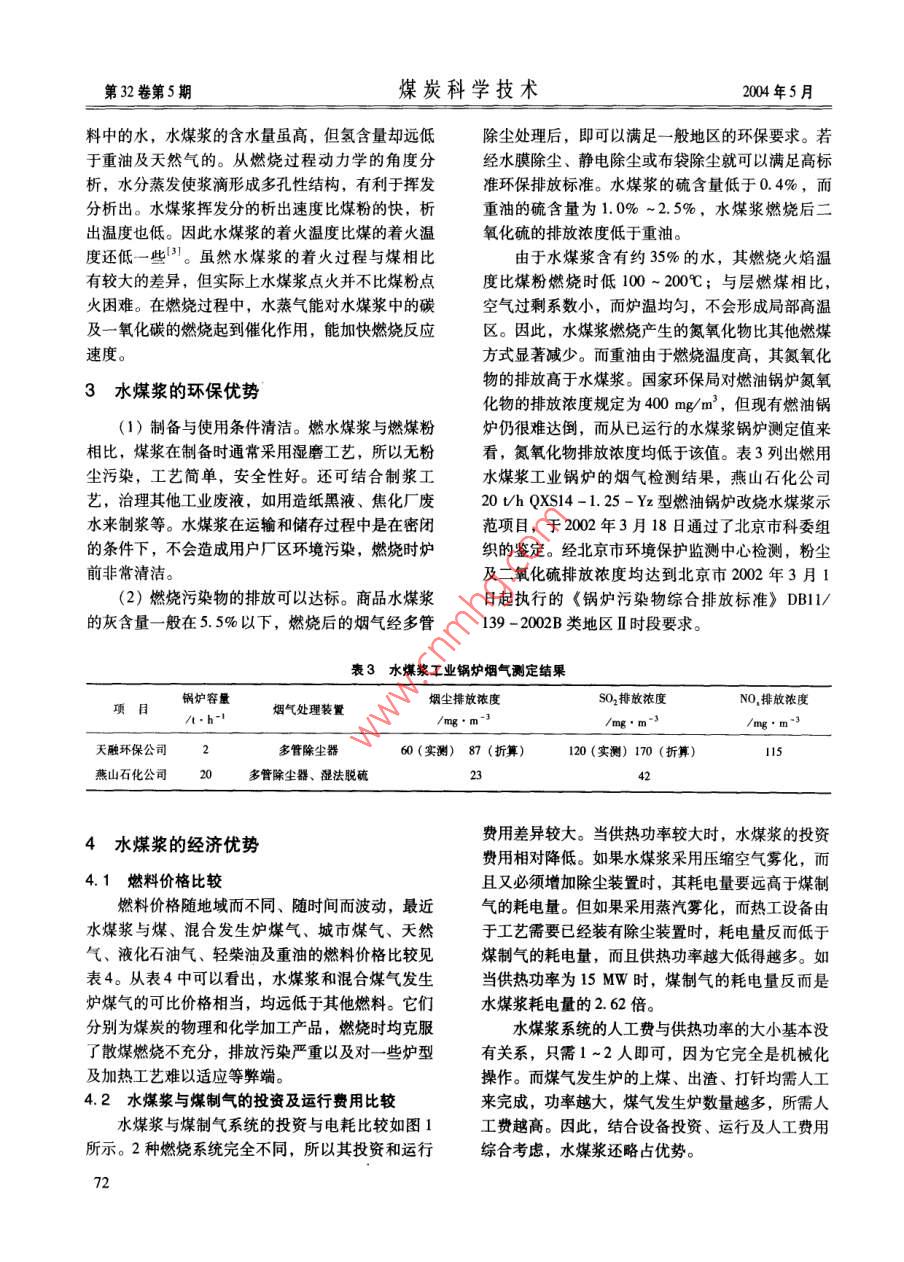 第32卷第5期煤炭科學(xué)技術(shù)004年5月水煤漿的能源優(yōu)勢及應(yīng)用前景馮武軍,王恒,趙立合,李棟,陳燕(北京科技大學(xué)熱能工程系,北京100083)摘要:從資源、技術(shù)、環(huán)保、經(jīng)濟性以及可適用領(lǐng)域5個方面,論述了新型煤基潔凈燃料水煤漿的能源優(yōu)勢,并分析了水煤漿可能最先得到推廣應(yīng)用的領(lǐng)域。實踐證明,水煤漿技術(shù)是實現(xiàn)中國能源可持續(xù)發(fā)展戰(zhàn)略的重要途徑之一。關(guān)鍵詞:水煤漿;能源優(yōu)勢;可持續(xù)發(fā)展中圖分類號:TK01.9文獻標(biāo)識碼:A文章編號:0253-2336(2004)05-0070-0Energy advantage and applied outlook of coal water mixtureFENG Wu-jun, WANG Heng, ZHAO Li-he, LI Dong, CHEN YanDepartment of Thermal Engineering, Beying University of Science and Technology, Beiing 100083, ChinaAbstract: From the resources, technology, environment protection, economic and other applied five areas, the paper stated the energyadvantages of the new coal base clean combustion fuel coal water mixture. The paper analyzed that coal water mixture would be the first area to be applied. The practices showed that coal water mixture technology is one of the important accesses to the sustainable developmenKey words: coal water mixture; energy advantages; sustainable development1水煤漿的資源優(yōu)勢11.6%。在中國,煤炭是長期可依賴的能源,在能源資源結(jié)構(gòu)中占有重要地位。煤炭主要是自產(chǎn)自(1)2000年中國一次能源生產(chǎn)量達(dá)到19億銷,參與國際能源市場流通的量不大,受國際能源標(biāo)準(zhǔn)煤,其中煤炭占66%,占世界可采儲量的市場不穩(wěn)定因素的影響很小,價格相對穩(wěn)定。3非。0000。0·0心·心⊙⊙0·000。00·.°·⊙··。?!?°0。,⊙0⊙⊙⊙。00。。99◆⊙⊙⊙000⊙⊙·⊙0心⊙專G00●00。0●00004既有三產(chǎn)品也有兩產(chǎn)品;既有有壓給料也有無壓給煤廠就能生產(chǎn)什么產(chǎn)品。市場對煤炭的品種和質(zhì)量料;既有選前脫泥也有不脫泥全重介;既有大直徑要求愈來愈嚴(yán),選煤廠為提高市場應(yīng)變能力,實現(xiàn)也有小直徑,等等。眾多的先進選煤工藝為選煤廠經(jīng)濟效益最優(yōu)化、產(chǎn)品結(jié)構(gòu)多樣化是必然趨勢。和設(shè)計部門提供了選擇空間,用戶可根據(jù)入選物料性質(zhì)、市場需求及資本情況,以某種既定目標(biāo)為約束條件,在先進工藝中選擇并集成。無論是新建還國家宏觀政策的鼓勵,市場的引導(dǎo),企業(yè)創(chuàng)新是老廠改造;無論是排矸還是動力煤提質(zhì);無論是能力的提高,國外技術(shù)的融入,國家資助力度的加脫硫還是降灰;無論是深度加工還是選超低灰分精大,從不同層面推進了選煤技術(shù)的快速發(fā)展。選煤煤;無論是脫水還是煤泥的資源化利用,都能找到在裝備、工藝、材料、自動化等領(lǐng)域的最新研究成實用工藝。近年來,模塊化選煤廠也受到選煤界的果為煤炭的清潔生產(chǎn)奠定了堅實的基礎(chǔ),為全國關(guān)注,它具有廠房模塊化、工藝系統(tǒng)集成化、操作1700多座選煤廠的技改和將要建設(shè)選煤廠的企業(yè)自動化、建設(shè)速度快、工藝技術(shù)指標(biāo)高等特點。從主提供了有力技術(shù)保障。選煤作為潔凈煤技術(shù)的源1997年至今,就建成了10座模塊式選煤廠,總設(shè)頭,必將為煤炭工業(yè)的可持續(xù)發(fā)展做出更大貢獻計能力超過25Mt/a。(5)選煤廠產(chǎn)品結(jié)構(gòu)多樣化。隨著市場經(jīng)濟作者筒介:陳建中(1957-),男,江蘇揚州人,教授,現(xiàn)在的深入發(fā)展,競爭愈加激烈,煤炭企業(yè)要在激烈的中國礦業(yè)大學(xué)化工學(xué)院從事選煤工藝與設(shè)備的研究與教學(xué)工作市場競爭中站穩(wěn)腳跟,多占市場份額,就必須進行煤炭產(chǎn)品結(jié)構(gòu)優(yōu)化、調(diào)整,市場需要什么產(chǎn)品,選收稿日期:2003-12-18;責(zé)任編輯:劉軍娥第32卷第5期煤炭科學(xué)技術(shù)2004年5月(2)水煤漿應(yīng)有較高的揮發(fā)分和熱值,以便易藝相結(jié)合,節(jié)省投資。一般水煤漿制備工藝采用濕于著火和有較髙的燃燒溫度。對于一般固態(tài)排渣燃磨,具有安全性好、工藝簡單、環(huán)境清潔、無粉塵燒,灰熔點在1300℃以上的煤均可應(yīng)用,大多數(shù)污染等優(yōu)點。煙煤適合制備水煤漿。為制取高濃度煤漿,張榮(3)水煤漿具有良好的穩(wěn)定性和流變性能,其曾等專家對20種中國煤炭進行了成漿性實驗研儲存、運輸十分方便,除公路、鐵路及水運之外究,發(fā)現(xiàn)可磨性指數(shù)HGI和空氣干燥基水分的影還可采用管道長距離運輸。響最大,而煤的孔隙度、揮發(fā)分、灰分等因素都與(4)水煤漿燃燒系統(tǒng)與燃油一樣,為噴霧燃這2個因素有關(guān)??赡バ灾笖?shù)越高,越易制取高濃燒,但煤漿系統(tǒng)不需要蒸汽加熱。北京科技大學(xué)開度煤漿,而空氣干燥基水分則反之。發(fā)的水煤漿燃燒器結(jié)構(gòu)簡單,體積小。在煤漿和霧(3)新型煤基潔凈燃料——水煤漿的燃燒技術(shù)化空氣壓力均為250~350kPa、氣耗率為0.2、助是實現(xiàn)中國能源可持續(xù)發(fā)展的重要途徑之一,水煤燃空氣壓力為15~2.0kPa的操作條件下,即可漿替代石油有著戰(zhàn)略意義。進行穩(wěn)定高效的燃燒。其火焰容易控制,溫度調(diào)節(jié)2水煤漿的技術(shù)優(yōu)勢方便,燃燒效率高。該燃燒器目前廣泛應(yīng)用