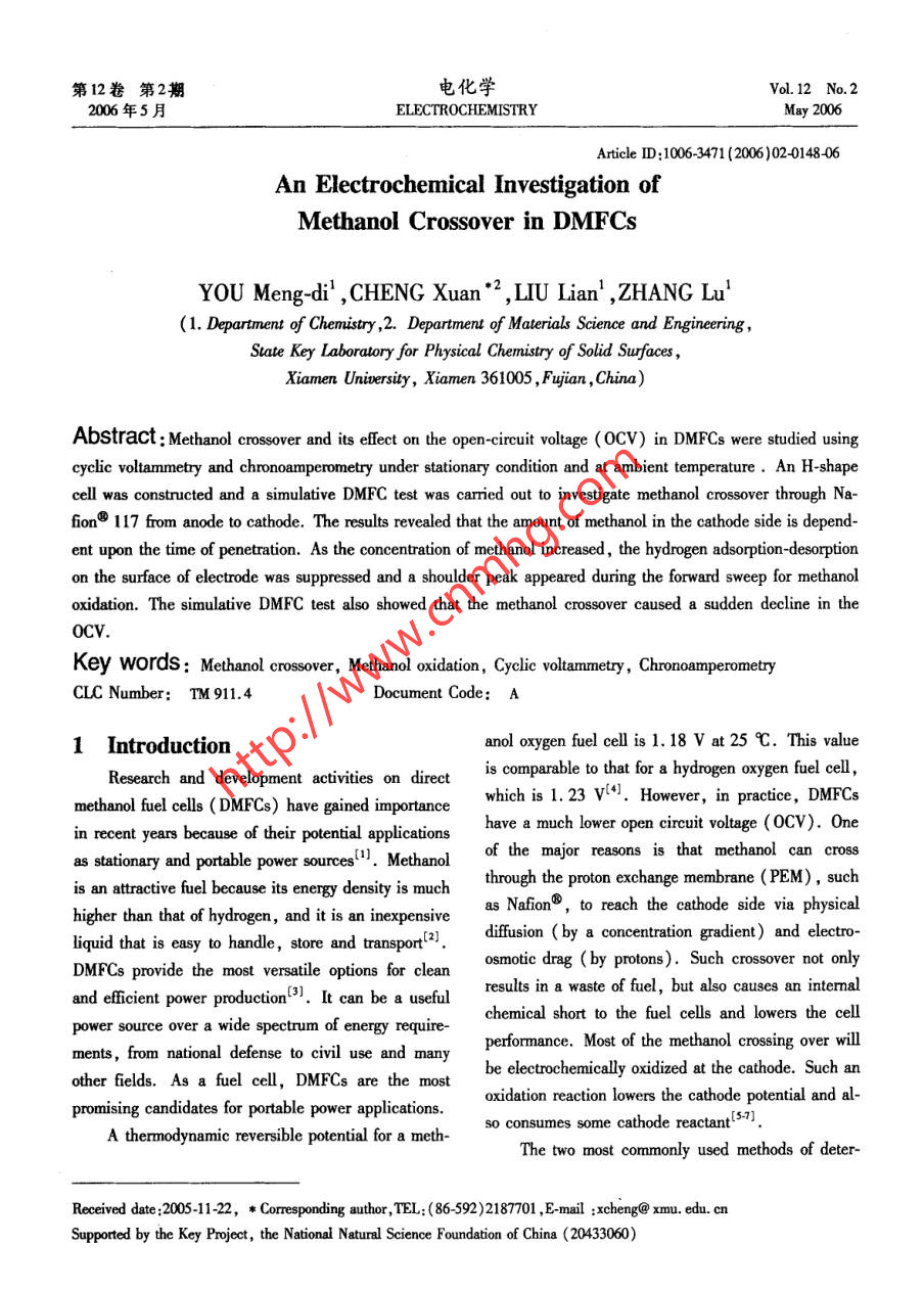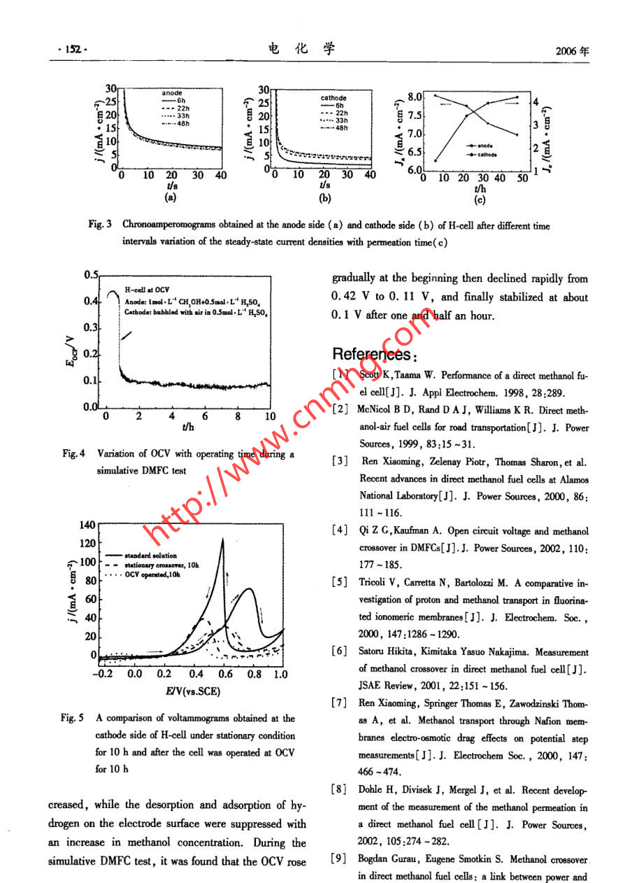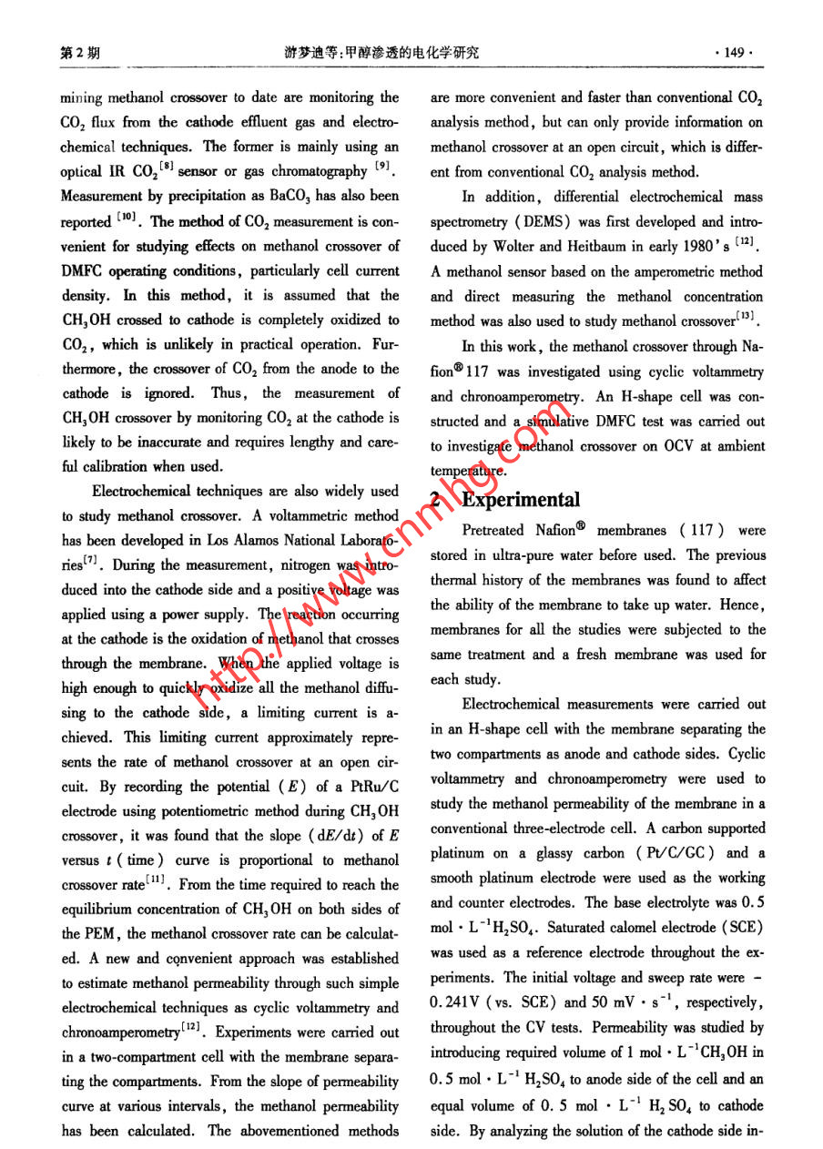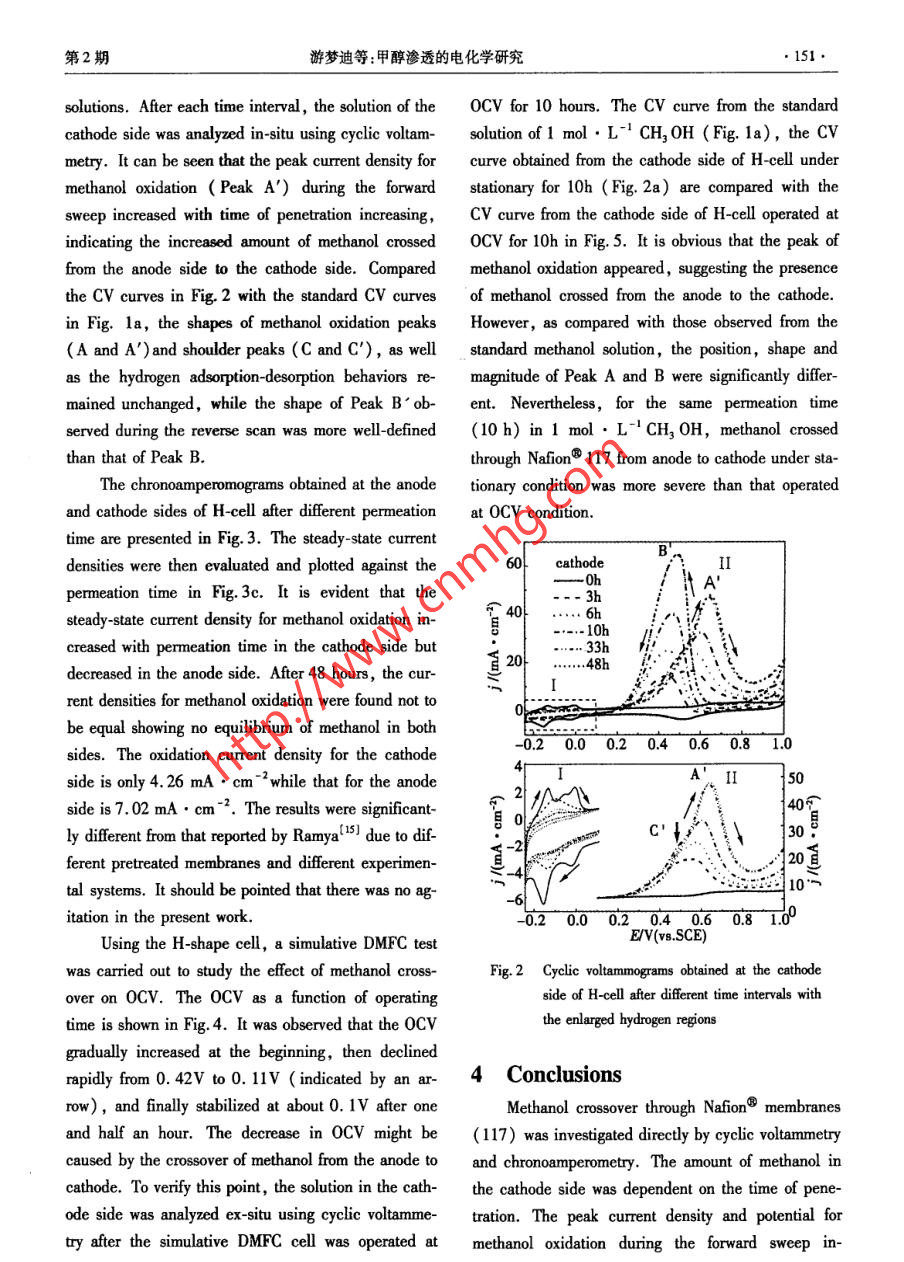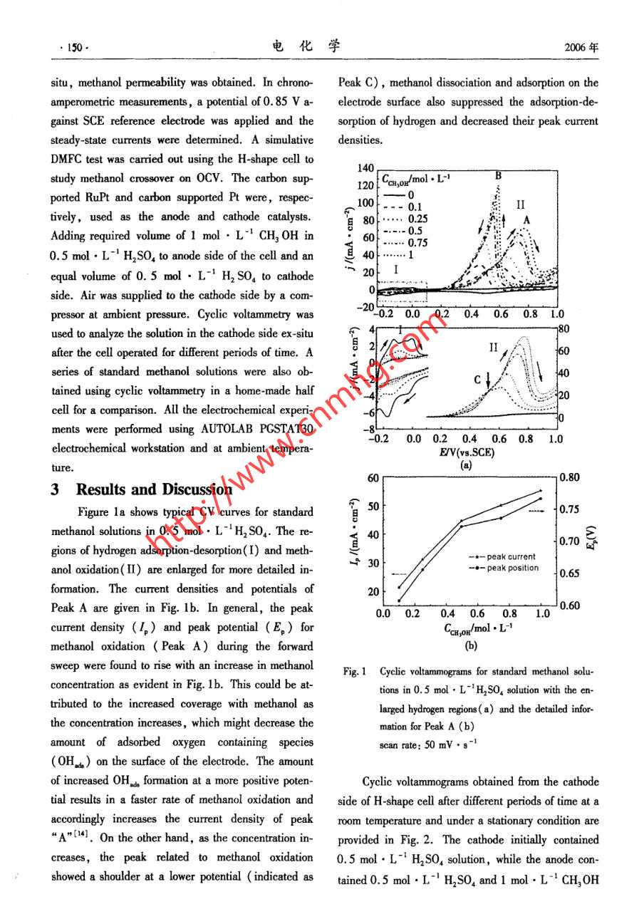 第12卷第2期電化學Vol.12 No.22006年5月ELECTROCHEMISTRYMay 2006Aricle ID:1006-3471 (2006 )02-0148-06An Electrochemical Investigation ofMethanol Crossover in DMFCs .YOU Meng-di' ,CHENG Xuan*2 , LIU Lian' ,ZHANG Lu'(1. Department of Chemistry ,2. Department of Materials Science and Engineering,Slate Key Laboratory for Physical Chemistry of Solid Sufaces ,Xiamen University, Xiamen 361005 , Fujian ,China)Abstract: Methanol crossover and its eflet on the open-circuit volage (OCV) in DMFCs were studied usingcyclic voltammetry and chronoamperometry under stationary condition and at ambient temperature . An H-shapecell was constructed and a simulative DMFC test was carried out to investigate methanol crossover through Na-fion@ 117 from anode to cathode. The results revealed that the amount of methanol in the cathode side is depend-ent upon the time of penetration. As the concentration of methanol increased , the hydrogen adsorption-desorptionon the surface of electrode was suppressed and a shoulder peak appeared during the forward sweep for methanoloxidation. The simulative DMFC test also showed that the methanol crossover caused a sudden decline in the0CV.Key words : Methanol crossover, Methanol oxidation, Cyclic voltanmetry , ChronoamperometyCLC Number: TM 911.4Document Code: A1 Introductionanol oxygen fuel cell is 1.18 V at 25 C. This valueResearch and development activities on directis comparable to that for a hydrogen oxygen fuel cell,methanol fuel cells ( DMFCs) have gained importancewhich is 1. 23 vl4. However, in practice, DMFCsin recent years because of their potential applicationshave a much lower open circuit voltage (0CV). Oneas stationary and portable power sources'l. Methanolof the major reasons is that methanol can crossis an atractive fuel because its energy density is muchthrough the proton exchange membrane (PEM) , suchhigher than that of hydrogen, and it is an inexpensiveas Nafion, to reach the cathode side via physicalliquid that is easy to handle, store and transport(2].diffusion ( by a concentration gradient) and electro-DMFCs provide the most versatile options for cleanosmotic drag ( by protons). Such crossover not onlyand eficient power production31. It can be a usefulresults in a waste of fuel, but also causes an interalchemical short to the fuel cells and lowers the cellpower source over a wide spectrum of energy require-performance. Most of the methanol crossing over willments, from national defense to civil use and manyother fields. As a fuel cell, DMFCs are the mostbe electrochemically oxidized at the cathode. Such anoxidation reaction lowers the cathode potential and al-promising candidates for portable power applications.A thermodynamic reversible potential for a meth-so consumes some cathode reactant5-7].The two most commonly used methods of deter-Received date :2005-11-22, * Corresponding author ,TEL;(86592)2187701 ,E-mail :xcheng@ xmu. edu. cnSupported by the Key Projeet, the Nationai Natural Science Foundation of China (20433060)●150.電化學2006年situ , methanol permeability was obtained. In chrono-Peak C),methanol dissociation and adsorption on theamperometric measurements, a potential of0.85 V aelectrode surface also suppressed the adsorption-de-gainst SCE reference electrode was applied and thesorption of hydrogen and decreased their peak currentsteady -state currents were determined. A simulativedensities.DMFC test was carried out using the H-shape cell to140study methanol crossover on OCV. The carbon sup-120Ccro/mol.L-Bported RuPt and carbon supported Pt were, respec-0.1IItively, used as the anode and cathode catalysts.目800.25Adding required volume of 1 mol . L-1 CH3 0H in600.750.5 mol●L-' H2SO, to anode side of the cell and an40....... 1equal volume of 0.5 mol ●L-' H2 SO, to cathode”20Iside. Air was supplied to the cathode side by a com-pressor at ambient pressure. Cyclic voltammery was-20-0.20.00.20.40.60.810used to analyze the solution in the cathode side ex-situr4--十一8(21after the cell operated for different periods of time. Aseries of standard methanol solutions were also ob-tained using cyclic voltammetry in a home-made half三20cell for a comparison. All the electrochemical experi-ments were performed using AUTOLAB PGSTAT30-0.20.00.20.40.60.8 1.0electrochemical workstation and at ambient tempera-EV(vs.SCE)ture.a)0.803Results and DiscussionFigure 1a shows typical CV curves for standard百50+0.75methanol solutions in 0.5 mol●L~H2SO4. The re-400.70示gions of hydrogen adsorption-desorption(I) and meth-一*- peak currentanol oxidation(II) are enlarged for more detailed in-一●- peak position0.65formation. The curent densities and potentials oPeak A are given in Fig. 1b. In general, the peak.0.0 0.20.4 0.60.81.00.60current density (I,) and peak potential ( E。) foCrn,ox/mol ●L1methanol oxidation ( Peak A) during the forwardsweep were found to rise with an increase in methanolFig.1 Cyclic voltammograms for standard methanol solu-concentration as evident in Fig. 1b. This could be at-tions in 0.5 mol●L-' HSO, solution with the en-tributed to the increased coverage with methanol aslarged hydrogen regions(a) and the detailed infor-the concentration increases,which might decrease themation for Peak A (b)amount of adsorbed oxygen containing speciesscan rate: 50 mV●g-1(OH) on the surface of the electrode. The amountof increased OH formation at a more positive poten-Cyclic voltammograms obtained from the cathodetial results in a faster rate of methanol oxidation andside of H-shape cell after different periods of time at aaccordingly increases the current density of peakroom temperature and under a stationary condition are“A"[14). On the other hand, as the concentration in-provided in Fig. 2. The cathode initially containedcreases,the peak related to methanol oxidation0.5 mol●L-' H2SO, solution, while the anode con-showed a shoulder at a lower polential (indicated as tained 0.5 mol ●I-1 H,SO, and 1 mol . L CH,OH第2期游