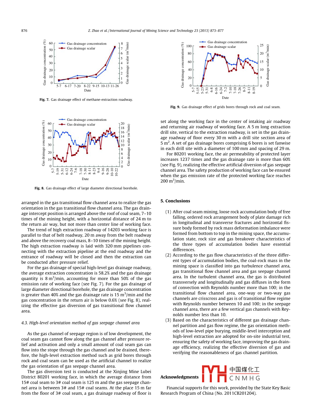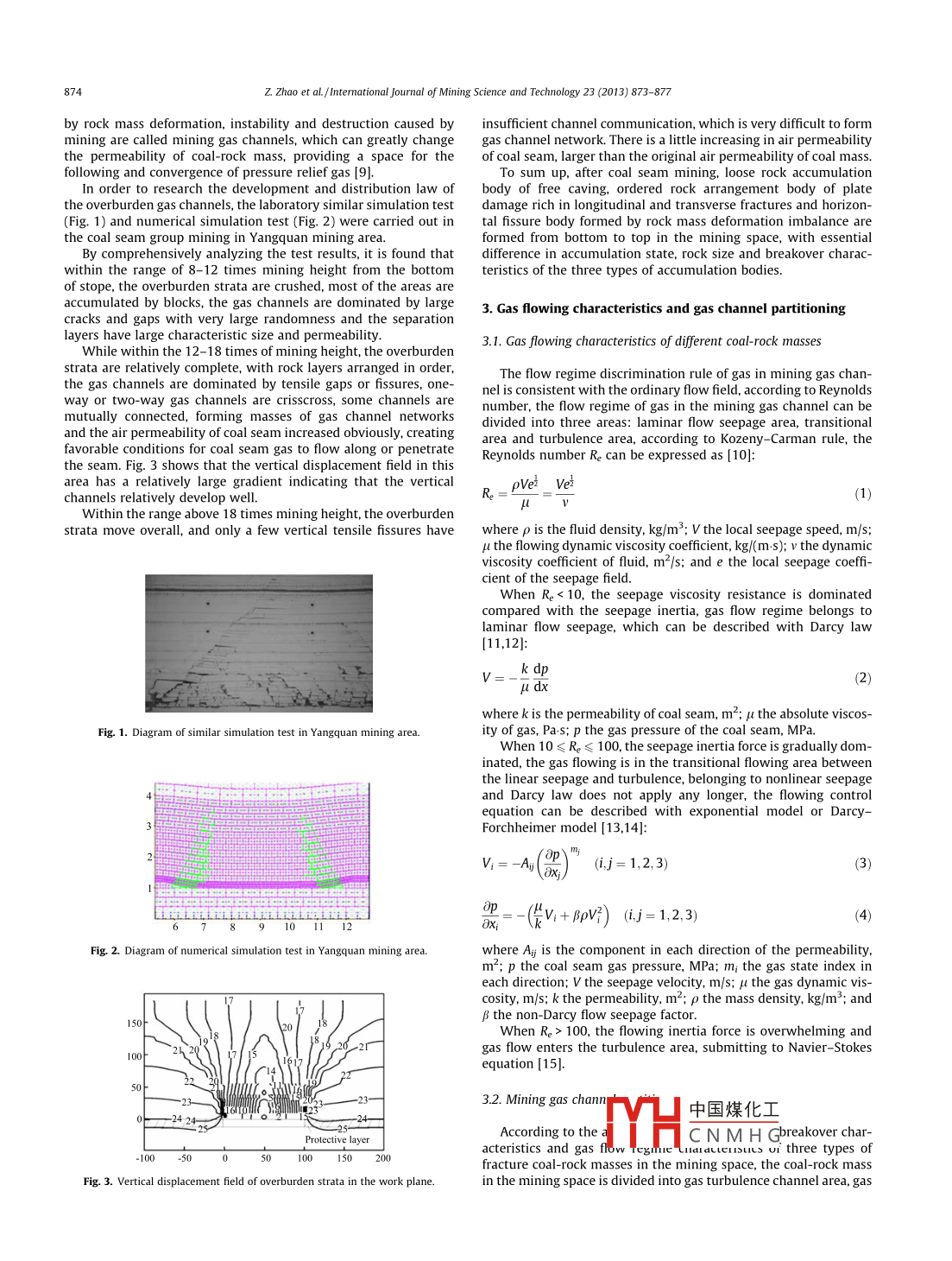 International Journal of Mining Science and Technology 23(2013)873-877Contents lists available at Science DirectInternational Journal of Mining Science and TechnologyELSEVIERurnalhomepagewww.elsevier.com/locate/ijmstPartitioning characteristics of gas channel of coal-rock mass in miningspace and gas orientation methodZhao Zhiqiang Ma Nianjie Jia Housheng Cheng Yuanpingl of resource and Safety Engineering, China University of Mining 8 Technional Engineering Research Center for Coal Gotrol, China University of8 Technolohou 221008. ChinaARTICLE INFOA BSTRACTArticle historIn order to research the influence of coal-rock mass morphology of mining space on the flow law of gas,Received 22 March 2013the laboratory physical model and numerical computation methods were adopted to simulate coal min-Received in revised form 20 April 2013Accepted 10 May 2013ing activities. The simulation results indicate that, after coal seam mining the loose rock accumulationber 2013body of free caving, ordered rock arrangement body of plate damage rich in longitudinal and transversefractures and horizontal fissure body formed by rock mass deformation imbalance are formed frombottom to top in the mining space. For these three types of accumulation bodies, there are essentialGas channeldifferences in the accumulation state, rock size and gas breakover characteristics. According to thisPartitioning characteristicsthe coal-rock mass in the mining space is classified into gas turbulence channel area, gas transitional flowchannel area and gas seepage channel area. In the turbulence channel area, the gas is distributed transGas orientation methodersely and longitudinally and gas diffuses in the form of convection with Reynolds number re more than0: in the transitional flow channel area, one-way or two-way gas channels are crisscross and gas is oftransitional flow regime with Re between 10 and 100. In the seepage channel area, there are a few verticalas channels with Re less than 10. In this paper, the researches on the gas orientation method in differentpartitions were further carried out, gas orientation methods of low-level pipe burying, middle-levelinterception and high-level extraction were determined and an on-site industrial test was conductedachieving the effective diversion of gas and verifying the reasonableness of gas channel partitiono 2013 Published by Elsevier B V. on behalf of China University of Mining Technology1 Introductioncoal mines is mainly guided by the theory of"upper three zonesbut the theory of"upper three layers"was proposed from theCoal mine gas drainage is both the need for safety guarantee of aspect of overburden destruction and roof control in coal miningoal energy production and the demand for fully mining energy without considering the gas flow regime characteristics whichesources, which has become a basic national policy of China have an important influence on the gas drainage. The engineering[1, 2]. Gas drainage is classified into ground extraction and practice shows that the change area of gas flow regime characterunderground extraction, forming a gas channel is essential to istics does not completely coincide with the division boundary ofUnderground gas drainage, while mining fissure is the main reason the traditional"upper three zones". Therefore, on the basis of existfor gas channel. Researching the development and evolution law of ing mine pressure research achievements including theory ofmining fissure is the basis to judge the formation and expansion of"upper three zones", the gas channel of coal-rock mass in thegas channel and conduct gas drainage design [ 3-5. In coal mining mining space is partitioned by considering the gas flow regimeof China, in the research of overburden failure and mining fissure characteristics and gas orientation method is studied based ondevelopment law, many mining scholars with academician Qiathe gas channel partition, providing a theoretical basis for aceMinggao as the representative have done a lot of work and system- rately guiding the gas drainage designatical research to form the theory of"upper three zones"in overburden movement and destruction on the stope, i. e caving zone,fissure zone and bending sinking zone, playing a major guiding role 2 Gas channel development law of coal-gas mass in miningin roof control and disaster prevention and treatment on coal stope space[6-8 At present, the underground gas drainage design in ChineseAfter the overburden strata are influenced by mining, asynchro-nous bending and中國煤化工 enerated betweenCorponding author. Tel. +86 18618405706the rock strataeparation layersE-mailaddresscaikuangren@126.com(z.Zhaowhere gas canCN MH Channels generatedh t: /d. do, oree o m imes.2013. 10014 hned Dy Elsevier Bv, on ehalt of China University ot Mining technolOgy74Science and Technology 23(2013)873-877by rock mass deformation, instability and destruction caused by insufficient channel communication, which is very difficult to formmining are called mining gas channels, which can greatly change gas channel network. There is a little increasing in air permeabilityof coal-rock mass, providing a space for the of coal seam, larger than the original air permeability of coal massfollowing and convergence of pressure relief gas [9In order to research the development and distribution law of6 To sum up, after coal seam mining, loose rock accumulationdy of free caving, ordered rock arrangement body of platehe overburden gas channels, the laboratory similar simulation test damage rich in longitudinal and transverse fractures and horizon(Fig. 1)and numerical simulation test(Fig. 2)were carried out in tal fissure body formed by rock mass deformation imbalance arethe coal seam group mining in Yangquan mining areaformed from bottom to top in the mining space, with essentialBy comprehensively analyzing the test results, it is found that difference in accumulation state, rock size and breakover characwithin the range of 8-12 times mining he