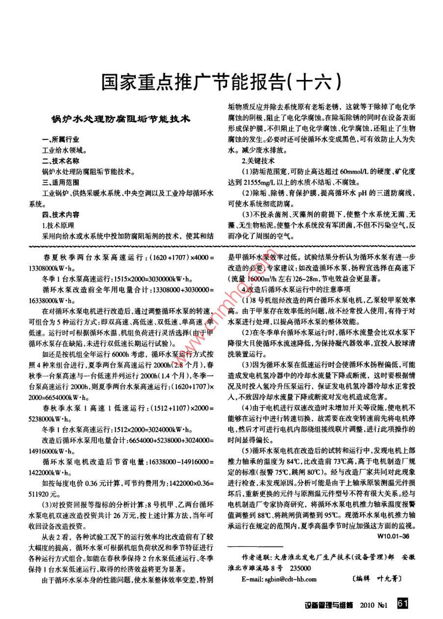 循環(huán)水泵電機雙速改造效能分析蔣勇王軍程秀芝摘要介紹循環(huán)水泵電機調(diào)速改造方案的確定、實施,改造后的試驗及效能分析.運行中應(yīng)注意的事項。關(guān)鍵詞循環(huán)水泵電機改造效能分析中國分類號TM92文獻(xiàn)標(biāo)識碼B大唐淮北發(fā)電廠8號機組投產(chǎn)于2005年8月,汽輪機為東表18 號機組循環(huán)水泵電機改造前、后數(shù)據(jù)方汽輪機廠生產(chǎn).型號為N210-12./535/535-2型,屬超高壓中額定容量/|接線方法額定電流額定轉(zhuǎn)速/間再熱三缸二排汽冷凝式機組。機組配備兩臺1400KLA-31 型kWA(r/min)循環(huán)水泵,屬立式斜流泵結(jié)構(gòu)形式。與循環(huán)水泵配套電機為改造前1700200595YLKS800-10型,額定功率1700kW ,電壓6kV ,額定電流200A。改造后170/1400200/170595/4958號機組經(jīng)過一年的運行檢驗,發(fā)現(xiàn)其所配備的循環(huán)水泵運行性能不夠理想,與循環(huán)水泵配套的單速電機在運行中轉(zhuǎn)速徽省電力科學(xué)研究院到現(xiàn)場對電機改造效果進(jìn)行試驗。試驗方恒定,運行方式單一.機組的循環(huán)水量不能根據(jù)運行工況進(jìn)行轉(zhuǎn)案中將循環(huán)水泵運行方式分為甲泵低速運行甲泵高速運行甲速調(diào)整,電能浪費嚴(yán)重.設(shè)備效率偏低.尤其是在低負(fù)荷或較冷乙泵低速并聯(lián)運行、甲乙泵高速并聯(lián)運行甲泵低速乙泵高速并季節(jié)運行時,這種狀況更加不利于提高機組的經(jīng)濟效益。為響應(yīng)聯(lián)運行、甲泵高速乙泵低速并聯(lián)運行,乙泵低速運行,乙泵高速國家“節(jié)能減排"政策,決定對循環(huán)水泵電機進(jìn)行調(diào)速改造,使之運行等8種工況進(jìn)行(見表2)。能夠根據(jù)機組運行工次調(diào)控轉(zhuǎn)速,有效提高機組經(jīng)濟效益。從表2可以看出,循環(huán)水泵電機單速改雙速運行,高速結(jié)合1.改造方案表2試驗測及計算數(shù)據(jù)匯總表(部分)目前,較為常用的改造方法有兩種,即:①加裝「水泵狀態(tài) I 電機功率AW轉(zhuǎn)速(
