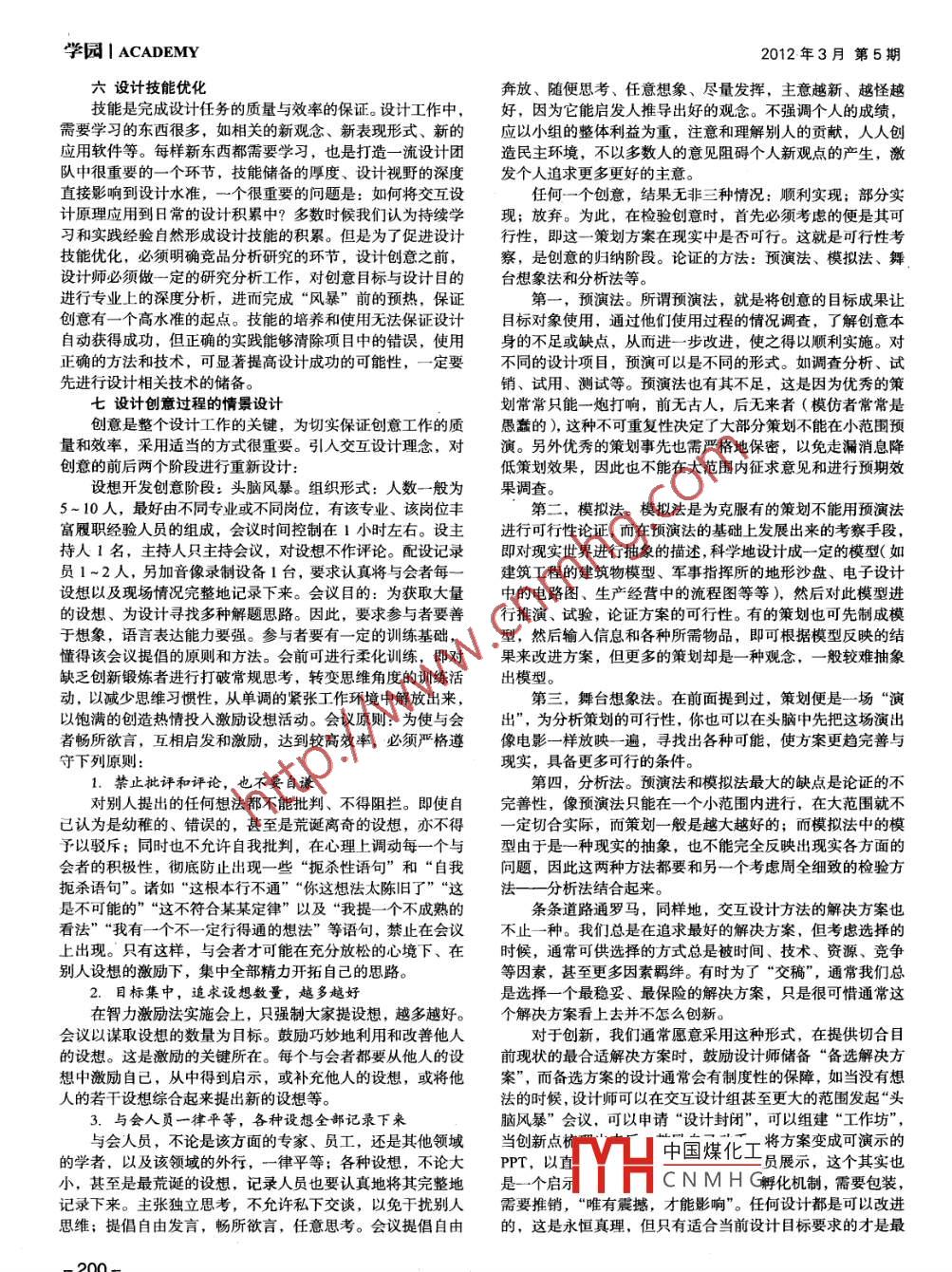 學(xué)園| ACADEMY2012年3月第5期交互設(shè)計理念與設(shè)計方法王昶江南大學(xué)設(shè)計學(xué)院[摘要]交互設(shè)計的實踐顯見于產(chǎn)品設(shè)計,尤其是軟件產(chǎn)品的設(shè)計。但是,從這一看似個別的設(shè)計門類中,總結(jié)出的交互設(shè)計原理,“交互性”概念的提出,其影響便不再限于產(chǎn)品設(shè)計。這表明交互設(shè)計的原理在設(shè)計活動中,具有一般性和普遍性。本文認(rèn)為交互設(shè)計原理對設(shè)計活動產(chǎn)生了廣泛的影響,特別是對許多操作層面的設(shè)計過程,提供了一個新的認(rèn)識和把握的角度。上升到方法論,可以看做是對傳統(tǒng)設(shè)計方法論的一個補充和完善。[關(guān)鍵詞]交互設(shè)計設(shè)計方法[中圖分類號) G642[文獻標(biāo)識碼] A. I文章編號) 1674-4810 (2012 ) 05 - 0199-02交互設(shè)計作為- -廣]關(guān)注交互體驗的新學(xué)科產(chǎn)生于20世實現(xiàn)的過程逐步演繹為可供設(shè)計參考的“情節(jié)”或“事件”。紀(jì)80年代,它由IDEO的-位創(chuàng)始人比爾●莫格里奇在1984經(jīng)驗告訴我們:設(shè)計目標(biāo)的描述不能籠統(tǒng),- -定要有能年一次設(shè)計會議上提出,他-一開始給它命名為“軟面”,由于夠準(zhǔn)確把握的,能把整個目標(biāo)體系有機聯(lián)系在一-起的“情節(jié)”這個名字易讓人想起當(dāng)時流行的玩具“椰菜娃娃”,他后來把“情境”或者“事件”。因為團隊成員經(jīng)常在把握目標(biāo)的細節(jié)它更名為“Interaction Design”-- -交互設(shè)計。上犯錯,當(dāng)設(shè)計目標(biāo)體系通過層層篩選提煉確定,并描述出交互設(shè)計的理念從誕生以來,經(jīng)過許多有心人在不同設(shè)來時,很多細節(jié)卻常常隱藏較深或者被有意無意忽視,但是計領(lǐng)域的探索實踐,已上升成為對設(shè)計工作各個環(huán)節(jié)具有普當(dāng)所有設(shè)計成員能夠“真正”面對“已經(jīng)完成的設(shè)計”時,遍指導(dǎo)意義的方法論。大家必定能針對完成的質(zhì)量說出其優(yōu)勢與不足,因為“已經(jīng)一交互設(shè)計的概念完成了的設(shè)計”能夠為我們提供-一個交互的具體對象。那么簡單地說,交互設(shè)計是產(chǎn)品、使用者和使用過程(環(huán)境、怎么才能在設(shè)計項目一開始,就讓大家認(rèn)識“已經(jīng)完成的設(shè)方式),以及所有與此相關(guān)細節(jié)通盤考慮的一系列設(shè)計理念。計”?我想,就是讓大家在一-開始就參 與設(shè)計目標(biāo)的描述,它突破了傳統(tǒng)的設(shè)計理念主要關(guān)注表現(xiàn)形式,機械地分割開通過這一共同描述的過程,不但能清晰地把握目標(biāo),而且能形式和內(nèi)容、形式和功能的模式。交互設(shè)計旨在規(guī)劃和描述達成對設(shè)計目標(biāo)體系的共識。事物的行為方式,然后描述傳達這種行為的最有效形式。四目標(biāo)、內(nèi)容、方法明確的設(shè)計調(diào)研交互設(shè)計借鑒了傳統(tǒng)設(shè)計、系統(tǒng)論、工程學(xué)科的理論和在提出設(shè)計計劃和制訂工作流程之前,真正進入設(shè)計階技術(shù)。它是-一個具有獨特方法和實踐的綜合體,而不只是部段還需要-一個調(diào)查一研究一 分析的過程, 即設(shè)計調(diào)研。設(shè)計分的疊加。它也是一門系統(tǒng)工程學(xué)科,具有不同于藝術(shù)和工調(diào)研在設(shè)計流程中是很重要的一步,后續(xù)設(shè)計的所有出發(fā)點程學(xué)科的方法。和工作側(cè)重點都是根據(jù)所調(diào)查的資料和分析結(jié)果決定的,它二交互設(shè)計理念影響下的設(shè)計方法思考決定著設(shè)計展開的實際條件。市場信息的大量收集和分析,設(shè)計方法論的思考其實是永恒的話題,所有從事設(shè)計的有助于加深對設(shè)計問題的認(rèn)識,并完整地定義問題。伴隨著人幾乎都在想,什么樣的方法能讓我們又快又有效地完成設(shè)網(wǎng)絡(luò)與信息系統(tǒng)的發(fā)展,調(diào)研資料的收集手段與方法也發(fā)生計任務(wù)?初步了解交互設(shè)計理論讓我深有感觸,結(jié)合我們自了很大變化,但需明確的是設(shè)計的準(zhǔn)備階段的設(shè)計調(diào)查和分身在實踐中的設(shè)計方法及工作流程,在平臺建設(shè)、多人參與、析最終是為設(shè)計服務(wù)的,所以調(diào)查更應(yīng)該注重內(nèi)容而不是方互動分享、激勵個人貢獻等方面我們又該有什么樣的思考?法。高效的調(diào)查在于明確的調(diào)查目的和內(nèi)容,調(diào)查的方法和關(guān)于設(shè)計方法和工作流程人們慢慢有了一-個共識,那就是:具體工作計劃。除了完整、規(guī)范,還要反應(yīng)迅速且正確,有活力,有自我批設(shè)計調(diào)查是一-個復(fù)雜、綜合的系統(tǒng),它包含了技術(shù)、人評和自我完善的機制。文、審美等諸多方面的內(nèi)容,并且有些因素又在不斷地變化,好的設(shè)計方法和工作流程應(yīng)該是什么?一個好的設(shè)計方要獲得關(guān)于它們的準(zhǔn)確又全面的信息,不能僅僅依靠經(jīng)驗和法,當(dāng)然是保證有效、有序地完成設(shè)計工作,達成設(shè)計目標(biāo)。主觀臆斷,而要通過細致和深入的對比分析,才能保證所掌考慮到設(shè)計是綜合性創(chuàng)造活動,工作流程中環(huán)節(jié)多、參與的