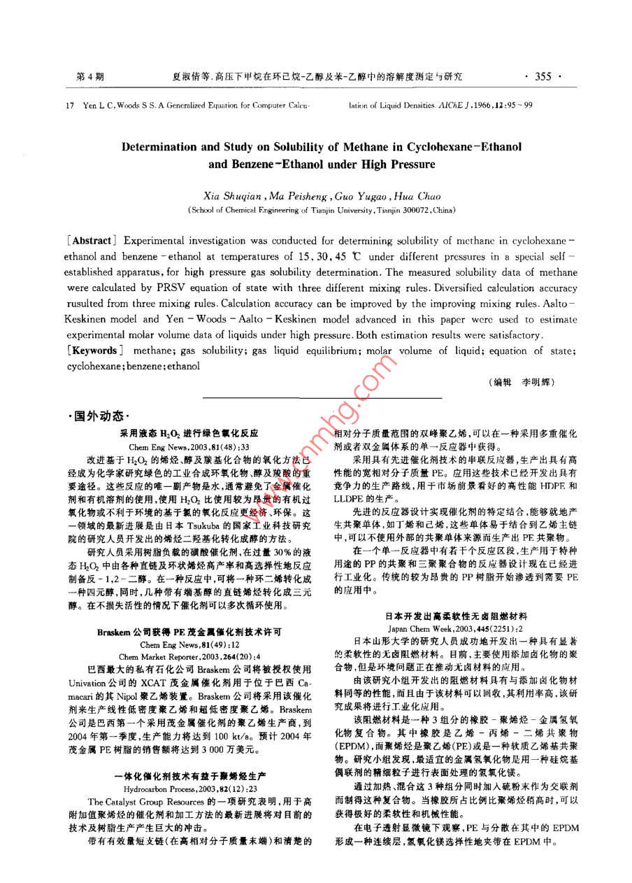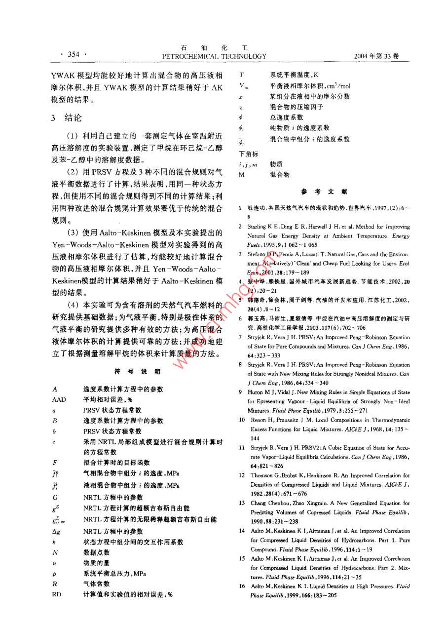 2004午第33卷第4期PETROCHEMICAL TECHNOLOGY351高壓下甲烷在環(huán)己烷-乙醇及苯-乙醇中的溶解度測定與研究夏淑倩,馬沛生,郭玉高,華超(天津大學(xué)化T學(xué)院,天津3072[摘要]利用自己建立的高壓下測定氣體在液體中溶解度的測定裝置在15-45℃、2.0-12.0MPa的條件下,首次測定了甲烷在環(huán)已烷乙酵苯乙醇混合體系中的溶解度。用PRSV狀態(tài)方程及3種不同的混合覿則對實(shí)驗(yàn)測定的氣液平衡數(shù)據(jù)進(jìn)行了計算。計算結(jié)果表明使用同一種狀態(tài)方程的不同混合規(guī)則計算極性體系的氣液平衡數(shù)據(jù)所得的結(jié)果不同,改變傳統(tǒng)的混合規(guī)則可提高計算精度。同時還使用Al- Keskinen模型及本研究提出的Yen-WadsAaltorKeskinen模型對實(shí)驗(yàn)得到的高壓液相摩爾體積進(jìn)行了估算,均得到滿意的結(jié)果[關(guān)鍵詞]甲烷;氣體溶解度;氣液平衡;液體摩爾體積;狀態(tài)方程;環(huán)已烷;苯;乙醇[文章編號]100081442004)040351-05中圈分類號]TQ02732[文獻(xiàn)標(biāo)識碼]A隨著人類環(huán)保意識的加強(qiáng)綠色能源必將成為22儀器及設(shè)備世界經(jīng)濟(jì)發(fā)展中一種最重要的替代能源,目前已有建立了一套測定氣體在液體中溶解度的實(shí)驗(yàn)裝30多個國家正在實(shí)施以天然氣取代石油的戰(zhàn)略計置整個實(shí)驗(yàn)裝置由高壓平衡系統(tǒng)和常壓分析系統(tǒng)劃。天然氣汽車以其資源豐富、分布廣泛、價格低組成。在高壓平衡系統(tǒng)中利用高壓液相循環(huán)泵對液廉、排放污染小、運(yùn)輸性和流動性好等優(yōu)點(diǎn),已受到相進(jìn)行循環(huán),并且在循環(huán)管路中加入取樣釜,這樣操國內(nèi)外的普遍關(guān)注-4。作既可加速氣液平衡,又解決了高壓物系氣體溶解但目前天然氣汽車在燃料儲存上尚存在諸多問度測定過程中取樣難和取樣時產(chǎn)生二次平衡等問題??紤]將甲烷溶解在合適的溶劑中,這樣既可以題。氣體溶解量的測定采用低溫閃蒸的方法閃蒸降低燃料的儲存壓力,又可以增大燃料的能量貯存后氣體排水的體積即為高壓下氣體的溶解量。利用密度,用這種含有溶劑的天然氣作為汽車燃料,也許該裝置不但可以測定高壓下氣體在溶劑中的溶解是解決天然氣汽車燃料儲存的一條有效途經(jīng)。在我度,而且還可以計算高壓下取樣釜中的液體量,得到國,目前選擇乙醇作為溶劑的乙醇汽油正受到廣泛高壓下液相的摩爾體積。實(shí)驗(yàn)裝置、實(shí)驗(yàn)的詳細(xì)操的關(guān)注5作過程及實(shí)驗(yàn)裝置的可靠性見文獻(xiàn)61。本工作選擇輕汽油中的組分環(huán)已烷苯為主要2結(jié)果與討論溶劑,同時考慮到乙醇作為一種極性溶劑,將其與弱極性的環(huán)己烷及苯混合,測定并研究甲烷在其混合21實(shí)驗(yàn)結(jié)果溶劑中的溶解度,對研究氣液平衡和氣體溶解度的測定了常溫下甲烷在環(huán)已烷-乙醇及苯-乙醇中理論具有重要意義。因此,本實(shí)驗(yàn)測定了甲烷在環(huán)的溶解度高壓平衡氣相為純甲烷(溶劑蒸氣所占?xì)庖淹橐掖?、?乙醇物系中的高壓溶解度,分析了其相比例的誤差最大不超過0003),平衡液相為三元溶解度與溫度、壓力的關(guān)系,對實(shí)驗(yàn)數(shù)據(jù)進(jìn)行了計算混合物實(shí)驗(yàn)測得平衡液相的組成及高壓液體摩爾和討論,為甲烷在乙醇汽油中的儲存研究提供了依體積見表1據(jù),同時也促進(jìn)了氣液平衡理論的發(fā)展。22氣液平衡計算模型平衡液相為三元高壓液體,該液體混合物為非1實(shí)驗(yàn)部分極性物質(zhì)與極性溶劑乙醇的混合物,采用PRSⅤ方1.1試劑甲烷:純度99.9%,北京甲烷廠;乙醇:純度收稿日期]2001107修改稿日期]200123199.7%,天津市登峰化學(xué)試劑廠;環(huán)已烷:純度作者簡介]夏椒倩《(973}),女河南省商丘縣人博士,講師電話022-27408775,電郵shuqianxia@163.com。聯(lián)系人:馬沛生,電話99.5%,天津市化學(xué)試劑一廠;苯:純度99.5%022-87401743,電郵mapeisheng@tju.edu.cna津市元立化工有限公基金項(xiàng)目]中國石化股份有限公司基金項(xiàng)目(X502009)石油化工352PETROCHEMICAL TECHNOLOGY2004年第33卷表1高壓液相組成及摩爾體積的實(shí)驗(yàn)值與計算值Tablel The composition and molar volume of liquid phase at high pressureRD%RD,℃ P/MPa r(C2HO)x(CH)MethodI Method Method V/emmo-1AK model YWAK modelCH"cyclo-C,.O system18,012.000.3410.7961.411.480.1422.1693,418.0l.680.4100.656-4.1330.012.000.33730.00,1290,2384.4530,00.047593.80,71130.00.080597.92,0245012.000,1190.2934.2245.00.1320.3000.3660.19245.05.130.1450.9350,9111.640.0680-6,850,4600,2112.36t8.85220,955-0.847-0.20988.63.39-6.98-0.608-0.00030.24130.00.2283.1884,95.6388.8.230.65192.9L2.000,2190.303L.390.212-0.02240.27188.L2.640.2920.06701,953.3291.62.13CH4-CHs-CHO system2.020.1230.22551.5376,8056330,8.040,15230.05,130.1430.0950-3218200.73730.02,640.1500.0513000.2141.9272.50.257-4.3330.00.08884.5978.6L,470.9050.2830.0498-0,5141.360.56530,012.000.3350.2057.041.8871.10.30273.70.32530,05.130.3840.0869-0.1376.20130,00,4020,04495.00-1,09-0.000278.3-3.25程及以下幾種混合規(guī)則對該氣液平衡進(jìn)行了計算。n=(z-1)-ln(z-B)-(1)采用傳統(tǒng)的混合規(guī)則(方法一)。方程中常數(shù)a和b的計算方法為A(2xyAB1ln「x+(1+2)Ba=(1-k)√aA式中參數(shù)A,B的計算已在常壓計算中列出aM=∑∑xp(2)采用 Margules型二元參數(shù)混合規(guī)則(方法b=∑x二)。改變傳統(tǒng)的二元混合物的交互參數