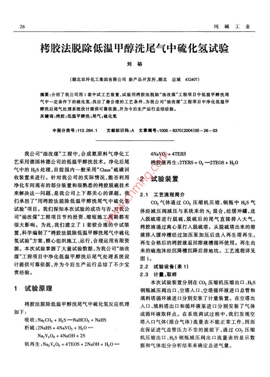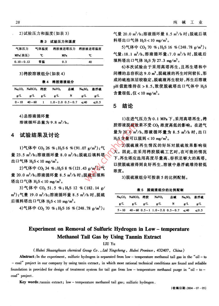栲膠法脫除低溫甲醇洗尾氣中硫化氫試驗