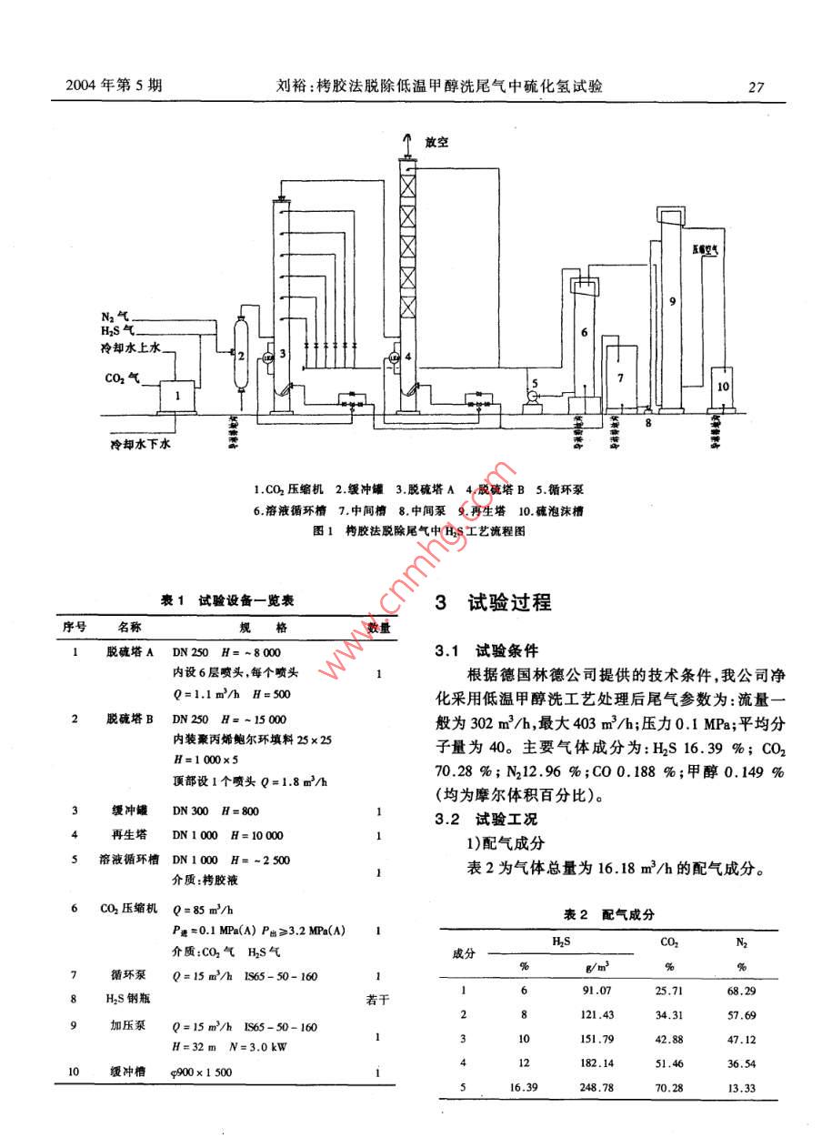 純堿工業(yè)栲膠法脫除低溫甲醇洗尾氣中硫化氫試驗劉裕(湖北雙環(huán)化工集團有限公司新產品開發(fā)所,湖北應城432407)摘要:介紹了我公司用1套中試工藝裝置,試驗用栲膠法脫除“油改煤”工程項目中低溫甲醇洗尾氣中一定條件下的硫化氫,找出了最合理的工藝條件,為我公司“油改煤”工程項目中凈化低溫醇洗后尾氣處理系統設計提供可靠依據,并為今后生產運行總結經驗。關鍵詞:膠;低溫甲醇洗;尾氣;硫化氫中圖分類號:113264.1文獻標識碼:A文章編號:1005-8370(2004)05-26-03我公司“油改煤”工程中,合成氨原料氣凈化工4NavO3+ 4TERS藝采用德國林德公司的低溫甲醇洗技術。凈化后尾栲膠液再生:2TERS+O2-2TEOS+H2O氣中的H2S處理,目前國內一般采用“ Claus"硫磺回收裝置來進行。針對我公司的實際情況能否利用2試驗裝置凈化車間現有的部分裝置和很熟悉的栲膠脫硫技術來解決這一問題,是我公司上下都關心的課題。我2.1工藝流程簡介們承擔了“用栲膠法脫除低溫甲醇洗尾氣中硫化氫CO2氣體通過CO2壓縮機壓縮、鋼瓶中H2S氣試驗”項目。我們深知本次試驗的成功與否對我公體經減壓閥減壓與系統來的N2混合,經緩沖罐送司“油改煤”工程項目節(jié)約投資縮短施工周期都有入脫硫塔進行脫硫,脫硫后的尾氣直接排入大氣。很大影響。為此我們建立了1套較合理的中試裝栲膠液通過離心泵打入脫硫塔。從脫硫塔出來的溶置,科學編制了“栲膠法脫除低溫甲醇洗尾氣中硫化液排入緩沖槽經過加壓泵加壓后送入再生塔再生氫試驗”方案,精心組織施工、運行,合理運用有限資再生合格后的栲膠液返回溶液槽循環(huán)使用。再生出源。本次試驗掌握了大量試驗數據,為我公司“油改來的硫泡沫經沉降槽沉降后排地坑。工藝流程詳見煤”工程項目中凈化低溫甲醇洗后尾氣處理系統設圖1。計提供可靠依據,并為今后生產運行總結了不少寶22試驗設備(表1)貴經驗。2.3計量、取樣本次試驗裝置分別在CO2壓縮機壓縮出口、H2S試驗原理鋼瓶減壓閥出口、空塔入口、空塔循環(huán)液進口總管和填料塔循環(huán)液進口分別安裝了計量裝置。在空塔出栲膠法脫除低溫甲醇洗尾氣中硫化氫反應機理口、填料塔出口和循環(huán)液泵進口分別安裝了氣體如下或循環(huán)液取樣點。在系統調試過程中,我們發(fā)現空吸收:Na2CO3+H2S= NaHCO3+NaHs塔入口氣體(混合氣體)流量表不能正常工作,因而析硫:2NaHS+4NaⅤO3+H2O在保證進氣總管壓力不變的提前下,通過CO2壓縮Na? V4Og+4NaOH 2S機壓縮出口、H2S鋼瓶減壓閥出口流量表的顯示數釩再生:Na2V4O+4TEOS+2NaOH+H2O=據和氣體組分分析結果來確定總進氣量。2004年第5期劉裕:栲膠法脫除低溫甲醇洗尾氣中硫化氫試驗放空N2氣區(qū)區(qū)冷卻水上水冷卻水下水1.CO2壓縮機2.緩沖罐3.脫硫塔A4.脫硫塔B5循環(huán)泵6溶液循環(huán)槽7中間8中間泵9再生塔10硫泡沫槽圖1檔膠法脫除尾氣中H2S工藝流程圖衰1試驗設備一覽表3試驗過程序號名稱數量脫硫塔ADN250H=-80003.1試驗條件內設6層噴頭,每個噴頭根據德國林德公司提供的技術條件,我公司凈Q=1.1m3/hH=500化采用低溫甲醇洗工藝處理后尾氣參數為:流量2脫硫塔BDN250H=~15000般為302m3/h,最大403m3/h;壓力01MPa;平均分內裝聚丙烯鮑爾環(huán)填料25×25子量為40。主要氣體成分為:HS16.39%;CO2H=1000x5頂部設1個噴頭Q=1.8m3/h70.28%;N212.96%;CO0.188%;甲醇0.149%(均為摩爾體積百分比)。3級沖罐DN300H=8003.2試驗工況再生塔DN1000H=100001)配氣成分5溶液循環(huán)槽DN1000H=-2500表2為氣體總量為16.18m3/h的配氣成分。介質:栲膠液6CO壓縮機Q=85m3/h表2配氣成分P進=0.1MPa(A)Ps≥32MPa(A)1介質:CO2氣H2S氣成分7循環(huán)泵Q=15m3/his65-50-1608H2S鋼瓶6若干91.0725,7168,29加壓泵Q=15m3/h65-50-160H=32 m N=3.0 kw10緩沖槽9900×150051,4616.39248.78純堿工業(yè)2)試驗壓力和溫度(如表3)氣量20.0m3/h;溶液循環(huán)量8.5m3h時;脫硫后填表3試驗壓力和溫度料塔出口氣體HS<10mg/m3。氣體壓力氣體溫度栲膠液進塔壓力栲膠液進塔溫度5)氣體中CO270%;H2S16%(248.78g/m3);MPa(表壓)氣量:18.1m3/h,溶液循環(huán)量:7.0m3/h時,脫硫后0.10~012常溫40填料塔出口氣體HS為27.3mg/m3。6)本次試驗由于采用高塔再生,且再生塔和中3)栲膠溶液組分(如表4)間槽的總容積達9.0m3,脫硫液的再生時間較長,形衰4耥膠溶液組分成的硫泡沫層較穩(wěn)定,脫硫液再生較好,再生后溶液Na2CO3 Nahco3栲膠NavO3總堿Na2SO4懸浮硫pH值能維持在>85,致使脫硫塔出口氣體中H2SL gL含量很低,僅<10mg/m30-104011.0-2.00.5-0.7≤40≤0.55結論4)總溶液循環(huán)量溶液循環(huán)總量為98m3/h1)在進氣壓力為0.1MPa下,采用高塔再生,槽膠溶液脫硫效果不受CO2濃度高低的影響。在進氣4試驗結果及討論量為20.0m3/h,溶液循環(huán)量為8.5m3h時,出口H2S含量可以脫到<10mg/m31)氣體中CO226%;H2S6%(91.07g/m3);氣2)脫硫液再生情況的好壞對脫硫效果影響很量23.5m3/h;溶液循環(huán)量8.0m3/h;脫硫后填料塔大。因此,在采用栲膠脫硫工藝時,在可能的情況出口氣體H2S<10mg/m3下,再生塔應選用高度盡量高、容積足夠大的高塔,以使脫硫液得到良好再生,溶液中懸浮硫維持較低2)氣體中CO234%;S8%(121.43g/m3);氣濃度。量20.0m3/h;溶液循環(huán)量8.5m3h時;脫硫后填料3)脫硫液組分可按表5的比例配制。塔出口氣體H2S<10mg/m33)氣體中CO251.5%;H2S12%(182.14g表5脫硫液組分的比例配制m3);氣量19.0m3/h;溶液循環(huán)量8.5m3/h時,脫硫Na2CO3 NahcO3考膠NaVO3總堿Na2SO4懸浮硫后填