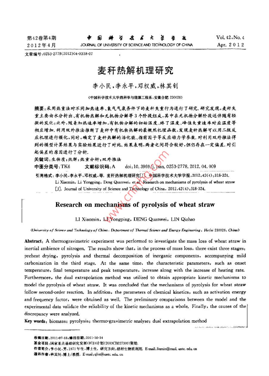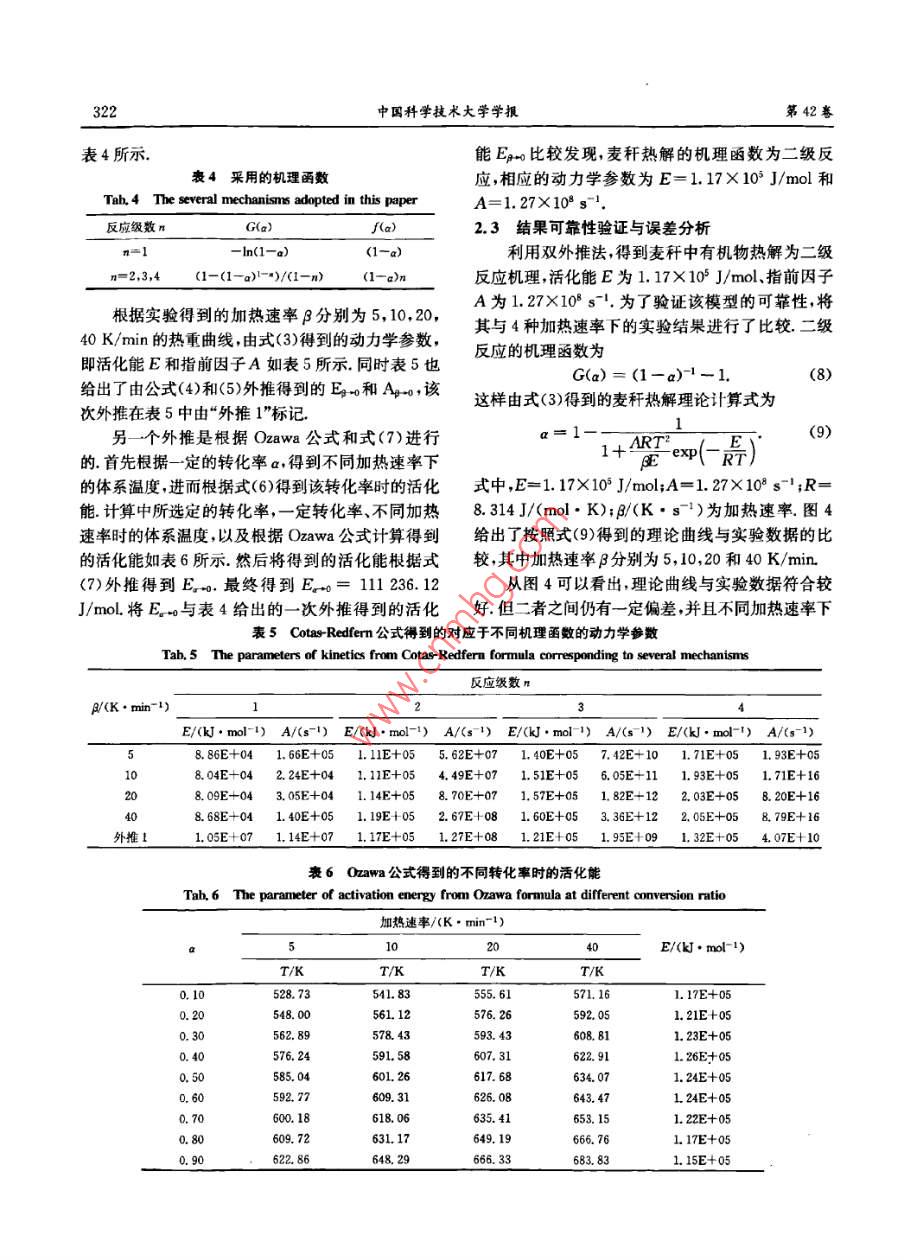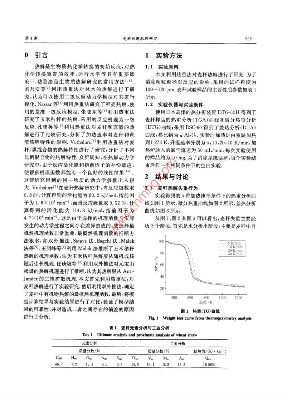 第42卷第4期中國(guó)科學(xué)技求大每學(xué)次Vol. 42.No. 42012年4月JOUIRNAL OF UNIVERSITY OF SCIENCE AND TECHNOLOGY Of CHINAApr.201 2文章編號(hào);0253-2778<2012)04 0318-07麥稈熱解機(jī)理研究李小民,李永平,鄧權(quán)威,林其釗(中國(guó)科學(xué)技術(shù)大學(xué)熱科學(xué)與能源工程系,安徽合肥230026)摘要:采用熱重法對(duì)不同加熱速率、氯氣氣氛條件下的麥稈失重行為進(jìn)行了研究.研究發(fā)現(xiàn),麥稈失重主要由水分析出、有機(jī)物熱解和無(wú)機(jī)物分解等3個(gè)階段組成,其中在無(wú)機(jī)物分解階段還伴隨有輕微的炭化;此外,隨著加熱速率增加,有機(jī)物分解的初始溫度.終了溫度.峰值失重速率對(duì)應(yīng)溫度等相應(yīng)增加.利用雙外推法推斷了麥稈中有機(jī)物熱解的最概然機(jī)理函數(shù),發(fā)現(xiàn)麥稈熱解可以用二級(jí)反應(yīng)機(jī)理進(jìn)行?;?,同時(shí),確定了麥稈熱解的活化能、指前因子等反應(yīng)動(dòng)力學(xué)參數(shù).對(duì)利用雙外推法得到的模型計(jì)算結(jié)果與實(shí)驗(yàn)結(jié)果進(jìn)行了對(duì)比.結(jié)果表明.兩者之間符合較好,但仍存在一定偏差.對(duì)引起偏差的原因進(jìn)行了分析.關(guān)鍵詞:生物質(zhì);熱解;熱重分析;雙外推法中團(tuán)分類號(hào):TK6文獻(xiàn)標(biāo)識(shí)碼:Adoi; 10. 3969/j. issn. 0253-2778. 2012. 04. 009引用格式:李小民,李永平,鄧權(quán)威,等.麥稈熱解機(jī)理研究[J].中國(guó)科學(xué)技術(shù)大學(xué)學(xué)報(bào),2012,42<4>:318-324.Li Xiaomnin, Li Yongping, Deng Quanwei, et al Research on mechanisms of pyrolysis of wheat straw[]. Journal of University of Science and Technology of China, 2012,42(4) :318 324Research on mechanisms of pyrolysis of w heat strawLI Xiaomin, LI Yongping, DENG Quanwei, LIN Qizhao(Uniursisy of Scienro and Technology of China, Department of Thermal Scince and Energy Enginering, Hefei 230026. Chima)Abstract: A thermogravimetric experiment was performed to investigate the mass loss of wheat straw ininertial ambience of nitrogen. The results show that, in the process of mass loss, there exist three stages:preheat drying, pyrolysis and thermal decomposition of inorganic components, accompanying mildcarbonization in the third stage. At the same time, the characteristic parameters, such as onsettemperature, final temperature and peak temperature, increase along with the increase of heating rate.Furthermore, the dual extrapolation method was utilized to obtain appropriate kinetic mechanisms tomodel the pyrolysis of wheat straw. It was concluded that the mechanisms of pyrolysis for wheat strawfollow second-order reaction. In addition, the parameters of chemical kinetics, such as activation energyand frequency factor, were obtained as well. The preliminary comparisons between the model and theexperimental data validate the reliability of the kinetic mechanisms as a whole. Finally, the causes of thediscrepancy were analyzed.Key words: biomass; pyrolysis; thermo-gravimetric analyse; dual extrapolation method收痛日期:2011-07-181修回日期:2011-10-14基金項(xiàng)目:國(guó)家重點(diǎn)基礎(chǔ)研究發(fā)展(973)計(jì)劃(2010C227300)資助.作者簡(jiǎn)介:李小民。男.1971年生.博土生。研究方向:秸稈生物質(zhì)利用Emil:ixmin@rmaiL ustc edu cn通訊作者:林其釗,博上/鐵授Email:qlin@ustc edu. cn第4期麥稈熱解機(jī)理研究3190引言1實(shí)驗(yàn)方法熱解是生物質(zhì)熱化學(xué)轉(zhuǎn)換的初始反應(yīng),對(duì)熱1.1實(shí)驗(yàn)原料化學(xué)轉(zhuǎn)換裝置的效率、運(yùn)行水平等具有重要影本文利用熱重法對(duì)麥稈熱解進(jìn)行了研究.為了響凹。熱重法是生物質(zhì)熱解研究的常用方法14].消除顆粒粒徑對(duì)反應(yīng)的影響,采用的試樣粒度為劉乃安等[2]利用熱重法對(duì)林木的熱解進(jìn)行了研100~120 pm.麥稈試驗(yàn)樣品的主要性質(zhì)參數(shù)如表1究,認(rèn)為可以使用二級(jí)反應(yīng)動(dòng)力學(xué)模型對(duì)其進(jìn)行所示.模化. Nassar等(3)利用熱重法研究了稻殼熱解,使1.2實(shí)驗(yàn)儀器與實(shí)驗(yàn)條件用的是準(zhǔn)-級(jí)反應(yīng)模型.張曉東等1[1利用熱重法使用日本島津的熱分析裝置DTG 60H得到了研究了玉米秸稈的熱解,采用的反應(yīng)機(jī)理為- - 級(jí)麥稈樣品的熱重分析(TGA)曲線和微分熱重分析反應(yīng).孔曉英等I5]1利用熱重法對(duì)麥稈和蔗渣的熱(DTG)曲線;采用DSC-60得到了差熱分析(DTA)解進(jìn)行了比較研究,分析了加熱速率對(duì)麥稈和蔗曲線,參比物為arAl2().實(shí)驗(yàn)時(shí)加熱爐由室溫加熱渣熱解特性的影響. Vuthaluru[6]利用熱重法對(duì)麥到1 273 K,升溫速率分別為5, 10,20, 40 K/min,加稈/煤混合物的熱解特性進(jìn)行了研究,分析了不同熱爐通人的氮?dú)饬魉贋?0 mL/ min,每次實(shí)驗(yàn)使用比例混合物的熱解特性.眾所周知,在熱解動(dòng)力學(xué)的樣品約為10mg.為了消除系統(tǒng)誤差,每個(gè)實(shí)驗(yàn)結(jié)研究中,由于反應(yīng)活化能和指前因子的補(bǔ)償效應(yīng),束后作- -個(gè)相同條件下的空白實(shí)驗(yàn).使很多機(jī)理函數(shù)都能有一個(gè)良好的線性結(jié)果(78].2結(jié)果與討論這使研究得到的同一物質(zhì)的動(dòng)力學(xué)參數(shù)出入很大. VuthaluruF']在麥稈熱解研究中,當(dāng)反應(yīng)級(jí)數(shù)取2.1麥稈 熱解失重行為0.8時(shí),計(jì)算得到的活化能為80.2kJ/mol,指前因?qū)嶒?yàn)得到的4種加熱速率條件下的熱重分析曲子為1.