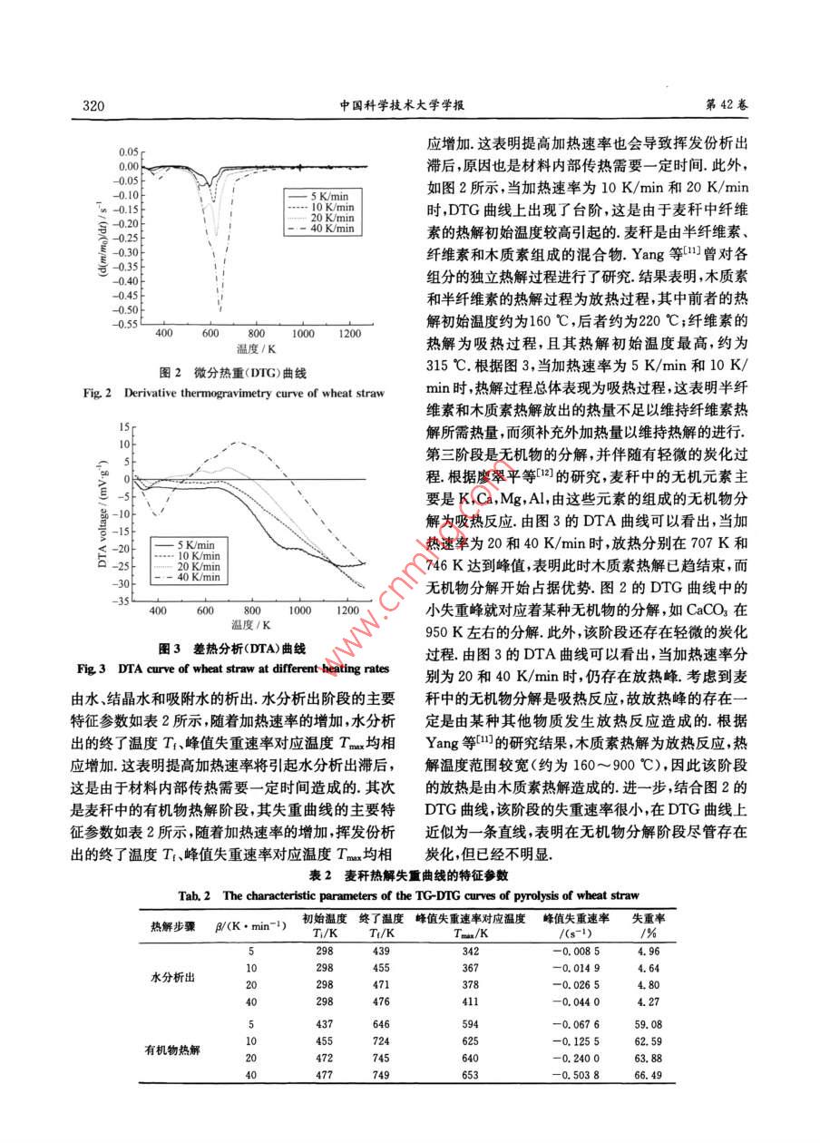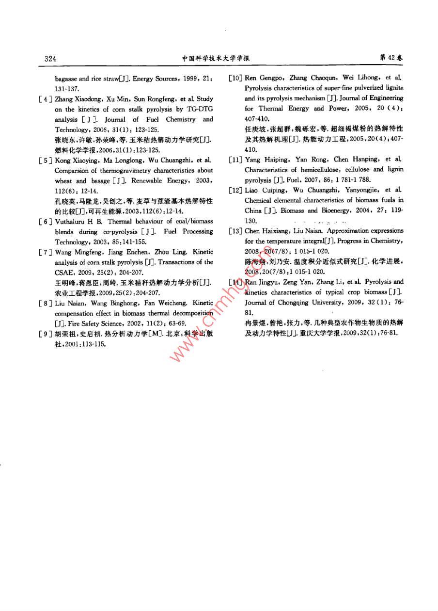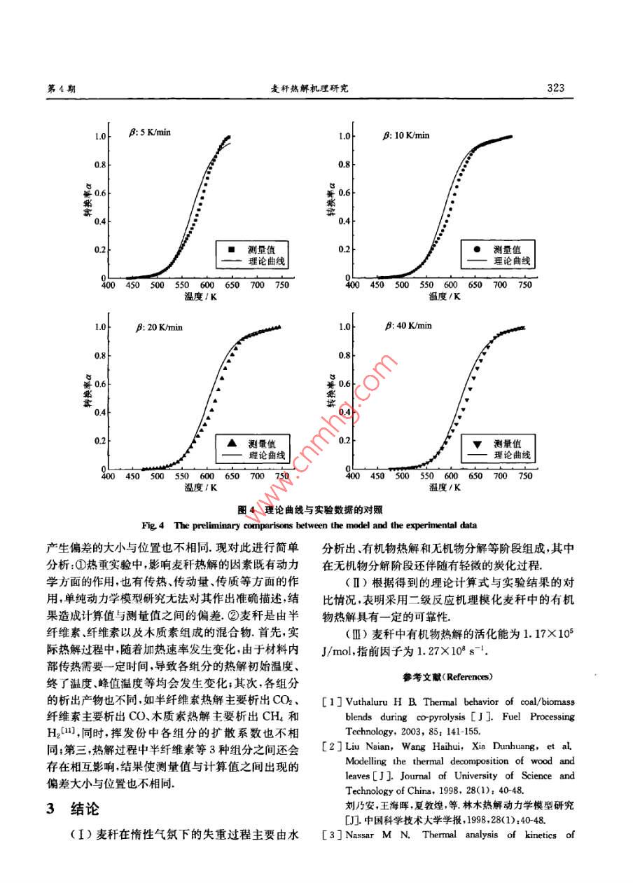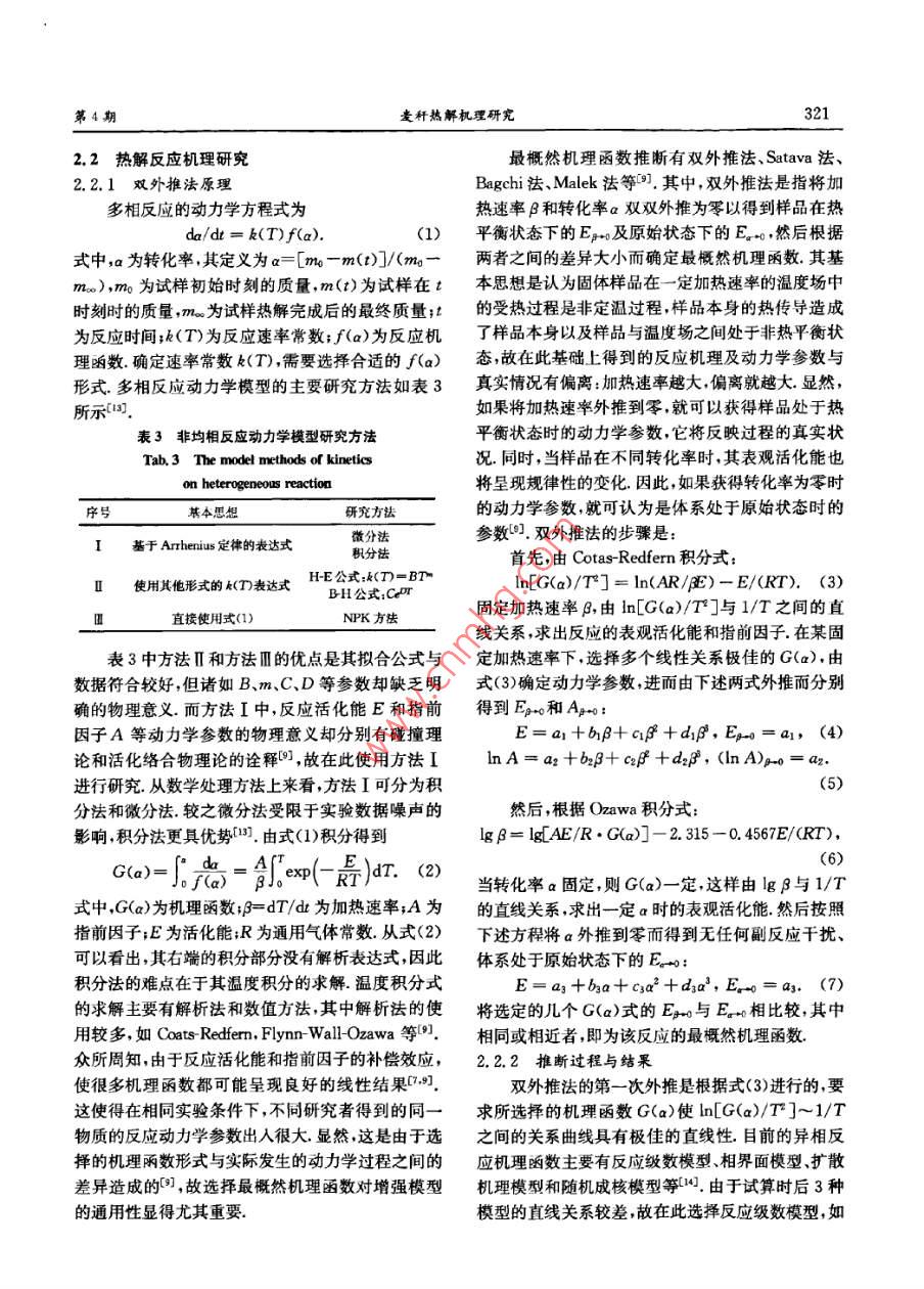 第42卷第4期中國(guó)科學(xué)技求大每學(xué)次Vol. 42.No. 42012年4月JOUIRNAL OF UNIVERSITY OF SCIENCE AND TECHNOLOGY Of CHINAApr.201 2文章編號(hào);0253-2778<2012)04 0318-07麥稈熱解機(jī)理研究李小民,李永平,鄧權(quán)威,林其釗(中國(guó)科學(xué)技術(shù)大學(xué)熱科學(xué)與能源工程系,安徽合肥230026)摘要:采用熱重法對(duì)不同加熱速率、氯氣氣氛條件下的麥稈失重行為進(jìn)行了研究.研究發(fā)現(xiàn),麥稈失重主要由水分析出、有機(jī)物熱解和無(wú)機(jī)物分解等3個(gè)階段組成,其中在無(wú)機(jī)物分解階段還伴隨有輕微的炭化;此外,隨著加熱速率增加,有機(jī)物分解的初始溫度.終了溫度.峰值失重速率對(duì)應(yīng)溫度等相應(yīng)增加.利用雙外推法推斷了麥稈中有機(jī)物熱解的最概然機(jī)理函數(shù),發(fā)現(xiàn)麥稈熱解可以用二級(jí)反應(yīng)機(jī)理進(jìn)行?;?,同時(shí),確定了麥稈熱解的活化能、指前因子等反應(yīng)動(dòng)力學(xué)參數(shù).對(duì)利用雙外推法得到的模型計(jì)算結(jié)果與實(shí)驗(yàn)結(jié)果進(jìn)行了對(duì)比.結(jié)果表明.兩者之間符合較好,但仍存在一定偏差.對(duì)引起偏差的原因進(jìn)行了分析.關(guān)鍵詞:生物質(zhì);熱解;熱重分析;雙外推法中團(tuán)分類號(hào):TK6文獻(xiàn)標(biāo)識(shí)碼:Adoi; 10. 3969/j. issn. 0253-2778. 2012. 04. 009引用格式:李小民,李永平,鄧權(quán)威,等.麥稈熱解機(jī)理研究[J].中國(guó)科學(xué)技術(shù)大學(xué)學(xué)報(bào),2012,42<4>:318-324.Li Xiaomnin, Li Yongping, Deng Quanwei, et al Research on mechanisms of pyrolysis of wheat straw[]. Journal of University of Science and Technology of China, 2012,42(4) :318 324Research on mechanisms of pyrolysis of w heat strawLI Xiaomin, LI Yongping, DENG Quanwei, LIN Qizhao(Uniursisy of Scienro and Technology of China, Department of Thermal Scince and Energy Enginering, Hefei 230026. Chima)Abstract: A thermogravimetric experiment was performed to investigate the mass loss of wheat straw ininertial ambience of nitrogen. The results show that, in the process of mass loss, there exist three stages:preheat drying, pyrolysis and thermal decomposition of inorganic components, accompanying mildcarbonization in the third stage. At the same time, the characteristic parameters, such as onsettemperature, final temperature and peak temperature, increase along with the increase of heating rate.Furthermore, the dual extrapolation method was utilized to obtain appropriate kinetic mechanisms tomodel the pyrolysis of wheat straw. It was concluded that the mechanisms of pyrolysis for wheat strawfollow second-order reaction. In addition, the parameters of chemical kinetics, such as activation energyand frequency factor, were obtained as well. The preliminary comparisons between the model and theexperimental data validate the reliability of the kinetic mechanisms as a whole. Finally, the causes of thediscrepancy were analyzed.Key words: biomass; pyrolysis; thermo-gravimetric analyse; dual extrapolation method收痛日期:2011-07-181修回日期:2011-10-14基金項(xiàng)目:國(guó)家重點(diǎn)基礎(chǔ)研究發(fā)展(973)計(jì)劃(2010C227300)資助.作者簡(jiǎn)介:李小民。男.1971年生.博土生。研究方向:秸稈生物質(zhì)利用Emil:ixmin@rmaiL ustc edu cn通訊作者:林其釗,博上/鐵授Email:qlin@ustc edu. cn第4期麥稈熱解機(jī)理研究3190引言1實(shí)驗(yàn)方法熱解是生物質(zhì)熱化學(xué)轉(zhuǎn)換的初始反應(yīng),對(duì)熱1.1實(shí)驗(yàn)原料化學(xué)轉(zhuǎn)換裝置的效率、運(yùn)行水平等具有重要影本文利用熱重法對(duì)麥稈熱解進(jìn)行了研究.為了響凹。熱重法是生物質(zhì)熱解研究的常用方法14].消除顆粒粒徑對(duì)反應(yīng)的影響,采用的試樣粒度為劉乃安等[2]利用熱重法對(duì)林木的熱解進(jìn)行了研100~120 pm.麥稈試驗(yàn)樣品的主要性質(zhì)參數(shù)如表1究,認(rèn)為可以使用二級(jí)反應(yīng)動(dòng)力學(xué)模型對(duì)其進(jìn)行所示.模化. Nassar等(3)利用熱重法研究了稻殼熱解,使1.2實(shí)驗(yàn)儀器與實(shí)驗(yàn)條件用的是準(zhǔn)-級(jí)反應(yīng)模型.張曉東等1[1利用熱重法使用日本島津的熱分析裝置DTG 60H得到了研究了玉米秸稈的熱解,采用的反應(yīng)機(jī)理為- - 級(jí)麥稈樣品的熱重分析(TGA)曲線和微分熱重分析反應(yīng).孔曉英等I5]1利用熱重法對(duì)麥稈和蔗渣的熱(DTG)曲線;采用DSC-60得到了差熱分析(DTA)解進(jìn)行了比較研究,分析了加熱速率對(duì)麥稈和蔗曲線,參比物為arAl2().實(shí)驗(yàn)時(shí)加熱爐由室溫加熱渣熱解特性的影響. Vuthaluru[6]利用熱重法對(duì)麥到1 273 K,升溫速率分別為5, 10,20, 40 K/min,加稈/煤混合物的熱解特性進(jìn)行了研究,分析了不同熱爐通人的氮?dú)饬魉贋?0 mL/ min,每次實(shí)驗(yàn)使用比例混合物的熱解特性.眾所周知,在熱解動(dòng)力學(xué)的樣品約為10mg.為了消除系統(tǒng)誤差,每個(gè)實(shí)驗(yàn)結(jié)研究中,由于反應(yīng)活化能和指前因子的補(bǔ)償效應(yīng),束后作- -個(gè)相同條件下的空白實(shí)驗(yàn).使很多機(jī)理函數(shù)都能有一個(gè)良好的線性結(jié)果(78].2結(jié)果與討論這使研究得到的同一物質(zhì)的動(dòng)力學(xué)參數(shù)出入很大. VuthaluruF']在麥稈熱解研究中,當(dāng)反應(yīng)級(jí)數(shù)取2.1麥稈 熱解失重行為0.8時(shí),計(jì)算得到的活化能為80.2kJ/mol,指前因?qū)嶒?yàn)得到的4種加熱速率條件下的熱重分析曲子為1.