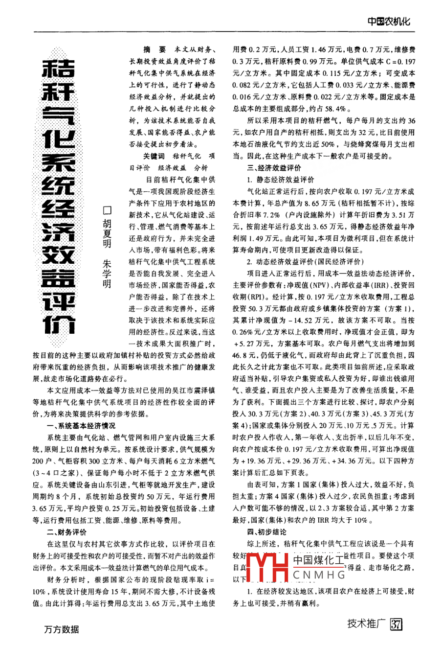中國農(nóng)機(jī)化摘要本文從財務(wù)、用費(fèi)0.2萬元,人員工資146萬元,電費(fèi)0.7萬元,維修費(fèi)長期投資效益角度評價了秸0.3萬元,秸稈原料費(fèi)0.99萬元。單位供氣成本C=0.197稈氣化集中供氣系統(tǒng)在經(jīng)濟(jì)元/立方米。其中固定成本0.115元/立方米;可變成本稈氣化系上的可行性,進(jìn)行了靜動態(tài)0.082元/立方米,它包括人工費(fèi)0.033元/立方米、能源費(fèi)經(jīng)濟(jì)效益分析,并就提出的0.016元/立方米、原料費(fèi)0.022元/立方米等。固定成本是幾種投入機(jī)制進(jìn)行比較分總成本的主要組成部分,約占584%析,為該技術(shù)系統(tǒng)能否自我所以采用本項目的秸稈燃?xì)?每戶每月的支出約36發(fā)展、國家能否得益、農(nóng)戶能元,如農(nóng)戶用自產(chǎn)的秸稈相抵,則支出為32元,比目前使用否接受提出初步看法。本地石油液化氣節(jié)約支出近50%,與燒蜂窩煤每月支出相關(guān)鍵詞秸稈氣化項當(dāng)。因此,在這種生產(chǎn)成本下一般農(nóng)戶是可接受的。目評價經(jīng)濟(jì)效益分析經(jīng)濟(jì)效益評價系統(tǒng)經(jīng)濟(jì)效益目前秸稈氣化集中供1.靜態(tài)經(jīng)濟(jì)效益評價氣是一項我國現(xiàn)階段經(jīng)濟(jì)生氣化站正常運(yùn)行后,按向農(nóng)戶收取0.197元/立方米成□產(chǎn)條件下應(yīng)用于農(nóng)村地區(qū)的本費(fèi)計算,年總產(chǎn)值為865萬元(秸稈相抵暫不計),按綜胡新技術(shù),它從氣化站建沒、運(yùn)合折舊率7.2%(戶內(nèi)設(shè)施除外)計算年折舊費(fèi)為3.51萬夏、管理燃?xì)庀M(fèi)等基本上元,按前述年運(yùn)行總支出3.65萬元,得靜態(tài)經(jīng)濟(jì)效益年凈明還是政府行為,并未完全進(jìn)和鬧149萬元。由此可知,本項目為微利項目,但在系統(tǒng)計入市場,帶有福利色彩。將來算壽命期內(nèi),可使項目更新改造得以保證朱秸稈氣化集中供氣工程系統(tǒng)2.動態(tài)經(jīng)濟(jì)效益評價(國民經(jīng)濟(jì)評價)學(xué)是否能自我發(fā)展、完全進(jìn)入項目進(jìn)入正常運(yùn)行后,用成本一效益法動態(tài)經(jīng)濟(jì)評價明市場經(jīng)濟(jì),國家能否得益,農(nóng)主要評價參數(shù)有:凈現(xiàn)值(NPV)、內(nèi)部收益率(R)、投資回戶能否得益,除了在技術(shù)上收期(RP)。經(jīng)計算,按0.197元/立方米收取費(fèi)用,工程總進(jìn)一步改進(jìn)和完善外,還將投資50.3萬元都由政府或鄉(xiāng)鎮(zhèn)集體投資的方案(方案1)取決于該技術(shù)和系統(tǒng)實(shí)際應(yīng)其累計凈現(xiàn)值為-14.52萬元,故該方案不可取。當(dāng)按用的經(jīng)濟(jì)性。反過來說,當(dāng)這0.26%元/立方米以上收取費(fèi)用時,凈現(xiàn)值才會正值,即為技術(shù)成果大面積推廣時+5.27萬元,方案基本可取。農(nóng)戶每月燃?xì)庵С鰧⒃黾拥桨茨壳暗倪@種主要以政府加鎮(zhèn)村補(bǔ)貼的投資方式必然給政46.8元,仍低于液化氣,而政府卻由此背上了沉重負(fù)擔(dān),因府帶來沉重的經(jīng)濟(jì)負(fù)擔(dān),從而彩響該項技術(shù)推廣的健康發(fā)此長久之計此方案也不可取。此類項目如前所述,應(yīng)采取政展,故走市場化道路勢在必行府適當(dāng)補(bǔ)貼,引導(dǎo)農(nóng)戶集資或私人投資為好,即誰出錢誰用本文應(yīng)用成本一效益等方法對已使用的吳江市震澤鎮(zhèn)氣、誰受益,而且農(nóng)戶投入主要是為了改善生活質(zhì)量,不是等地秸稈氣化集中供氣系統(tǒng)項目的經(jīng)濟(jì)性作較全面的評為了獲利。下面提出三個方案進(jìn)行比較、探討,即農(nóng)戶分別價,為將來決策提供科學(xué)的參考依據(jù)投人30.3萬元(方案2)、40.3萬元(方案3)45.3萬元(方系統(tǒng)基本經(jīng)濟(jì)情況案4);國家或集體分別投入20萬元、10萬元5萬元。計算系統(tǒng)主要由氣化站、燃?xì)夤芫W(wǎng)和用戶室內(nèi)設(shè)施三大系時農(nóng)戶投入作收入,第一年收入、支出折半,以后幾年不變,統(tǒng),原則上以自然村為單元。按系統(tǒng)設(shè)計要求,供氣規(guī)模為向農(nóng)戶按成本價0.197元/立方米收取費(fèi)用,可算出凈現(xiàn)值200戶、氣柜容積300立方米、每戶每天消耗6立方米燃?xì)鉃?19.36萬元、+29.36萬元、+34.36萬元。以下四種方(3-4口之家)、保證每戶每小時不低于2立方米燃?xì)夤┌赣嬎愫髤R總?cè)缦马摫?。?yīng)。系統(tǒng)關(guān)鍵設(shè)備由山東引進(jìn),氣柜等就地開發(fā)生產(chǎn),建設(shè)由表可知,方案1國家(集體)投入過大,效益不好,負(fù)周期約8個月,系統(tǒng)初始總投資約50萬元,年運(yùn)行費(fèi)用擔(dān)太重;方案4國家(集體)投入過少,農(nóng)民負(fù)擔(dān)重;考慮到3.65萬元,平均戶投資0.25萬元。初始投資包括設(shè)備、土建戶數(shù)可能不夠的情況,以2、3方案較合適,其中第2方案等,運(yùn)行費(fèi)用包括工資能源、維修、原料等費(fèi)用。最好,國家(集體)和農(nóng)戶的IRR均大于10%。二、財務(wù)評價四、初步結(jié)論在這里僅與農(nóng)村其它炊事方式作比較,以評價項目在綜上所述,秸稈氣化集中供氣工程應(yīng)該說是一個具有財務(wù)上的可接受性和農(nóng)戶的可接受性,而暫不對產(chǎn)出的效益作較中國煤化工益性項目。要使這個項出評價。本文采用成本一效益法計算燃?xì)獾膯挝挥脷獬杀尽D空娴靡?、走市場化之?財務(wù)分析時,根據(jù)