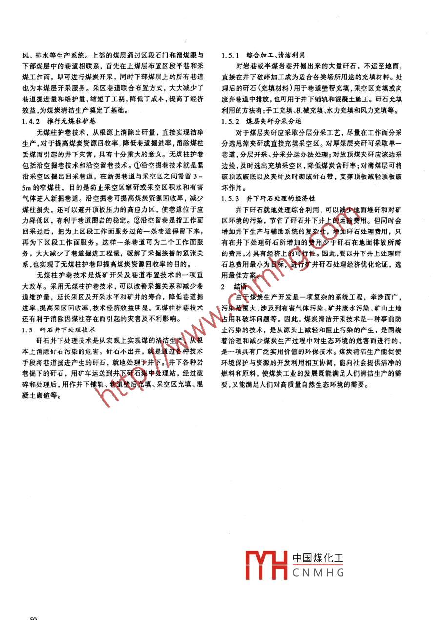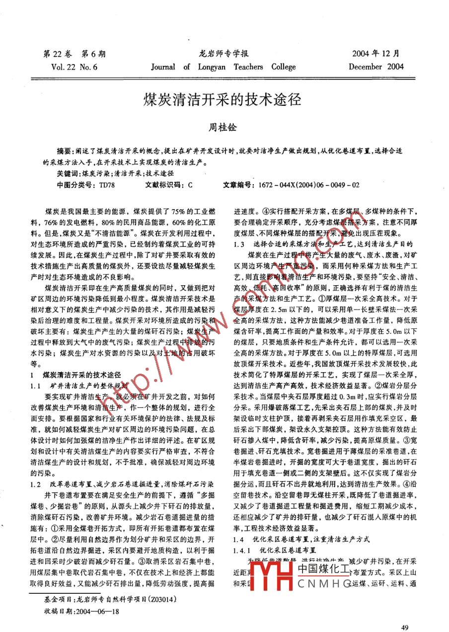 第22卷第6期龍巖師專學報2004年12月Vol. 22 No. 6Joumal of Longyan Teachers CollegeDecember 2004煤炭清潔開采的技術(shù)途徑周桂銓摘要:闡述了煤炭清潔開采的概念,提出在礦井開發(fā)設計時,就要對潔凈生產(chǎn)做出規(guī)劃,從優(yōu)化巷道布置,選擇合適的采煤方法入手,在開采技術(shù),上實現(xiàn)煤炭的清潔生產(chǎn)。關(guān)鍵詞:煤炭污染;清潔開采;技術(shù)途徑中圖分類號: TD78文獻標識碼: C文章編號: 1672 - 044X(2004)06 -0049 -02煤炭是我國最主要的能源,煤炎提供了75%的工業(yè)燃進速度。④實行搭配開采方案,在多煤層、多煤種的條件下,料, 76%的發(fā)電燃料,80%的民用商品能源,60%的化工原要合理確定開采順序,充分考慮煤層搭采方案,注意不同厚料。但是,煤炭又是“不清潔能源”。煤炭在開發(fā)利用過程中,度煤層、不同煤種煤層的搭配開采,避免出現(xiàn)壓茬現(xiàn)象。對生態(tài)環(huán)境所造成的嚴重污染,已經(jīng)制約著煤炭工業(yè)的可持.3 選擇合適的采煤方法和生產(chǎn)工藝,達到清潔生產(chǎn)目的續(xù)發(fā)展。因此,在煤炭生產(chǎn)過程中,除了對礦井要采取有效的煤炭在生產(chǎn)過程中將產(chǎn)生大量的廢氣、廢水、廢渣,對礦技術(shù)措施生產(chǎn)出高質(zhì)量的煤炭外,還要設法盡量臧輕煤炭生區(qū)周邊環(huán)境產(chǎn)生嚴重污染,而采用何種采煤方法和生產(chǎn)工產(chǎn)時對生態(tài)環(huán)境造成的不良影響。藝,則直接影響著清潔生產(chǎn)和環(huán)境污染,要堅持“安全、清潔、煤炭清潔開采即在生產(chǎn)高質(zhì)量煤從的同時,又做到把對高效、低耗、高回收率"的原則,正確選擇有利于煤的清潔生礦區(qū)周邊的環(huán)境污染降低到最小程度。煤炭清潔開采技術(shù)是產(chǎn)的采煤方法和生產(chǎn)工藝。①厚煤層一次采全高技術(shù)。對于相對意義下的煤炭生產(chǎn)中減少污染的技術(shù),其作用是減輕污煤層厚度在2. 5m以下的,可以采用單一長壁采煤法一次采染后治理的難度和工程量。煤炭開采對環(huán)境所造成的污染和全高的采煤方法,這種方法能減少巷道準備工作量,降低原破壞主要有:煤炭生產(chǎn)產(chǎn)生的大量的煤矸石污染;煤炭生產(chǎn)煤含矸率,提高工作面的產(chǎn)量和效率。對于厚度在5. 0m以下過程中釋放到大氣中的廢氣污染;煤炭生產(chǎn)過程中排放的污的煤層,只要地質(zhì)條件和生產(chǎn)條件允許,都可以選用一次采水污染;煤炭生產(chǎn)對水資源的污染以及對土地的占用破壞全高的采煤方法。對于厚度在5. 0m以上的特厚煤層,可選用等。放頂煤開采技術(shù)。近些年,我國放頂煤開采技術(shù)發(fā)展較快,此1煤炭清潔開采的技術(shù)途徑技術(shù)簡化了特厚煤層的開采工藝,實現(xiàn)了煤層一次采全厚,1.1 礦井清潔生產(chǎn)的整體規(guī)劃達到清潔生產(chǎn)高產(chǎn)高效,技術(shù)經(jīng)濟效益顯著。②煤巖分層分要實現(xiàn)礦井清潔生產(chǎn),就必須在礦井開發(fā)之前,對如何采技術(shù)。當煤層中夾石層厚度超過0. 3m時,應實行煤巖分層改善煤炭生產(chǎn)環(huán)境和清潔生產(chǎn),作一個整體的規(guī)劃,進行全分采。采用爆破落煤工藝,先采出夾石層上部的煤炭,并及時面安排。要根據(jù)國家和行業(yè)有關(guān)環(huán)境保護的法律、法規(guī)及標架設臨時支柱護頂,接著再剝采夾石層用作填充采空區(qū),最準,就如何減輕煤炭生產(chǎn)對礦區(qū)周邊的環(huán)境污染問題,在總后采出下部煤炭,架設永久支架控頂。這種方法能有效防止體設計時如何加強煤的潔凈生產(chǎn)作出詳細的評述。在礦區(qū)規(guī)矸石摻人煤中,降低含矸率,減少污染,提高原煤質(zhì)量。③寬劃和設計中有關(guān)清潔煤生產(chǎn)的內(nèi)容要實行嚴格審查,不符合巷掘進、研石充填技術(shù)。寬巷掘進用于薄煤層的采準巷道,在清潔煤生產(chǎn)的設計和規(guī)劃,不予批準,確保減輕對周邊環(huán)境半煤巖巷掘進時,開掘的寬度可大于巷道寬度,掘出的矸石的污染。用于填充巷道一側(cè)或二側(cè)的支架壁后。這不僅實現(xiàn)了煤巖分1.2 改革巷道布置、減少巖石巷道掘進量,消除煤矸石污染掘分運,而且研石不出井就地利用,達到清潔生產(chǎn)效果。④沿井下巷道布置要在滿足安全生產(chǎn)的前提下,遵循“多掘空留巷技術(shù)。沿空留巷即無煤柱開采,既降低了巷道掘進率,煤巷、少掘巖巷”的原則,從源頭上減少井下矸石的排放量,又減少了巷道掘進工程量和掘進費用,縮短工期減少成本,消除煤矸石污染,改善礦井環(huán)境。減少巖石巷道掘進量的措還相應減少了礦井的排研量,也減少了矸石混入原煤中的機施有:①采用全煤巷開拓方式,即所有開拓巷道都布置在煤率,工程技術(shù)經(jīng)濟效益顯著。層中。②盡量利用自然邊界作為劃分礦井和采區(qū)的邊界,開1.4 優(yōu)化采區(qū)巷道布置,注重清潔生產(chǎn)方式拓巷道沿自然邊界掘進,采區(qū)內(nèi)要避開地質(zhì)構(gòu)造,以利于掘1.4.1 優(yōu)化采區(qū)巷道布置進和回采時少破巖而減少研石量。③取消采區(qū)巖石集中巷,減少礦井污染,在開采用煤層集中巷取代巖石集中巷,不僅在技術(shù)上和經(jīng)濟上都能近距中國煤化工布置方式。采區(qū)上山取得良好效益,又能減少矸石排出量,降低勞動強度,提高掘和采[