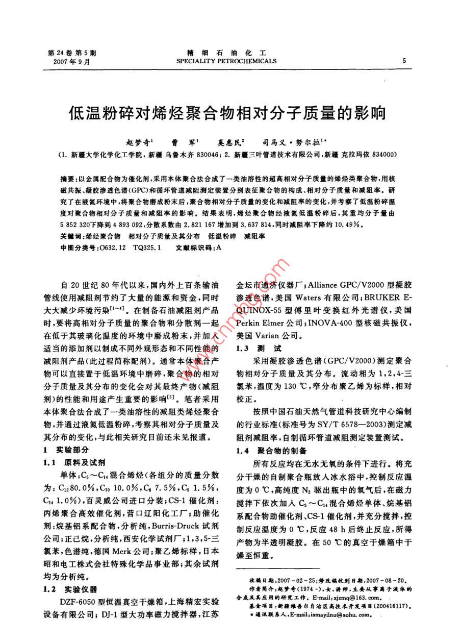 第24卷第5期精細(xì)石油化工2007年9月SPECIALITY PETROCHEMICALS低溫粉碎對(duì)烯烴聚合物相對(duì)分子質(zhì)量的影響趙夢(mèng)奇'曹 軍奚惠民*司馬義●努爾拉'"(1.新疆大學(xué)化學(xué)化工學(xué)院,新疆烏魯木齊830046;2.新疆三葉管道技術(shù)有限公司,新疆克拉瑪依834000)摘要:以金屬配合物為催化劑,采用本體聚合法合成了一類油溶性的超高相對(duì)分子質(zhì)量的烯烴類聚合物,用核磁共振、凝膠滲透色譜(GPC)和循環(huán)管道減阻測(cè)定裝置分別表征聚合物的構(gòu)成、相對(duì)分子質(zhì)量和減阻率。研究了在液氤環(huán)境中,將聚合物磨成粉末后,聚合物相對(duì)分子質(zhì)量的變化和減阻率的變化,并考察了低溫粉碎溫度對(duì)聚合物相對(duì)分子質(zhì)量和減阻率的影響。結(jié)果表明,烯烴聚合物經(jīng)液氮低溫粉碎后,其重均分子量由5 852 320下降到4 893 092 ,分散系數(shù)由2.821 167增加到3. 637 814,同時(shí)減阻率下降約10. 49%.關(guān)鍵詞:烯烴橐合物相對(duì)分子質(zhì)量及其分布 低溫粉碎 臧阻率中圈分類號(hào):0632.12 TQ325. 1文獻(xiàn)標(biāo)識(shí)碼:A自20世紀(jì)80年代以來,國內(nèi)外上百條輸油金壇市通濟(jì)儀器廠;Alliance GPC/V2000型凝膠管線使用減阻劑節(jié)約了大量的能源和資金,同時(shí)滲透色譜,美國Waters有限公司; BRUKER E-大大減少環(huán)境污染[~1]。在制備石油減阻劑產(chǎn)品QUINOX-55型傅里葉變換紅外光譜儀,美國時(shí),要將高相對(duì)分子質(zhì)量的聚合物和分散劑一起Perkin Elmer公司;INOVA-400型核磁共振儀,在低于其玻璃化溫度的環(huán)境中磨成粉末,并加入美國 Varian 公司。適當(dāng)?shù)奶砑觿┮灾瞥刹煌庥^形態(tài)和不同性能的1.3測(cè)試減阻劑產(chǎn)品(此過程簡稱配劑)。通常本體聚合產(chǎn)采用凝膠滲透色譜(GPC/V2000)測(cè)定聚合物可以直接置于低溫環(huán)境中磨碎,聚合物的相對(duì)物相對(duì)分子質(zhì)量及其分布。流動(dòng)相為1,2,4-三分子質(zhì)量及其分布的變化會(huì)對(duì)其最終產(chǎn)物(減阻氯苯,溫度為130 C,窄分布聚乙烯為標(biāo)樣,相對(duì)劑)的性能和用途產(chǎn)生重要的影響[5。筆者采用校正。本體聚合法合成了一類油溶性的減阻類烯烴聚合按照中國石油天然氣管道科技研究中心編制物,并通過液氮低溫粉碎,考察其相對(duì)分子質(zhì)量及的行業(yè)標(biāo)準(zhǔn)(標(biāo)準(zhǔn)號(hào)為SY/T 6578- -2003)測(cè)定減其分布的變化,與此相關(guān)研究目前還未見報(bào)道。阻劑減阻率,自制循環(huán)管道減阻測(cè)定裝置測(cè)試。1實(shí)驗(yàn)部分1.4聚合物的制備1.1原料及 試劑所有反應(yīng)均在無水無氧的條件下進(jìn)行。將充單體:Cs~Cw混合烯烴(各組分的質(zhì)量分?jǐn)?shù)分干燥的自制聚合瓶放入冰水浴中,控制反應(yīng)溫為: Cl280.0%,Co 10. 0%,Cg 7. 5%,Cs 1. 5%,度為0 C,高純度N2驅(qū)出瓶中的氧氣后,在磁力Co 1. 0%),百靈威公司進(jìn)口分裝;CS-1催化劑:攪拌下依次加人C;~C,混合烯烴單體、烷基鋁丙烯聚合高效催化劑,營口遼陽化工廠;助催化系配合物助催化劑、CS-1催化劑,并充分?jǐn)嚢?控劑:烷基鋁系配合物,分析純,Burris-Druck試劑制反應(yīng)溫度為0 C,反應(yīng)48 h后終止反應(yīng),所得公司;正已烷,分析純,西安化學(xué)試劑廠;1,3,5-三產(chǎn)物為半透明凝膠。在50 C的真空干燥箱中干氯苯,色譜純,德國Merk公司;聚乙烯標(biāo)樣,日本燥至恒重.昭和電工株式會(huì)社特殊化學(xué)品事業(yè)部;其余試劑均為分析純。收稿日期:2007 -02-25;修改稿收到日期:2007 -08 -20.1.2實(shí)驗(yàn)儀器作者簡介:趙夢(mèng)寺(1974-),女,講師,主要從事離子液體的.DZF 6050型恒溫真空干燥箱,上海精宏實(shí)驗(yàn)合成及其應(yīng)用的研究工作。E-mail; xjzmq@163. com.,基金項(xiàng)目:新疆雛晉爾自治 區(qū)高技術(shù)開發(fā)項(xiàng)目(200416117).設(shè)備有限公司; DJ-1 型大功率礅力攪拌器,江蘇■通訊聰系人,E-mailrismayilnu@ sohu. com.精細(xì)石油化工2007年9月2結(jié)果與討論由此可見,高相對(duì)分子質(zhì)量聚合物的降解并不僅2.1 聚合物'H NMR僅發(fā)生在湍流狀態(tài)的稀溶液中[6~8],低溫粉碎也圖1為聚合物的'HNMR譜圖(CDCl,為溶同樣使聚合物產(chǎn)生降解,導(dǎo)致相對(duì)分子質(zhì)量下降。劑)。由圖1可知,8=7.21處的峰為溶劑CDCl,oo的峰,在8=0.93~1.26的峰為烷基峰。在雙鍵0Ma700/M480區(qū)無峰,說明單體已完全聚合.H NMR譜圖完全符合烯烴聚合的譜圖特征,可以認(rèn)為該聚合物MM60更是擬合成的聚烯烴類化合物。40賣馬30-20o-/747.2 7.06.8 666.6 62 6.0 5.85.65.4 5.2 5.04.8logM.GPC結(jié)果:M。=1345 064.M。=4893 092;Mp -5598 931,M, =8864 799,M.+1=11 855 026,聚分散度=3.637 814.山圖3粉狀秦合物的GPC譜2.3聚 合物液氨粉碎前后的減阻率分析在測(cè)試前,先將試樣配成質(zhì)量濃度為0. 005圖1聚合物的'H NMR譜2.2聚合物液氨粉碎前后的凝膠色譜分析g/L的正已烷溶液,再用50L試劑油(0#柴油)稀將聚合物試樣在液氮環(huán)境下磨成粉狀(簡稱釋溶液后,注人管路。環(huán)道裝置和交聯(lián)聚合物減粉狀聚合物)。取聚合物約0.0022 g,粉狀聚合阻率的計(jì)算見文獻(xiàn)[9]。普通聚合物減阻率為物約0.002 3 g,分別溶于7.0 mL的1,2,4-三氯38. 90;粉狀聚合物減阻率為34. 82。由此可見,苯溶液中。充分溶解后測(cè)試試樣,結(jié)果如圖2和聚合物經(jīng)過液氮低溫粉