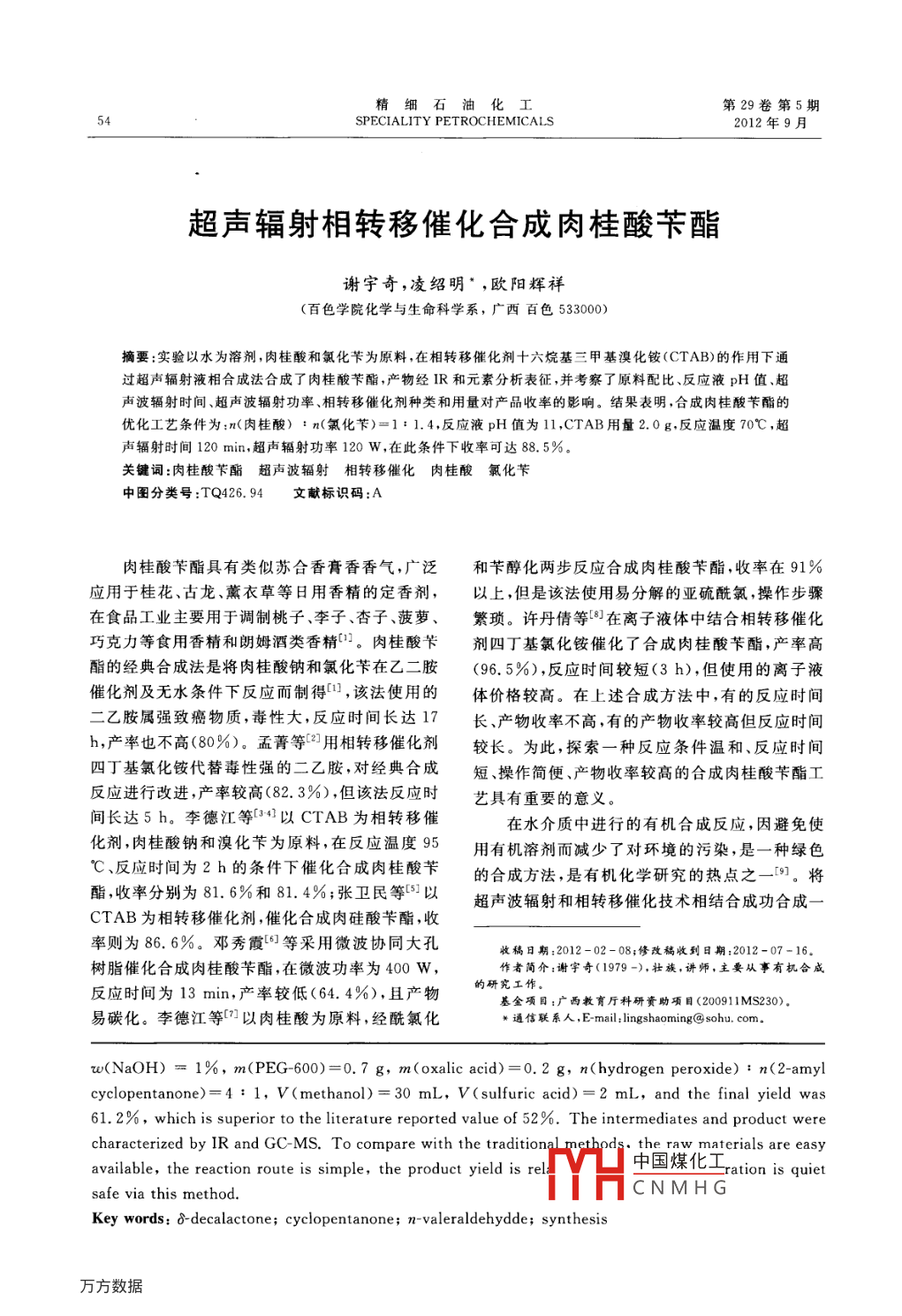 第29卷第5期精細(xì)石油化工2012年9月SPECIALITY PETROCHEMICALS51δ-癸內(nèi)酯的合成卜佳,李廣學(xué)“,趙明珠,李家鳴,姜豐,詹華露,褚楊(安徽理工大學(xué)化學(xué)工程學(xué)院,安徽淮南232001)摘要:以環(huán)戊酮和正戊醛為起始原料,經(jīng)羥醛縮合、選擇性催化加氫、氧化重排制得8熒內(nèi)酯。通過(guò)正交實(shí)驗(yàn),得出最佳工藝條件:w (NaOH)= 1% ,PEG-600用量0.7 g,草酸用量0.2 g,n(雙氧水) : m(2-戊基環(huán)戊酮)=4: 1,甲醇用量30 ml,硫酸用量2 mL,反應(yīng)收率為61. 2%。采用紅外光譜對(duì)產(chǎn)物結(jié)構(gòu)進(jìn)行了表征。關(guān)鍵詞:8癸內(nèi)酯環(huán)戊酮正戊醛合成中圖分類(lèi)號(hào):TQ031.2文獻(xiàn)標(biāo)識(shí)碼:Aδ-癸內(nèi)酯為無(wú)色或淺黃色液體,具有非常強(qiáng)0.7 g聚乙二醇-600加到三口燒瓶?jī)?nèi),升溫至30烈的甜奶油和堅(jiān)果型香氣、很濃的花香底香,廣泛C,滴加19.8 g環(huán)戊酮,約30 min加完。反應(yīng)顏用于生產(chǎn)食用香精、軟飲料、冰激凌、糖果、牛奶、色慢慢由無(wú)色變?yōu)榻埸S色。并于30 °C攪拌下緩奶制品、餅干、調(diào)味品和烘烤食品等[:2]。慢滴加正戊醛11 g,約1.5 h滴加完畢,反應(yīng)顏δ癸內(nèi)酯的合成主要有兩種途徑:1)先合成色由桔黃色變?yōu)樽丶t色,滴加完畢后保持溫度30δ-羥基酸,然后酯化閉環(huán)得δ-內(nèi)酯C34]。該法起始°C,攪拌反應(yīng)2 h。冷卻,加人36%冰乙酸調(diào)節(jié)原料來(lái)源困難,反應(yīng)路線(xiàn)長(zhǎng),總收率低,很難實(shí)現(xiàn)pH值為6~7。在分液漏斗中靜置分層。無(wú)機(jī)層工業(yè)化生產(chǎn)([5。2)先合成2-戊基環(huán)戊酮中間體,加入甲苯萃取,分層,上層為甲苯層,下層為廢水然后經(jīng)貝椰爾-魏立格(Baeyer-Villiger)氧化得到層。將有機(jī)層與甲苯層合并,加入帶分水器的燒8-內(nèi)酯06]。該法副產(chǎn)物是8-癸內(nèi)酯的異構(gòu)體,很瓶中,加草酸0.2 g,加熱攪拌至不再有水分出時(shí),難除去,反應(yīng)條件苛刻”。另外,BaeyerVilliger結(jié)束反應(yīng),冷卻,用飽和食鹽水和5%NaHCO3洗氧化法的傳統(tǒng)氧化劑為過(guò)硫酸鉀或過(guò)氧乙酸,但滌,常壓蒸餾出甲苯,剩余物在98~100 C/400由于安全性不高,副產(chǎn)物δ羥基酸比較多,產(chǎn)率不Pa蒸餾得黃色溶液2-戊烯環(huán)戊酮。經(jīng)GC-MS分高,已很少使用。用H2O2作氧化劑,其副產(chǎn)物是析,收率約86.3%。水,不污染環(huán)境,且安全、廉價(jià),產(chǎn)物潔凈。但是1.2.2 2-戊基環(huán)戊酮的合成H2O2的活性相對(duì)過(guò)氧酸較弱,使用時(shí)一般得添在N2氣氛的反應(yīng)器中加入5 g 2-戊烯環(huán)戊加催化劑提供反應(yīng)活性,因此,開(kāi)發(fā)一些相應(yīng)的高酮,0.2 g 5%鈀/碳催化劑和40 mL無(wú)水乙醇。效催化劑就顯得尤為重要[8]。密閉后先用N2對(duì)裝置進(jìn)行洗氣處理,保證裝置1實(shí)驗(yàn)內(nèi)不含其他氣體。然后常壓通入H2,控制溫度1.1原料和儀器50C,約20h反應(yīng)完畢。前幾次加氫速度較快,環(huán)戊酮,AR,上海晶純?cè)噭┯邢薰?正戊當(dāng)不再吸氫時(shí),濾去反應(yīng)物中的催化劑,用無(wú)水乙醛,AR,上海晶純?cè)噭┯邢薰?雙氧水(30%),醇沖洗催化劑備用。旋轉(zhuǎn)蒸發(fā)無(wú)水乙醇,減壓蒸AR,蚌埠化學(xué)試劑廠。餾,收集82~83C/266Pa餾分,得淡黃色溶液.VECTOR33型傅里葉變換紅外光譜儀,德國(guó).2-戊基環(huán)戊酮。經(jīng)GC-MS分析,收率約91. 5%。布魯克公司;QP-5OSOA氣質(zhì)聯(lián)用儀,日本島津公司。收稿日期,2012-04-10.修陪魏嶼刮日期:2012 -08 -30.1.2實(shí)驗(yàn)步驟作者簡(jiǎn)介中國(guó)煤化工方向?yàn)榫?xì)化工。E-mail:jbu@1.2.1 2-戊 烯環(huán)戊酮的合成基金項(xiàng)YHCNMHC:2010-淮南-13).將25mL質(zhì)量分?jǐn)?shù)為1%的NaOH溶液和#通信聯(lián)系人,E-mail: gxli@aust. edu. cn。52精細(xì)石油化工2012年9月1.2.3 8-癸 內(nèi)酯的合成2.1.3正交實(shí)驗(yàn)在裝有冷凝管,溫度計(jì),磁力攪拌器的三口燒在30C下反應(yīng),對(duì)堿質(zhì)量分?jǐn)?shù)、相轉(zhuǎn)移催化瓶中加入2-戍基環(huán)戊酮10 g.30 mL甲醇,濃硫劑及其用量、酸催化劑用量進(jìn)行了Lg(3* )的正交酸2 mL,加熱攪拌至50 C,滴加32 g(約2.5 h)實(shí)驗(yàn),優(yōu)化所得的反應(yīng)條件是堿質(zhì)量分?jǐn)?shù)1%,相H2O2,滴加完成后,于恒溫50 C攪拌反應(yīng)1.5 h,轉(zhuǎn)移催化劑是聚乙二醇-600,其用量為0.7 g,酸靜置,無(wú)機(jī)層加入10 mL甲苯多次萃取,有機(jī)層催化劑用量為0.2g。用5%NaHCO3溶液洗滌至pH值為7~8,再用00 r10 mL飽和食鹽水多次洗滌。將有機(jī)層減壓蒸90餾,收集118~120 C餾分,得8癸內(nèi)酯。經(jīng)GC-80 t70 tMS分析,收率為61. 2%。60 F2結(jié)果與討論502.1 2-戊 烯環(huán)戊酮的合成條件40 t2.1.1溫 度對(duì)反應(yīng)的影響30固定環(huán)戊酮19.8 g,正戊醛11 g和一定量的1.4:1 1.6:1 1.8:12:相轉(zhuǎn)移催化劑,25mL質(zhì)量分?jǐn)?shù)為1%的NaOH投料比,圖2 n(環(huán)戊酮) : n(正戊醛)對(duì)反應(yīng)的影響溶液,改變體系溫度,考察溫度對(duì)反應(yīng)的影響,反2.2 δ-癸內(nèi)酯的合 成條件.應(yīng)結(jié)果見(jiàn)圖1。2.2.1溫度對(duì)反應(yīng)的影響氧化反應(yīng)是個(gè)放熱反應(yīng),控制適當(dāng)?shù)姆磻?yīng)溫度,以維持合理的氧化反應(yīng)速度和避免雙氧水熱不穩(wěn)定行為11。因此必須選擇一個(gè)合適的反應(y