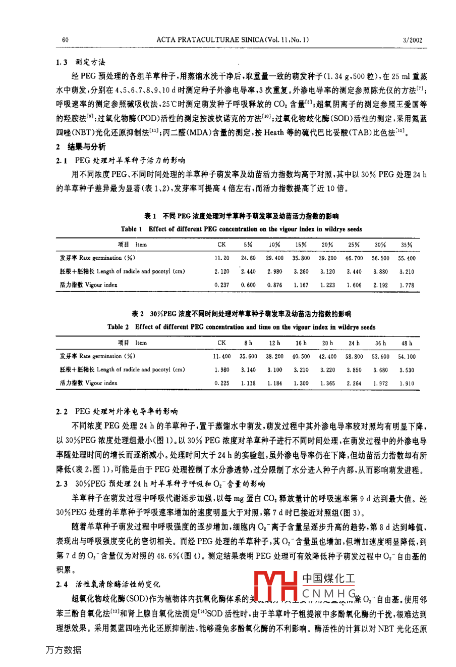 第!1卷第1期Val11.N.1mACTA PRATALLfUKAE SINICA8/2002聚乙二醇處理對(duì)羊草種子萌發(fā)及活性氧代謝的影響劉杰,劉公社" ,齊冬梅,李芳芳,汪恩華(中國(guó)科學(xué)院櫝物研究所.北京11093)摘要:應(yīng)用聚乙二醇(PEG 600)引發(fā)法探討了不同引發(fā)滲透處理時(shí)間處理對(duì)羊草種子萌發(fā)及活力的影響,結(jié)果表明:以30% PEG處理羊草種千24 h.能顯著提高羊草種子發(fā)芽率和幼苗活力降低萌發(fā)過(guò)程中的外滲電導(dǎo)率。在羊草種子萌發(fā)期間,經(jīng)PEG處理的羊草種子.呼吸速率初始低千對(duì)照,之后迅速增加;超氧負(fù)離子(O2- )濃度明顯降低.超氧化物歧化酶(SOD)相過(guò)氧化物酶(PO0D)的活性均顯著增加:脂質(zhì)過(guò)氧化產(chǎn)物內(nèi)二醛(MDA)的積累最明顯低于對(duì)照。經(jīng)PEG引發(fā)引起的羊草種子活力升高與體內(nèi)活性氧代謝的變化存在著定的內(nèi)在聯(lián)系。關(guān)鍵詞:聚乙二醇(PEG);活力指數(shù);活性氧代謝;羊草種子中圍分類號(hào):S543.903.7文獻(xiàn)標(biāo)識(shí)碼:A .文章編號(hào):1004- 5759<2002)01 0059-06羊草又稱堿草(Leymus chinensis) ,是禾本科牧草之王,我國(guó)約占世界羊草總面積的一半,主要分布 于東北平原、內(nèi)蒙古高原的東部和中部、華北北部山區(qū)、黃t高原。羊草具有蛋白含量高、適口性好、適應(yīng)性強(qiáng)、產(chǎn)草量高等特點(diǎn),牛、羊均喜食,素有“牧草中的細(xì)糧”之稱1。羊草草地是優(yōu)良的天然放牧地和割草地,在目前北方草原改良和人工草地建設(shè)中.已成為大面積種植的主要優(yōu)良牧草,在當(dāng)前發(fā)展草原畜牧業(yè)、改善西部生態(tài)環(huán)境等方面具有舉足輕重的地位。因此,加大科研投入,采用生物技術(shù)手段全方位開(kāi)展對(duì)羊草的科學(xué)研究,已引起政府和越來(lái)越多研究者的關(guān)注(2.2]。由于羊草的人工馴化時(shí)間較短,野生性較強(qiáng),使得羊草的結(jié)實(shí)率、發(fā)芽率、產(chǎn)草量偏低的“三低”問(wèn)題長(zhǎng)期得不到很好地解決,成為限制草原改良和人工草地建設(shè)的“瓶頸”。近年來(lái),雖有一些研究報(bào)道了對(duì)羊草種子休眠機(jī)理及種子發(fā)芽特性釣探討15.6.但仍缺E近-步的研究資料。本試驗(yàn)采用滲透調(diào)節(jié)劑聚乙二醇PEG-6000引發(fā)羊草種子,測(cè)定種子萌發(fā)過(guò)程中過(guò)氧陰離子(O2-)的含量、脂質(zhì)過(guò)氧化物產(chǎn)物丙二醛(MDA)的積累,分析膜透性及有關(guān)活性氧清除酶的變化,對(duì)在滲透調(diào)節(jié)作用下羊草種子萌發(fā)過(guò)程中括性氧代謝與其相關(guān)酶類的活性和幼苗活力之間的內(nèi)在聯(lián)系進(jìn)行了初步研究,旨在闡明PEG引發(fā)對(duì)促進(jìn)羊草種子萌發(fā)和活力的效應(yīng),為解決羊草“三低”難題提供理論依據(jù)。1材料與方法1.]試驗(yàn)材料供試羊草種子1998 年采自中科院內(nèi)蒙古多倫縣草原站。1.2滲 透處理配制5%、10%、15%、20%、25%、30%和35%的PEG-6000浸潤(rùn)種子,置于14 C培養(yǎng)箱中避光處理10 h后,用蒸餾水沖洗3~4次,置于濾紙上10 min,自然風(fēng)千。然后將羊草種子置于培養(yǎng)皿濾紙上,放入培養(yǎng)箱中20/30 C變溫(8 h高溫,16h低溫>黑暗條件下萌發(fā),萌發(fā)過(guò)程中保持水分。每組200粒種子,3個(gè)重復(fù)。逐日觀察統(tǒng)計(jì)發(fā)芽情況。10d后檢測(cè)幼苗活力指數(shù)[幼苗活力指數(shù)=(胚根長(zhǎng)+下胚軸長(zhǎng))X發(fā)芽率]。根據(jù)最高活力指數(shù)的PEG濃度對(duì)羊草種子進(jìn)行3.12.16.20.24.36、48 h的浸潤(rùn)處理,篩選出24 h處理時(shí)間與30% PEG-6000滲透引發(fā)為最佳處理?xiàng)l件。再用30%PEG-6000處理羊草種子24 h后,進(jìn)行萌發(fā)實(shí)驗(yàn),分別取萌發(fā)4d.5d、6d.7d、中國(guó)煤化工8d.9d、10d的幼苗為材料,進(jìn)行下一步的生理生化指標(biāo)的測(cè)定。MHCNMHG收稿日期:200 07-03作者簡(jiǎn)介:劉杰(1963-).男、河北來(lái)定人,博士,副研究員。*通迅作者50ACTA PRATACULTURAE SINICA(Vol. 11,No. 1)3/20021.3測(cè)定方法經(jīng)PEG預(yù)處理的各組羊草種子,用蒸餾水洗干凈后,取重量-致的萌發(fā)種子(1. 34 g.500粒),在25 ml重蒸水中萌發(fā),分別在4.5.6.7.8.9、10 d時(shí)測(cè)定種子外滲電導(dǎo)串,3次重復(fù)。外滲電導(dǎo)率的測(cè)定參照陳光儀的方法[”;呼吸速率的測(cè)定參照堿吸收法,25C時(shí)測(cè)定萌發(fā)種子呼吸釋放的CO,含量f°8];超氧陰離子的測(cè)定參照王愛(ài)國(guó)等.的羥胺法[";過(guò)氧化物酶(POD)活性的測(cè)定按波欽諾克的方法[0];過(guò)氧化物歧化酶(SOD)活性的測(cè)定,采用氮藍(lán)四唑(NBT)光化還原抑制法"”;丙二醛(MDA)含量的測(cè)定,按Heath 等的硫代巴比妥酸(TAB)比色法”。2結(jié)果與分析2.1 PEG 處理對(duì)羊草種子活力的影響用不同濃度PEG、不同時(shí)間處理的羊草種子萌發(fā)率及幼苗活力指數(shù)均高于對(duì)照,其中以30%PEG處理24h的羊草種子差異最為顯著(表1、2),發(fā)芽率可提高4倍左右,而活力指數(shù)提高了近10倍。表1不同PEG濃度處理對(duì)羊草種子萌發(fā)率及幼苗活力指數(shù)的影響Table 1 Effect of difterent PEG concentration on the vigour index in wildrye seeds項(xiàng)目ltemCK10% 15%20%25%30%35%發(fā)芽率Rate gerninatioa (%)11.20 24. 6029.400 35.800 39.200
