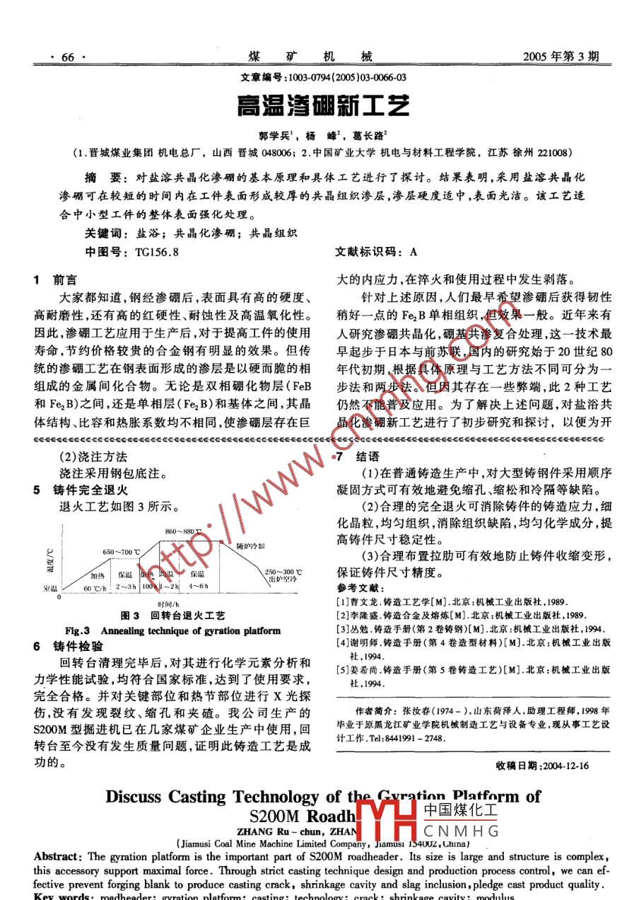 2005年第3期文章編號(hào):10030794(2005)03-006603高溫硎新工藝郭學(xué)兵,楊峰2,葛長路(1.晉城煤業(yè)集團(tuán)機(jī)電總廠,山西晉城048006;2.中國礦業(yè)大學(xué)機(jī)電與材料工程學(xué)院,江蘇徐州221008)摘要:對(duì)鹽溶共晶化滲硼的基本原理和具體工藝進(jìn)行了探討。結(jié)果表明,采用鹽溶共晶化滲硼可在較短的時(shí)間內(nèi)在工件表面形成較厚的共晶組織滲層,滲層硬度適中,表面光潔。該工藝適合中小型工件的整體表面強(qiáng)化處理。組織關(guān)鍵詞:鹽浴;共晶化滲硼;共晶中圖號(hào):TG156文獻(xiàn)標(biāo)識(shí)碼:A1前言大的內(nèi)應(yīng)力,在淬火和使用過程中發(fā)生剝落。大家都知道,鋼經(jīng)滲硼后,表面具有高的硬度、針對(duì)上述原因,人們最早希望滲硼后獲得韌性高耐磨性,還有高的紅硬性、耐蝕性及高溫氧化性。稍好一點(diǎn)的Fe2B單相組織,但效果一般。近年來有因此,滲硼工藝應(yīng)用于生產(chǎn)后,對(duì)于提高工件的使用研究滲硼共晶化,硼基共滲復(fù)合處理,這一技術(shù)最壽命,節(jié)約價(jià)格較貴的合金鋼有明顯的效果。但傳早起步于日本與前蘇聯(lián),國內(nèi)的研究始于20世紀(jì)80統(tǒng)的滲硼工藝在鋼表面形成的滲層是以硬而脆的相年代初期,根據(jù)具體原理與工藝方法不同可分為組成的金屬間化合物。無論是雙相硼化物層(FeB步法和兩步法。但因其存在一些弊端,此2種工藝和Fe2B)之間,還是單相層(Fe2B)和基體之間,其晶仍然不能普及應(yīng)用。為了解決上述問題,對(duì)鹽浴共體結(jié)構(gòu)、比容和熱脹系數(shù)均不相同,使?jié)B硼層存在巨晶化滲硼新工藝進(jìn)行了初步研究和探討,以便為開∈∈∈∈ CCCC5CCCCEEC《c《cccG《《《《c∈《∈∈∈∈∈cc∈∈∈∈∈c∈∈∈∈∈E∈G∈∈∈∈∈仁c仁c∈∈∈∈c《∈∈《c∈eee(2)澆注方法7結(jié)語澆注采用鋼包底注。(1)在普通鑄造生產(chǎn)中,對(duì)大型鑄鋼件采用順序5鑄件完全退火凝固方式可有效地避免縮孔、縮松和冷隔等缺陷。退火工藝如圖3所示。(2)合理的完全退火可消除鑄件的鑄造應(yīng)力,細(xì)化晶粒,均勻組織,消除組織缺陷,均勻化學(xué)成分,提86088℃爐冷卻高鑄件尺寸穩(wěn)定性。650~700℃(3)合理布置拉肋可有效地防止鑄件收縮變形,熱保溫?zé)岜WC鑄件尺寸精度60ch22310-24-6參考文獻(xiàn)時(shí)間/[1]曹文龍鑄造工藝學(xué)[M].北京:機(jī)械工業(yè)出版社,1989圖3回轉(zhuǎn)臺(tái)退火工藝[2]李隆盛鑄造合金及熔煉[M]北京:機(jī)械工業(yè)出版社,1989Fig. 3 Annealing technique of gyration platform[3]叢勉鑄造手冊(cè)(第2卷鑄鋼)M].北京:機(jī)械工業(yè)出版社,19946鑄件檢驗(yàn)[4]謝明師鑄造手冊(cè)(第4卷造型材料)[M].北京:機(jī)械工業(yè)出版回轉(zhuǎn)臺(tái)清理完畢后,對(duì)其進(jìn)行化學(xué)元素分析和社,1994[5]姜希尚,鑄造手冊(cè)(第5卷鑄造工藝)[M],北京:機(jī)械工業(yè)出力學(xué)性能試驗(yàn),均符合國家標(biāo)準(zhǔn),達(dá)到了使用要求,完全合格。并對(duì)關(guān)鍵部位和熱節(jié)部位進(jìn)行X光探傷,沒有發(fā)現(xiàn)裂紋、縮孔和夾碴。我公司生產(chǎn)的作者簡介:張汝春(1974-),山東荷澤人,助理工程師,1998年S00M型掘進(jìn)機(jī)已在幾家煤礦企業(yè)生產(chǎn)中使用,回畢業(yè)于原黑龍江礦業(yè)學(xué)院機(jī)械制造工藝與設(shè)備專業(yè),現(xiàn)從事工藝設(shè)轉(zhuǎn)臺(tái)至今沒有發(fā)生質(zhì)量問題,證明此鑄造工藝是成計(jì)工作Tel:8441991-2748功的。收稿日期:20041216Discuss Casting Technology of the gyration platform ofS200M Roadhl中國煤化工ZHANG RU-chun. ZHANCNMHG(Jiamusi Coal Mine Machine Limited Company, Jiamusi 134UUZ, ChinaAbstract: The gyration platform is the important part of S200M roadheader. Its size is large and structure is complex,his accessory support maximal force. Through strict casting technique design and production process control, we can effective prevent forging blank to produce casting crack, shrinkage cavity and slag inclusion, pledge cast product qualityKey words: roadheader; gyration platform; casting: technology crack; shrinkage cavity modulus2005年第3期高溫滲硼新工藝—郭學(xué)兵,等67拓滲硼新領(lǐng)域打下基礎(chǔ)。(1)試驗(yàn)準(zhǔn)備2試驗(yàn)原理及方法①將所有試樣表面磨平;②高能球磨機(jī)將碳化2.1試驗(yàn)原理硼研磨成細(xì)粉末,再用稀釋的水玻璃將其配成濃液在本試驗(yàn)中,采用B4C作為滲硼劑,B4C與鐵直成膠水狀,將碳化硼液用毛筆涂敷在試樣表面,一般接反應(yīng),二者的反映方程式大概有以下幾種:要涂0.5mm厚,并將涂好的試樣放在溫度為400℃B.C+4Fe= 4FeB +C(1)的電熱干燥箱內(nèi)烘干3~4h;③選擇一段ψ4mmxB.C+8Fe= 4Fe,B+C(2)10mm×100m的鋼管,其一端用一塊厚10mm的B.C+7Fe= 4FeB+ Fe, C(3)鋼板焊上,制備成金屬坩堝。B4C+llFe= 4Fe,B+ FeC(4)(2)試驗(yàn)過程①將裝有足量BaCl2的坩堝放入1600℃快速但上述反應(yīng)為弱放熱反應(yīng),反應(yīng)放出的熱童不足以升溫箱式電爐內(nèi),設(shè)計(jì)好升溫程序,打開電源,升溫維持反應(yīng)進(jìn)行,只要提高反應(yīng)的溫度就可以促使反至160℃,將3組45號(hào)鋼分別放入坩堝內(nèi),在熔鹽應(yīng)進(jìn)行。如果BC和足量的Fe反應(yīng),則反應(yīng)方程式內(nèi)加熱5min、10min、15mn:20mn、30mn后取出以式(4)為主。空冷;在高溫鹽浴中,試樣表面通過固-固反應(yīng),首
