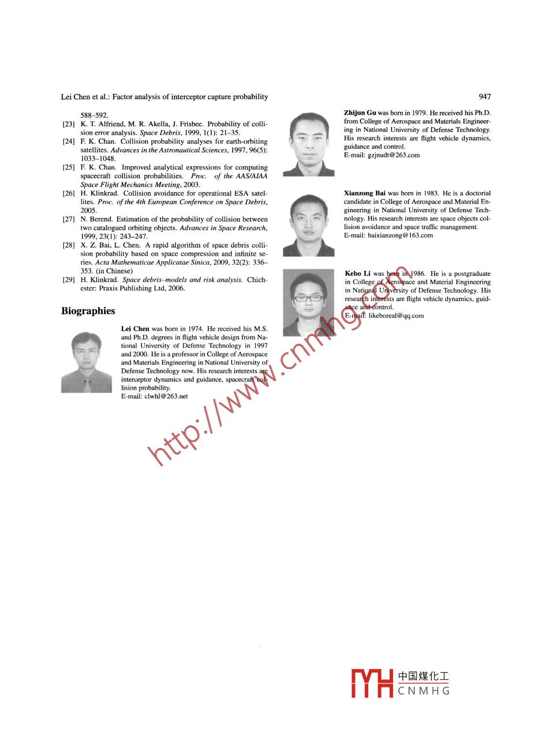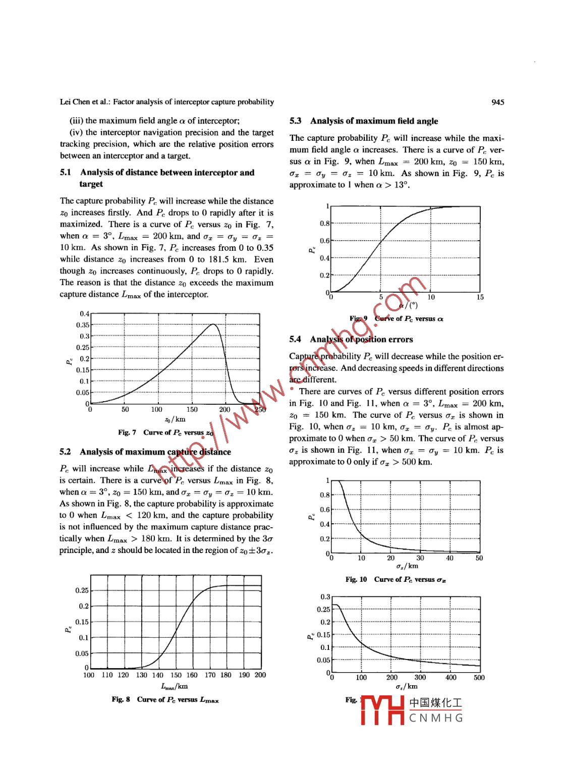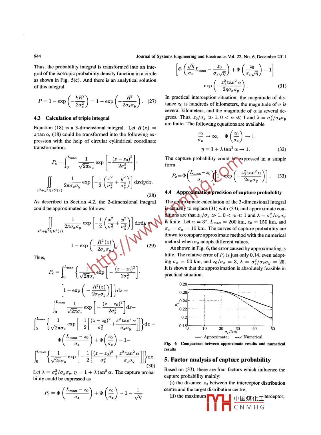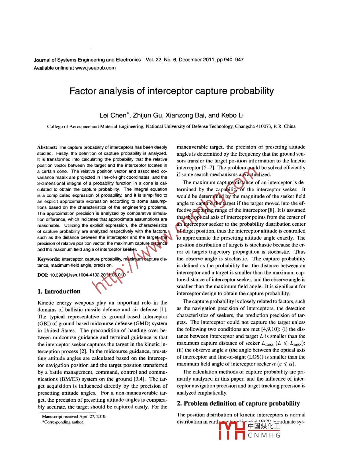 Journal of Systems Engineering and Electronics Vol. 22, No.6, December 2011, pp.940- -947Available online at www.jseepub.comFactor analysis of interceptor capture probabilityLei Chen*, Zhijun Gu, Xianzong Bai, and Kebo LiCollege of Aerospace and Material Engineering, National University of Defense Technology, Changsha 410073, P. R. ChinaAbstract: The capture probability of interceptors has been deeplymaneuverable target, the precision of presetting attitudestudied. Firsty, the definition of capture probability is analyzed.angles is determined by the frequency that the ground sen-It is transformed into calculating the probability that the relativesors transfer the target position information to the kineticposition vector between the target and the interceptor locates ininterceptor [5- -7]. The problem could be solved efficientlya certain cone. The relative position vector and associated CO-if some search mechanisms are actualized. .variance matrix are projected in line-of-sight coordinates, and the3-dimensional integral of a probability function in a cone is cal-The maximum capture distance of an interceptor is de-culated to obtain the capture probability. The integral equationtermined by the capability of the interceptor seeker. Itis a complicated expression of probability, and it is simlified towould be determined by the magnitude of the seeker fieldan explicit approximate expression according to some assump-angle to capture the target if the target moved into the ef-tions based on the characteristics of the engineering problems.fective capturing range of the intercepto [8]. It is assumedThe approximation precision is analyzed by comparative simula-tion difference, which indicates that approximate assumptions arethat the optical axis of interceptor points from the center ofreasonable. Utilzing the explicit expression, the characteristicsan interceptor seeker to the probability distribution centerof capure probablity are analyzed respectively with the factors, of taret position, thus the interceptor altitude is controlledsuch as the distance between the interceptor and the target, theto approximate the presetting attitude angle exactly. Theprecision of relative position vector, the maximum capture distanceposition distribution of targets is stochastic because the er-and the maximum field angle of interceptor seeker.ror of targets trajectory propagation is stochastic. ThusKeywords: intereptor, capture probablity, maximum capture dis- the observe angle is stochastic. The capure probabilitytance, maximum field angle, precision.is defined as the probability that the distance between anDOI: 10.3969./issn.1004 4132 2011.06.010interceptor and a target is smaller than the maximum cap-ture distance of interceptor seeker, and the observe angle issmaller than the maximum field angle. It is significant for1. Introductioninterceptor design to obtain the capture probability.Kinetic energy weapons play an important role in thdomains of bllistic missile defense and air defense [1]. as the navigation precision of interceptors, the detectionThe typical representative is ground-based interceptorcharacteristics of seekers, the prediction precision of tar-(GBI) of ground-based midcourse defense (GMD) systemgets. The interceptor could not capture the target unlessin United States. The precondition of handing over be-the following two conditions are met [4,9,10]: () the dis-tween midcourse guidance and terminal guidance is thattance between interceptor and target L is smaller than thethe interceptor seeker captures the target in the kinetic in-maximum capture distance of seeker Lmax (L≤Lmax);terception process [2]. In the midcourse guidance, preset-(i) the observe angle E (the angle between the optical axisting attitude angles are calculated based on the intercep-of interceptor and line-of -sight (LOS)) is smaller than thetor navigation position and the target position transferredmaximum field angle of interceptor seekera(e≤a).by a battle management, command, control and commu-The calculation methods of capture probability are pri-nications (BM/C3) system on the ground [3,4]. The tar-marily analyzed in this paper, and the influence of inter-get acquisition is infuenced directly by the precision of ceptor navigation precision and target tracking precision ispresetting attitude angles. For a non-maneuverable tar-analyzed emphatically.get, the precision of presetting attitude angles is compara-2. Problem definition of capture probabilitybly accurate, the target should be captured easily. For theManuscript reeved April 27, 2010.The position distribution of kinetic interceptors is normal*Corresponding author.distribution in earth中國煤化工THCNMH G .Lei Chen et al: Factor analysis of interceptor capture probability .941tem, so it is the distribution of targets. The position vec-Thus the probability density function of the relative posi-tor of the interceptor distribution centre is marked as rv0, tion vector could be expressed asthe covariance matrix of position errors is marked as Po,the position vector of the target distribution centre is rtof(r) =(V2x)°|P|/2°and the covariance matrix of the position error the is Pas shown in Fig.1. The direction of LOS is defined topoint from the centre of an interceptor to the centre of tar-exp[如-n)"P-'(-則.(5)get position distribution, and the direction vector of LOSisro= rto - ro. It would be confirmned that the intercep-The capture probability Pc could be expressed astor captures the target if such conditions are met that thereal observe angle Eε between the real relative position vec-Po= f[(√2n)°pP1/2"torr = rt - r。and the LOS direction is smaller than thegiven field angle a, and the real relative distance L = |川|is smaller than the maximum capture distance of seekerexp|-2(r-ro)T P-1(r-ro)| ds2.6)Lmax.TargetAs shown in Fig. 2, a joint error elipsoid is obtained bysynthesizing the position errors of interceptor and target.一PThe calculation of capture pr