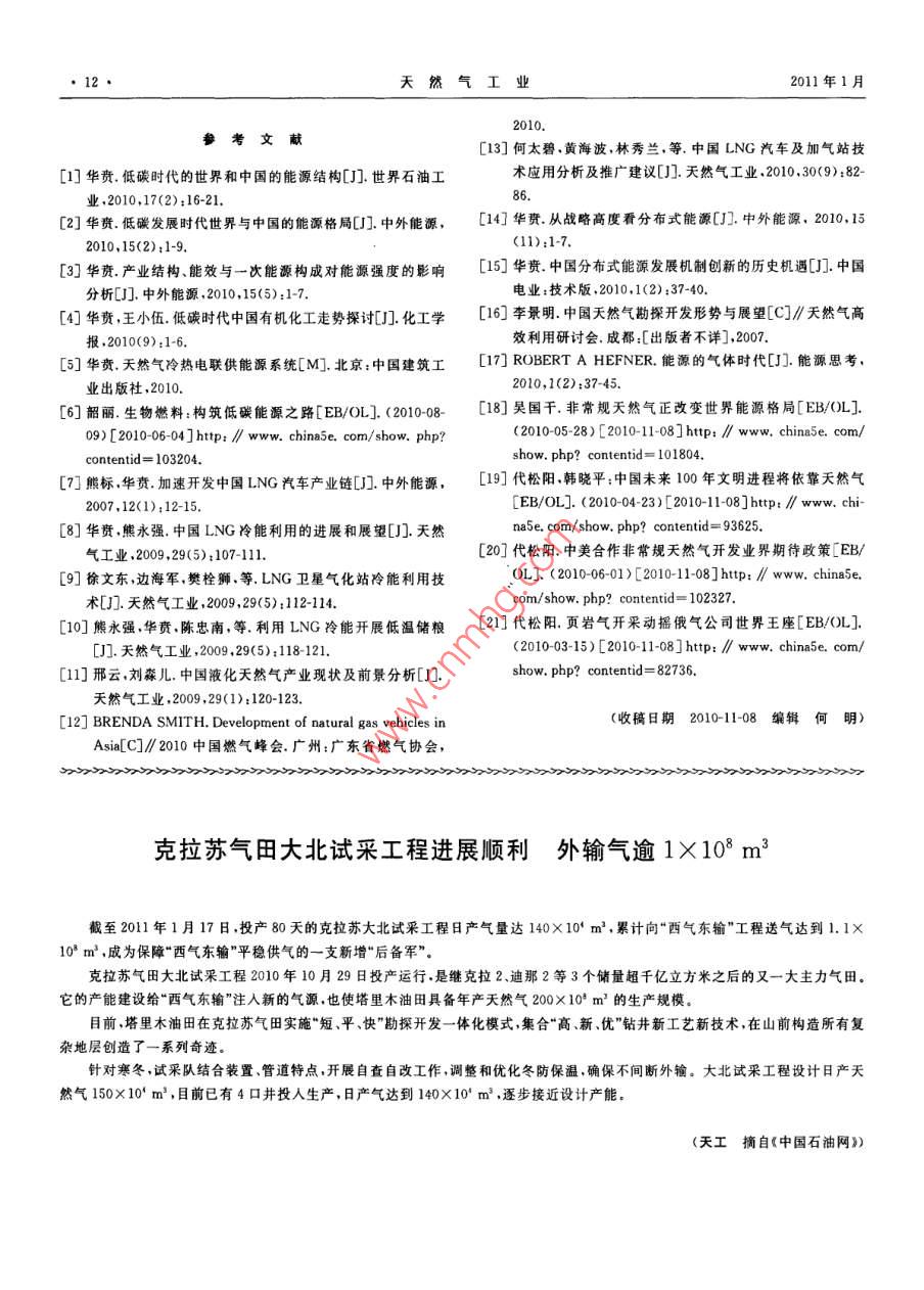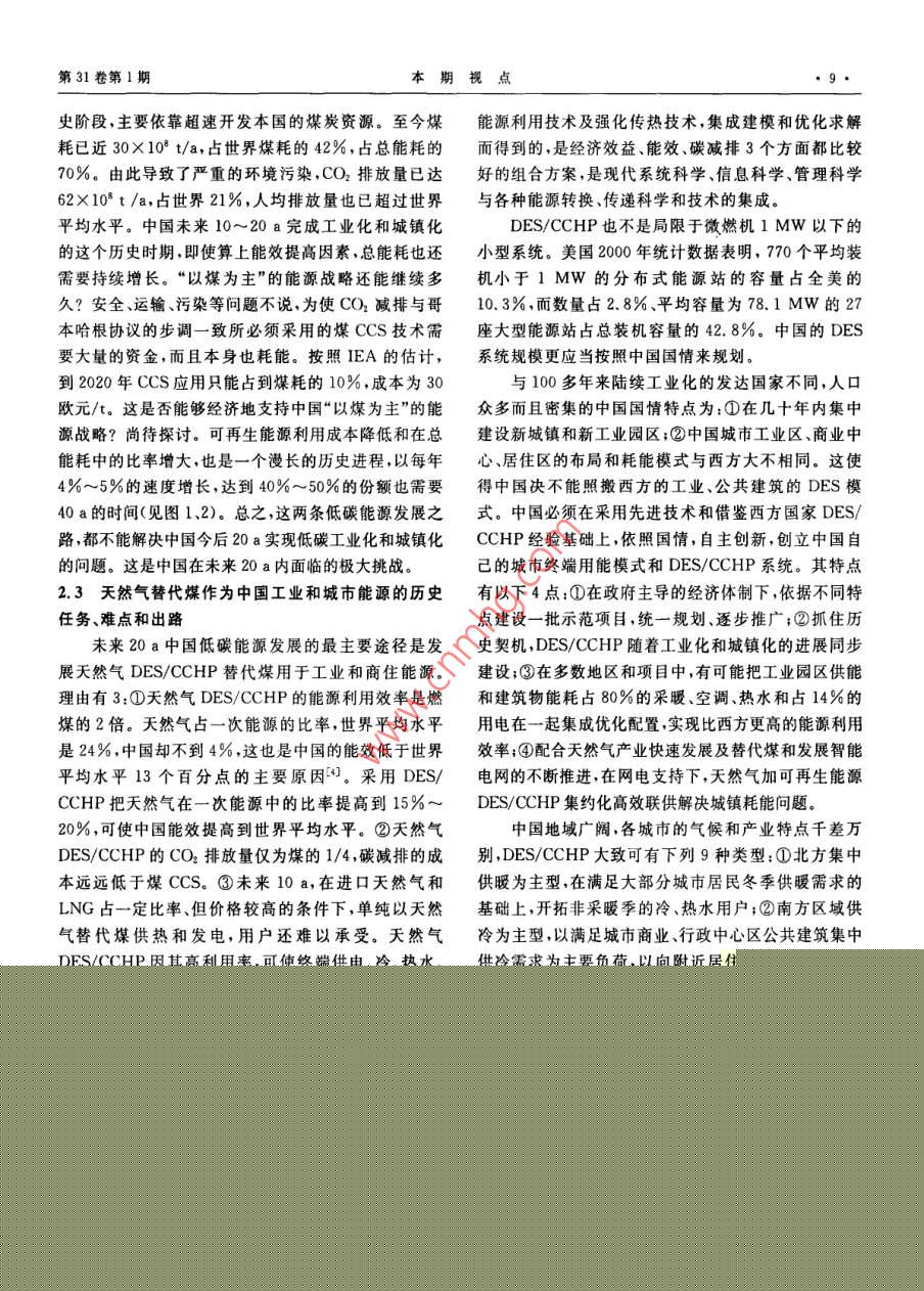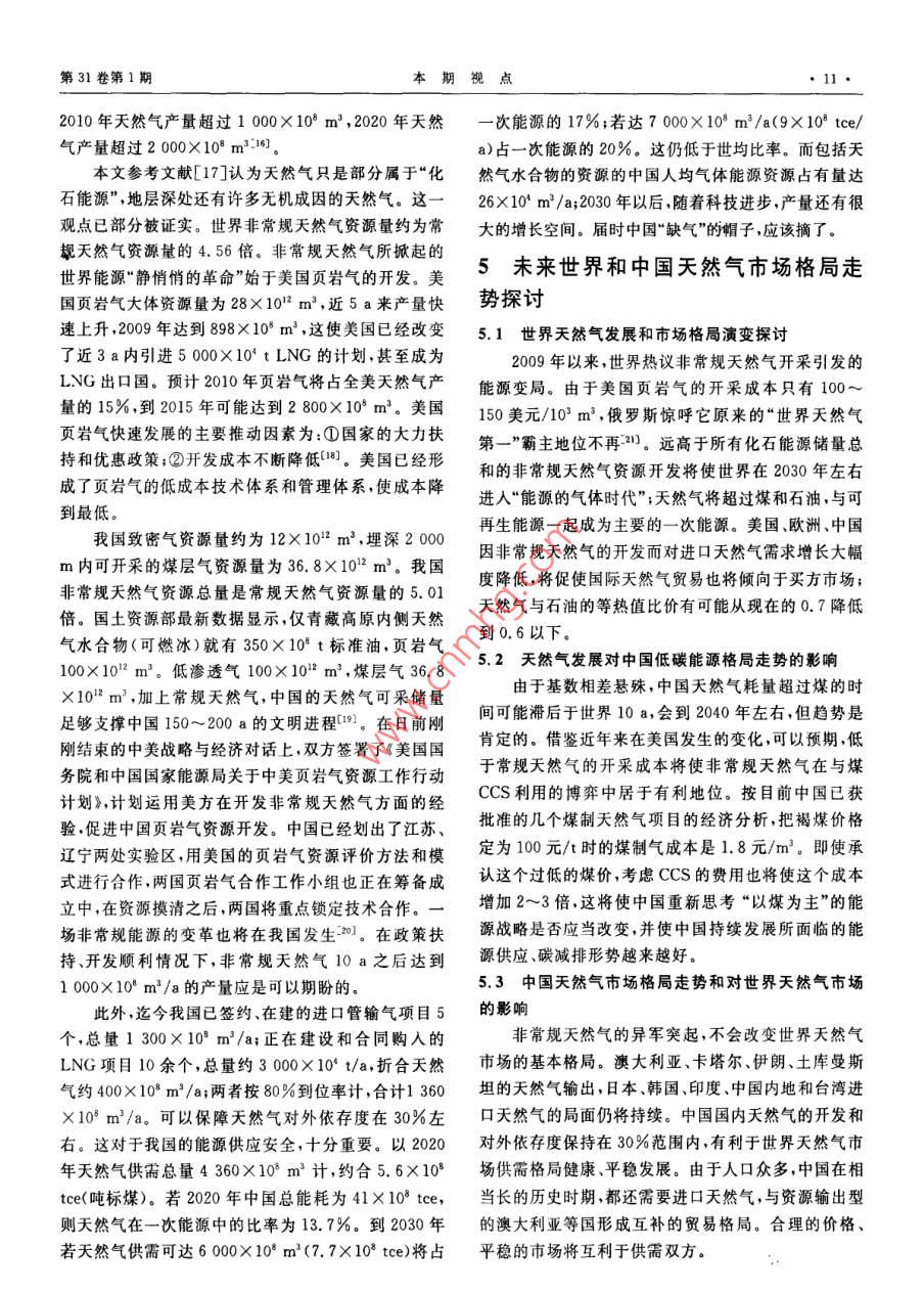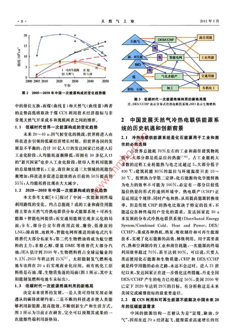 第31卷第1期本期視點中國低碳能源格局中的天然氣華賁華南理工大學(xué)天然氣利用研究中心華責(zé).中國低碳能源格局中的天然氣,天然氣工業(yè),2011,31(1):7-12摘要2009年底的哥本昏根會議開啟了世界走向低碳能源的新時代。為此,分析了低碳時代世界及中國一次能源構(gòu)成的變化情況,結(jié)論指出:在控制溫升不超過2℃的情況下,要求把能源消耗產(chǎn)生的CO2控制在100×10v/a,這將導(dǎo)致目前石油、煤、天然氣、核能與可再生能源在總能耗構(gòu)成中的比率逆轉(zhuǎn)和終端用能模式巨變,2020-—2050年中國天然氣將在工業(yè)燃料、商住和民用能源、調(diào)峰發(fā)電、交通幾大領(lǐng)域占據(jù)主導(dǎo)或重要地位,并將在冷熱電聯(lián)供分布式能源系統(tǒng)、CNG汽車和LNG汽車技術(shù)領(lǐng)域自主創(chuàng)新,領(lǐng)先于世界;中國非常規(guī)天然氣資源豐富、開發(fā)前景看好,自給率可達(dá)70%;2020-2030年中國天然氣消費規(guī)模將達(dá)到(4000-6000103m3/a,將對世界天然氣市場發(fā)生積極、正面的影嘲關(guān)鍵詞低碳能源格局中國天然氣冷熱電聯(lián)供LNG汽車市場規(guī)模資源和供應(yīng)保障DO:10.3787/.isn.1000976.2011.01.002工業(yè)化以來的150a間,地表大氣中CO的濃度1低碳時代一次能源到終端利用的變增加了35%,增加部分的80%來自于化石能源的使用,而這部分的80%由工業(yè)化的發(fā)達(dá)國家所排放。20化趨勢世紀(jì)90年代以來,占世界總?cè)丝诮氲摹靶屡d國家”掀本文參考文獻(xiàn)[1-3]研究了能耗、一次能源構(gòu)成以起了工業(yè)化高潮,導(dǎo)致了世界能源消耗的加速增長及及應(yīng)用碳抽獲和封存( Carbon Capture and Sequestra-新一輪溫室氣體濃度的快速增加并將導(dǎo)致地表溫度tion,CCS)技術(shù)三者與CO2排放之間的制約關(guān)系,并加速上升冰山融化海平面上升、災(zāi)害天氣增加和生推算出了在上述減排目標(biāo)和進(jìn)程下世界能耗和一次能態(tài)環(huán)境的破壞。源構(gòu)成變化的走勢,2005-2050年世界、中國一次能氣候變化已成為世界各國面臨的最緊迫問題。源構(gòu)成的變化趨勢圖如圖1、2所示,未來的10~20a,200912月的哥本哈根會議以世界192個國家的聲即2020-2030年,將是世界一次能源構(gòu)成的轉(zhuǎn)折點音,肯定了會議前夕國際能源署(IEA)提出的“450情石油(曲線Ⅳ)與可再生能源(曲線I)在一次能源構(gòu)成景方案”3個具體目標(biāo)中的2個,即:全球平均氣溫不應(yīng)比工業(yè)化開始前高出2℃;這要求全球CO2排放量減到1990年(209×10t)的一半。為此,發(fā)達(dá)國家至少應(yīng)當(dāng)減少80%溫室氣體排放量發(fā)展中國家的溫室60氣體排放量應(yīng)當(dāng)比“通常情況下”低15%~3%,至1、可再生能源Ⅱ煤于第3個目標(biāo),即碳排放的峰值年和減排到1990年排20Ⅲl'天然氣Ⅳ石油放量一半的時限,以及發(fā)達(dá)國家以資金和技術(shù)支持發(fā)2000201020202025203020402050展中國家減排的具體安排,則留給了2010年末的墨西年份哥會議去解決。圖12005-2050年世界一次能源構(gòu)成的變化趨勢圖作者簡介:華賁,1937年生,教授,華南理工大學(xué)天然氣利用研究中心主任;主要從事天然氣利用研究工作。地址:(510640)廣東省廣州市天河區(qū)五山華南理工大學(xué),電話:(020)8711374413802978973, E-mail: cehuabent@ scut. edu,cn天然氣工業(yè)2011年1月商住用能天然氣DES/CCH圈智能電阿!工業(yè)用可再Ⅱ煤Ⅲl天然氣Ⅳ石油匚氣化多聯(lián)產(chǎn)交通用能2000200520102020203020加工有機(jī)化了圖22005-2050年中國一次能源構(gòu)成的變化趨勢圖圖3低碳時代一次能源終端利用的新格局圖中的排位互換,而煤(曲線Ⅱ)和天然氣(曲線Ⅲ)兩者注:DES/CHP表示分布式冷熱電聯(lián)供系統(tǒng);BO表示生物燃料的走勢高低將取決于煤CCS利用技術(shù)經(jīng)濟(jì)指標(biāo)與非常規(guī)天然氣開采成本和規(guī)模兩者之間的博弈。2中國發(fā)展天然氣冷熱電聯(lián)供能源系1.1低碳時代世界一次能源構(gòu)成的變化趨勢統(tǒng)的歷史機(jī)遇和創(chuàng)新前景未來20~40a,因氣候變化的挑戰(zhàn),世界將進(jìn)入由2.1冷熱電聯(lián)供能源系統(tǒng)是化石能源用于工業(yè)和商科技進(jìn)步引領(lǐng)的低碳經(jīng)濟(jì)增長時期。但世界各國的發(fā)住的必然選擇展是不平衡的,合計10億人口的發(fā)達(dá)國家已經(jīng)進(jìn)入后占世界總能耗70%左右的工業(yè)和商住建筑物耗工業(yè)化階段,人均能耗逐漸降低,而擁有30多億人口能中,大部分都是低品位的熱能,占工業(yè)能耗大的“新興國家”也步人工業(yè)化階段使得人類利用能源多數(shù)的過程工業(yè)耗能熱與電之比超過5,大部分低于的總量繼續(xù)增長;工業(yè)、商住和交通三大領(lǐng)域的耗能均400℃;建筑耗能80%的溫位與環(huán)境溫度只差10~衡增加;科技進(jìn)步促進(jìn)總能效將由目前的50%提高到30℃。按照熱力學(xué)第二定律化石能源的化學(xué)能轉(zhuǎn)換55%;人均能耗將比現(xiàn)在大大減少。為電力的效率不可能為100%必定有一部分以較低122020-2050年中國一次能源構(gòu)成的變化趨勢溫位熱量的形式傳遞到環(huán)境中。熱電聯(lián)產(chǎn)(CHP)正本文參考文獻(xiàn)[45]探討了中國一次能源到終端是運用這個規(guī)律同時產(chǎn)電和熱從而提高能源轉(zhuǎn)換效利用路線的變化。約占總能