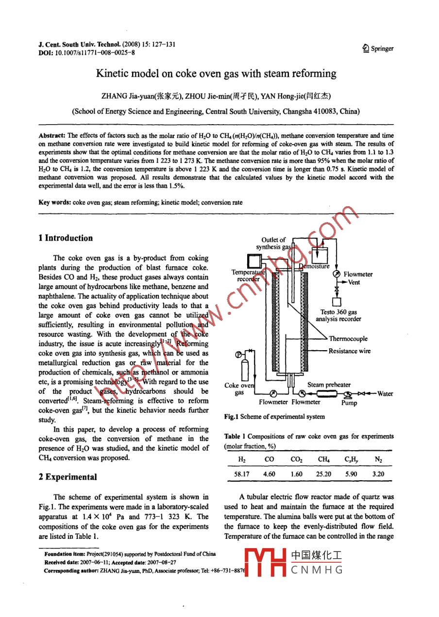 J. Cent, South Univ TechnoL. (2008)15: 127-131DOI:10.1007/s11771008-0025-82 springerKinetic model on coke oven gas with steam reformingZHANG Jia-yuan(張家元), ZHoU Jie-min(周孑民), YAN Hong-jie(閆紅杰)(School of Energy Science and Engineering, Central South University, Changsha 410083, ChinaAbstract: The effects of factors such as the molar ratio of H,o to CH(n(H, O)(CH,), methane conversion temperature and timeon methane conversion rate were investigated to build kinetic model for reforming of coke-oven gas with steam. The results ofexperiments show that the optimal conditions for methane conversion are that the molar ratio of H20 to CH varies from 1.1 to 1.3and the conversion temperature varies from 1 223 to 1 273 K. The methane conversion rate is more than 95% when the molar ratio ofHyO to CH is 1.2, the conversion temperature is above 1 223 K and the conversion time is longer than 0. 75 s. Kinetic model ofmethane conversion was proposed. All results demonstrate that the calculated values by the kinetic model accord with theexperimental data well, and the error is less than 1.5%Key words: coke oven gas; steam reforming: kinetic model; conversion rate1 IntroductionOutlet ofsynthesis gasThe coke oven gas is a by-product from cokingplants during the production of blast furnace coke.Besides CO and H2, these product gases always containFlowmetlarge amount of hydrocarbons like methane, benzene andnaphthalene. The actuality of application technique aboutthe coke oven gas behind productivity leads to that alarge amount of coke oven gas cannot be utilizedTesto 360 gassufficiently, resulting in environmental pollution andresource wasting. With the development of the cokeindustry, the issue is acute increasingly-2.Reformingcoke oven gas into synthesis gas, which can be used asResistance wiremetallurgical reduction gas or raw material for theproduction of chemicals, such as methanol or ammonith regard to the useSteam preheaterof the product gases, hydrocarbons should beconverted!l6l. Steam-reforming is effective to reformFlowmeter Flowmetercoke-oven gas, but the kinetic behavior needs furtherFig 1 Scheme of experimental systemIn this paper, to develop a process of reformingcoke-oven gas, the conversion of methane in the Table I Compositions of raw coke oven gas for experimentspresence of H20 was studied, and the kinetic model ofCH conversion was proposed.2 Experimental58174601.6025205.903.20The scheme of experimental system is shown ina tubular electric flow reactor made of quartz wasFig 1. The experiments were made in a laboratory-scaled used to heat and maintain the furnace at the requiredapparatus at 1.4 X 10 Pa and 773-1 323 K. The temperature. The alumina balls were put at the bottom ofcompositions of the coke oven gas for the experiments the fumace to keep the evenly-distributed flow field.are listed in Table 1Temperature of the fumace can be controlled in the rangen item: Project(291054)supported by Postdoctoral Fund of ChinaReceived date: 2007-06-ll; Accepted date: 2007-08-27Corresponding author: ZHANG Jia-yuan, PhD, Associate professor; Tel: +86-731-8876H中國煤化工CNMHGJ. Cent. South Univ. Technol. (2008)15: 127-131of 773-1 323 K. Real temperatures were measured bylatinum- rhodium thermocouple that can be shifted in asmall quartz tube with 5 mm in diameter. During theexperiments, the coke oven gas from storage flowed intethe reactor at the fixed speed of 18 m/h. Water wasinjected into an electrothermal evaporator by a highprecision syringe pump to from steam of about 573 K, gand then the steam was blown into the furnace with cokein proportion. The desired molar ratio was— Conversion rate of CH.t90djusted by controlling the temperatures in theMolar fraction ofsaturator&). The flow rate and composition of the cokeoven gas were kept constant during the experiments, thevolume of the reactor(namely conversionwaschanged through adjusting the depth of then(H,O)n(CH)composition of product was analyzed and recorded byFig 4 Effect of molar ratio of H2O to CH ratio on conversiongas analysis recorder.rate and molar fraction of H+Co at 1 223 K for 0.6 s3 Results and discussionFig 2 shows that the methane conversion increaseswith decreasing temperature gradually. It can be seenDuring the experiments, the factors including the from Fig 3 when conversion time is longer than 0.6 s andmolar ratio of H20 to CH4, conversion temperature and the temperature is above 1 223 K, the conversiontime in the reactor on methane conversion rate were reaction approaches equilibrium state and the methaneinvestigated. The conversion temperature varied from conversion rate approaches the maximum value773 to 1 323 K, and the molar ratio of H,o to CH4 variesFig 4 shows that the methane conversion ratein the range of 0.8-1. 4. Conversion time was changed by increases with decreasing the molar ratio of H,0 to CH4adjusting the depth of outlet. The results of experiments in a rang of 0.8-1.4, the methane conversion rate isare shown in Figs 2-4above 87%. When the molar ratio of H2o to CH4 is in arange of 1. 4-1.6, the methane conversion ratio decreasesas increasing the molar ratio of H2o to CH4. It is knownthat the gas conversion rate depends on its conversiontime, viz., the contact time among reactant moleculesWhen the flow rate of coke oven gas is fixed, thevelocity of the admixture is faster as the molar ratio ofH,O to CH4 increases, so the conversion time of theadmixture in reactor is reduced, resulting in less methane0.3040.50.60.708091.0To sum up, the optimal conditions for methaneconversion are that the molar ratio of H2o to CH4 variesFig 2 Effect of temperature and conversion time on conversion in a range of 1. 1-1.3 and the conversion temperaturerate of CH: 1-823K; 2-923 K; 3-1023K 4-1 123 K; varies in a range of 1 223-1 273 K. The methane5-1173K;61223K;71273Kconversion rate is more than 95% when the molar ratioof H,0 to CH, ratio is 1. 2, the conversion temperature isabove 1 223 K and the conversion time