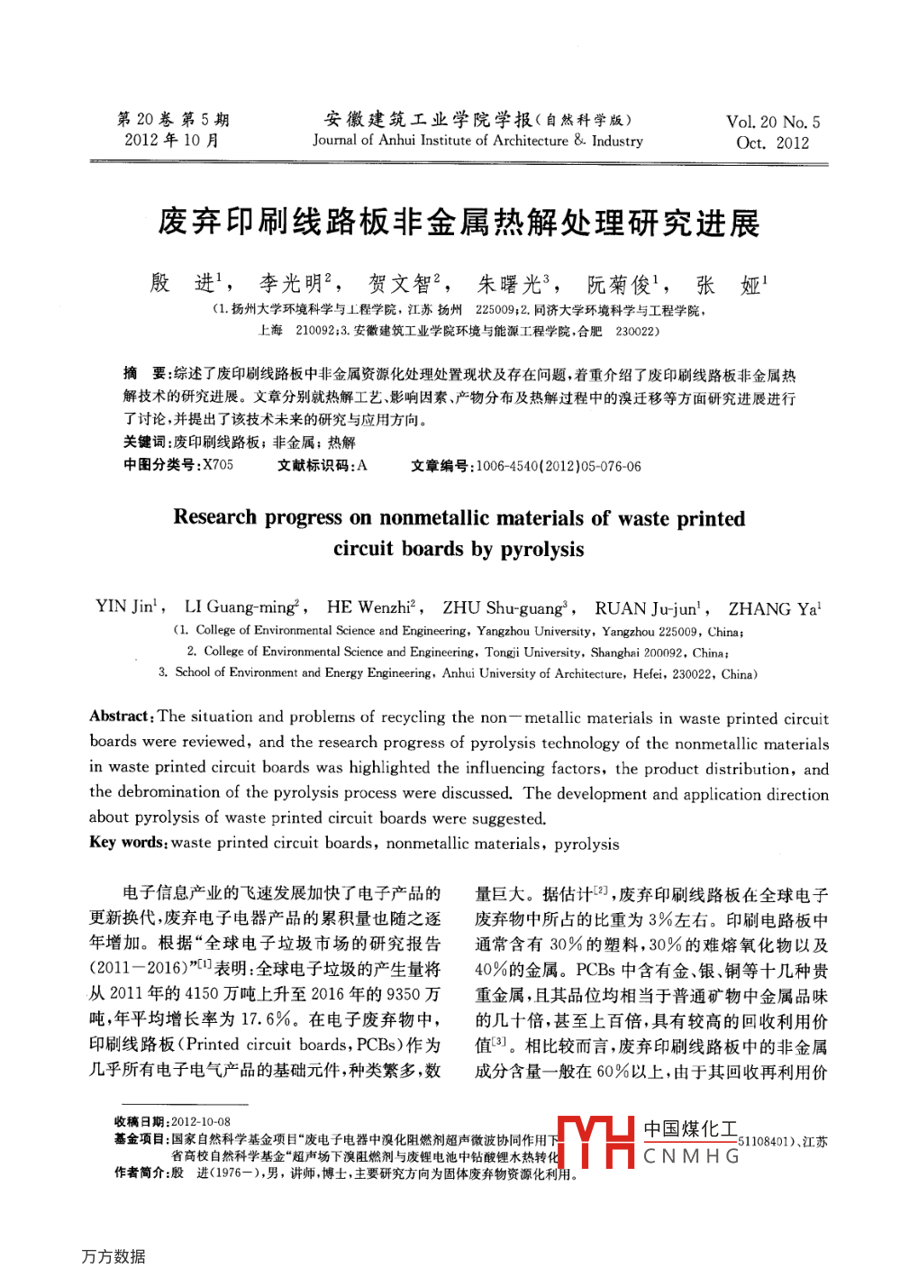 第20卷第5期安徽建筑工業(yè)學(xué)院學(xué)報(bào)(自然科學(xué)版)Vol 20 No. 52012年10月Journal of anhui Institute of Architecture8. IndustryOct.2012廢棄印刷線路板非金屬熱解處理研究進(jìn)展殷進(jìn),李光明2,賀文智2,朱曙光3,阮菊俊1,張婭1(1.揚(yáng)州大學(xué)環(huán)境科學(xué)與⊥程學(xué)院,江蘇揚(yáng)州225009;2.同濟(jì)大學(xué)環(huán)境科學(xué)與工程學(xué)院,上海210092;3.安徽建筑工業(yè)學(xué)院環(huán)境與能源工程學(xué)院,合肥230022)摘要:綜述了廢印刷線路板中非金屬資源化處理處置現(xiàn)狀及存在問題著重介紹了廢印刷線路板非金屬熱解技術(shù)的研究進(jìn)展。文章分別就熱解工藝、影響因素、產(chǎn)物分布及熱解過程中的溴遷移等方面研究進(jìn)展進(jìn)行了討論,并提出了該技術(shù)未來的研究與應(yīng)用方向。關(guān)鍵詞:廢印刷線路板;非金屬;熱解中圖分類號(hào):X705文獻(xiàn)標(biāo)識(shí)碼:A文章編號(hào):10064540(2012)0507606Research progress on nonmetallic materials of waste printedcircuit boards by pyrolysisYIN Jin', LI Guang-ming, HE Wenzhi, ZHU Shuguang, RUAN Jujun, ZHANG Ya(1. College of Environmental Science and Engineering, Yangzhou University, Yangzhou 225009, China:2. College of Environmental Science and Engineering, Tongji University, Shanghai 200092, China:3. School of Environment and Energy Engineering, Anhui University of Architecture, Hefei, 230022, China)Abstract: The situation and problems of recycling the non-metallic materials in waste printed circuitboards were reviewed, and the research progress of pyrolysis technology of the nonmetallic materialsin waste printed circuit boards was highlighted the influencing factors, the product distribution, andthe debromination of the pyrolysis process were discussed. The development and application directionabout pyrolysis of waste printed circuit boards were suggested.Key words: waste printed circuit boards, nonmetallic materials, pyrolysis電子信息產(chǎn)業(yè)的飛速發(fā)展加快了電子產(chǎn)品的量巨大。據(jù)估計(jì)2,廢棄印刷線路板在全球電子更新?lián)Q代,廢棄電子電器產(chǎn)品的累積量也隨之逐廢棄物中所占的比重為3%左右。印刷電路板中年增加。根據(jù)“全球電子垃圾市場的研究報(bào)告通常含有30%的塑料,30%的難熔氧化物以及(2011-2016)”表明:全球電子垃圾的產(chǎn)生量將40%的金屬。PCBs中含有金銀銅等十幾種貴從2011年的4150萬噸上升至2016年的9350萬重金屬,且其品位均相當(dāng)于普通礦物中金屬品味噸,年平均增長率為17.6%。在電子廢棄物中,的幾十倍,甚至上百倍,具有較高的回收利用價(jià)印刷線路板( Printed circuit boards,PCBs)作為值引。相比較而言,廢棄印刷線路板中的非金屬幾乎所有電子電氣產(chǎn)品的基礎(chǔ)元件種類繁多數(shù)成分含量一般在60%以上,由于其回收再利用價(jià)收稿日期:2012-10-08基金項(xiàng)目:國家自然科學(xué)基金項(xiàng)目“廢電子電器中溴化阻燃劑超聲微波協(xié)同作用下中國煤化工51108401)、江蘇省高校自然科學(xué)基金“超聲場下溴阻燃劑與廢鋰電池中鉆酸鋰水熱轉(zhuǎn)CNMHG作者簡介股進(jìn)(1976-),男,講師博土,主要研究方向?yàn)楣腆w廢棄物資源化利用。第5期殷進(jìn),等:廢棄印刷線路板非金屬熱解處理研究迸展值較低,往往在回收完其中的金屬之后,或者被拋在較高濃度的有毒的溴代物,且熱解液相產(chǎn)物也棄填埋,或者混入城市生活垃圾中焚燒,這樣簡單因?yàn)殇宓拇嬖诙档土似焚|(zhì),限制了其應(yīng)用范圍的處理方式既容易引發(fā)二次污染,同時(shí)也造成了比較這三種技術(shù)可以發(fā)現(xiàn),前兩種技術(shù)的不足在資源的浪費(fèi)。當(dāng)前技術(shù)水平下很難得到克服,而熱解技術(shù)中存1非金屬處理處置現(xiàn)狀在的問題,則可以通過脫溴過程得到有效解決。因此,廢印刷線路板非金屬熱解技術(shù)的研發(fā)正逐隨著材料科學(xué)的發(fā)展,越來越多的新型復(fù)合漸引起研究人員的關(guān)注。金屬材料的使用量正在逐漸減少,非金屬材料的2熱解工藝及產(chǎn)物分析使用量則逐年增加。因此,對(duì)廢棄印刷線路板中廢線路板熱解的較為典型的工藝流程如圖1非金屬材料,特別是樹脂類材料進(jìn)行資源化回收所示。拆除元器件的廢印刷線路板,經(jīng)粉碎至再利用的研發(fā)顯得尤為重要定尺寸后進(jìn)行熱解。廢線路板中的環(huán)氧樹脂等非金屬材料資源化技術(shù)研究與應(yīng)用起步較高聚物在無氧條件下加熱到一定溫度發(fā)生熱分晚,且大多屬于實(shí)驗(yàn)室,或者中試階段。主要?dú)w屬解,生成小分子有機(jī)物或者單體。冷凝熱解生產(chǎn)于三大類:①直接法,即保留廢棄印刷線路板分的熱解氣,可以得到不凝性氣體和液態(tài)熱解油。選后非金屬粉末原有的理化性質(zhì),將其作為某種熱解固相產(chǎn)物主要是金屬和玻璃纖維等惰性成填料替代品,填充到目標(biāo)材料當(dāng)中。如zhag等分,留在反應(yīng)器中作為固相殘?jiān)?采用簡單的物理人應(yīng)用廢印刷線路板非金屬粉末作為增強(qiáng)材料方法即可分離回收。與不飽和聚酯構(gòu)成復(fù)合材料,分別研究顆粒形狀仁氣大小及含量對(duì)材料性能的影響,研究結(jié)果表明顆粒粒徑為1-3mm,粉末添加到65%復(fù)合材料依州解}十解五然呈現(xiàn)出較好的力學(xué)性能:抗折強(qiáng)度150MPa,沖擊強(qiáng)度18kJ/m2。②溶