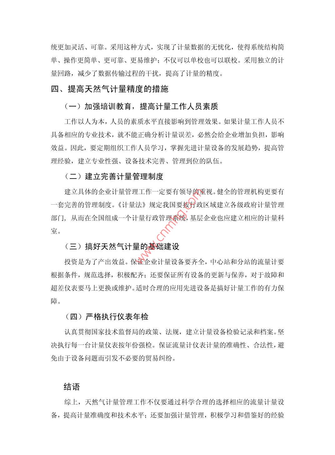天然氣計(jì)量方法探析李毅益陽市城市建筑設(shè)計(jì)有限責(zé)任公司湖南益陽413000摘要:天然氣工業(yè)在我國發(fā)展迅猛,天然氣的生產(chǎn)、輸送、銷售各環(huán)節(jié)之間的商業(yè)活動(dòng)都要以計(jì)量為依據(jù),天然氣計(jì)量的準(zhǔn)確度至關(guān)重要。因此,選擇合理的流量計(jì)量方法,以保證計(jì)量準(zhǔn)確度并有一套行之有效的計(jì)量管理體系,使企業(yè)獲得良好的社會(huì)效益和經(jīng)濟(jì)效益,具有典型的現(xiàn)實(shí)意義。本文主要探討了影響天然氣計(jì)量精度的因素,并對(duì)天然氣計(jì)量的方法進(jìn)行了詳細(xì)闡述。關(guān)鍵詞:天然氣;流量;計(jì)量:孔板;精度Abstract: the fast development of gas industry in China, natural gas production, transportation,ales, commercial activities between each link should be based on measurement, gas meteringccuracy is crucial. So, choose the reasonable flow measurement methods, so as to ensure theaccuracy of measuring and a set of effective measurement management systeem. makeenterprise to get good social benefit and economic benefit, is a typical practical significance. Thpaper mainly discusses the influence factors of natural gas measurement accuracy, this paperexpounds in detail and the method of natural gas measurementKey words: natural gas; Flow; Measurement; Orifice plate; precision中圖分類號(hào):473.2+4文獻(xiàn)標(biāo)識(shí)碼:A文章編號(hào):2095-2104(2013)、天然氣計(jì)量發(fā)展的趨勢天然氣作為一種優(yōu)質(zhì)能源和化工原料,其計(jì)量越來越被人們重視。雖然我國天然氣計(jì)量起步較晚,但這些年已經(jīng)在天然氣儀表的設(shè)計(jì)選型、使用、安裝、維護(hù)、管理、氣質(zhì)分析等方面作了相應(yīng)的工作,得出了一些重要的結(jié)論,取得了些成果。隨著環(huán)境和要求發(fā)生新的變化,我國的天然氣計(jì)量在以下幾方面取得了進(jìn)展。根據(jù)相關(guān)部門的統(tǒng)計(jì)結(jié)果顯示,2010年我國用于天然氣計(jì)量的器具為1900多臺(tái),而2015年將可能達(dá)到5600多臺(tái);過去,流量儀表選型比較單一,近幾年隨著對(duì)流量計(jì)的硏究和開發(fā),不同的流量計(jì)有不同的特點(diǎn)和適應(yīng)范圍,流量儀表選型由此呈現(xiàn)從單一儀表向多元化儀表方向發(fā)展,一些新型的流量計(jì),如高中壓、大流量干線超聲流量計(jì)將得到廣泛運(yùn)用:我國目前的天然氣貿(mào)易計(jì)量方法主要還是在法定的質(zhì)量指標(biāo)下按體積計(jì)量,隨著市場經(jīng)濟(jì)的不斷完善和與國外天然氣交易量的增加,要求我國天然氣貿(mào)易計(jì)量方法盡快與國際接軌,實(shí)行能量計(jì)量結(jié)算,而據(jù)介紹,我國天然氣能量計(jì)量的標(biāo)準(zhǔn)已經(jīng)制定完成,國家可能即將推行按能量計(jì)量的貿(mào)易結(jié)算方式;另外,完善天然氣計(jì)量校準(zhǔn)系統(tǒng),擴(kuò)大流量校準(zhǔn)口徑,改建成都分站,擴(kuò)大校準(zhǔn)能力也將成為我國天然氣計(jì)量的一大發(fā)展趨勢。二、影響天然氣計(jì)量精度的因素分析(一)節(jié)流裝置本身產(chǎn)生的誤差如設(shè)計(jì)計(jì)算時(shí)偏離實(shí)際常用流量,偏離實(shí)際流體特性。孔板加工時(shí)由于各種原因?qū)е氯肟谥苯卿J利度不夠、孔板厚度誤差、節(jié)流件附件產(chǎn)生臺(tái)階、偏心、孔板上游端面水平度、孔板的圓度等影響其精度孔板使用一段時(shí)間后,發(fā)生彎曲變形、上游測量管沉積臟物、上游端面沉積臟物、孔板入口直角邊緣變鈍,破損等也會(huì)影響計(jì)量精度(二)孔板閥產(chǎn)生的誤差流量計(jì)的節(jié)流孔板是安裝在孔板閥當(dāng)中,由于存在泄漏,會(huì)導(dǎo)致不同程度的誤差。對(duì)此應(yīng)加強(qiáng)孔板閥的維護(hù)保養(yǎng),及時(shí)發(fā)現(xiàn)及時(shí)解決。在條件允許的情況下每隔一定周期對(duì)孔板閥進(jìn)行全面清洗維護(hù),使孔板閥工作在最佳狀態(tài)(三)安裝引起的誤差計(jì)量裝置安裝中造成的節(jié)流件不同軸度、取壓位置、焊接、焊縫突出、取壓孔加工不規(guī)范或堵塞、導(dǎo)壓管的不規(guī)范等造成的安裝誤差是普遍性的(四)直管段引起的誤差孔板前后的直管段,其長度和管道內(nèi)壁的粗糙度,平直度、圓度等必須符合定的要求。管道投入使用后,由于污物沉積和長期沖刷會(huì)產(chǎn)生計(jì)量誤差(五)現(xiàn)場儀表產(chǎn)生的誤差儀表精度、回差、線性度、量程等不可避免的會(huì)產(chǎn)生計(jì)量誤差;另外由于現(xiàn)場工作條件惡劣,儀表會(huì)產(chǎn)生零漂和溫漂。(六)流量積算儀產(chǎn)生的誤差流量積算儀工作是否可靠、流量計(jì)算軟件選用是否科學(xué),以及為保證積算儀穩(wěn)定工作采取的保護(hù)措施是否恰當(dāng),都會(huì)影響天然氣的計(jì)量。、天然氣計(jì)量的方法(一)撬裝式燃?xì)庹{(diào)壓計(jì)量站燃?xì)庹{(diào)壓計(jì)量站是一座自動(dòng)化程度較高的多功能區(qū)域站,包括燃?xì)鉁[潔過濾、調(diào)壓、計(jì)量及數(shù)據(jù)采集系統(tǒng),所有功能集成于一個(gè)整體的撬座上,占地面積小、現(xiàn)場安裝工作量少,操作維護(hù)方便,使用安全可靠,并且可以實(shí)現(xiàn)遠(yuǎn)程遙控?zé)o需現(xiàn)場值守。其內(nèi)部采用了流量范圍不同的兩個(gè)流量計(jì