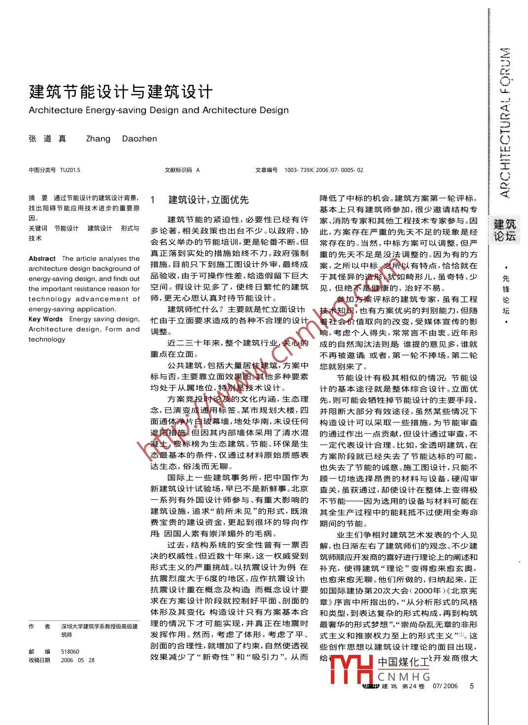 建筑節(jié)能設(shè)計(jì)與建筑設(shè)計(jì)uArchitecture Energy saving Design and Architecture Design張道真Zhang Daozhen中圖分類號(hào)TU201.5文獻(xiàn)標(biāo)識(shí)碼A文章編號(hào)1003- 739x( 2006)07- 005- 02摘要通過節(jié)能設(shè)計(jì)的建筑設(shè)計(jì)背景, 1建筑設(shè)計(jì),立面優(yōu)先降低了中標(biāo)的機(jī)會(huì)。建筑方案第一輪 評(píng)標(biāo),找出阻礙節(jié)能應(yīng)用技術(shù)進(jìn)步的重要原基本上只有建筑師參加,很少邀請(qǐng)結(jié)構(gòu)專關(guān)鍵詞節(jié)能設(shè)計(jì) 建筑設(shè)計(jì) 形式與建筑節(jié)能的緊迫性,必要性已經(jīng)有許家、消防專 家和其他工程技術(shù)專家參與。因建筑多論著,相關(guān)政策也出臺(tái)不少。以政府、協(xié)此,方案存在嚴(yán)重的先天不足的現(xiàn)象是經(jīng)技術(shù)會(huì)名義舉辦的節(jié)能培訓(xùn),更是輪番不斷。但常存在的。當(dāng)然,中標(biāo)方案可以調(diào)整,但嚴(yán)論壇。Abstract The article analyses the真正落到實(shí)處的措施始終不力。政府強(qiáng)制重的先天不足是沒法調(diào)整的。因?yàn)橛械姆絘rchitecture design background of措施,目前只下到施工圖設(shè)計(jì)外審,最終成案,之所以中標(biāo)、之所以有特點(diǎn),恰恰就在energy saving design, and finds out品驗(yàn)收,由于可操作性差,給造假留下巨大于 其怪異的造形,猶如畸形兒,雖奇特、少先the important rsistance reasonfor空間。 假設(shè)計(jì)見多了,使終日繁忙的建筑見, 但絕不是健康的,治好不易。technology advancement of師, 更無(wú)心思認(rèn)真對(duì)待節(jié)能設(shè)計(jì)。參加方案評(píng)標(biāo)的建筑專家,雖有工程論energy saving application.建筑師忙什么?主要就是忙立面設(shè)計(jì)技術(shù)知識(shí), 也有方案優(yōu)劣的判別能力,但隨壇Key Words Energy saving desin,忙由于 立面要求造成的各種不合理的設(shè)計(jì)著 社會(huì)價(jià)值取向的改變,受媒體宣傳的影Architecture design, Form and調(diào)整 。響,考慮個(gè)人得失,常常言不由衷。近年形technology近二三十年來,整個(gè)建筑行業(yè),關(guān)心的成的自 然淘汰法則是誰(shuí)提的意見多,誰(shuí)就重點(diǎn)在立面。不再被邀請(qǐng)或者,第一輪不捧場(chǎng), 第二輪公共建筑, ,包括大量居住建筑,方案中您就別來了 。標(biāo)與否,主要靠立面效果圖。其他多種要素節(jié)能設(shè)計(jì)有極其相似的情況:節(jié)能設(shè)均處于從屬地位,特別是技術(shù)設(shè)計(jì)。計(jì)的基本途徑就是整體綜合設(shè)計(jì)。立面優(yōu)方案競(jìng)投時(shí)論及的文化內(nèi)涵,生態(tài)理先,則可能會(huì)犧牲掉節(jié)能設(shè)計(jì)的主要手段,念,已演變成通用標(biāo)簽。某市規(guī)劃大樓,四并阻斷大部分有效途徑。雖然某些情況下面通體凈片白玻幕墻,地處華南,未設(shè)任何構(gòu)造設(shè)計(jì)可以采取-些措施,為節(jié)能審查遮陽(yáng)措施。但因其內(nèi)部墻體采用了清水混的通過作出 -點(diǎn)貢獻(xiàn),但設(shè)計(jì)通過審查,不凝土,被標(biāo)榜為生態(tài)建筑。節(jié)能、環(huán)保是生- 定代表設(shè)計(jì)合理。比如,全透明建筑,在態(tài)最基本的條件,僅通過材料原始質(zhì)感表方案階段就已經(jīng)失去了節(jié)能達(dá)標(biāo)的可能,達(dá)生態(tài),俗淺而無(wú)聊。也失去了節(jié)能的誠(chéng)意。施工圖設(shè)計(jì),只能不國(guó)際上一些建筑事務(wù)所,把中國(guó)作為顧-切地選擇昂貴的材料與設(shè)備,硬闖審新建筑設(shè)計(jì)試驗(yàn)場(chǎng),早已不是新鮮事o北京查 關(guān),雖獲通過,卻使設(shè)計(jì)在整體上變得極一系列有外國(guó)設(shè)計(jì)師參與、有重大影響的不節(jié)能-因?yàn)檫x用的設(shè)備與材料可能在建筑設(shè)施,追求“前所未見”的形式,既浪其全生產(chǎn)過程中的能耗抵不過使用全壽命費(fèi)寶貴的建設(shè)資金,更起到很壞的導(dǎo)向作期間的節(jié)能。用因國(guó)人素有崇洋媚外的毛病。業(yè)主們爭(zhēng)相對(duì)建筑藝術(shù)發(fā)表的個(gè)人見過去,結(jié)構(gòu)系統(tǒng)的安全性曾有一票否解, 也日漸左右了建筑師們的觀念。不少建決的權(quán)威性。但近數(shù)十年來,這一權(quán)威受到筑師順應(yīng)開發(fā) 商的喜好進(jìn)行理論上的闡述和形式主義的嚴(yán)重挑戰(zhàn)。以抗震設(shè)計(jì)為例在補(bǔ)充,使得建筑“理論”變得愈來愈玄奧,抗震烈度大于6度的地區(qū),應(yīng)作抗震設(shè)計(jì):也愈來愈無(wú)聊。他們所做的,歸納起來,正抗震設(shè)計(jì)重在概念及構(gòu)造而概念設(shè)計(jì)要如國(guó)際建 協(xié)第20次大會(huì)( 2000年)《北京憲求在方案設(shè)計(jì)階段就控制好平面、剖面的章》 序言中所指出的,“從分析形式的風(fēng)格體形及其變化:構(gòu)造設(shè)計(jì)只有方案基本合和類型 ,到表達(dá)復(fù)雜的形式構(gòu)成,再到構(gòu)筑作者深圳大學(xué)建筑學(xué)系教授級(jí)高級(jí)建理的情況下才可能實(shí)現(xiàn),并真正在地震時(shí)最 奢華的形式夢(mèng)想”,“崇尚雜亂無(wú)章的非形師發(fā)揮作用。然而,考慮了體形,考慮了平、式主義和推崇權(quán)力至上的形式主義”0。這剖面的合理性,就增加了約束,自然使透視些創(chuàng)作思想以建筑
