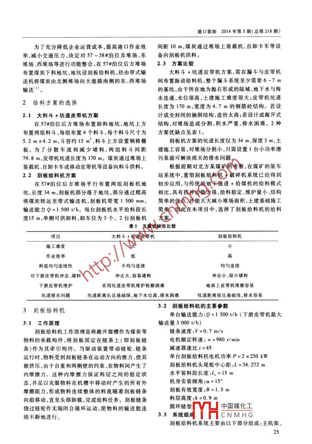 Port Operation 2014. No. 5( Serial No. 218)重型刮板給料機在煤炭輸送系統(tǒng)的應(yīng)用連云港港口集團(tuán)有限公司陳陽商要:在連云港港57#-58#通用泊位煤炭輸送系統(tǒng)中,重型刮板給料機得到了成功使用,為煤炭輸送系統(tǒng)的給料方式提供了新的選擇。通過刮板給料機與皮帶輸送機的有效組合,實現(xiàn)了煤炭遠(yuǎn)距離輸送,取代原有高能耗、高污染的作業(yè)方式。本文對該項目的背景、方案選擇、系統(tǒng)組成、設(shè)備選型等進(jìn)行了詳細(xì)描述。關(guān)鍵詞:港口;煤炭;輸送系統(tǒng);刮板給料機Application of Heavy Duty of Scratch Board Feeder in Coal Conveying SystemLianyungang Port Group Co. , Ltd. Chen YangAbstract: In the coal conveying system in the general berth No 57 to 58 in Lianyungang Port the heavy duty ofscratch board feeder has been successfully applied in, which provides a new choice for the feeding mode in the coal conve-ying system. By the effective combination of the heavy duty of scratch board feeder with the belt conveyor, the long distanceconveying of the coal is realized, and the original operational mode with high energy consumption and high pollution is re-placed. In this paper, the background of this project, the scheme selection, the system composition, and the equipmenttype selection are described in detail.Key words: port; coal; conveying system; scratch board feeder足,且后方堆場間相對獨立,沒有帶式輸送機系統(tǒng)進(jìn)1引言行貫通,必須通過汽車轉(zhuǎn)場。據(jù)統(tǒng)計,2010年58#泊江蘇連云港港57-58#通用泊位是港口主要的位轉(zhuǎn)至后方堆場煤炭量約為200萬t,直接導(dǎo)致了轉(zhuǎn)煤炭進(jìn)口碼頭,隨著煤炭進(jìn)口量的增加,堆場容量不場成本居高不下,港區(qū)主干道交通壓力大。破壞性,工作狀態(tài)下有效的防風(fēng)裝置對大型港口裝3方案驗證卸機械的安全起著重要的保護(hù)作用。輪邊制動器是參照設(shè)備參數(shù),對起重機進(jìn)行防風(fēng)計算[)]。起利用輪壓及車輪與軌道之間的摩擦產(chǎn)生抗風(fēng)阻力,重機處于最大幅度,順著軌道方向吹風(fēng)的情況下進(jìn)輪壓和摩擦系數(shù)均屬穩(wěn)定參數(shù),故采用該制動器進(jìn)行計算,此時起重機受風(fēng)面積最大,即風(fēng)載荷最大、行防風(fēng)具有很好的穩(wěn)定性和可靠性。對在工作狀態(tài)最不利情況。參照該起重機制造廠家提供的相關(guān)數(shù)下采用電子機械式輪邊制動器防風(fēng),能對起重機的據(jù)計算,起重機在工作狀態(tài)45 m/min 的速度走車全部從動輪進(jìn)行有效制動,與主動輪的制動器--道,時,遇35m/s的順風(fēng)襲擊,起重機在6s內(nèi)停車所需可為起重機提供足夠的抗風(fēng)能力。的車輪制動力F.為1 178.6kN,16臺大車工作制動參考文獻(xiàn)器和8臺輪邊制動器共同作用時產(chǎn)生的車輪制動力為1182 kN,大于F。。因此,此臺起重機工作狀態(tài)[1]董煒.液壓輪邊制動器在岸橋中的防風(fēng)效果分析[J].港口裝卸,2003(2):16-17.下能抗擊風(fēng)速為35 m/s的陣風(fēng)。[2] 段京麗.有軌起重機防風(fēng)裝置YXF的應(yīng)用[J].港口裝4結(jié)語卸,008(3):24.[3] 交通部水運司.港口起重運輸機械設(shè)計手冊[M].北自2012年改造完成后,輪邊制動器使用狀態(tài)良京:人民交通出版社,2001 :37.好,至今未出現(xiàn)使用故障,遭遇多次陣風(fēng)后均未出現(xiàn)起重機滑移的情況。實踐證明,輪邊制動器的工作周明華:中國煤化工路1號性能和防風(fēng)效果是可靠的、有效的。收稿日期:MHCNMHGDOI: 10. 3905/小. 1ssn: 100U - 8Y09. 2U14. Us.008突發(fā)性大風(fēng)對工作狀態(tài)下的起重機具有極大的24Port Operation 2014. No. 5( Serial No. 218)主尾軸裝置、驅(qū)動裝置、刮板鏈條、供電及變頻調(diào)速沖擊和震動,用絲杠調(diào)節(jié)鏈條的松緊。按照《礦用系統(tǒng)、現(xiàn)場控制室、噴淋除塵裝置等2)。刮板輸送機驅(qū)動鏈輪》行業(yè)標(biāo)準(zhǔn),計算得出鏈輪節(jié)3.3.1主機架圓直徑D=616 mm,減速機速比i=45。采用Q345-B鋼材拼焊成H型截面鋼結(jié)構(gòu), H3.3.3 驅(qū)動裝置型上部與導(dǎo)料槽構(gòu)成物料輸送槽,在與物料接觸的采用同軸雙電機雙減速箱驅(qū)動方式,直角軸布部分設(shè)Q460-C耐磨襯板,H型下部為返回刮板滑置,電機為變頻電機。參考《運輸機械設(shè)計選用手道。冊》,采用逐點張力法以及經(jīng)驗取值,得到額定工作常規(guī)的煤礦裝車站系統(tǒng)中整個主機架設(shè)置在地狀態(tài)和最大能力運行狀態(tài)的鏈條張力'3),確定電機面以上,這樣勢必造成對有限的堆場的分割占用。功率為2 x250 kW。因此本項目刮板機主機架水平段放置在土建坑道3.3.4刮板鏈條中,水平段長度為15 m,滿足3輛自卸車同時卸料,本機鏈條采用礦用高強度圓環(huán)鏈038 x137,布機架傾斜段角度為15°, 通過機頭平臺及轉(zhuǎn)載溜槽置方式為邊雙鏈,刮板選用優(yōu)質(zhì)鑄造合金鋼熔模鑄與下游皮帶機銜接,見圖1。造。根據(jù)該型號鏈條的破斷載荷以及刮板機最大能力狀態(tài)的張力,得出鏈條的安全系數(shù)滿足國際標(biāo)準(zhǔn)的要求。3.3.5變 頻驅(qū)動及供電系統(tǒng)3.3.5.1電機調(diào)速方式的選擇圈1主機架示意圖目前常用的電機調(diào)速方式有變頻調(diào)速和液力耦3.3.2主尾軸裝 置合器調(diào)速。由于本次設(shè)計的刮板給料機水平裝料段主要由驅(qū)動軸、驅(qū)動鏈輪、軸