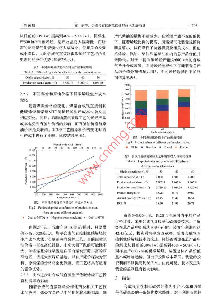 石油比工2012年第41卷第10期PEIROCHEMICAL TECHNOLOGY●1201 .合成氣直接制低碳烯烴技術(shù)發(fā)展前景董麗,楊學萍(中國石化上海石油化工研究院,上海201208)[摘要]對合收氣古按制低碳勢烴的技術(shù)進展(包括任化制和T藝的研究情況)進行廣綜述;對合成氣白接制低碳制烴工藝的經(jīng)濟性進行了分析,同時分析了該工藝的本來發(fā)展前景。撕出合成氣通過費托合成制飯?zhí)枷《蘐藝具有較好的產(chǎn)品市場需求和原料供應(yīng)保障,且與傳繞蒸汽裂解和經(jīng)甲解制烯烴工藝相比,具有原料價格優(yōu)勢,并副產(chǎn)高價值鈾品。在經(jīng)濟性上具有較強的競爭力。如能通過改進雅化劑和T藝優(yōu)化揭高低碳場烴在總產(chǎn)品中的組成(如提高至40%(w)以上.),合成氣直接制低碳墻烴的經(jīng)濟性優(yōu)勢將更加明顯。[關(guān)鍵聞”合成氣;費托合成;低堿瑞烴” 文章編號] 1000- 8144(2012) 10- 1201 - 06中圈分類號: TQ 2212[文獻標識碼] ANew Advances in Direct Production of Light Olefins from SyngasDong Li,Yung Xueping(SINOPEC Shangboi Research lsite of Ptrochemical Tecnolougy. Shenghai 201208,Ching )[ Abstract ] New advances in the direet production of light olefins from syngas, including thecatalysts, reactors and processes, are summarized. It is pointed out that the production of light olefinsfrom syngas by Fischer- Tropsch synthesis has good product demand and raw material guarantee.Compared with conventional steam cracking and methaol to olefins, the direct production of lightolefins from syngas is economically competitive due to is low raw material price and high-value ofthe fuel oil byproducts. If the light olefin content in the total products increases to 409%(W) by theimprovement of the catalysts and processes. its economic advantage will be more apparent.[ Keywords ] syngas; Fischer Tropsch synthesis; light olefins以憶烯和丙烯為代表的低碳烯烴是石油化r線?;谖覈庇?、少氣、富煤的資源特點,開發(fā)領(lǐng)域的核心產(chǎn)品,不僅是高分子合成材料的重要單煤基合成氣制低碳烯烴技術(shù)具有重要的戰(zhàn)略意義,體,同時以它們?yōu)榛A(chǔ)可以合成環(huán)氧乙烷、乙苯、其中合成氣直接制取低碳烯烴工藝具有流程短、能苯乙烯、環(huán)氧丙燒、異丙苯和丙烯情等基礎(chǔ)有機原耗和煤耗低的優(yōu)勢,是月前的研究熱點,具有良好料。盡管近年來我國低碳烯烴產(chǎn)能不斷提高,生的發(fā)展前景。產(chǎn)已具有相當規(guī)模,但長期以來產(chǎn)品進口量持續(xù)本文對合成氣直接制低磯烯烴的技術(shù)進展(包增長。201 1年我國乙烯和丙烯產(chǎn)量分別達到15.275括催化劑和T藝的研究情況)進行了綜述;對合成Mt和14.530 Mit',同年進口量為1.060 Mt和1.755氣直接制低碳烯烴T.藝的經(jīng)濟性進行了分析。Mt.同比增長了30.0%和15.2%。隨著閑民經(jīng)濟的1合成氣直接制 低碳烯烴技術(shù)進展快速增長.我國對乙烯和丙烯等化1.原料的需求將穩(wěn)步增長,未來供需矛盾仍很突出。合成氣直接制低碳烯烴是指合成氣(CO和H2)日前,低碳烯烴牛產(chǎn)主要采用輕烴(乙烷、石在催化劑作用下,通過費托合成制得碳原子數(shù)小于腦油及輕柴油)裂解的石油化工路線。由于全球石[收稿日期」2012-04-06; i修改稿日期] 2012-06-28。油資源日漸貴乏,原油價格高位徘徊,世界各大石.作者簡介}重麗(1987-).女,湖北省隨州市人,傾+.助理油化T公司正積極開發(fā)替代傳統(tǒng)烯烴生產(chǎn)的新路工程師,電話021 - 68462197.7502,電郵dongl shy@sinopec. com。第10期.董麗等.合成氣直接制低碳烯烴技術(shù)發(fā)展前景導(dǎo)熱性能,減少飛溫的可能性。流化床費托合成中試裝置,采用Fe基催化劑,在,催化劑的焙燒過程與焙燒溫度對活性組分的300~ 400 C.2.0~ 5.0 MPa下操作。該裝置連續(xù)滿顆粒尺寸及其在催化劑中的分布情況有直接影響。負荷運行1 580h,裝置溫度控制穩(wěn)定,催化劑在線沈興等20發(fā)現(xiàn)FeK/ZMS -5催化劑經(jīng)500 C焙燒3 h排放和添加操作自如。費托反應(yīng)的合成氣轉(zhuǎn)化率大后具有最佳的催化活性。但對低碳烯烴的選擇性影于82%,產(chǎn)物中含大量烯烴,進一步提純后可生產(chǎn)響不明顯。Tao等[則認為提高焙燒溫度和加熱速乙烯、丙烯和丁烯等低碳烯烴。率可降低Fe- -Mn催化劑的比表面積,提高低碳烯烴Kohshiroh等[25)于 1989年首次在固定床反應(yīng)器與C;產(chǎn)物的選擇性;另外,在氬氣中焙燒可改善催上將超臨界介質(zhì)應(yīng)用到Co基催化劑的費托合成反化劑積碳情況,并提高反應(yīng)活性。Reubroycharoen應(yīng)中,發(fā)現(xiàn)在提高CO轉(zhuǎn)化率和抑制甲烷轉(zhuǎn)化方面等221發(fā)現(xiàn)用微波法處理Co/SiO,催化劑前體可避免均得到明顯改善。此后,國內(nèi)外研究學者紛紛對超催化劑表面的Co粒子燒結(jié),使其具有更加均- -的臨界技術(shù)在費托合成中的應(yīng)用展開了研究。唐浩粒徑和較高的分散度,提高反應(yīng)活性。東等32)考察了多種超臨界介質(zhì)下的費托合成反應(yīng),超細顆粒技術(shù)、超臨界流體技術(shù)以及微波輻認為C3.正構(gòu)烷烴在催化劑活性溫度下都是適宜熔射技術(shù)也被應(yīng)用到催化劑的制備過程中,用來提鐵催化劑的超臨界介質(zhì),具備較好的傳質(zhì)與傳熱性高催化劑的合成效率,并改善催化劑的物化性能。能,可改善費托合成反應(yīng)性能。北京化工大學(2])北京化工大學2]采用超臨界流體組合技術(s