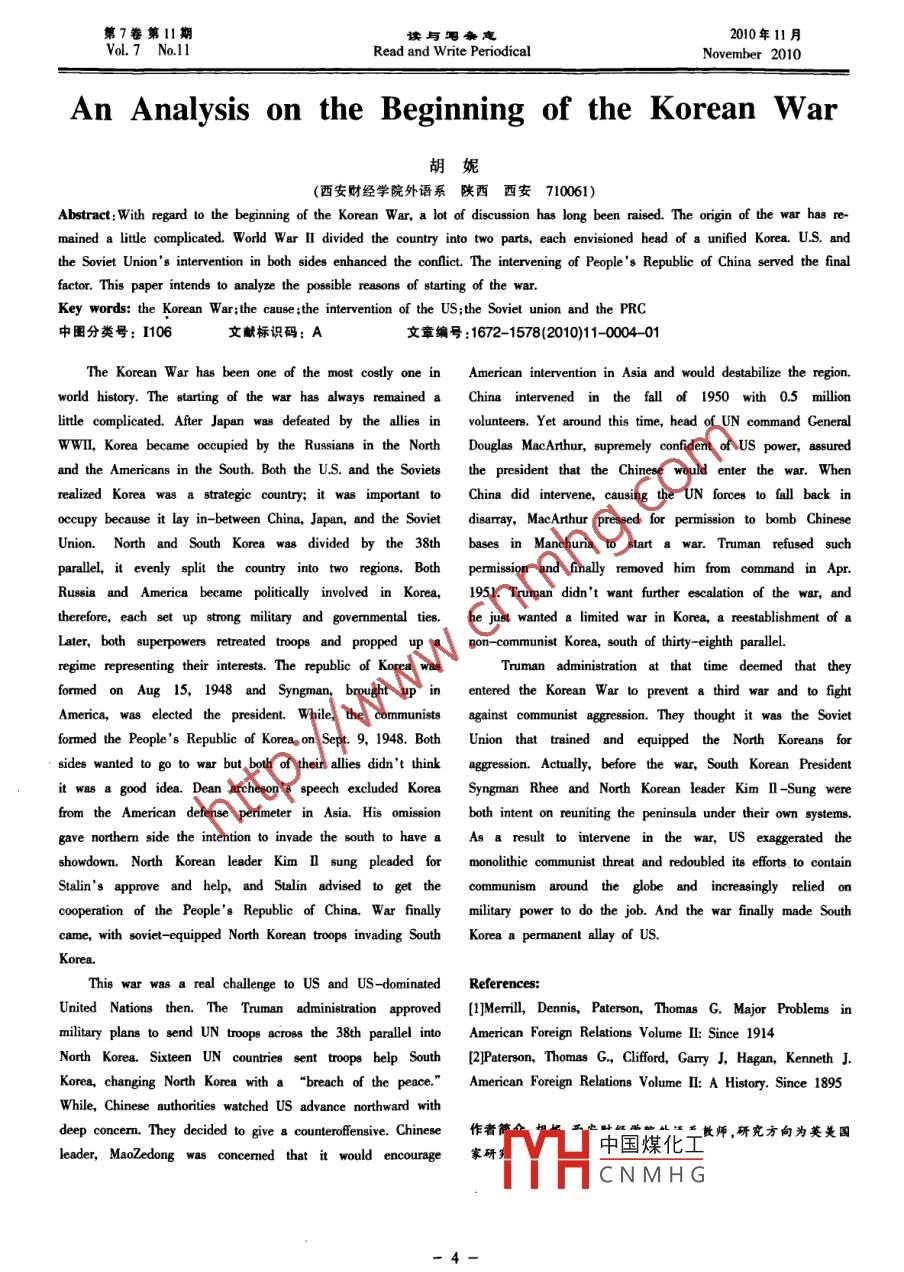 第7卷第11期.讀與寫雜忘2010年11月.No.1IRead and Write PeriodicalNovember 2010An Analysis on the Beginning of the Korean War胡妮(西安財經(jīng)學(xué)院外語系陜西西安710061)Abstract:With regard to the beginning of the Korean War, a lot of discussion has long been raised. The origin of the war has地mained a litue complicated. World War II divided the country into two parts, each envisioned head of a unified Korea. U.S. andthe Soviet Union' 8 intervention in both sides enhanced the conflict. The intervening of People's Republice of China served the finalfactor. This paper intends to analyze the possible reasons of starting of the war.Key words: the Korean War;the cause ;the intervention of the US;the Soviet union and the PRC中圈分類號: 106文獻(xiàn)標(biāo)識碼: A文章編號:1672- 1578(2010)11-0004 -01The Korean War has been one of the most costly one in American intervention in Asia and would destabilize the region.world history. The starting of the war has always remained aChina intervened in the fall of 1950 with 0.5 millionitle complicated. After Japan was defeated by the allies involunteers. Yet around this time, head of UN command GeneralWWII, Korea became occupied by the Russians in the NorthDouglas MacArthur, supremely confident of US power, assuredand the Americans in the South. Both the US. and the Sovietshe president that the Chinese would enter the war. Whenrealized Korea was a strategic country; it was important toChina did intervene, causing the UN forces to fll back inoccupy because it lay in-between China, Japan, and the Sovietdisrray, MacArthur pressed for permission to bomb ChineseUnion. North and South Korea was divided by the 38thbases in Manchuria to start a war. Truman refused suchparallel, it evenly split the country into two regions. Bothpermission and finally removed him from command in Apr.Russia and America became plially involved in Korea,1951. Truman didn't want further escalation of the war, andtherefore, each set up strong military and govemmental ties.he just wanted a limited war in Korea, a reestablishment of aLater, both superpowers retreated troops and propped up anon-communist Korea, south of thirty- eighth parallel.regime representing their interests. The republic of Korea wasTruman administration at that time deemed that theyformedon Aug 15, 1948 and Syngman, brought up inentered the Korean War to prevent a third war and to fightAmerica, was elected the president. While, the communistsagainst communist aggression. They thought it was the Sovietformned the People's Republic of Korea on Sept. 9, 1948. BothUnion that trained and equipped the North Koreans forsides wanted to go to war but both of their alies didn't thinkaggression. Actually, beforehe war, South Korean Presidentit was a good idea. Dean archeson's speech excluded KoreaSyngman Rhee and North Korean leader Kim 0 -Sung werefrom the American defense perimeter in Asia. His omissionboth intent on reuniting the peninsula under their own systems.gave northem side the intention to invade the south to have aAs a result to intervene in the war, US exaggerated theshowdown. North Korean leader Kim 1 sung pleaded formonolithic communist threat and redoubled its efforts. to containStalin's approve and help, and Stalin advised to get thecommunism around the globe and incresingly relied oncooperation of the People's Republic of China. War finallymilitary power to do the job. And the war finally made Southcame, with soviet- -equipped North Korean troops invading SouthKorea a permanent allay of US.Korea.This war was a real challenge to US and US -dominatedReferences:United Nations then. The Truman administration approved[1]Mermil, Dennis, Paterson, Thomas C. Major Problems inmilitary plans to send UN troops across the 38th parallel intoAmerican Foreign Relations Volume I: Since 1914North Korea. Sixteen UN countries sent troops belp South[2]Patergon, Thonas C, Cifrd, Garry J, Hagan, Kenneth JKorea, changing North Korea with a“breach of the peace."American Foreign Relations Volume I: A History. Since 1895While, Chinese authorities watched US advance northward withdeep concem. They decided to give a counteroffensive. Chinese中國煤化工敦師,研究方向為英美國leader, MaoZedong was concemed that it would encourage家研HHCNMHG- 4-