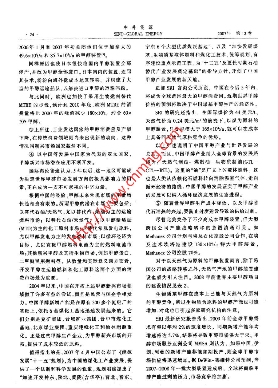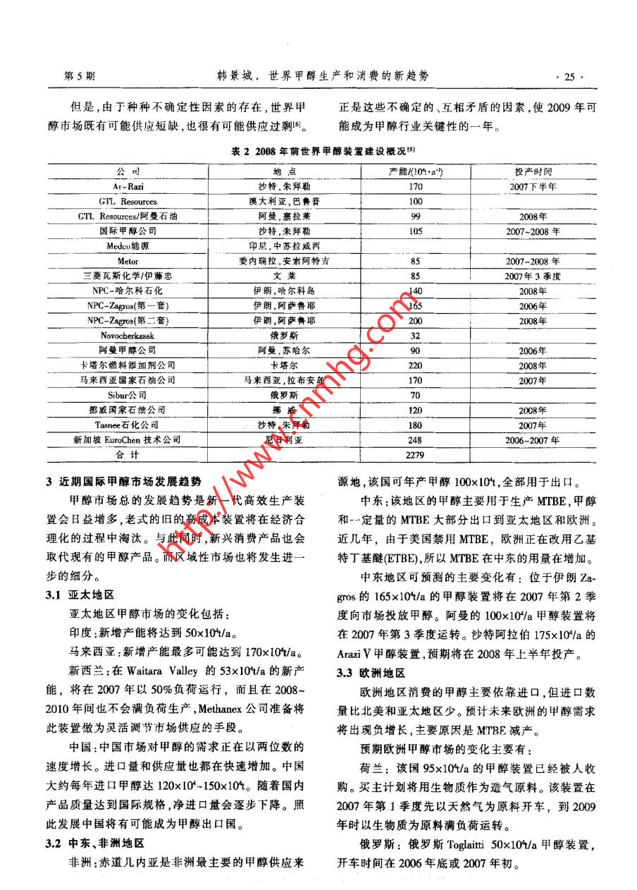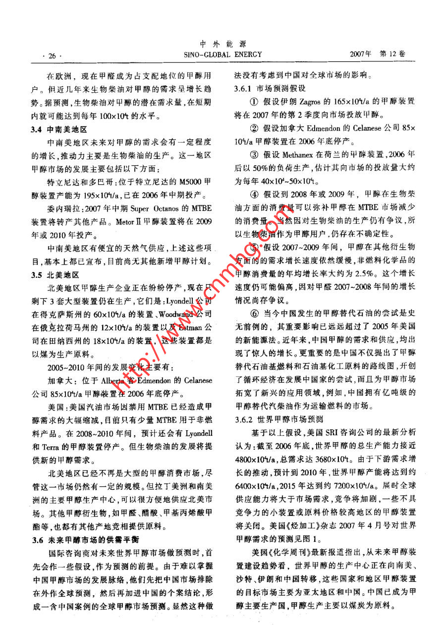 中外能源第12卷第5期SIN0-GL0BAL. FINERGY2007年10月《可再生 能源與新能源>世界甲醇生產(chǎn)和消費(fèi)的新趨勢韓景城(中國石化經(jīng)濟(jì)技術(shù)研兗院,北京10029)摘要分析了世界中醇市場的新特點(diǎn);閘述了世界甲尊生產(chǎn)和消費(fèi)的總發(fā)展趨勢;預(yù)測了世界和中國的申醇供雷情況。關(guān)鍵詞甲醉世界生產(chǎn)需求預(yù)測1前盲進(jìn),例如已經(jīng)實(shí)現(xiàn)的能源整合,這無疑會(huì)增強(qiáng)其產(chǎn)國際原油價(jià)格的風(fēng)云突變以及美元的主動(dòng)性。品的競爭力。貶值,難以動(dòng)搖歐佩克集團(tuán)維護(hù)原油每桶60美元由此可見,當(dāng)傳統(tǒng)受到?jīng)_擊時(shí),按照老習(xí)慣(例價(jià)位的決心。而亞太地區(qū)經(jīng)濟(jì)實(shí)力的增長,也使得如消費(fèi)結(jié)構(gòu)和供求關(guān)系)完成市場預(yù)測,可能將難這一價(jià)位無法阻擋發(fā)展中國家經(jīng)濟(jì)的繼續(xù)發(fā)展。但以為繼,因?yàn)榧状夹碌臐撛谟猛?將會(huì)上升為更有是,石油資源的不可再生性,以及溫室氣體大量排活力的消費(fèi)需求,推算這種原本消費(fèi)量為零的新用放帶來的惡果,已經(jīng)向人類的正常生存發(fā)起了挑途,就需要有新思維,以適應(yīng)新情況下的市場研究。戰(zhàn)。各國追求可持續(xù)發(fā)展的強(qiáng)烈意愿,再次使人們在眾多國外文獻(xiàn)中,形容甲醇市場研究難度的注意力轉(zhuǎn)向甲醇這個(gè)消費(fèi)量僅次于乙烯的有機(jī)的,最多出現(xiàn)的詞是“復(fù)雜”,而且主要復(fù)雜在中國。原料。這樣,在此前甲醇常規(guī)產(chǎn)業(yè)鏈的消費(fèi)項(xiàng)目里,那些知名的國際甲醇市場研究機(jī)構(gòu),幾乎異口同聲自然就少不了甲醇作為石油替代物的消費(fèi)內(nèi)涵,而地表示:“中國在短期內(nèi)就能成為世界甲醇主導(dǎo)生且當(dāng)前各國的呼聲空前高漲。當(dāng)人們這樣看待甲醇產(chǎn)國和消費(fèi)國,其原因除了甲醇傳統(tǒng)的需求之外,的作用時(shí),國際甲醇市場的未來就有了新的概念。更有意義的是甲醇作為新能源的相關(guān)應(yīng)用”;“下一首先,作為替代石油的能源消費(fèi)數(shù)量級有了驚個(gè)5年內(nèi)中國將是全球最大的甲醇消費(fèi)國”;“近期.人的提高,特別是對于缺乏石油資源的廣大發(fā)展中甲醉價(jià)格預(yù)測將取決子中國";“甲醇新潛在用途要國家,這一點(diǎn)顯得尤為重要。以我國為例,每年數(shù)以看中國和美國”;“2009年將是世界甲醇行業(yè)的關(guān)鍵億噸計(jì)的石油產(chǎn)品缺口,足以使甲醇的能源消費(fèi)前年,屆時(shí)中國甲醇生產(chǎn)將具有支配性地位”。同時(shí),途十分光明。從而對甲醇無論從戰(zhàn)略角度還是實(shí)施國際市場研究機(jī)構(gòu)又弄不清中國怎么在2006年12戰(zhàn)術(shù)層面上,都給予了空前的重視。月份突然成了甲醇凈出口國,而且競?cè)粠椭鷵崞搅似浯?甲醉大市場的出現(xiàn),必將推動(dòng)產(chǎn)品生產(chǎn)世界甲醇市場2006年遭遇的創(chuàng)紀(jì)錄高價(jià)。模式的改進(jìn),而后者又將引發(fā)新市場的開拓,產(chǎn)業(yè)因此,本文研究市場的原則是:把中國發(fā)生的發(fā)展的良性循環(huán)模式,,抑或正是從甲醇市場的形成過程中得到體現(xiàn)。例如,由于高額投資,使經(jīng)濟(jì)規(guī)模的瓶頸將不復(fù)存在。再如,隨著各國研發(fā)的進(jìn)展,將作者簡介:韓景城,高級工程師,1962年大學(xué)畢業(yè),退休前曾在通過八仙過海的方式,開發(fā)各種各具本土特色的工化工部吉化研究院、中國石化揚(yáng)子石化公司、中圍石化規(guī)劃院藝,提供各有特色而又適合國情的低成本可靠工工作。積累有科研、設(shè)計(jì)、籌建和規(guī)劃等多方面的經(jīng)驗(yàn),涉及煉化企業(yè)發(fā)展規(guī)劃、項(xiàng)目可行性研究、項(xiàng)目評估和咨詢、油品和石藝,解決“煤造氣工藝難以普及”的問題?;a(chǎn)品市場研究等業(yè)務(wù)。退休后主要從事中國石油和石化市再次,依靠煤和生物質(zhì)生產(chǎn)合成氣的規(guī)模效場、瞽代能源研究。發(fā)表論文多篇被國內(nèi)外刊物刊登。益,必將拉動(dòng)傳統(tǒng)甲醇化學(xué)產(chǎn)業(yè)鏈的新層次技術(shù)改E-mail:x20038@126.com第5期韓景城、世界甲醇生產(chǎn)和消費(fèi)的新趨勢.23事放在全球的平臺.上考慮,先了解中國,否則說不的Methanex, 該公司總部位于美國,在美國、加拿清世界。大、智利、新西蘭、特立尼達(dá)-多巴哥均建有大型生2世界甲醇市場的新特點(diǎn)1|-31產(chǎn)裝置,總生產(chǎn)能力占全球總產(chǎn)能的21%,供應(yīng)面.①2004年以來,世界甲醇的生產(chǎn)和消費(fèi)格局覆蓋全球甲醇市場的40%~50%。其次是沙特基礎(chǔ)已發(fā)生了重大變化。I業(yè)公司(SABIC),該公司的生產(chǎn)能力約占全球總工業(yè)發(fā)達(dá)的美國、西歐、日本等主要甲醇生產(chǎn)產(chǎn)能的9%。以后依次是:美國的Borden 公司、美國大國或地區(qū),已經(jīng)從甲醇的自產(chǎn)自給型國家轉(zhuǎn)變?yōu)榈腂MC公司、俄羅斯的托木斯克(Tomck)公司、俄羅主要進(jìn)口國,加拿大、東歐、中東等國家或地區(qū),由斯的固巴哈(TYBAXA)公司,這4家公司各占全球于具備資源優(yōu)勢,成為甲醇的主要生產(chǎn)、出口國或總產