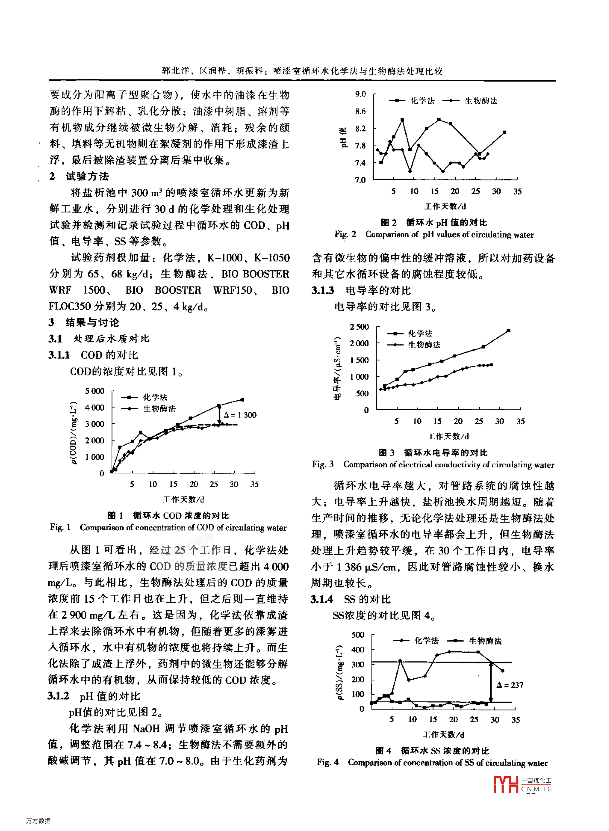 INDUSTRIAL WateR WASTEWATER工業(yè)用水與廢水vd].38Na,5oct..2007噴漆室循環(huán)水化學法與生物酶法處理比較郭北洋,區(qū)潤樺,胡振科(廣州本田汽車有限公司,廣州510700)摘要:為改善汽車涂襞噴溇室獯環(huán)水水質(zhì),提髙循環(huán)水對溱霧的捕捉和成潦效果,分別對循環(huán)水進行了投加密胺樹脂、聚丙烯酸鹽和生物酶的處理試驗。結(jié)果表明,在30d的試驗中投加生物酶處理的循環(huán)水的COD的質(zhì)濃度在2900m兒L左右波動,gH值介于了0-8:0之間,電導阜小于1386μ/m,SS的質(zhì)量濃度低于50mgL,漆渣產(chǎn)生量為380kg/d,處理蹙用為318元/d,其綜合處理效果優(yōu)于同期化學法的處理敷果關詞:汽車涂裝;噴漆宣;循環(huán)水處理;生物酶中圖分類號:TQ085文獻標識碼:A文章編號:1009-2455(2007)5-0084-03Comparison of chemical process and microbial enzyme process inpainting booth circulating water treatmentGUO Bei-yang, OU Run-hua, HU Zhen-keGuangzhouhonda automoble Co, Ltd, Guangzhou 510700, China)Abstract: In order to improve the quality of the circulating water from mobile painting booth as well as theeffect of the circulating water on paint mist catching and slag forming, in the test, the melamine resin, polyacracid salt and bio-enzyme were added respectively to treat the circulating water. The results showed that, in the 30test, the mass concentration of COd of the circulating water treated by bio-enzyme fluctuated near 2 900 mg/L,theoH value varied from 7.0 to 8.0, the electrical conductivity was lower than 1 386 uS/em, the mass concentration ofsS was under 50 mg/L, the paint slag production was 380 kg/d. and the treatment cost was3 180 yuan/d, the effectof synthesis treatment was better than that of chemical treatment under the same conditionKeywords: automobile painting; painting booth; circulating water treatment; biological enzyme在汽車車身油漆噴涂的過程中,一部分油漆未為密胺樹脂)和K-1050(主要成分為聚丙烯酸鹽)以附著在車身上,形成過噴漆霧。過噴漆霧在排氣風及調(diào)整pH值用的NaOH?;瘜W法處理過程中存在機的作用下,在噴漆室底部水槽被循環(huán)水捕捉、攜水質(zhì)惡化快、漆渣上浮率低等問題,每隔4~6個帶到鹽析池進行消粘、絮凝、上浮處理,最后形成月鹽析池需要換水一次,同時要清理底部沉積的漆漆渣被除渣裝置分離、收集。循環(huán)水的水質(zhì)對漆霧渣,高濃度有機廢水的處理以及繁重的清渣工作給的捕捉和成渣效果有關鍵性的影響,其管理標準為生產(chǎn)帶來諸多困難。因此廣州本出聯(lián)合廣州某公司p(CoD)小于500mg兒L,p(SS)小于500mg/仉L,電進行了生物酶法處理噴漆室循環(huán)水的試驗,并與化導率小于5000S/m,pH值在7~9。-旦水質(zhì)學法處理結(jié)果對比,探討處理方法變更的可行性。超出上述標準,循環(huán)水對漆霧的捕捉能力將急劇下生物酶法處理噴漆窒循環(huán)水原理降,大量的漆霧沉積在排氣風機的取風口或隨著循循環(huán)水中加入BOB0 OSTER WRF1500(主要環(huán)水粘附在管道的內(nèi)壁上,破壞噴漆室的風量平衡成分為非病原性微生物菌團)、 BIO BOOSTER和水量平衡,最終影響生產(chǎn)的正常運行。WRFl50(主要成分為硫酸鋁)和 BIO FLOC30(主廣州本田黃埔工廠一直采用化學法對噴漆室循環(huán)水進行處理,所使用的藥劑有K-1000(主要成分收稿日期:2007-01-29:修園日期:200-05-1684中國煤化N M郭北洋,民潤樺,胡振科:噴漆室循環(huán)水化學法與生物酶法處理比較要成分為陽離子型聚合物),使水中的油漆在生物90化學法→生物法酹的作用下解粘、乳化分散;油漆中樹脂、溶劑等86有機物成分繼續(xù)被微生物分解、消耗;殘余的顏巴8.2料、填料等無機物則在絮凝劑的作用下形成漆渣上78浮,最后被除渣裝置分離后集中收集。742試驗方法70將鹽析池中300m3的噴漆室循環(huán)水更新為新51015鮮工業(yè)水,分別進行30d的化學處理和生化處理工作天數(shù)/d試驗并檢測和記錄試驗過程中循環(huán)水的COD、pH圖2循環(huán)水pH值的對比值、電導率、SS等參數(shù)。Fig. 2 Comparison of pH values of circulating water試驗藥劑投加量:化學法,K-1000、K-1050含有微生物的偏中性的緩沖溶液,所以對加藥設備分別為65、68kg/d;生物酶法, BIO BOOSTER和其它水循環(huán)設備的腐蝕程度較低。WRF1500、BI0 BOOSTER WRF150、BI03,13電導率的對比FIOC350分別為20、25、4kg/d電導率的對比見圖33結(jié)果與討論250031處理后水質(zhì)對比化學法2000生物醇法311COD的對比1500COD的濃度對比見圖1橋1005000化學法一鈕5004000生物酶法Δ=】30030005101520253035200T作天數(shù)/dal000圖3循環(huán)水電導率的對比Fig. 3 Comparison of eley: trical conductivity of circulating waterL⊥511520253035循環(huán)水電導率越大,對管路系統(tǒng)的腐蝕性越工作天數(shù)d大;電導率上升越快,鹽析池換水周期越短。隨著1循環(huán)水COD濃度的對比生產(chǎn)時間的推移,無論化學法處理還是生物酶法處ig. 1 Comparison of concentration of COd of circulating water理,噴漆室循環(huán)水的電導率都會上升,但生物酶法從圖1可看出,經(jīng)過25個工作日,化學法處處理上升趨勢較平緩,在30個工作日內(nèi),電導率理后嗩漆室循環(huán)水的coD的質(zhì)量濃度已超出4000小于1386μS/cm,因此對管路腐蝕性較小、換水mg/L。與此相比,生物酶法處理后的COD的質(zhì)量周期也較長。濃度前15個工作日也在上升,但之后則一直維持3.14Ss的對比在2900mg/左右。這是因為,化學法依靠成渣SS濃度的對比見圖4。上浮來去除循環(huán)水