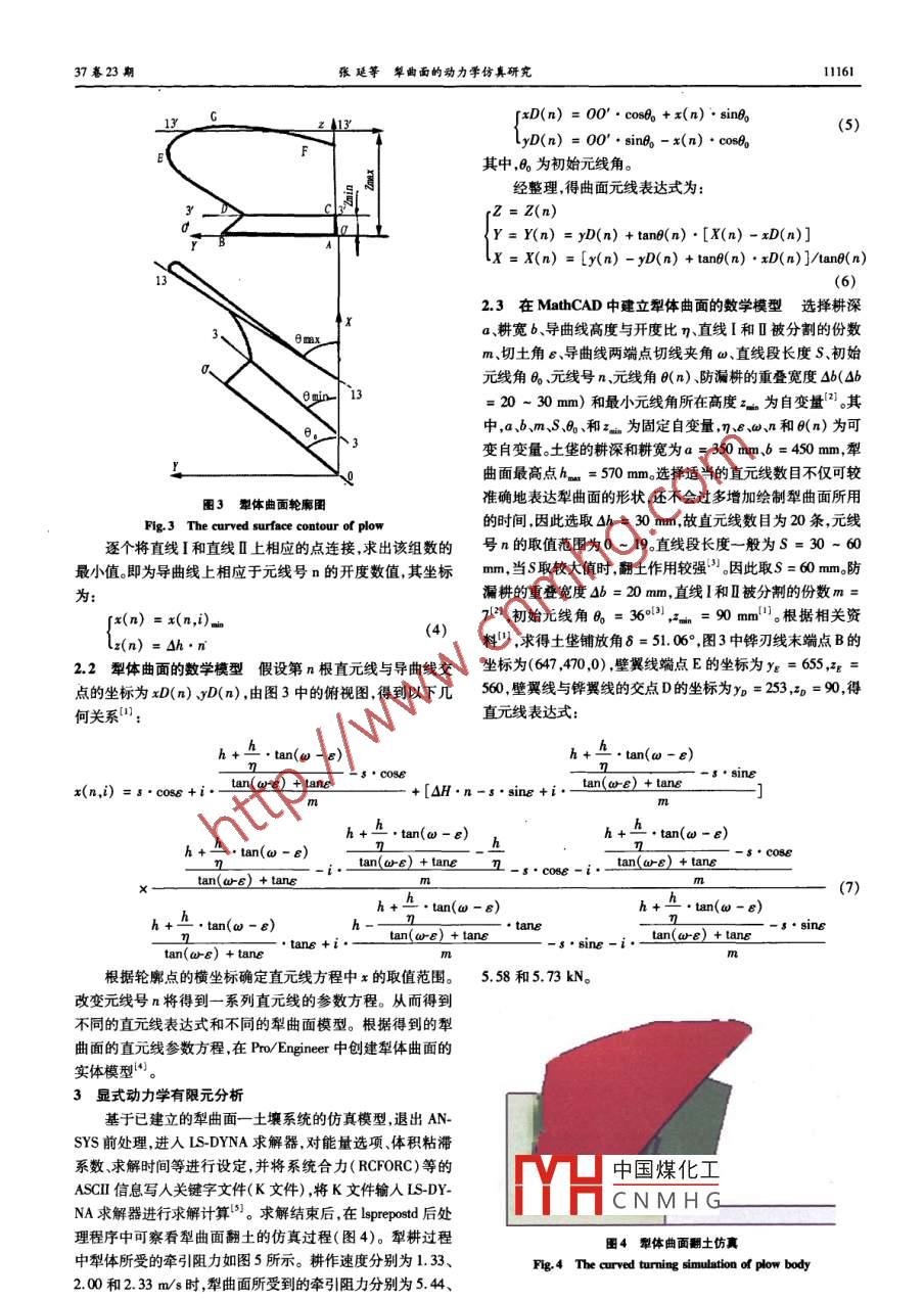 安徽農(nóng)業(yè)科學, Joumal of Anhui agri.Sci2009,37(23):1110-11162貴任編輯??∠阗F任校對張士敏犁曲面的動力學仿真研究張延2,劉娟(1.大連理工大學,遼寧大連116024;2.黃河水利職業(yè)技術學院河南開封475004;3.開封廣播電視大學河南開封475004)摘要采用數(shù)學軟件 MathCAD建立了翻土型犁曲面的數(shù)學模型,利用 ANSYS/LS-DYNA建立了犁曲面一土壤系統(tǒng)顯式動力分析的仿真模型,并通過物理樣機試驗對模型的仿真結果進行了驗證。關鍵詞犁曲面;顯式動力分析;牽引阻力中圖分類號S22.1文獻標識碼A文章編號0517-6611(2009)23-11160-03Simulation Study on Kinetics of Plow SurfaceZHANG Yan et al Dalian University of Technology, Dalian, Liaoning 116024)Abstract The mathematical model of uncovering plow surface was established with mathematical software MathCAD. The simulation model ofplow surface-soil system for explicit dynamic analysis was established with ANAYS/LS-DYNA, and its simulation result was verified by physical prototype.ey words Plow surface: Explicit dynamic analysis; Traction resistance犁作為農(nóng)業(yè)田間作業(yè)的基本工具對農(nóng)業(yè)生產(chǎn)起著重要作用。犁的工作性能(即碎土、翻土性能),主要由犁曲面的形狀決定。另外,犁曲面的形狀還直接決定著犁耕的工作效率。目前,犁曲面的形狀優(yōu)化已成為國內(nèi)外許多學者研究犁圖公0體工作性能的關鍵。1犁體曲面的工作原理犁體曲面的功能主要表現(xiàn)為起土、翻土和碎土,其工作過程如下:(1)切垡:鏵刃和脛刃分別沿水平和垂直面切出土垡的底面和左側面,其耕深為a耕寬為b犁體運動方(2)推垡:被切出的土垡在犁鏵面和犁胸的作用下,左邊被抬起繞右下角D點回轉。(3)翻垡:土垡在回轉過程中,通過直立狀態(tài)然后在犁翼的作用下繼續(xù)繞C'點回轉,最后靠在前一行程的土垡上(圖1)假定土垡在翻轉過程中不變形、無側移并且始終繞一棱圖1翻垡過程角轉動,則每一垡片在翻轉后均保持確定的幾何位置。實現(xiàn)Fig1 Turming pro土垡的穩(wěn)定鋪放即徹底翻扣(不出現(xiàn)回垡現(xiàn)象)是犁體曲面直線I和直線Ⅱ交點的坐標可通過(1)(2)聯(lián)立求得工作和設計的關鍵。是否回垡主要取決于犁曲面的形狀,即曲面的設計參數(shù)及耕深、耕寬等。(3)以臨界狀態(tài)為研究對象確定土垡翻轉過程中不產(chǎn)生回yg=xg·tane垡的基本條件,可為犁體曲面的設計提供參考。經(jīng)計算,土垡的寬深比一般為k≥1.27。k值稍大可保證翻垡穩(wěn)定,但K值過大時單犁體幅寬和垡塊較大,形成的壟溝較深。一般輕沙壤土k=1.1~1.5,一般土壤k=1.3~2.0,黏重潮濕土壤k2犁曲面數(shù)學模型的建立2.1導曲線的數(shù)學模型由圖2可知直線和Ⅲ的方程可分別表示為l:y=x·tane(1)中國煤化工I:y=h-(x-L)·tan(90°-Ae)CNMHGI基金項目河南省教育廳自然科學基金(2006116作者簡介張延(1973-),男,滿族,河南開封人,項士,講師,從事數(shù)控圖2導曲線的形成原理技術、CAD/CAM技術研究ig 2 Formation principle of oriented curve收稿日期200904-2237卷23期張延等犁曲面的動力學仿真研究11161xD(n)=00·cosb+x(n)·sin(5)yD(n)=o0′·sina-x(n)·cos其中,6為初始元線角。經(jīng)整理,得曲面元線表達式為Z=Z(n)x= x(n)=ly(n)-yD(n)+tane (n).xD(n)/tan (n)2.3在 Math CAD中建立犁體曲面的數(shù)學模型選擇耕深a、耕寬b導曲線高度與開度比n、直線I和Ⅱ被分割的份數(shù)m切土角e、導曲線兩端點切線夾角a、直線段長度S、初始元線角B、元線號n、元線角6(n)、防漏耕的重疊寬度△b(4b=20~30mm)和最小元線角所在高度z為自變量2。其中,a、b、m、S、B0、和z為固定自變量,、E、a、n和6(n)為可變自變量。土垡的耕深和耕寬為a=30mm、b=450mm,犁曲面最高點h=570mm選擇適當?shù)闹痹€數(shù)目不僅可較圖3犁體曲面輪廓圖準確地表達犁曲面的形狀,還不會過多增加繪制犁曲面所用的時間,因此選取Mh=30mm,故直元線數(shù)目為20條,元線逐個將直線I和直線Ⅱ上相應的點連接求出該組數(shù)的號n的取值范圍為0-19直線段長度一般為S=30-60最小值即為導曲線上相應于元線號n的開度數(shù)值,其坐標mm,當S取較大值時翻土作用較強。因此取S=60mm。防為漏耕的重疊寬度4b=20mm,直線和Ⅱ被分割的份數(shù)m=∫x(n)=x(n,)712,初始元線角B0==90mm。根據(jù)相關資x(n)=△(4)料,求得土垡鋪放角6=5106°,圖3中鏵刃線末端點B的22犁體曲面的數(shù)學模型假設第n根直元線與導曲線交坐標為(647,470,0),壁翼線端點E的坐標為y=65g點的坐標為xD(n)yD(n),由圖3中的俯視圖得到以下幾56壁翼線與鏵翼線的交點D的坐標為yo=253,=90,得何關系直元線表達式:hh+-.tan(w-e)s·coss·sinEx(n, i)=s cose +i.tan(are)+tang+[AH n-s sine +i.tan(are)+tane.hhhan(o-e)tan(w-ehi.tan(a-e)+tane IL-s c0e-itan(are tang-scoNetan (are ) tanEhh-nn(a-。e)+·tan(a-e)tanean(are)+tangtan(crg)+tanstan(ωE)+tanetane + Is·snE-根據(jù)輪廓點的橫坐標確定直元線方程中x的取值范圍。5.58和573kN改變元線號n將得到一系列直元線的參數(shù)方程。從而得到不同的直元線表達式和不同的犁曲面模型。根據(jù)得到的犁曲面的直元線參數(shù)方程,在Po/ Engineer中創(chuàng)建犁體曲面的實體模型3顯式動力學有限元分析基于已建立的犁曲面一土壤系統(tǒng)的仿真模型,退出ANSYS前處理,進入 LS-DYNA求解器,對能量選項、體積粘滯系數(shù)、求解時間等進行設定,并將系統(tǒng)合力( RCFORO)等的中國煤化工ASCI信息寫人關鍵字文件(K文件),將K文件輸入ISDYNA求解器進行求解計