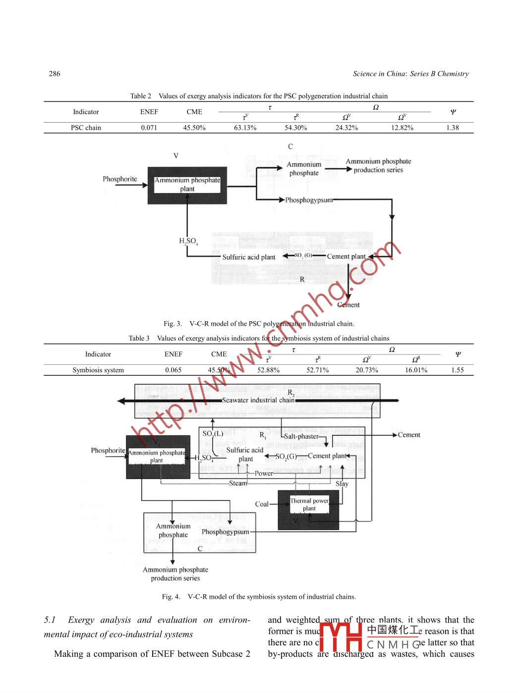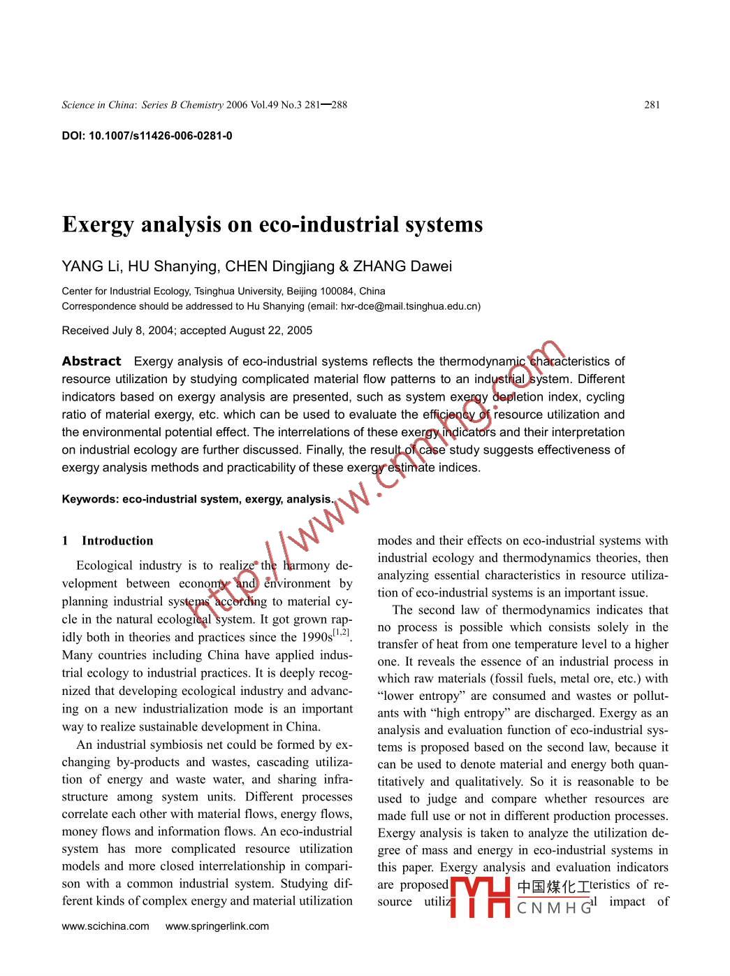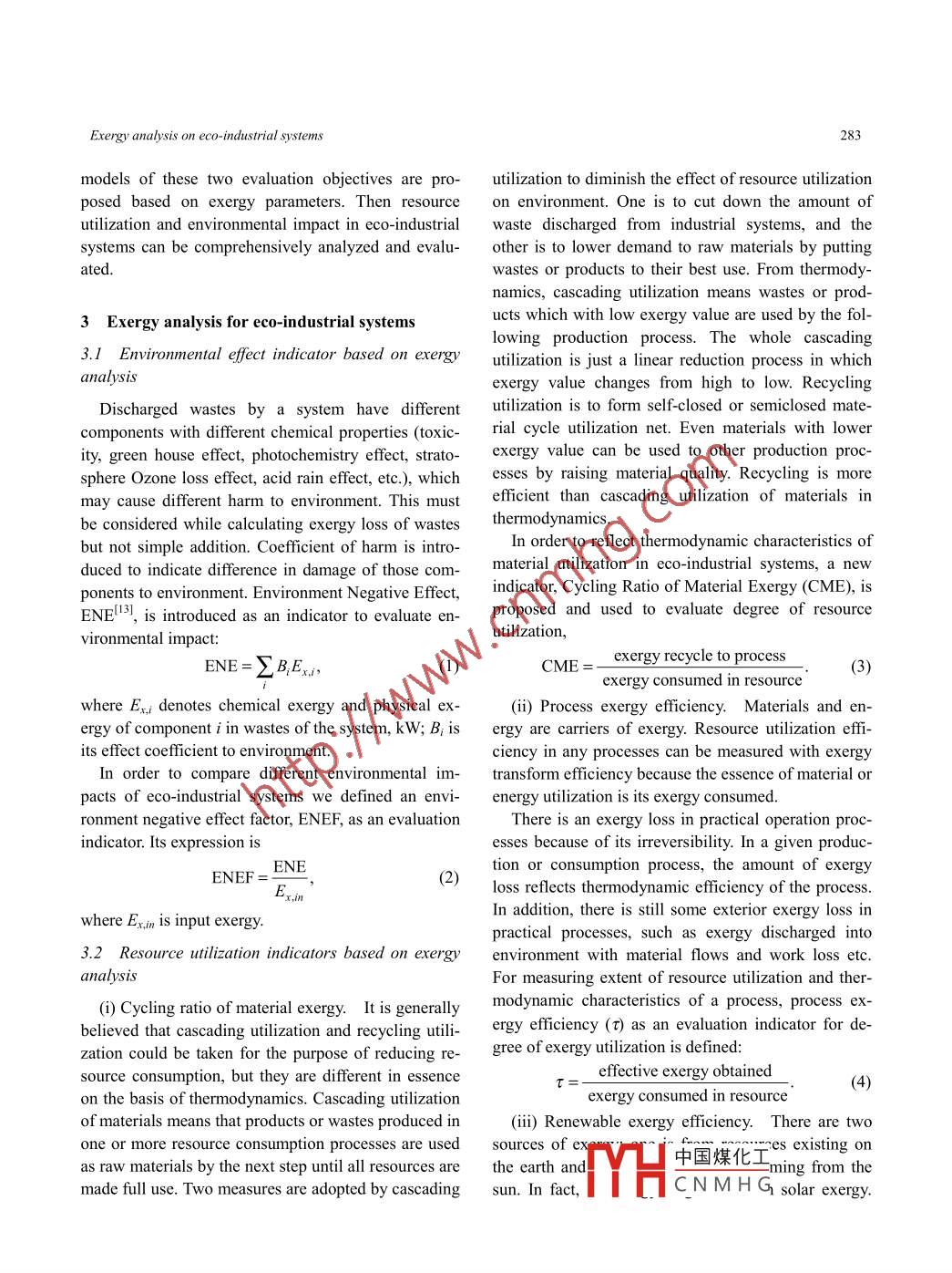 Science in China: Series B Chemistry 2006 Vol.49 No.3 281- -288281DOI: 10.1007/s11426-006-0281-0Exergy analysis on eco-industrial systemsYANG Li, HU Shanying, CHEN Dingjiang & ZHANG DaweiCenter for Industrial Ecology, Tsinghua University, Beijing 100084, ChinaCorrespondence should be addressed to Hu Shanying (email: hxr-dce@mail.tsinghua.edu.cn)Received July 8, 2004; accepted August 22, 2005Abstract Exergy analysis of eco-industrial systems reflects the thermodynamic characteristics ofresource utilization by studying complicated material flow patterns to an industrial system. Differentindicators based on exergy analysis are presented, such as system exergy depletion index, cyclingratio of material exergy, etc. which can be used to evaluate the efficiency of resource utilization andthe environmental potential effect. The interrelations of these exergy indicators and their interpretationon industrial ecology are further discussed. Finally, the result of case study suggests effectiveness ofexergy analysis methods and practicability of these exergy estimate indices.Keywords: eco-industrial system, exergy, analysis.1 Introductionmodes and their effects on eco-industrial systems withEcological industry is to realize the harmony de-industrial ecology and thermodynamics theories, thenanalyzing essential characteristics in resource utiliza-velopment between economy and environment bytion of eco-industrial systems is an important issue.planning industrial systems according to material cy-The second law of thermodynamics indicates thatcle in the natural ecological system. It got grown rap-1o process is possible which consists solely in theidly both in theories and practices since the 190sl-.21.transfer of heat from one temperature level to a higherMany countries including China have applied indus-one. It reveals the essence of an industrial process intrial ecology to industrial practices. It is deeply recog-which raw materials (fosil fuels, metal ore, etc.) withnized that developing ecological industry and advanc-“l(fā)ower entropy” are consumed and wastes or pollut-ing on a new industrialization mode is an importantants with“high entropy”are discharged. Exergy as anway to realize sustainable development in China.analysis and evaluation function of eco-industrial sys-An industrial symbiosis net could be formed by ex-tems is proposed based on the second law, because itchanging by-products and wastes, cascading utiliza-can be used to denote material and energy both quan-tion of energy and waste water, and sharing infra-titatively and qualitatively. So it is reasonable to bestructure among system units. Different processesused to judge and compare whether resources arecorrelate each other with material flows, energy flows,made full use or not in different production processes.money flows and information flows. An eco-industrialExergy analysis is taken to analyze the utilization de-system has more complicated resource utilizationgree of mass and energy in eco-industrial systems inmodels and more closed interrelationship in compari-this paper. Exergy analysis and evaluation indicatorsson with a common industrial system. Studying dif- are proposed中國煤化工leristics of re-ferent kinds of complex energy and material utilizationsource utiliCNMHGIimpact ofwww. scichina.comwww.springerlink.com282Science in China: Series B Chemistryeco-industrial systems are studied according to ther-trial processes in utilization of renewable resources,modynamic principles.and compared the utilization efficiency between re-newable and nonrenewable resources with exergy2 Review of research on exergy analysis for eco-analysis°. Rosen discussed the interrelationship be-industrial systemstween exergy and process environmental impact, andthe potential effect of industrial processes to environ-Exergy is the maximum amount of useful work thatment can be calculated'.can be extracted from a physical system by exchang-On the basis of these researches, it is possible tong matter and energy with large reservoirs throughdrive studies on eco-industrial systems from generalcomplete reversible process (heat transfer process,description to quantitative expression by combiningmass transfer process, chemical reaction etc.) in a ref-exergy analysis and ecological models' 10. Evaluationerence state. It is the maximum amount of work poten-for eco-industrial systems can be realized with exergytial of matter or energy on the basis of a given refer-analysis. Rivero proposed exergoecologic improve-ence statel'. As a thermodynamic parameter, it isment potential index. The larger the index is, theproposed in 1956 by Rant.severer environmental pollution is. Rosen improvedExergy analysis for an ecosystem at first appearedeco-industrial systems with exergy analysis in an at-in a research on the natural ecosystem. Jorgenson et al.tempt to raise utilization efficiency of raw materialsused exergy as an objective function to analyze theand energyt. Wang et al. made further study on theevolution of the natural ecosystem and presented ex-traditional exergy analysist'! Combining with theergy storage hypothesis*. Marques et al. applied theenvironmental factor, they considered two aspects ofstructural dynamic model of the natural ecosystem andresource utilization and environmental impact in aadopted exergy index as an objective function to studyprocess. Li introduced exergy parameters into resourcea river ecosystem suffering from different eutrophica- physics proposed by Tsuchida Atsushi and developedtion'. They made useful exploration to exergy analy-a more effective method for evaluation and utilizationsis for ecosystems.of resource. They considered both resource utilizationExergy analysis is applied to eco-industrial systemsand pollution prevention in industrial processes basedfrom a research on the relationship between exergyon the proposed ecological cost coefficient and de-parameters and environmental impact of industrialstruction indexl4.syst