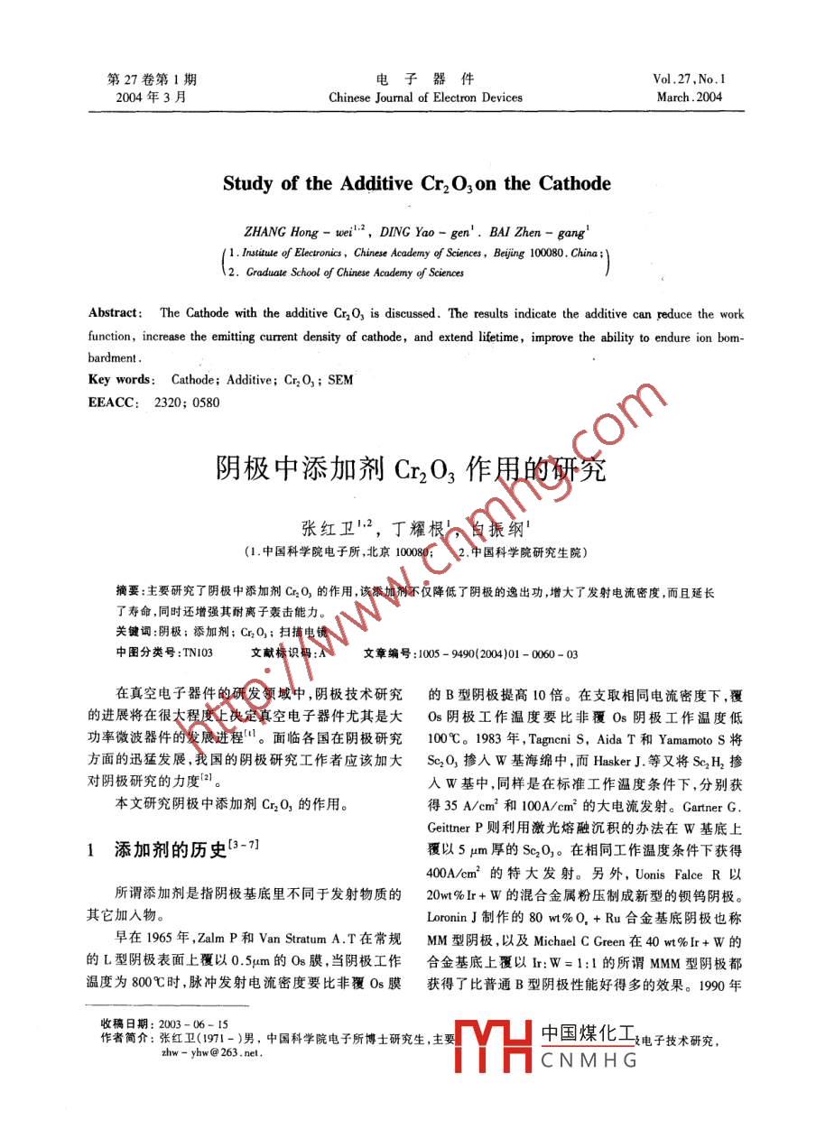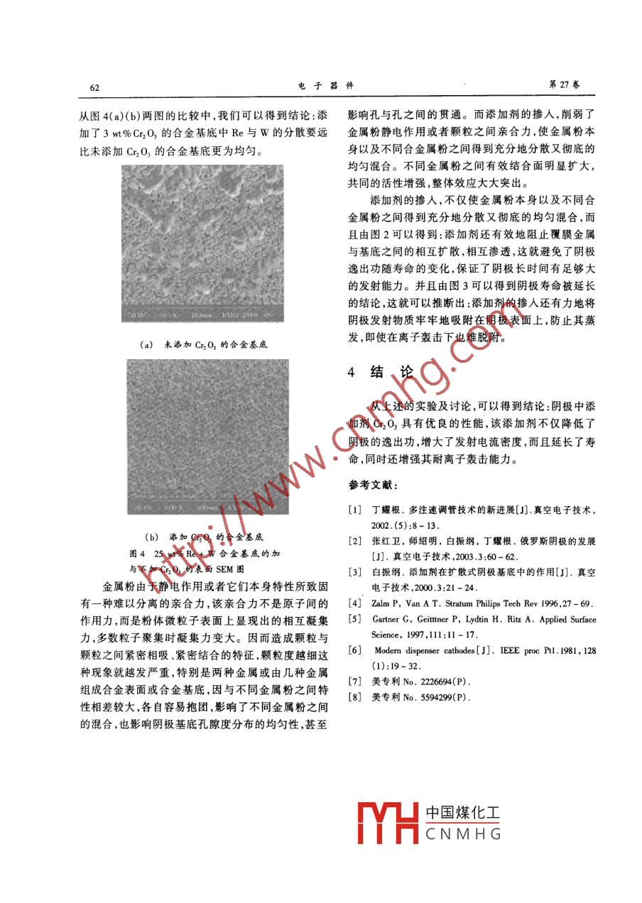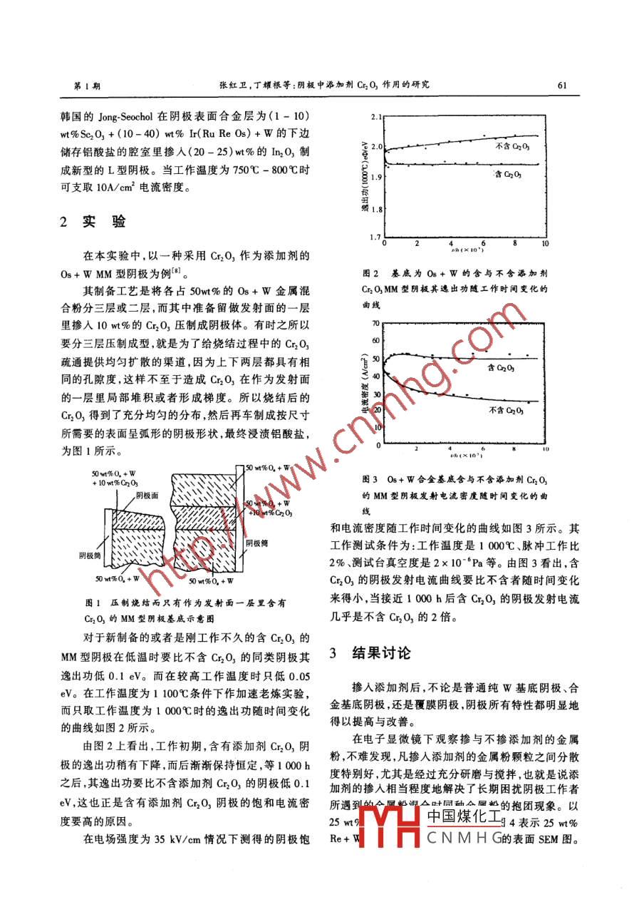 第27卷第1期電子器件Vol.27,No.12004年3月Chinese Jourmal of Electron DevicesMarch .2004Study of the Additive Cr2 03 on the CathodeZHANG Hong- weil', DING Yao- gen' . BAI Zhen - gang'( 1. Insitue of Elecronics,Chinese Academy of Sciences, Bejing 10080. China;)\2. Craduave School of Chinse Academy of SciencesAbstract:The Cathode with the additive Cr203 is discussed. The results indicate the additive can peduce the workfunction, increase the emitting current density of cathode, and extend lifetime ,improve the ability to endure ion bom-bardment .Key words:Cathode; Additive; Cr20, ; SEMEEACC: 2320; 0580陰極中添加劑Cr2O3作用的研究.張紅衛(wèi)2,丁耀根',白振綱'(1.中國科學(xué)院電子所,北京10080;2.中國科學(xué)院研究生院)摘要:主要研究了陰極中添加劑CxO,的作用,該添加劑不僅降低了陰極的逸出功,增大了發(fā)射電流密度,而且延長了壽命,同時(shí)還增強(qiáng)其耐離子轟擊能力。關(guān)鍵詞:陰極;添加劑; Cr2O;掃描電鏡中圍分類號(hào):TNI03文獻(xiàn)標(biāo)識(shí)碼:A文章編號(hào):1005 - 9490(2004)01 - 0060 - 03在真空電子器件的研發(fā)領(lǐng)域中,陰極技術(shù)研究的B型陰極提高10倍。在支取相同電流密度下,覆的進(jìn)展將在很大程度上決定真空電子器件尤其是大Os陰極工作溫度要比非覆Os陰極工作溫度低功率微波器件的發(fā)展進(jìn)程"。面臨各國在陰極研究100C。 1983 年, Tagneni s, Aida T和Yamamoto s將方面的迅猛發(fā)展,我國的陰極研究工作者應(yīng)該加大Sc203摻人W基海綿中,而HaskerJ.等又將ScH2摻對陰極研究的力度(21。人W基中,同樣是在標(biāo)準(zhǔn)工作溫度條件下,分別獲本文研究陰極中添加劑Cr2O, 的作用。得35 A/cm2和100A/em2的大電流發(fā)射。Gartner G.Geitner P則利用激光熔融沉積的辦法在W基底上.1添加劑的歷史[3-]覆以5 pμm厚的Sc20,。在相同工作溫度條件下獲得400A/cm2的特大發(fā)射。另外,UonisFalceR以所謂添加劑是指陰極基底里不同于發(fā)射物質(zhì)的20wt%Ir+W的混合金屬粉壓制成新型的鋇鎢陰極。其它加人物。LoroninJ制作的80 wt%O, + Ru合金基底陰極也稱早在1965年,Zalm P和Van Stratum A.T在常規(guī)MM型陰極,以及Michael C Green在40 wt%Ir+W的的L型陰極表面上覆以0.5pm的Os膜,當(dāng)陰極工作合金基底上覆以lIr:W= 1:1的所謂MMM型陰極都溫度為800C時(shí),脈沖發(fā)射電流密度要比非覆Os膜獲得了比普通B型陰極性能好得多的效果。1990 年.收稿日期: 2003- 06-15作者簡介:張紅衛(wèi)(1971-)男,中國科學(xué)院電子所博士研究生,主要中國煤化工電子技術(shù)研究,zhw-yhw@263.nel.MYHCNMHG第|期張紅衛(wèi),丁耀根等:陰極中添加劑Cr0,作用的研究61韓國的Jong-Seochol 在陰極表面合金層為(1- 10)2.wt%Sc2O, +(10-40) wt% Ir(Ru ReOs)+W的下邊不含CrOz儲(chǔ)存鋁酸鹽的腔室里摻人(20- 25)wt%的In2O, 制成新型的L型陰極。當(dāng)工作溫度為750C - 800C時(shí)81.9含C20可支取10A/em2電流密度。2實(shí)驗(yàn)1.7wm1x1os在本實(shí)驗(yàn)中,以一種采用Cr20,作為添加劑的Os+ w MM型陰極為例。圖2基底為 Os+ w的含與不舍添加劑其制備工藝是將各占50wt%的Os+ w金屬混.C2OMM型陰極其逸出功隨工作時(shí)間變化的合粉分三層或二層,而其中準(zhǔn)備留做發(fā)射面的一層曲線里摻人10 wt%的Cr20,壓制成陰極體。有時(shí)之所以7要分三層壓制成型,就是為了給燒結(jié)過程中的Cr20,.60疏通提供均勻擴(kuò)散的渠道,因?yàn)樯舷聝蓪佣季哂邢嗪琎0同的孔隙度,這樣不至于造成Cr202在作為發(fā)射面.的一層里局部堆積或者形成梯度。所以燒結(jié)后的30Cr20,得到了充分均勻的分布,然后再車制成按尺寸P 20不含C2O2所需要的表面呈弧形的陰極形狀,最終浸漬鋁酸鹽,為圖1所示。mix10°i"50w%0, +W+ 10附%0n03圍3 Os+W 合金基底含與不含添加劑Cr2O陰極面的MM型陰極發(fā)射電流密度隨時(shí)間變化的曲50m%0 +w+10附%C20z線和電流密度隨工作時(shí)間變化的曲線如圖3所示。其陰極筒工作測試條件為:工作溫度是1 000C、脈沖工作比陰極簡2%、測試臺(tái)真空度是2x10~°Pa等。由圖3看出,含50u%0.+w50班%0, +WC20,的陰極發(fā)射電流曲線要比不含者隨時(shí)間變化圍1壓制燒結(jié)而只有作為發(fā)射面一層里舍有來得小,當(dāng)接近1 000 h后含Cr20, 的陰極發(fā)射電流C20,的MM型陰極基底示意圍幾乎是不含C202的2倍。對于新制備的或者是剛工作不久的含Cr20,的MM型陰極在低溫時(shí)要比不含Cz2O,的同類陰極其3結(jié)果討論逸出功低0.1 eV。 而在較高工作溫度時(shí)只低0.05eV。在工作溫度為1100C條件下作加速老煉實(shí)驗(yàn),摻人添加劑后,不論是普通純w基底陰極、合而只取工作溫度為1000C時(shí)的逸出功隨時(shí)間變化金基底陰極,還是覆膜陰極,陰極所有特性都明顯地得以提高與改善。的曲線如圖2所示。由圖2.上看出,工作初期,含有添加劑Cr2O,陰.在電子顯微鏡下觀察摻與不摻添加劑的金屬極的逸出功稍有下降,而后漸漸保持恒定,等1000h粉,不難發(fā)現(xiàn),凡摻人添加劑的金屬粉顆粒之間分散之后,其逸出功要比不含添加劑Cr20,的陰極低0.1度特別好,尤其是經(jīng)過充分研磨與攪拌,也就是說添加劑的摻人相當(dāng)程度地解決了長期困擾陰極工作者eV,這也正是含有添加劑Cr20,陰極的飽和電流密所遇到的合屬郵汽△葉營甜A的抱團(tuán)現(xiàn)象。以.度要高的原因。25 wt9中國煤化工94表示25 m%在電場強(qiáng)度為35 kV/cm情況下測得的陰極飽Re+ WTYHCNMHG的表面SEM圖。62電子器件第27卷從圖4(a)(b)兩