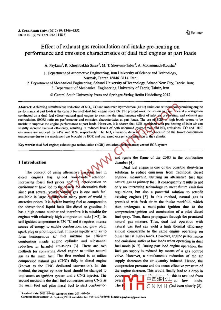 J. Cent. South Univ. (2012) 19: 1346-1352包SpringerDOI: 100751710121148-15Effect of exhaust gas recirculation and intake pre-heating onperformance and emission characteristics of dual fuel engines at part loadsA. Paykani', R. Khoshbakhti Saray, M T. Shervani-Tabar, A. Mohammadi-Kousha'1. Department of Automotive Engineering, Iran University of Science and Technology,Narmak, Tehran 1684613114, lran;2. Department of Mechanical Engineering, Sahand University of Technology, Sahand New City, Tabriz, Iran;3. Department of Mechanical Engineering, University of Tabriz, Tabriz, IranC Central South University Press and Springer-Verlag Berlin Heidelberg 2012Abstract: Achieving simultaneous reduction of NO,, CO and unburned hydrocarbon (UHC) emissions without compromising engineperformance at part loads is the current focus of dual fuel engine rescarcb. The present work focuses on an experimental investigationconducted on a dual fuel (diesel-natural gas) engine to examine the simultancous ffect of inlet air pre-heating and exhaust gasrecirculation (EGR) ratio on performance and emission characteristics at part loads. The use of EGR at high levels seems to beunable to improve the engine performance at part loads. However, it is shown that EGR combined with pre-heating of inlet air canslightly increase thermal efficiency, resulting in reduced levels of both unburmed hydrocarbon and NO, emissions. co and UHCemissions are reduced by 24% and 31%, respectively. The NO, emissions decrease by 21% because of the lower combustiontemperature due to the much inert gas brought by EGR and decreased oxygen concentration in the cylinder.Key words: dual fuel engine; exhaust gas recirculation (EGR); emision; performnance; venturi EGR systemand igmite the flame of the CNG in the combustion1 Introductionchamber [4].Dual fuel engine is one of the possible short-termThe concept of using alternative gaseous fuel insolutions to reduce emissions from traditional dieseldiesel engines has gained worldwide attention.engines, meanwhile, utilizing an altemnative fuel likeIncreasing fossil fuel prices and the deterioration tonatural gas as primary fuel. It consequently results in notenvironment have led to the scarch for alternative fuelsonly an interesting technology to meet future emissionsince past several years. Natural gas is one such fuelregulations, but also a powerful solution to retrofitavailable in large quantities in many parts of world atexisting engines [5]. In this method, natural gas isattractive prices. It is a clean burming fuel as compared topremixed with fresh air in the intake manifold, whichthe conventional liquid fuels like diesel or gasoline. It .then undergoes a multi-point ignition due to thehas a high octane number and therefore it is suitable forcompression-ignition and combustion of a pilot dieselengincs with relatively high compression ratio [1 -2]. Itsfuel spray. Then, flame propagates through the premixedself ignition temperature is 730 °C and it requires intensenatural gas mixture. Thus, dual fucl operation withsource of energy to enable combustion, i.e. glow plug,natural gas fuel can yield a high thermal efficiencyspark plug or pilot liquid fuel. It mixes rapidly with air toalmost comparable to the same engine operating onform homogenous air fuel mixture forefficientdiesel fuel at higher loads. However, engine performancecombustion inside engine cylinder and substantaland emissions suffer at low loads when operating io dualreduction in harmful emissions [3]. There are twofuel mode [6- -7]. During part load engine operation, themethods for converting diesel engine to utilize naturalfuel gas supply is reduced by means of a gas controlgas as the main fuel. The first method is to utilizevalve. However, a simultaneous reduction of the aircompressed natural gas (CNG) fully in diesel enginesupply decreases the air quantity induced. Hence, th(known as the CNG dedicated conversion). In thiscompression pressure and the mean efective pressure ofmethod, the engine cylinder head should be changed tothe engine decrease. This would finally lead to a drop inimplement an ignition system and a CNG injector. The中國煤化工_this is resulted fromsecond method is the dual-fuel conversion using CNG asoveraEat low loads.the main fuel and pilot diesel fuel to start combustionThe:YHC N M H Gnd burn slowly [8].Received date: 2011 07- -20; Accepted date; 2011-09- -26Corresponding suthor: A. Paykani; PhD Candidate, Tel: +98- 9397905698; E-mail: a.paykani@gmnail.comJ. Cent. South Univ. (2012) 19: 1346-13521347The use of exhaust gas recirculation has been suggestedfuel engines at part loads. In order to meet futureto improve part load performance and emissionemission standards, EGR must be done over wider rangecharacteristics of dual fuel engines. The exhaust gaof engine operation, and larger EGR ratio will be needed.recirculation (EGR) may be used for improving part loadThus, utilizing a specific device to expand EGR area isoperation and reducing the exhaust emissions of NO。.necessary. In this work, the venturi type EGR system wasIntroduction of EGR has combinations of some of theseselected because it is rather effective for expanding theeffects [9]: 1) dilution effect, 2) chemical effect and 3)EGR range up to low engine load conditions.thermal effect.2 Experimentalsolve above mentioned issues [8]. Some researchersinvestigate the effect of hot and cooled EGR onAn experiment was carried out to investigate theperformance and emission characteristics of dual fueeffect of exhaust gas recirculation and pre-heating of theengines at part loads. KUSAKA et al [3, 10] ancinlet air on performance and emission characteristics ofDAISHO et al [11-12] studied experimentally the effectdual fuel engines at part loads. The engine used for theof EGR on combustion and exhaust emissioninvestigation was a single-cylinder, four-stroke, watercharacteristics of dual fuel engines with the objective ofcooled, indirect injection (Lister 8-1) dual