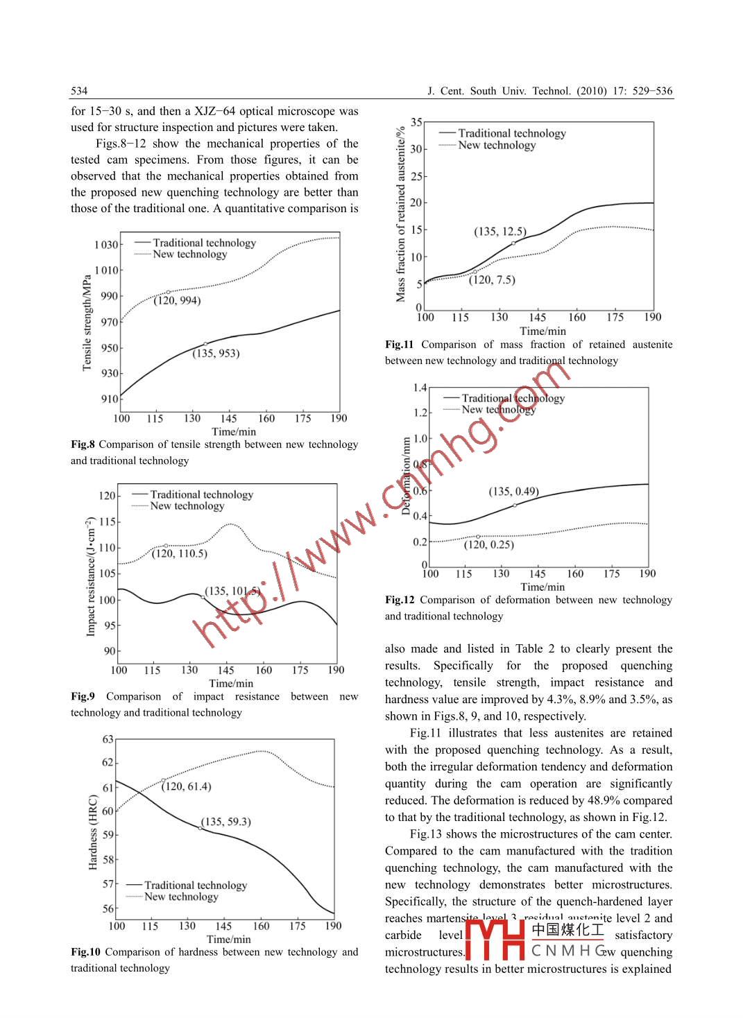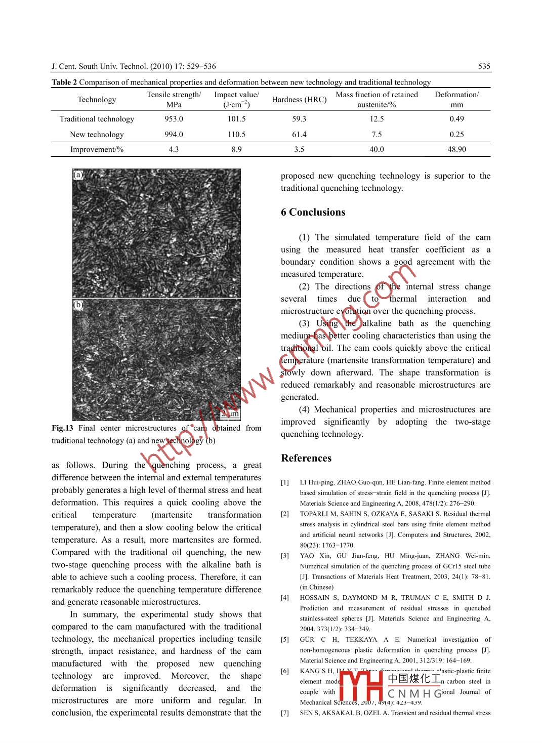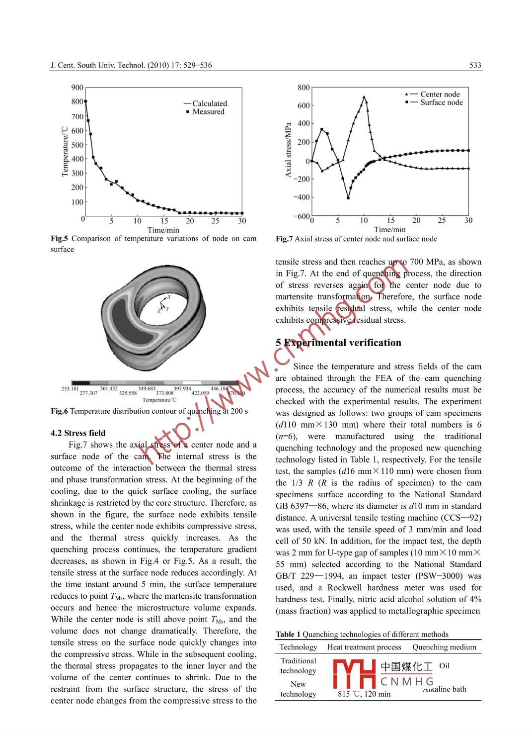 J. Cent. South Univ. Technol. (2010) 17: 529- -536包SpringerDOI: 10.1007/11771-010-0518-0Numerical and experimental analysis of quenching process forcam manufacturingTANG Qian(唐倩)', PEI Lin-qing(裴林清)',XIAO Han song(肖寒松)21. State Key Laboratory of Mechanical Transmissions, Chongqing University, Chongqing 400044, China;2. Department of Mechanical and Industrial Engineering, University of Toronto, Toronto, Ontario MSS 3G8, CanadaO Central South University Press and Springer Verlag Berlin Heidelberg 2010Abstract: In order to obtain satisfactory mechanical properties for the cam used in high-power ship diesel engines, a new quenchingtechnology was proposed by designing a two-stage quenching process with an alkaline bath as the quenching medium. Tdemonstrate the effectiveness of the proposed new quenching technology, both numerical analysis and experimental study wereperformed. The new quenching technology was analyzed using finite element method. The combined effects of the temperature,stress and microstructure fields were investigated considering nonlinear material properties. Finally, an experimental studyperformed to verify the effctiveness of the proposed new quenching technology. The numerical results show that internal stress isaffected by both thermal stress and transformation stress. In addition, the direction of the internal stress is changed several times dueto thermal interaction and microstructure evolution during the quenching process. The experimental results show that the proposednew quenching technology significantly improves the mechanical properties and microstructures of the cam. The tensile strength, theimpact resistance and the hardness value of the cam by the proposed new quenching technology are improved by 4.3%, 8.9% and3.5% compared with those by the traditional quenching technology. Moreover, the residual stress and cam shape deformation arereduced by 40.0% and 48.9% respectively for the cam manufactured by the new quenching technology.Key words: quenching process; cam manufacturing; finite element method; numerical; simulation experimental studyquenching technology consists of two stages of1 Introductionquenching,with an alkaline bath as the quenchingmedium. It is believed that the proposed new quenchingAs an essential part of a high-power ship dieseltechnology brings major advantages over the traditionalengine, a cam must have a working surface with enoughquenching process, including better mechanicalhardness, wear resistance, and toughness in order to haveproperties, better microstructures, and more accuratea guaranteed lifespan when working under severeshape and dimensions.conditions, including heavy load, high temperature, anThe quenching process is a complicated process infatigue. To meet the requirements for mechanicalwhich interaction occurs among coolingproperties of the cam, a quenching process is widelytemperature variation, phase transformation, andused in the manufacturing of cams. However, traditionalstress- strain state. For various microstructures during thequenching process, the thermophysical properties ofmanufacturers cannot provide satisfactory mechanicalmaterials (including thermal conductivity, heat transferproperties for the cam. This is indicated by spocoefficient, and specific heat at a constant pressure) andcorrosion, cracks, and rapid erosion on the workingmechanical properties (including elastic modulus, plasticsurface of the cam within the designed work cycle.modulus, Poisson ratio, and yield strength), changeMoreover, traditional quenching processes, whichcontinuously with the temperature variation. Since thegenerally consist of only one stage of quenching atprocess involves high nonlinearity of the cam materialspecified temperature, have difficulty in accurately[1], it is very difficult to accurately analyze theanalyzing the temperature and stress fields during thetemperature and stress fields during the quenchingquenching process of the cam. In recent years, aprocess of the cam. In recent years, a number oftechnology has been proposed in this subject. Differentnumerical investigations have been performed to predictfrom the traditional quenching process, the newthe changes of temperature and stress fields of the camFoundation item: Project(50875268) supported by the National Natural Science Foundation of Chin中國煤化Iedbyv Foundationof Chongqing Science and Technology Commission, China; Project( 108107) supMYHCNMH GY of Educaio ofRecedae 2000 Poxss 01 258 200 % he Naioanl Sine Fund lor DsinguishsCorresponding author: TANG Qian, PhD, Professor; Tel: +86- 23- -65111276; E-mail: tqcqu@cqu.edu.cn530J. Cent, South Univ. Technol. (2010) 17: 529- -536during the quenching process [2- -8]. For example, YAO(PDE) of heat conduction is expressed as follows byet al [3] studied the oil quenching process of GCr15 tube .using Fourier law:using finite element method after determining the heatJTdn0T、(dT、d1d7-Q=0transfer coefficientof oil. The temperature,microstructure and stress variations during quenching(1)were analyzed. HOSSAIN et al [4] predicted the residualThe initial condition and boundary condition areand thermal stresses that occur during water quenchingof solid spherical balls. KANG and IM [6] established agiven as3D thermo-elastic-plastic model for plain-carbon steelT(x,y,z)|=o = T(x,y,z)(2dTof numerical simulation. KAKHKI et al [9] simulated thex”.+k,0n,+k2-n2 =h(T -T)(3)continuous cooling and kinetics of phase transformationand predicted the final distribution of microstructureswhere p is the density of the material; c is the specificand hardness in low alloy steels using measured heatheat capacity of the material; kx, kry, and k; are thermaltransfer coefficients of quenching media by an inverseconductivity coefficients along three directions of x, y,method. ULYSSE and SCHULTZ [10] investigated theandz; t is the time instant; Q is the latent heat of phaseeffect of various surface treatments on the thermo-transform